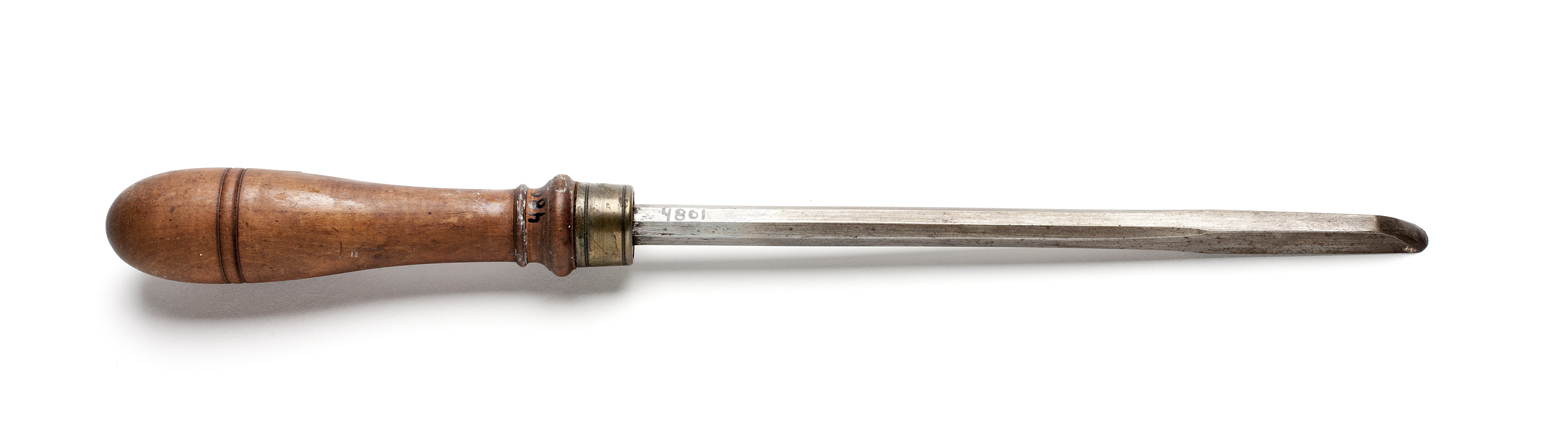 Klinga med åttsidig, i änden rektangulär genomskärning. Svarvat skaft av päronträ med två vulster nedtill ("skoklostertyp"). Mässingsring. Stämpel i skaftets ände vid fästet: "32" med stansar nr 5375.