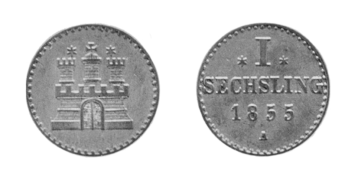 SILVER. Sechsling (6 Pfennig) 1855. Åtsida: Stadsvapnet (tretornad borg, över mittornet et S:t Georgs-kors, över sidotornen en sexuddad stjärna). Kring kanten en pärlstav. Frånsida: Myntvärde, årtal och Berlins myntbokstav A. Kring kanten en pärlstav. Rand. Slät. Mått: Vikt: 0,7 gr. Diameter: 14 mm. Medfört av Johanna Kempe från en av hennes resor till Tyskland något av åren under 1860-talets förra hälft.