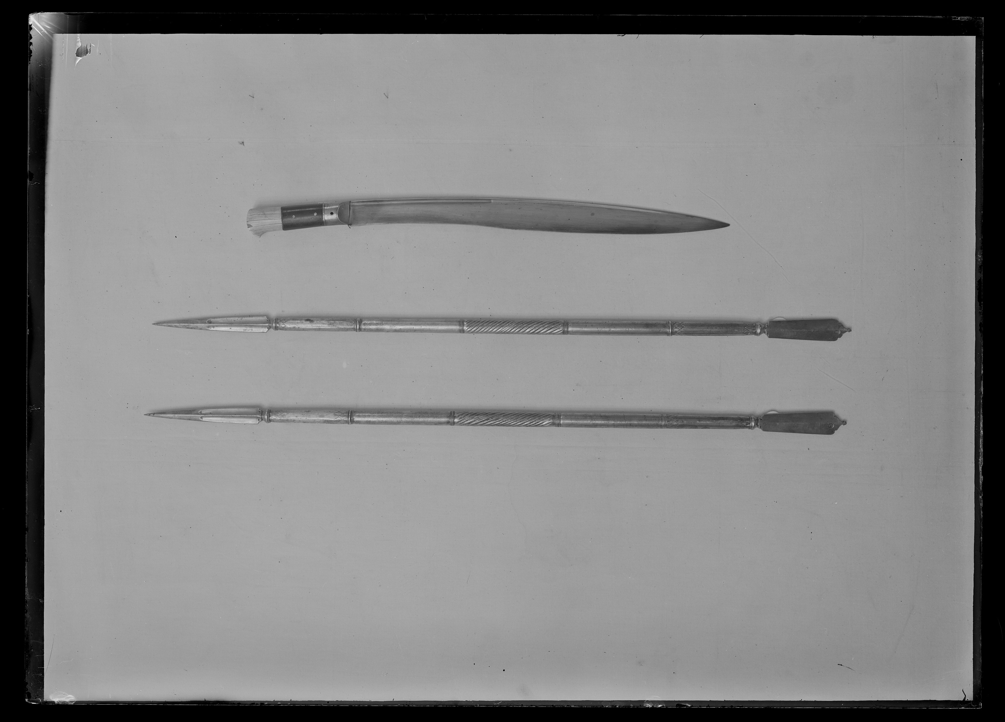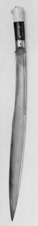 Skaft av mörkbruna horn med ovalt tvärsnitt. Blad av stål, rak, eneggad. Friherre Georg Abr aham Fleetwoods samling nr 120. Katalogisering:Kerstin Berg 1971-08-25, inmatning-utskrift PAr 1997-06-03.