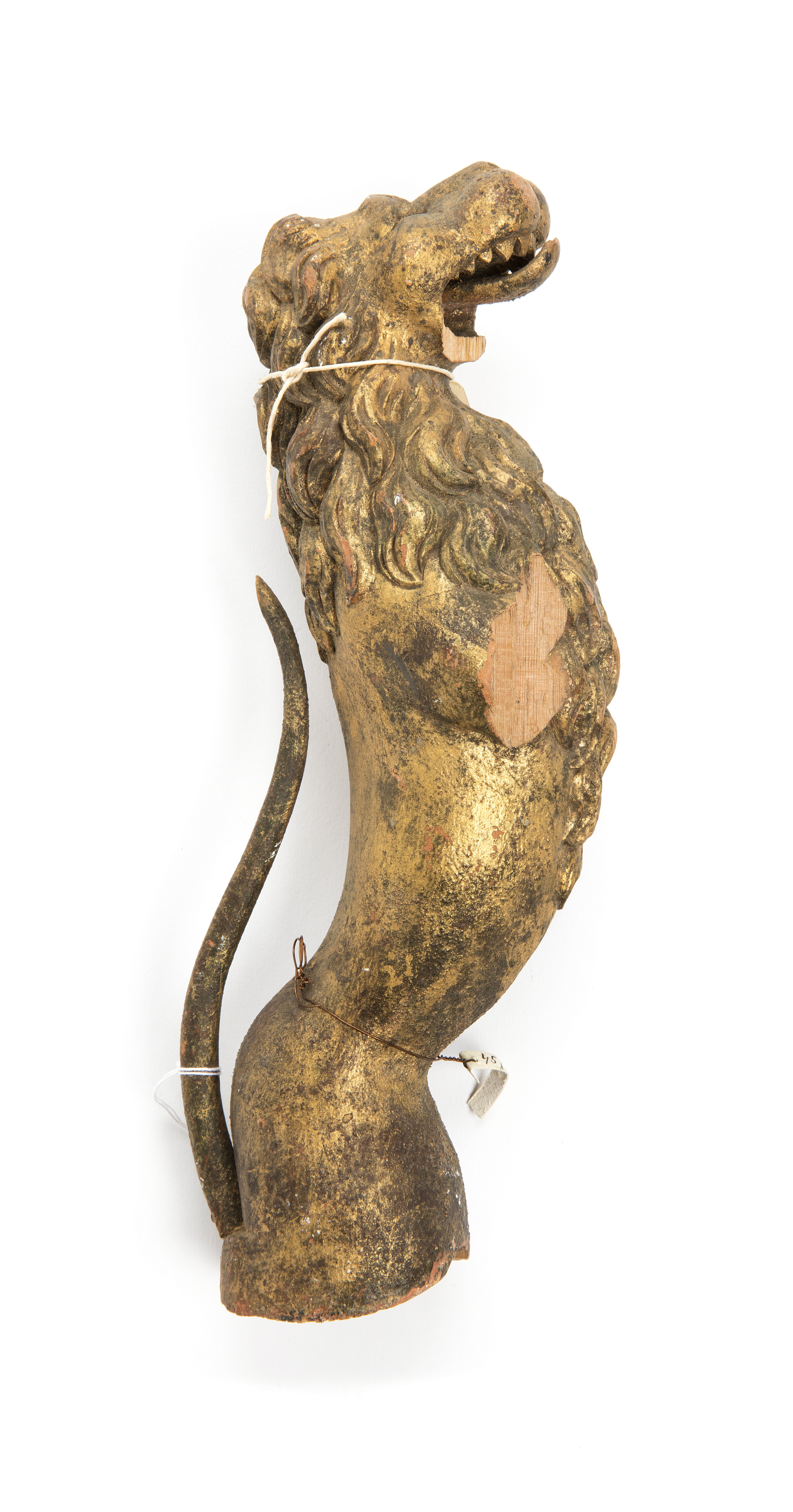 Buren av greve Gustaf Löwenhielm vid riddarspelen på Drottningholm 1800. Förgylld hjälmprydnad av snidat trä föreställandes ett uppstigande lejon med öppet gap och utsträckt tunga. Tidigare i höger tass hållandes ett svärd omlindad med en grön lagerkvist. Armarna, svärdet och underkäken samt svanstippen är avbrutna och försvunna.