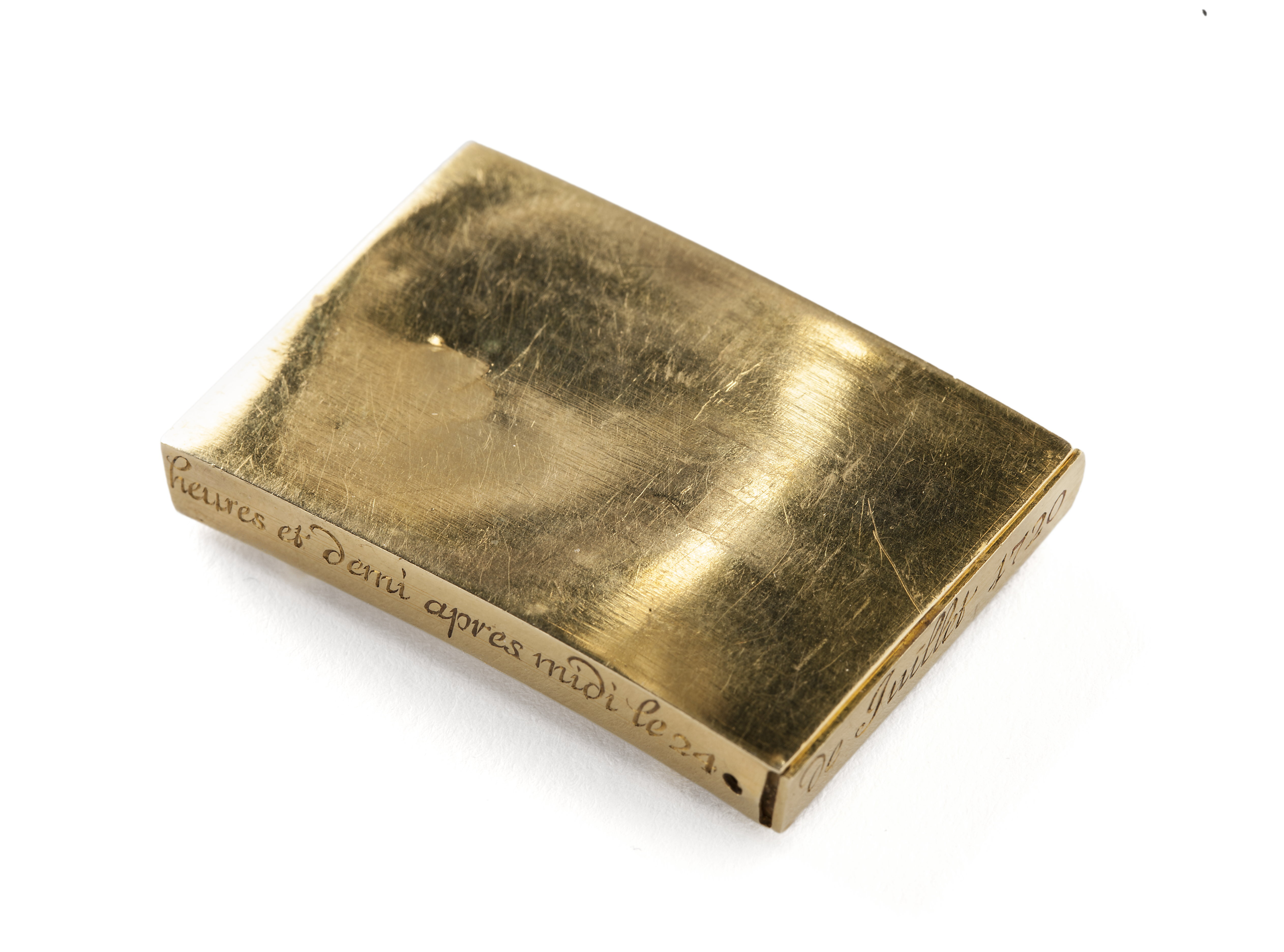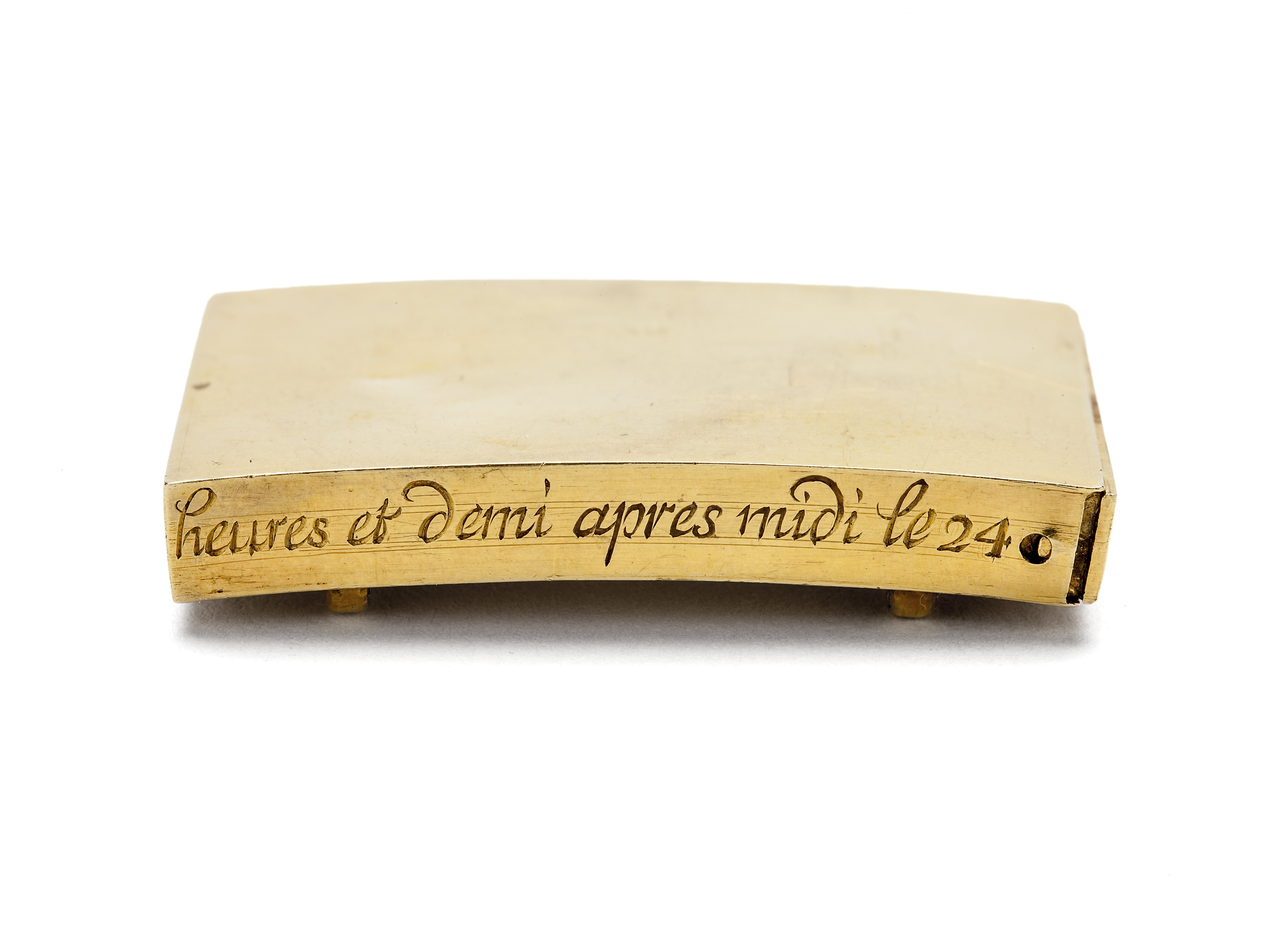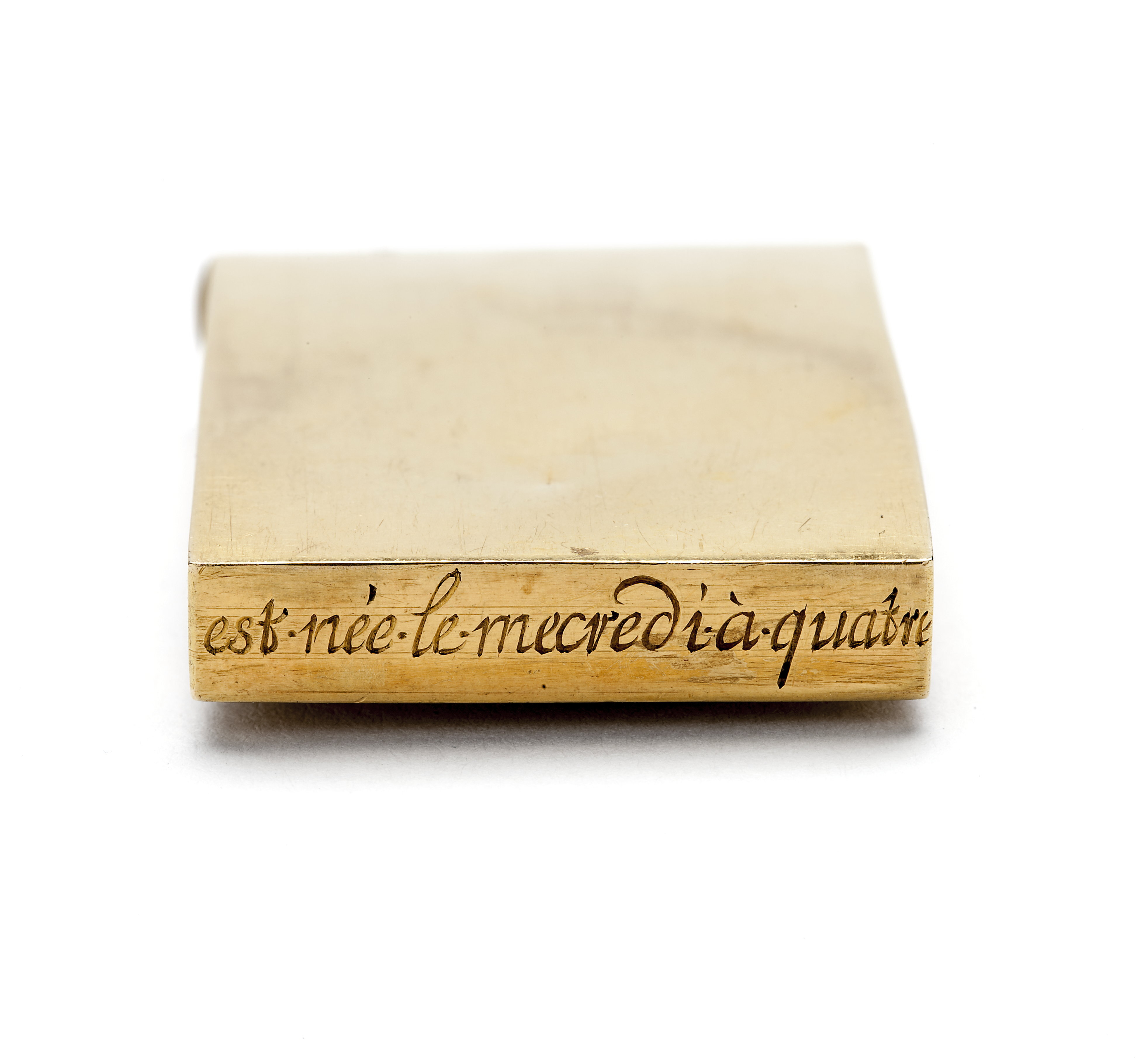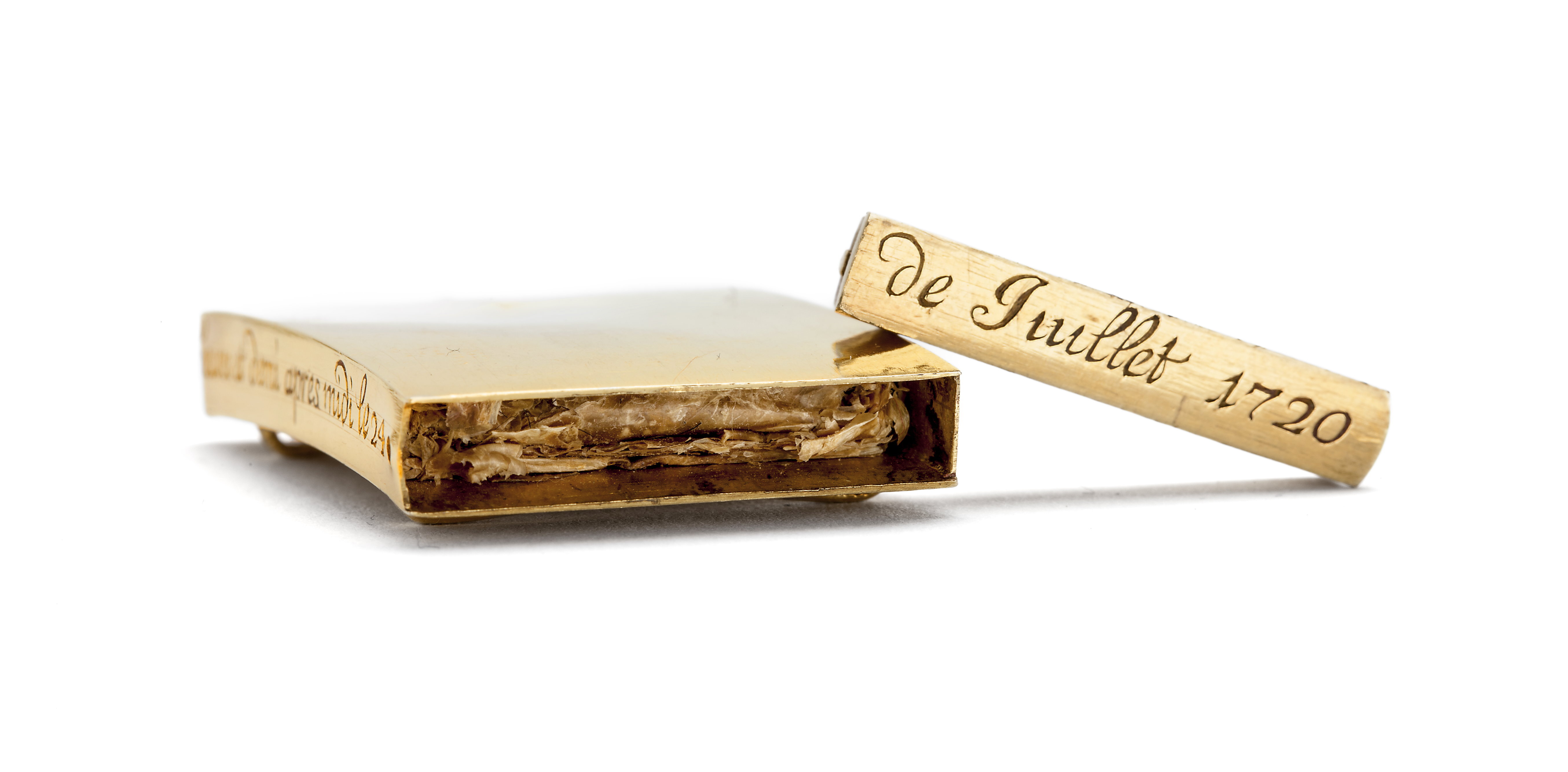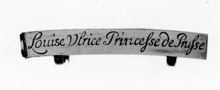 Rektangulär, svagt böjd bracelette av guld med två byglar för band på den konkava sidan. Ena kortsidan urtagbar. På sidorna graverad text: "Louise Ulrice Princesse de Prusse // est nee le mecredi a auqtre // heures et demi apres midi le 24 // de Juillet 1720". Igenom byglarna trätt ett svart sidenband med fransiga ändar. Att födas med segerhuva, dvs med fosterhinnan över huvudet, betydde tur. Behållaren med segerhuvan var troligen avsedd att bära som lyckoamulett.