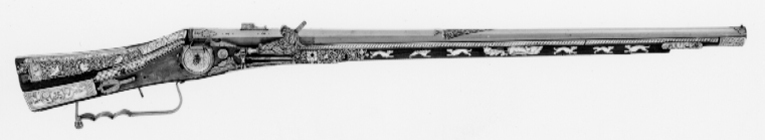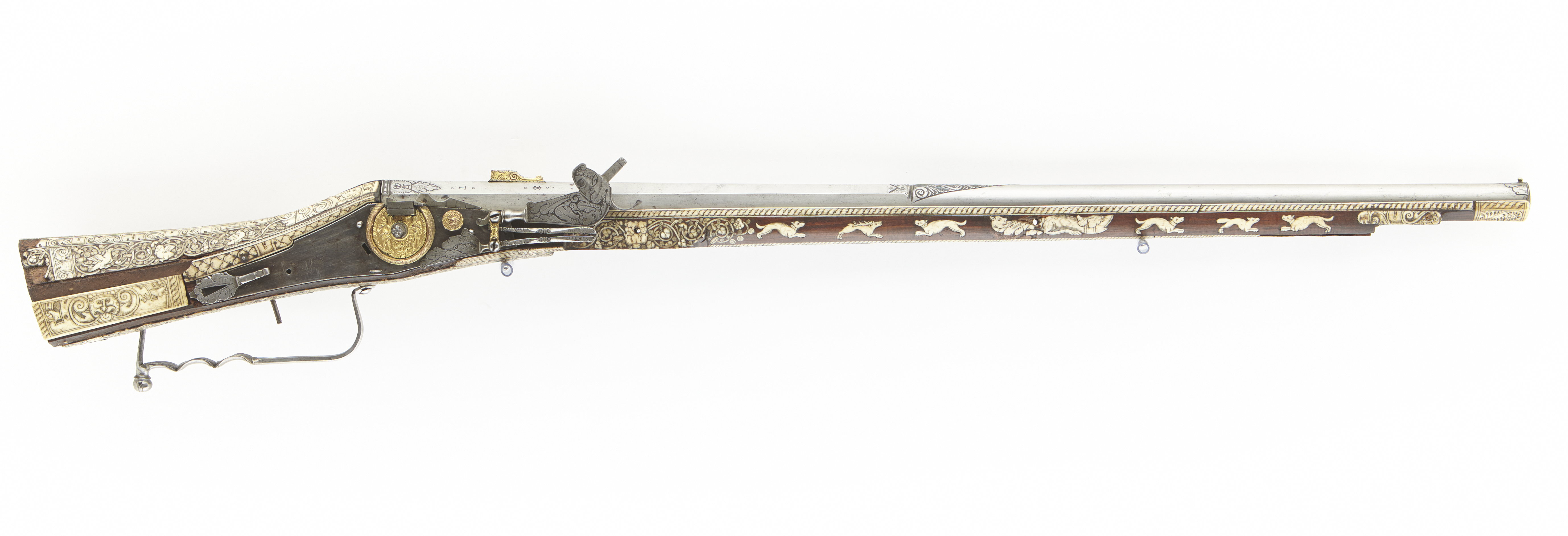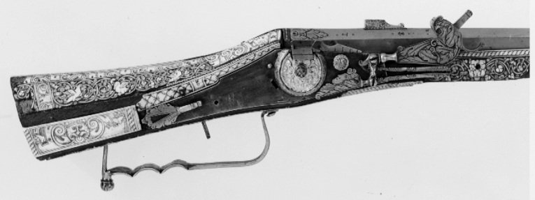 Hjullåsbössa, Sydtyskland, 1500-talets slut, pipan signerad A T och daterad 1577.