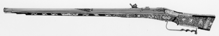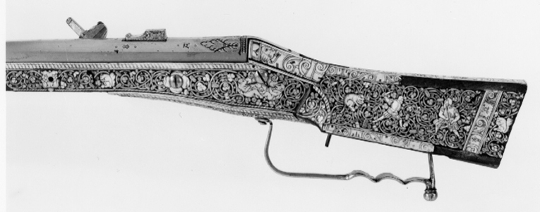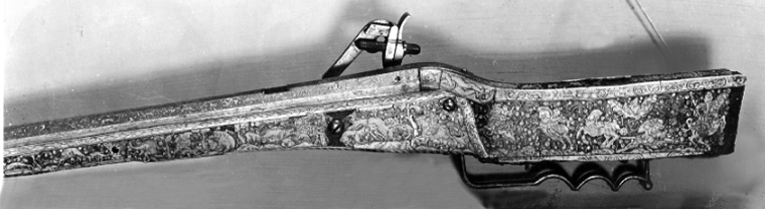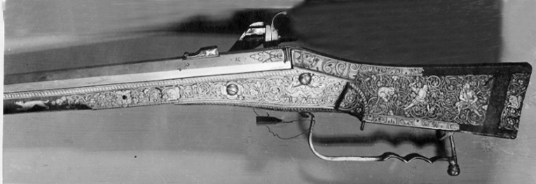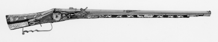 Rund, slätborrad pipa med åttsidig kammare med djup, graverad dekor, delvis i stålsnitt vid pipbas, övergång och mynning, bladdekor i ett triangulärt fält vid övergången. På kammaren stämplar: A T, pil(LRK vägl.1921:270, jfr Stöckelnr 5717) samt datering 1577. Stämplarna omgivna av ringformiga stämplar. Mellan årtal och sikte en ornamentstämpel i form av ett eklöv (?). Nedåtböjd, baktill tvärt avskuret svansskruvblad. Riktmedel: Djupt nedskuren siktskåra. Stort kulissikte av förgylld koppar med beslagsdekor. Knoppkorn av förgylld mässing(?). Fästning: Två, urspr. tre häften. Pipan fäst med krysskruv underifrån samt tre pipstift av trä. Hjullås med urspr. blånerat låsbleck, utvändigt hjul täckt av platta av förgylld koppar(?), relief dekorförställande Mucius Scaevola(?), kantring med beslags-och bladdekor. Tryckknapp av samma material i form av lejonmaskaron. Fängpanna med låg, rak krutskärm, på locket en lejonmaskaron. Hane med kort,balusterformig kropp, hals-huvud med graverad dekor och drakhuvud, kort, uppåtsvängt fingergrepp, fyrsidigt hanskruvhuvud. Hanfjäder med delvis fasade kanter, bladdekor, stort fjäderlöv med blad och ansikte. Studel av förgylld koppar med beslagsdekor. Baktill på låsblecket bakre delen av en säkring, löv med triangulärt hål. Låsdelarna invändigt delvis blånerade. Fästning: Två låsskruvar. Rak avtryckare med liten ändkula. Helstock av valnöt av tysk typ med liten vinge och kolvlåda. På bakre häflten yttäckande inläggningar av hjorthorn (enl.vägl.1921) i form av bladrankor och lister med blad- och beslagsdekor. Vid pipbasen signering A F och därbakom två mansansikten. Kolvlådelock med plan täckskiva med beslagsdekor ochl ejonmaskaron. På kolvsidan därovanför tre fåglar. På anslaget en tvärgående list 20 mm från kolvänden, därbakom en ekorre. Framför listen två sabelfäktare, båda skäggiga, den ena med stora pluderhosor, den andre med knäbyxor. Framför fäktarna en apa. Den bakre låsskruvbrickan i form av två apor med bladrankor vällande ur munnen, den främre i form av en fyrbladig blomma. Därframför en ekorre. På kolvens undersida ett hjärtformigt avtryckarbleck, en apa spelande på trumma samt en fågel. På framstocken kantlister med flätmönster samt djurbilder - på h. sida hjort och räv - på v. sida vildsvin och en hare, alla mellan två hundar. Pipstiftbrickor av ben, den bakre i form av blommor i rankverket, mellersta brickorna i form av rankverk med svinliknande djur framtill och djurhuvud baktill. De främre pipstiftbrickorna i form av ovala plattor med beslagsdekor. Näsband med tunna bladrankor, avvikande från övrig dekor. Varbygel av stål med tre fingerlägen, bakre stolpen avslutad med kula, smal, fyrsidig främre del med fasade kanter.