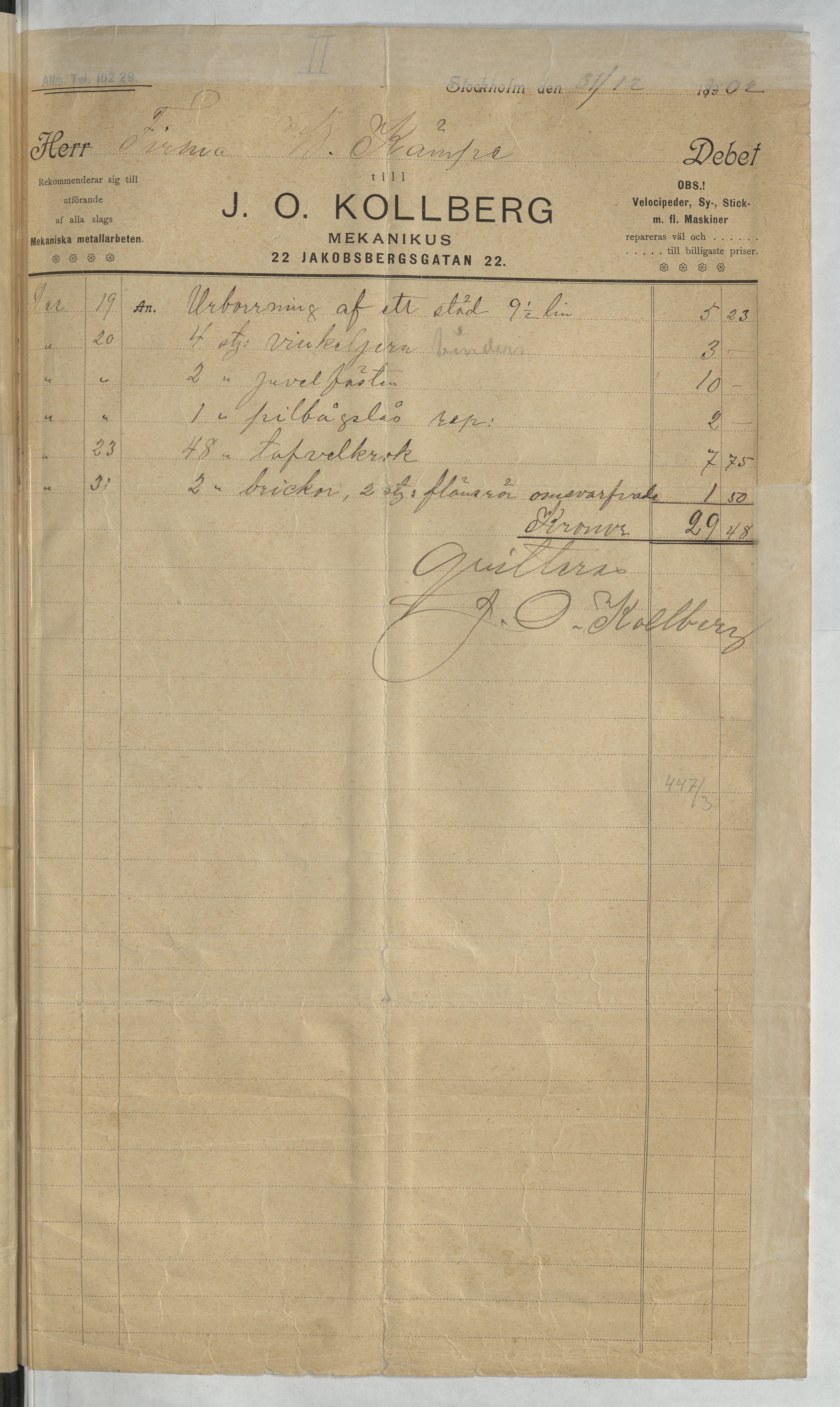 Kvitto från J. O. Kollberg, Mekanikus