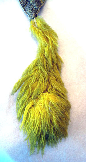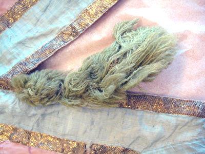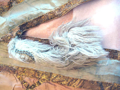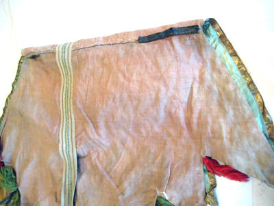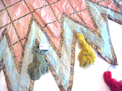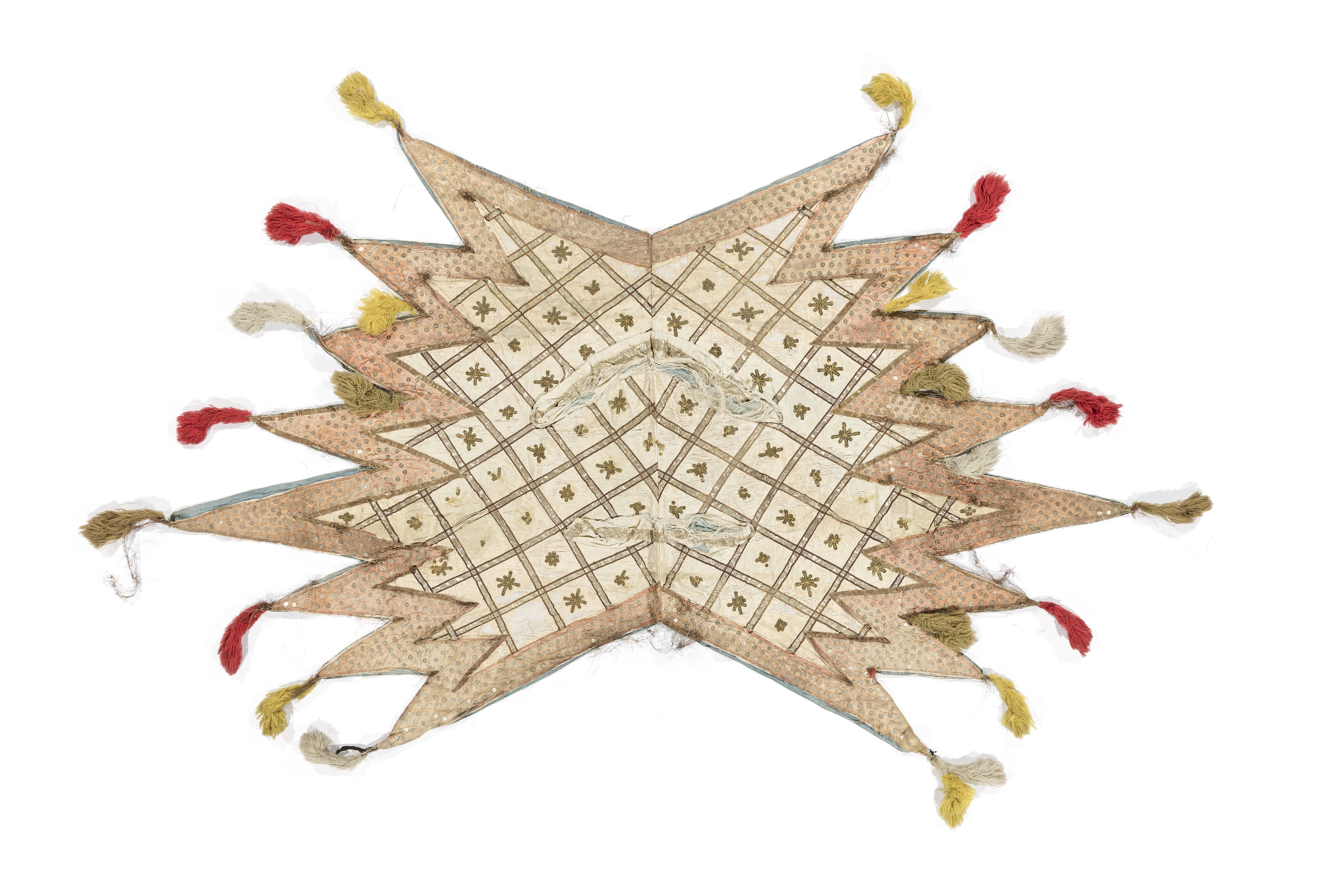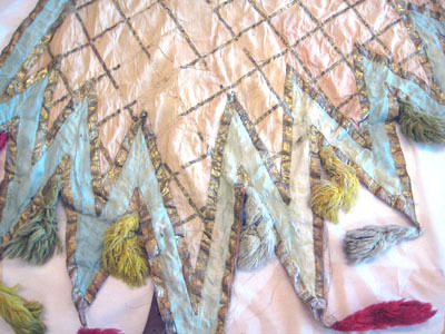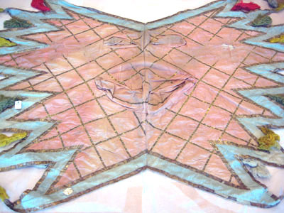 Sadeltäcket är format som en stjärna med 16 styck spetsar. På varje spets är fastsydd en tofs av ylletyg, 170 mm lång. Alla tofsar går i olika färger där sju är gula, sex röda, fem vita och fem gröna. Utsidan som är i vitt siden är sydd på ett vitt tyg av linne. Sidentyget är dekorerat med ett band som bildar ett rutmönster. Bandet är vävt i förgyllt koppartråd och kantad med brunt tyg av linne, 3 mm brett. I rutmönstrets fält är stjärnor av silverpaljetter och runt hela schabraket går en bård av rosa siden dekorerad med paljetter i silver. Mitt på sadeltäcket är två fickor för bomsadel 430 mm lång och 630 mm lång Fodret är av ljusblått tyg av linne.