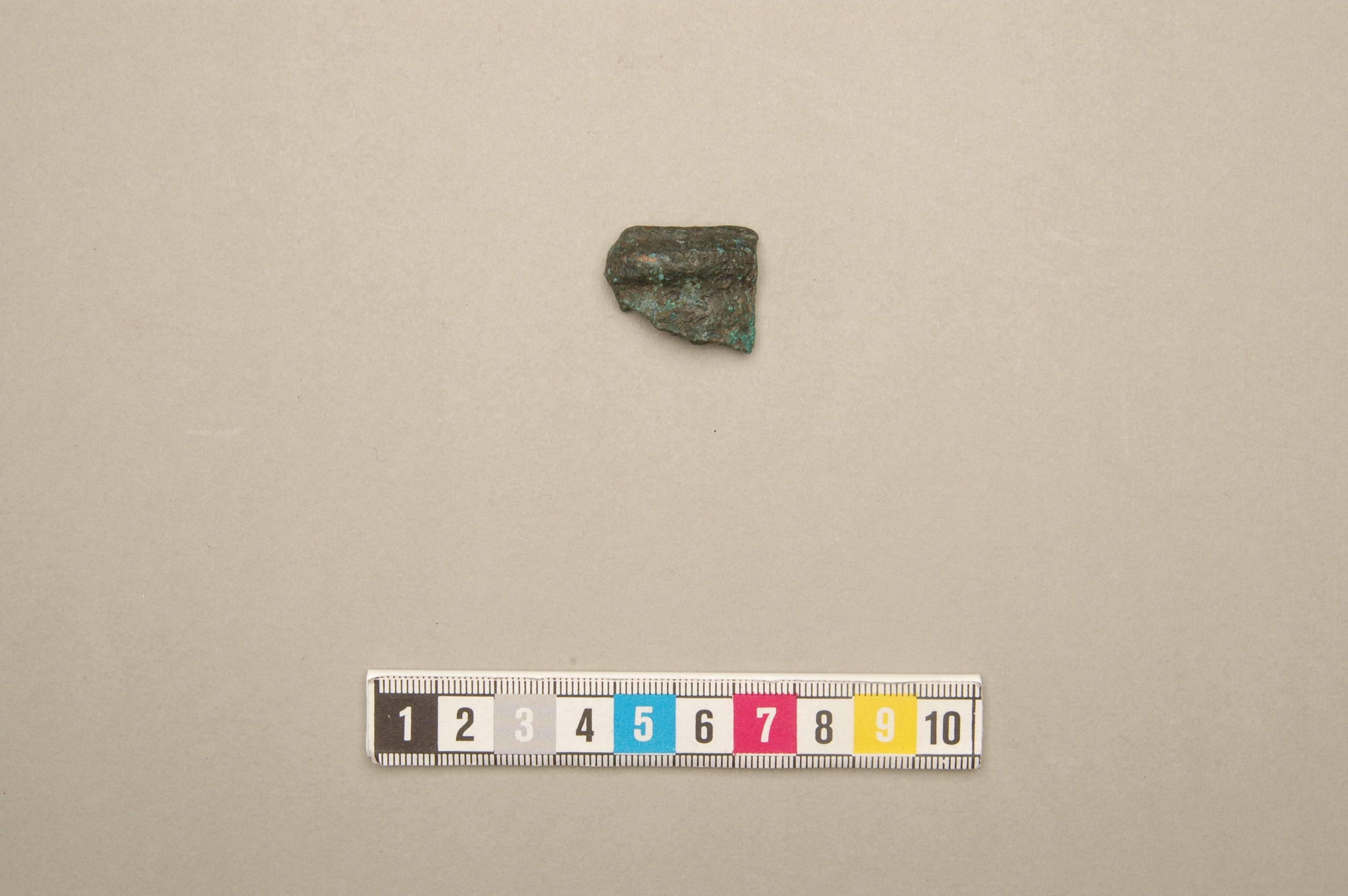 Holkyxfragment av brons. Del av mynningskanten till en holkyxa med en bred runtlöpande kraftig vulst.