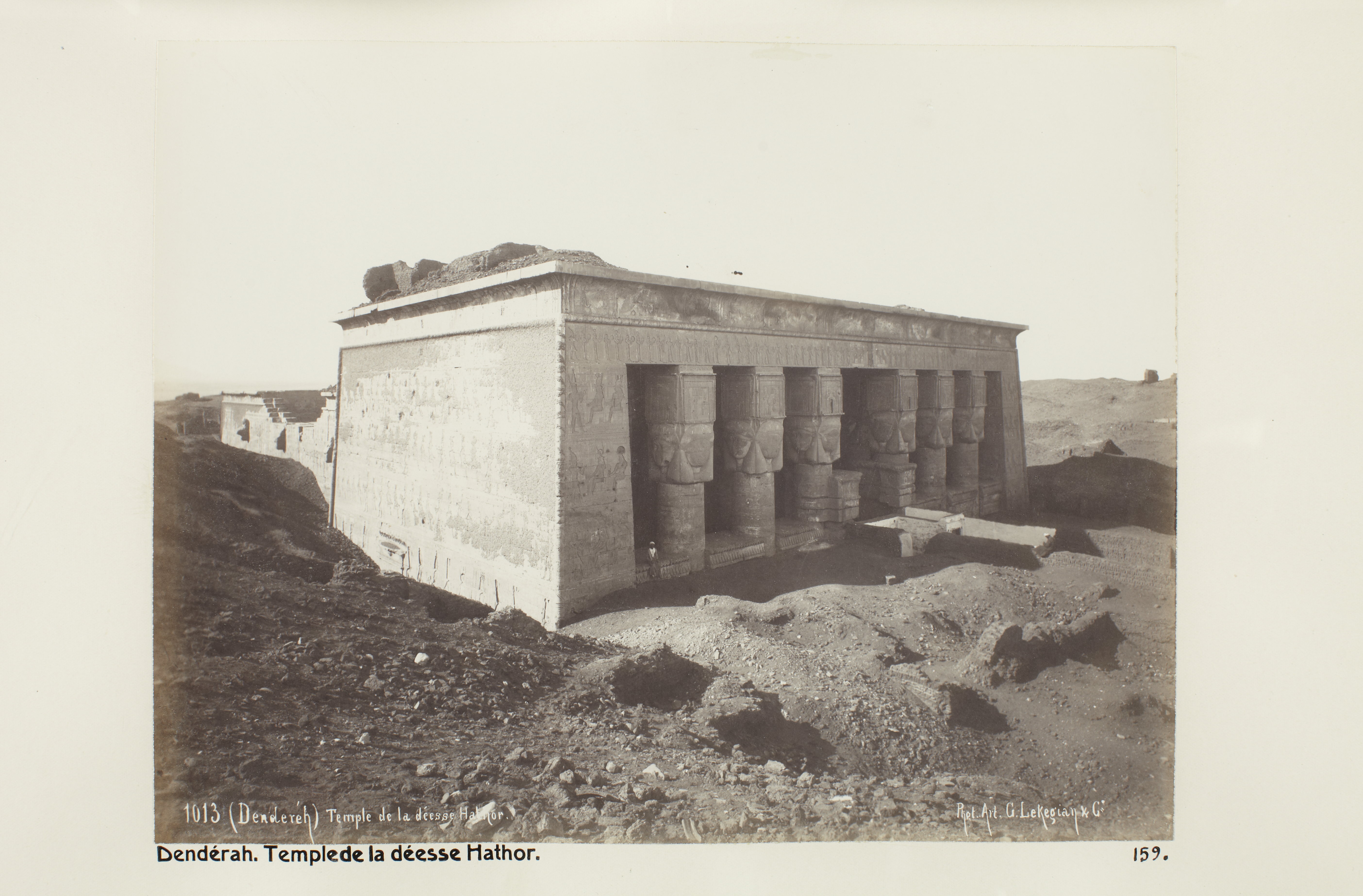 Dendera, Egypten. Gudinnan Hathors tempel. Text på fotografiet: Dendérah. Temple de la déesse Hathor. Fotografierna LXVI:M.01.- 201. kommer från resan till Egypten och Sudan som Wilhelmina och Walther von Hallwyl gjorde vintern 1900-1901. De lämnade Sverige den 5 november 1900 och fortsatte från Egypten till Palestina den 28 mars 1901. Med på resan var döttrarna Ellen med maken Henric de Maré och Irma med maken Wilhelm von Geijer. Wilhelminas sällskapsdam, fröken Ida Uhse reste också med. Under en del av resan anslöt sig ledamoten av Internationella domstolen i Kairo, assessorn Otto Conrad Waldemar Cedercrantz med makan Anna Elisabeth. Vid resan uppför Nilen hade Walther von Hallwyl hyrt ångfartyget Columbia med besättning. Båtresan startade i Kairo 27 december 1900, gick ända till Wadi Halfa varifrån man reste vidare med tåg till Khartum och tillbaka till Wadi Halfa. Båten vände åter i riktning mot Kairo, men det verkar som att sällskapet tog tåg sista biten, från Luxor. Henric och Ellen de Maré samt fru Cedercrantz lämnade båten redan då de passerade Luxor första gången. Resten av sällskapet återvände till Kairo den 1 mars. Fotografierna LXVI:M.01.-120. togs av resenärerna själva, de största av Ellen de Maré, de mellersta av Wilhelmina von Hallwyl och de minsta av Wilhelm von Geijer. Resten köptes av professionella fotografer i Kairo, de flesta från Studio Photogr. Artistique G. Lekegian & Cie. Alla uppgifter kommer från Ida Uhses reseanteckningar. Inköpt hos studio Photogr. Artistique G. Lekegian & Co.