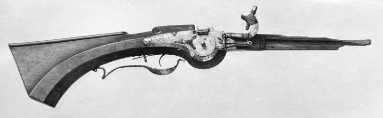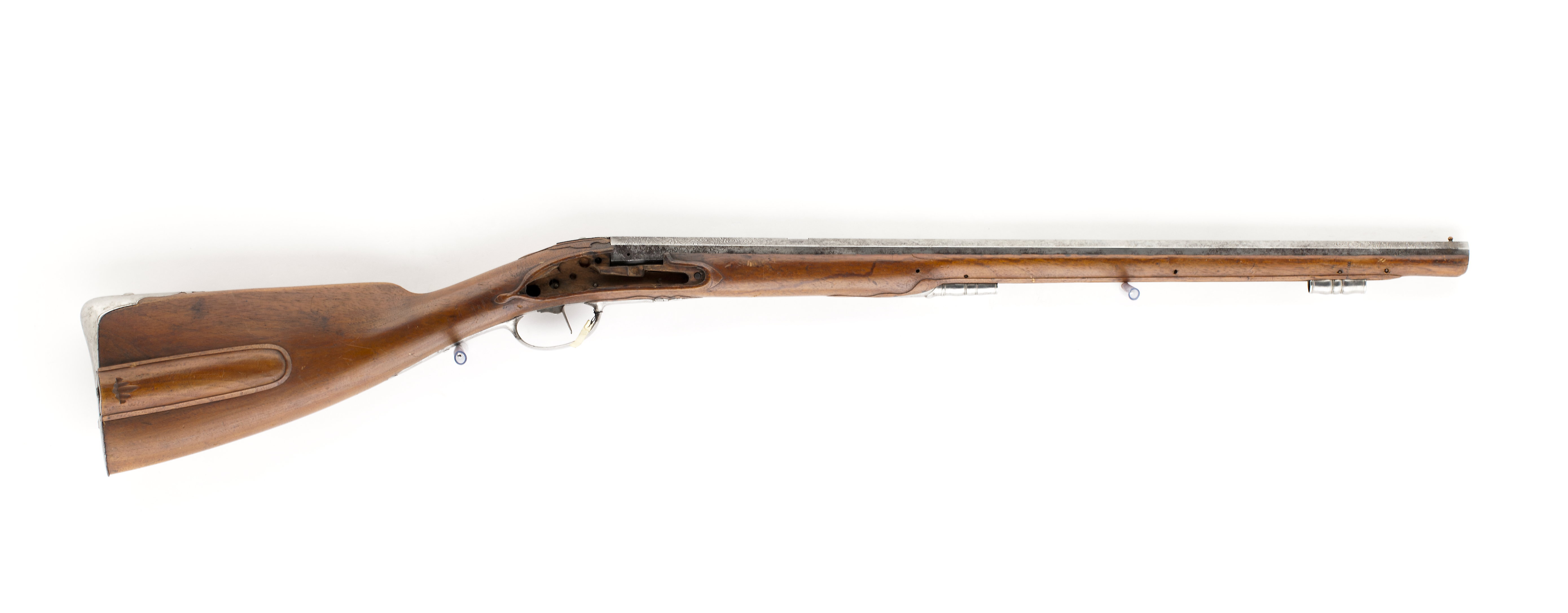 Åttsidig, slätborrad pipa av stål, kanterna på pipans undersida delvis avrundade. Rektangulärt, svagt böjt, tvärt avskuret svansskruvblad, på bladet, på kammarens bakre del samt vid mynningen fält med punsad blom- och bladdekor mot ringpunsad bakgrund. Fälten avgränsade av mot pipans mitt riktade, graverade spetsar, därutanför rankor punsade med ringpuns. På kammarens undersida en stor, otydlig stämpel. Riktmedel: Inlaxning för sikte som saknas, knoppkorn av koppar. Fästning: Tre häften. Pipan fäst med krysskruv samt ett pipstift av stål, de två bakre stiften saknas. Flintlås saknas. Svagt böjd avtryckare, en låsskruv (ny). Konturerarat avtryckarbleck. Helstock av ljusbrunt trä (alm?). Kolv av fransk typ med kindstöd och kolvlåda, snidad bladdekor vid kindstödets framände, nederkanten fasad, kolvryggen plan. Kolvlådelock med kantlist samt inskuret, bladformigt fingergrepp. Beslag av stål, bakplåt med spetsig tå, på kolvryggen bred, konturerad flik med bladformig spets, graverade kantlinjer, blad samt slingor runt fästskruven på fliken, två fästskruvar. Sidbleck i form av välvt rankverk, s-formigt svängda delar mellan skruvarna samt bakom den bakre låssrkuven, båda delarna avbrutna på mitten av skålat band. En + en profilerad rörka, slät, triangulär spets. Varbygel med kantlister på bygeln, välvd främre arm med avslutning i form av fasettterad urna med bladknippe. Lång bakre arm med avslutning i form av treflikigt blad.