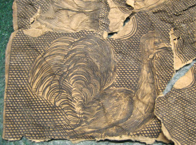 Pappersbitar, troligen fyllning till broderi på hästtäcke.