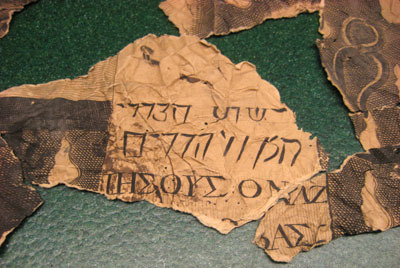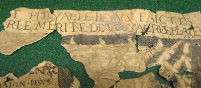 26 ihopskrynklade, isärrivna pappersbitar. Tryckt passionsmotiv på ena sidan med bland annat Kristus med törnekrona, spridda droppar, tång, handskar, tupp. Textstycken, med romerska, grekiska och eventuellt persiska bokstäver, bland annat: "...PITCYABLE IESVS FAICTES /.../ ...RLE MERITEDE VOSSACREEPLAYES". "/.../IESVS // NAZARENVS. // REX. IVD".