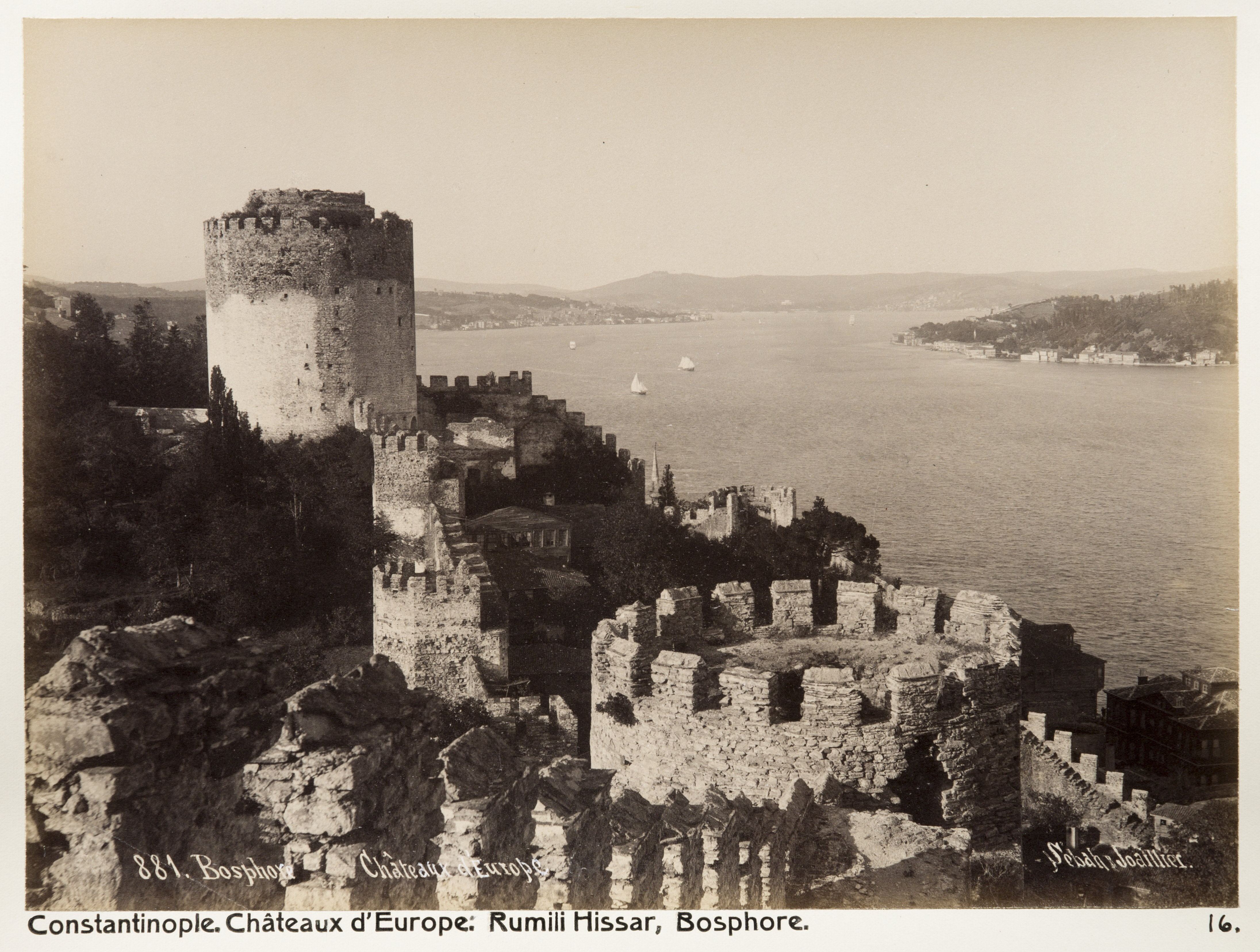 Bosporen. Det europeiska slottet Rumili Hisari. Text på originalet: "Bosphore. Châteaux d`Europe: Rumili Hissar." Fotografierna LXVI:O.01.-54. kommer från resan till Turkiet och Mindre Asien som Wilhelmina och Walther von Hallwyl gjorde den 27 april - 20 juni 1901. De lämnade Sverige den 5 november 1900 för Egypten, där de stannade till den 28 mars 1901, då de fortsatte till Palestina. Den 27 april fortsatte de till Turkiet och Mindre Asien. Med på resan var Wilhelminas sällskapsdam, fröken Ida Uhse. I Konstantinopel (Istanbul) anslöt sig Wilhelminas mor Johanna Kempe och kusindottern Elma Hök. Fotografierna är inköpta av Wilhelmina i Konstantinopel (Istanbul) och Brussa. Alla uppgifter kommer från Ida Uhses reseanteckningar.
