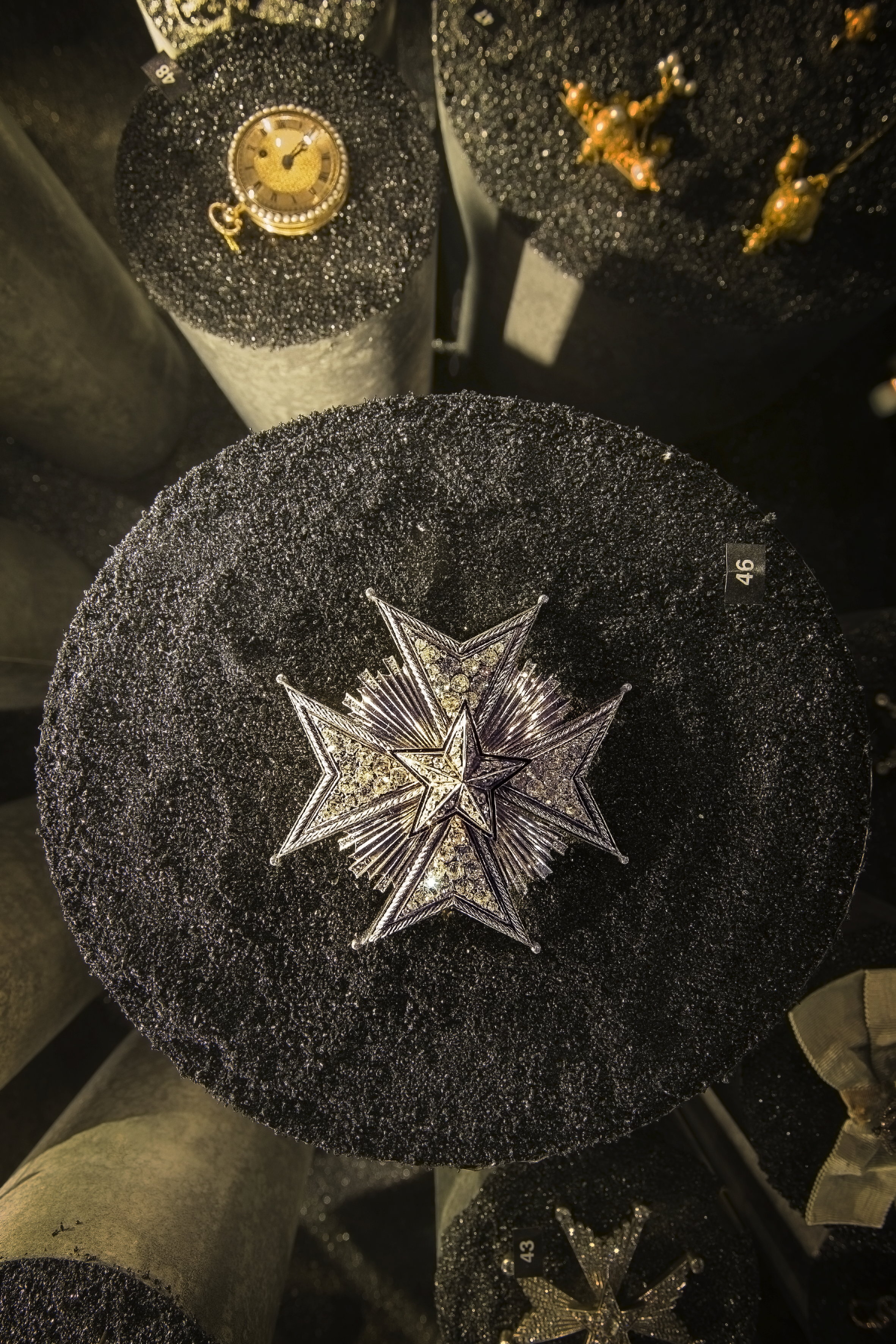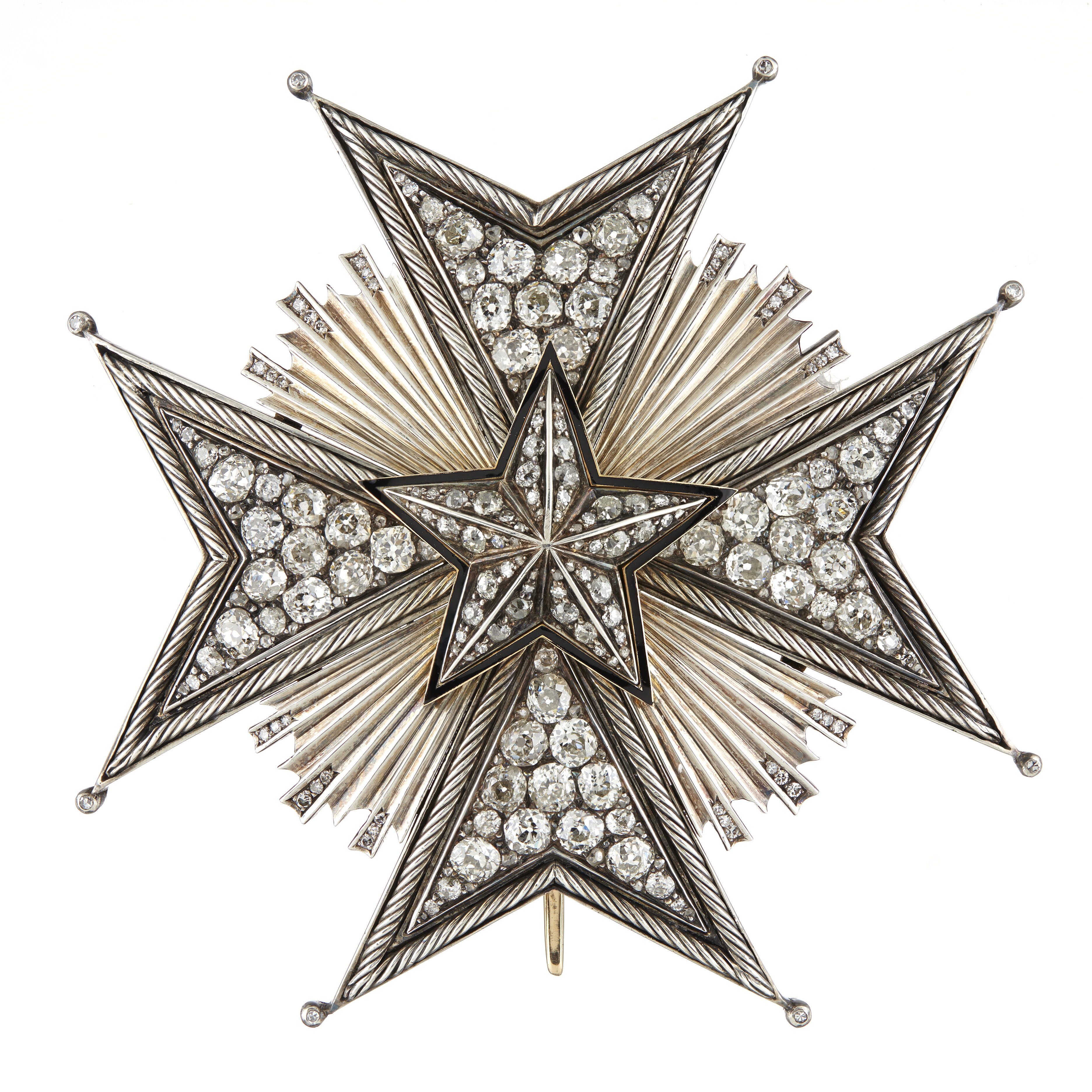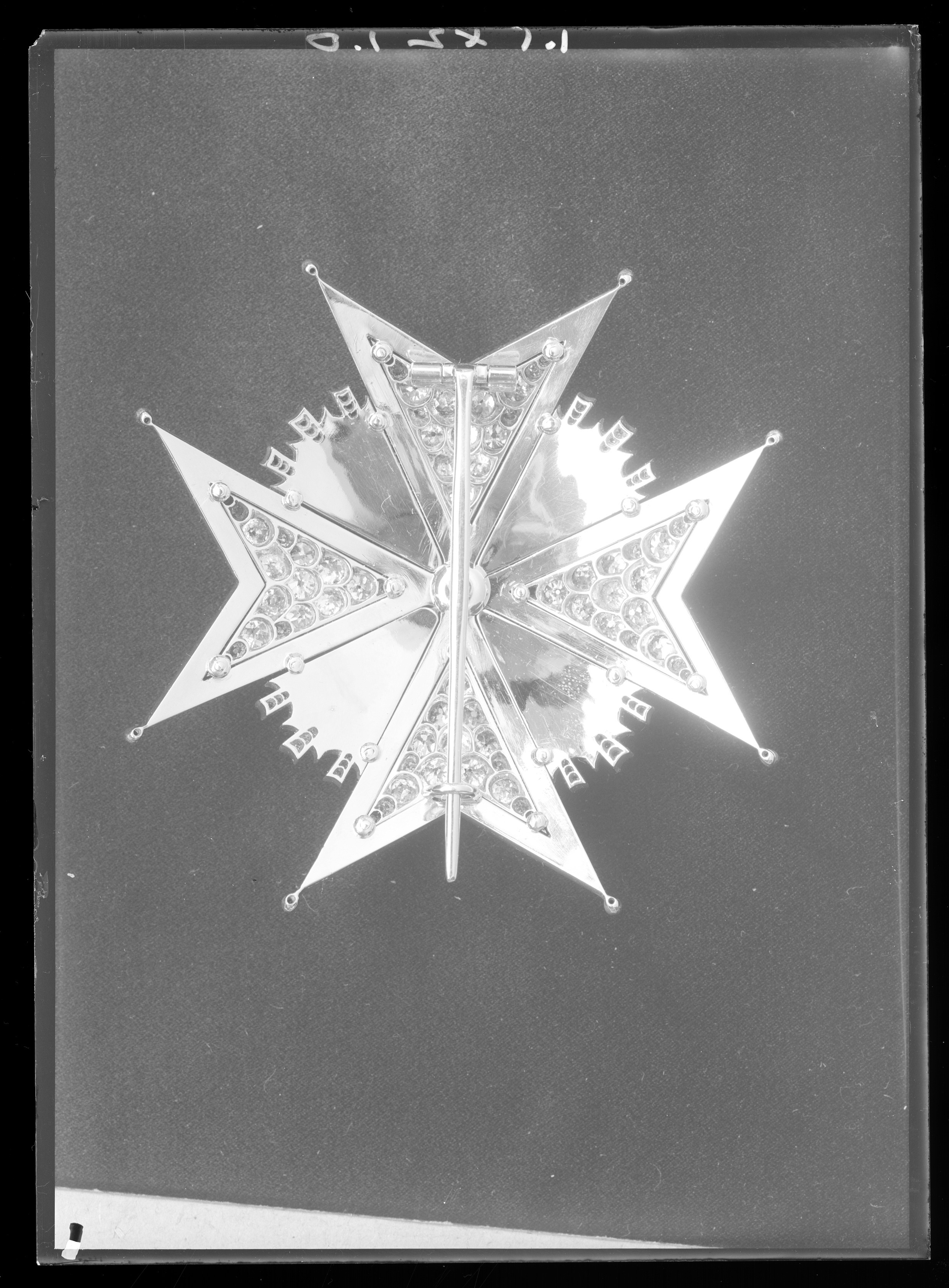 Malteserkors av silver med repstavskantbård, kulor besattta med briljanter på spetsarna. På armarnas mittfält 10 större och 22 mindre briljanter (1 liten briljant saknas i nedre kanten av höger arm). I mitten en fasetterad, femuddig stjärna av förgyllt silver med svartemaljerad kant, på de 10 faserna vardera 6 briljanter. Mellan korsarmarna 4x9 strålar av olika längd, de tre längsta i varje knippe besatta med vardera 3 briljanter. De större stenarna på tecknet med à jourfattning. Baksidan slät med säkerhetsnål. På kanten av nedre korsarmens högra spets stämplar: C F C, St.Erik, tre kronor, S, A9 (C F Carlman, Stockholm 1951).