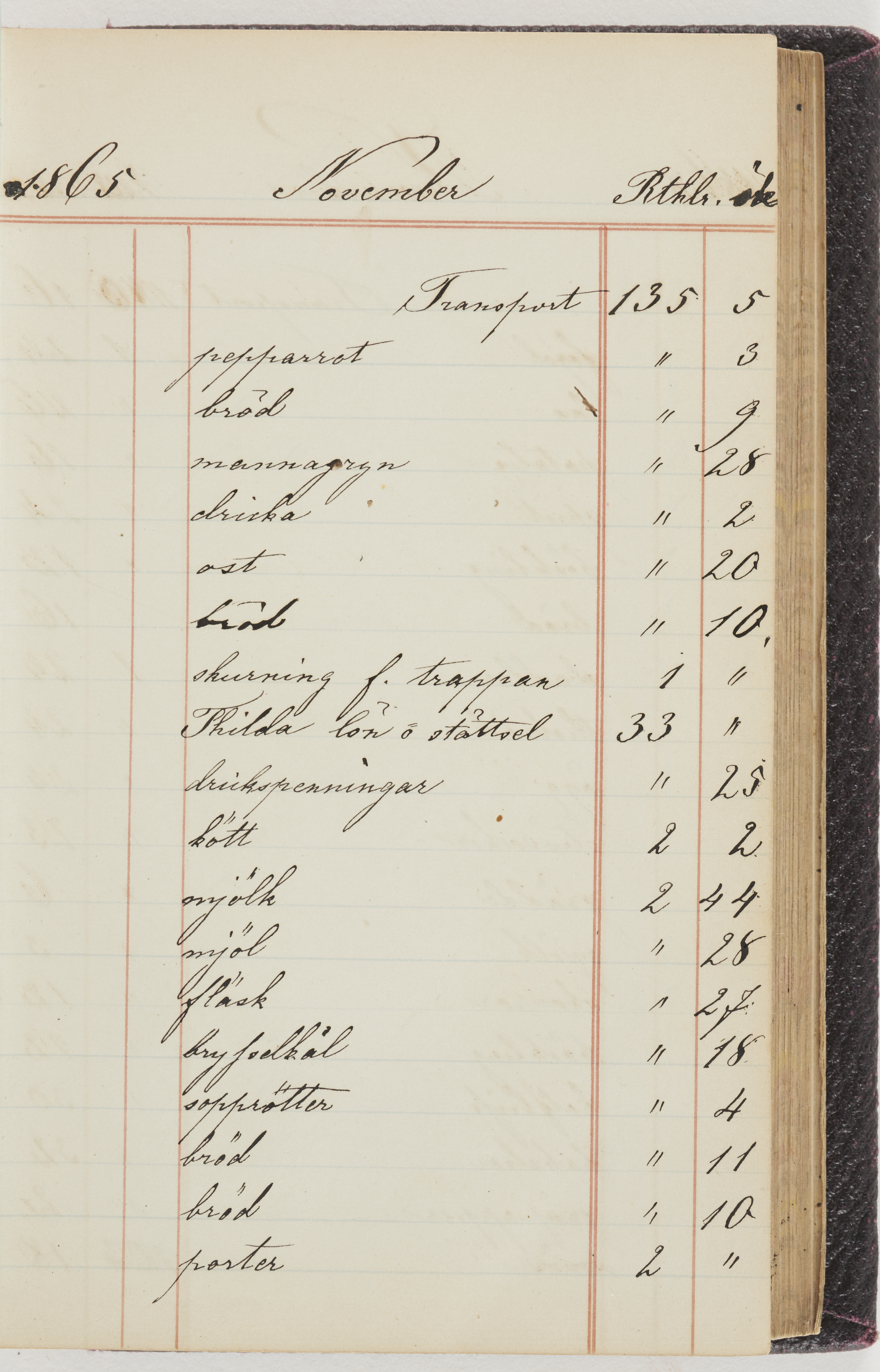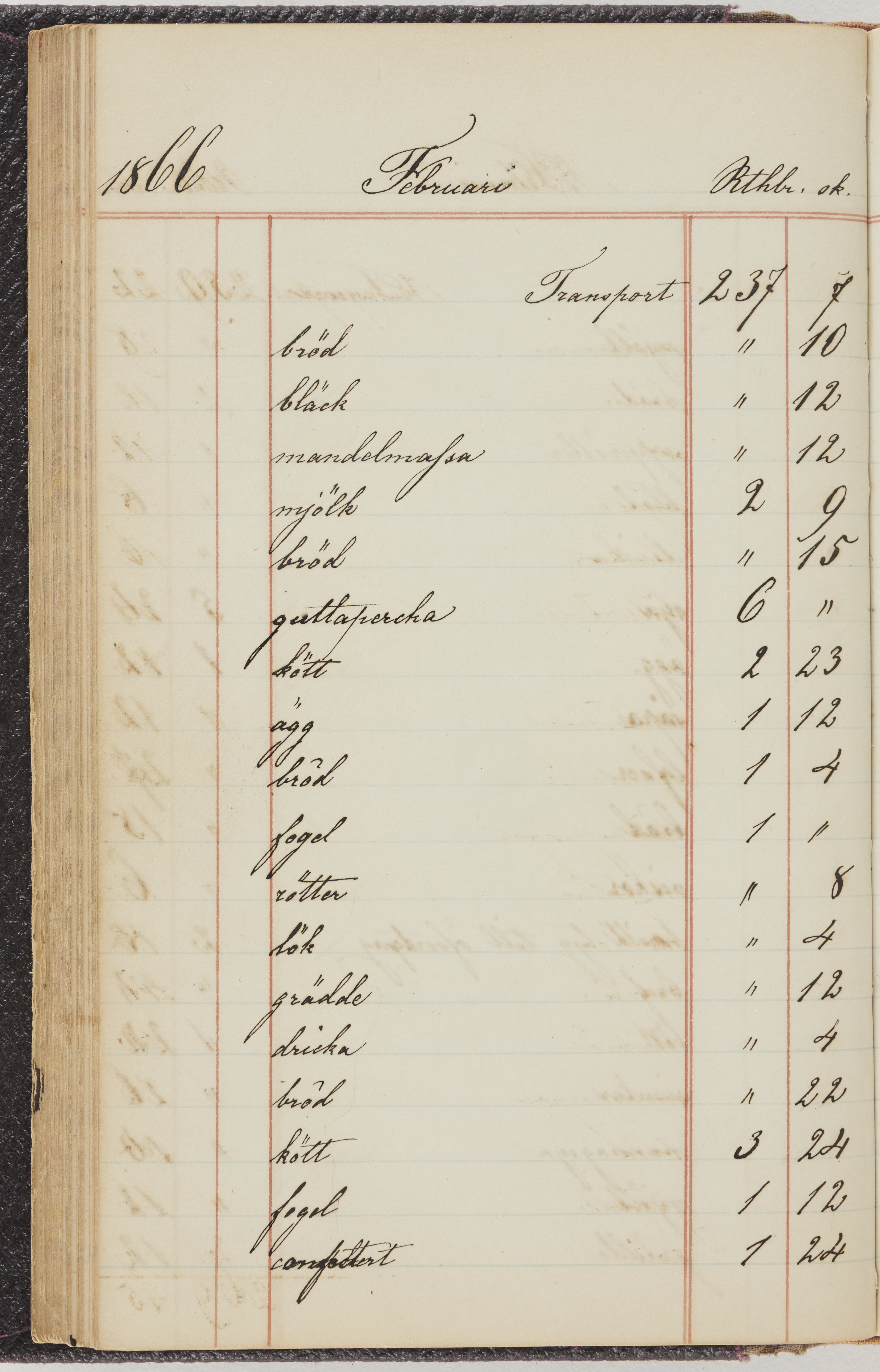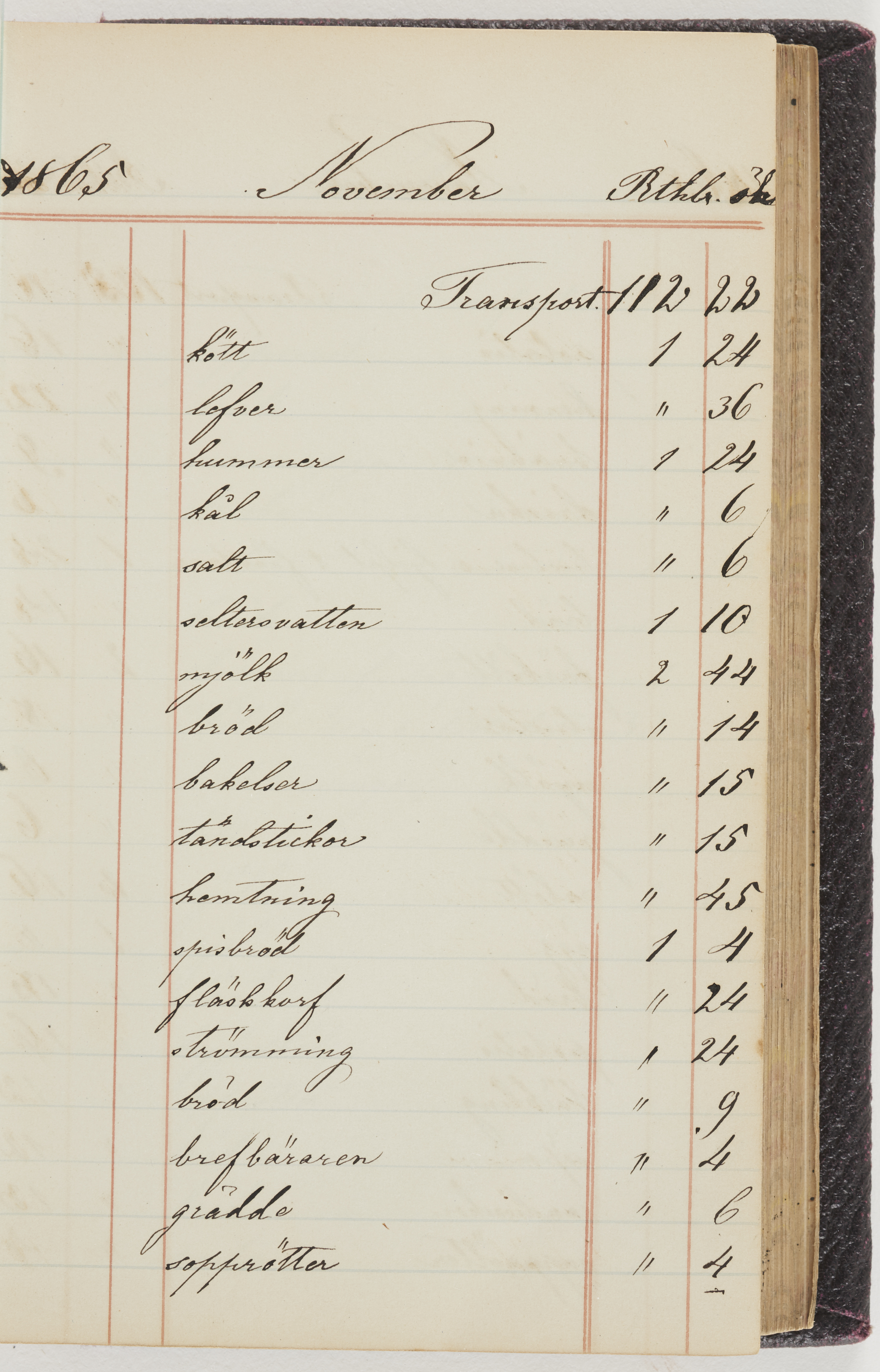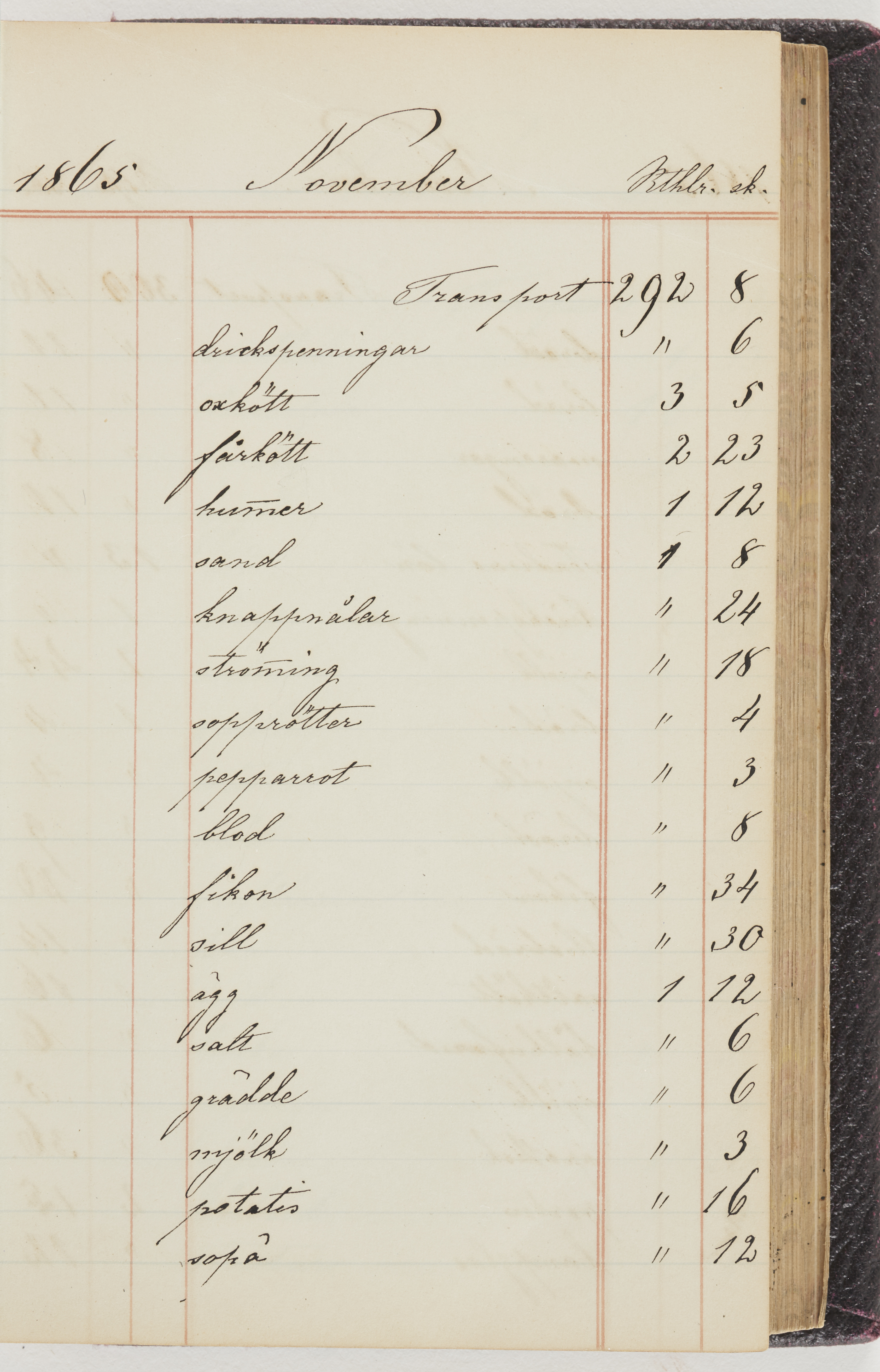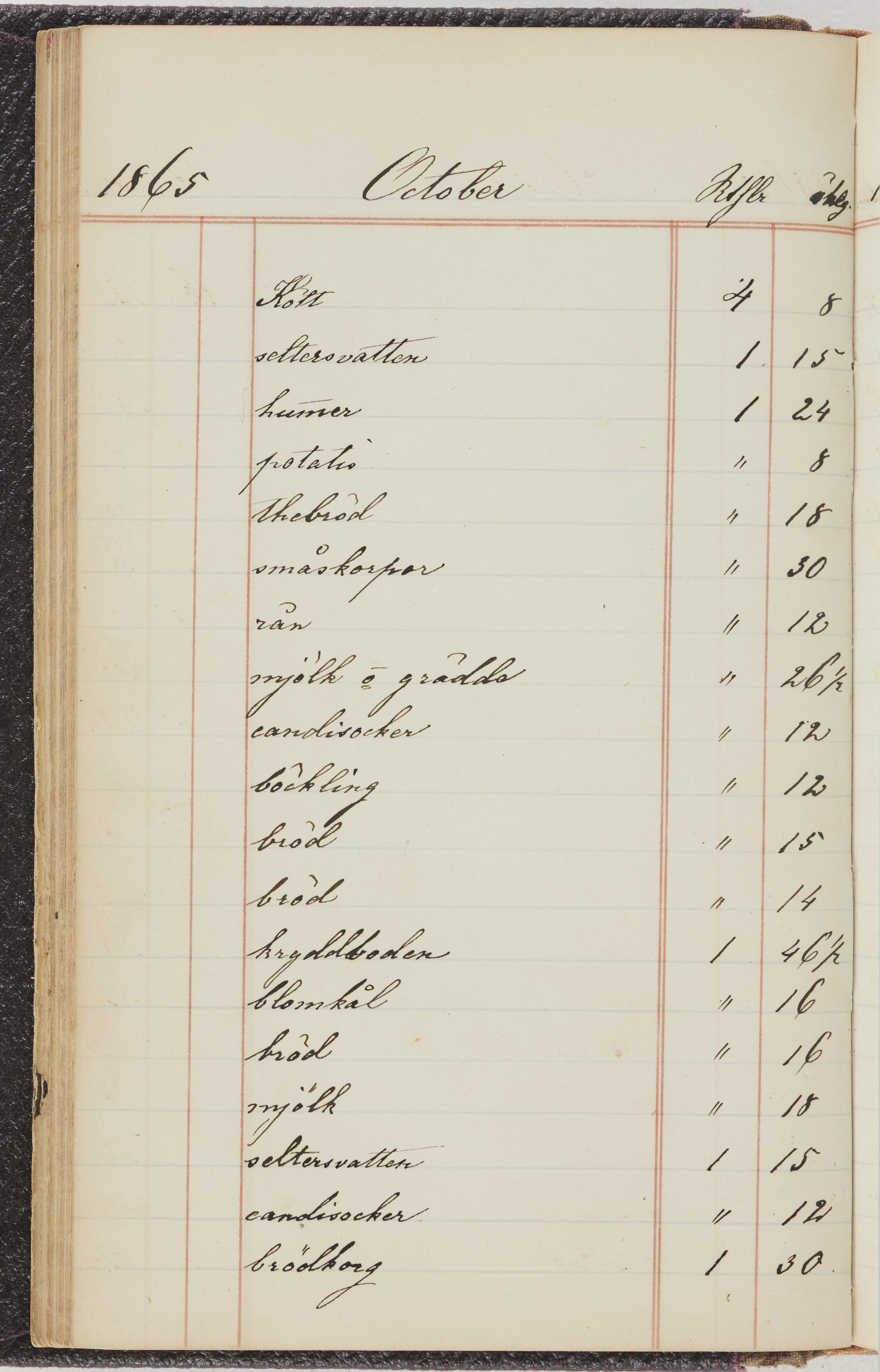Hushållsbok. 10 vol. inb. 8:0. 1865-1872. 372 s. 1872. 134 s. 1886-1890. 582 s. 1891-1896. 572 s. 1897-1903. 610 s. 1904-1910. 606 s. 1911-1917. 612 s. 1918-1923. 586 s. 1924-1929. 608 s. 1930. 608 s. Skrivna av W. v. H. f. K. Vol. 4-8. Helt band av brunt (vol. 4 och 5) och svart (vol. 6-8) pressad klot. Linjeramar i blindtryck på pärmarna. Kapitel av gult skinn i vol. 4, av tyg i vol. 5-8. Marmorerad snitt. Försättsblad av blårutigt papper i vol. 4, av vitt papper i vol. 5, av brun olifant i vol. 6 och 7, av grå olifant i vol. 8. Vol. 9-13. Helt band av mörkblå klot, bundet med dubbel ansättning och knäpprygg. Kapitel av gult skinn. Marmorerad snitt. Försättsblad av belgisk marmor. i vol. 9, av ljusblått marmorellapapper i de övriga volymerna. Nedtill i vol. 10 och 13 Gust. Hedberges frimamärke i blått.