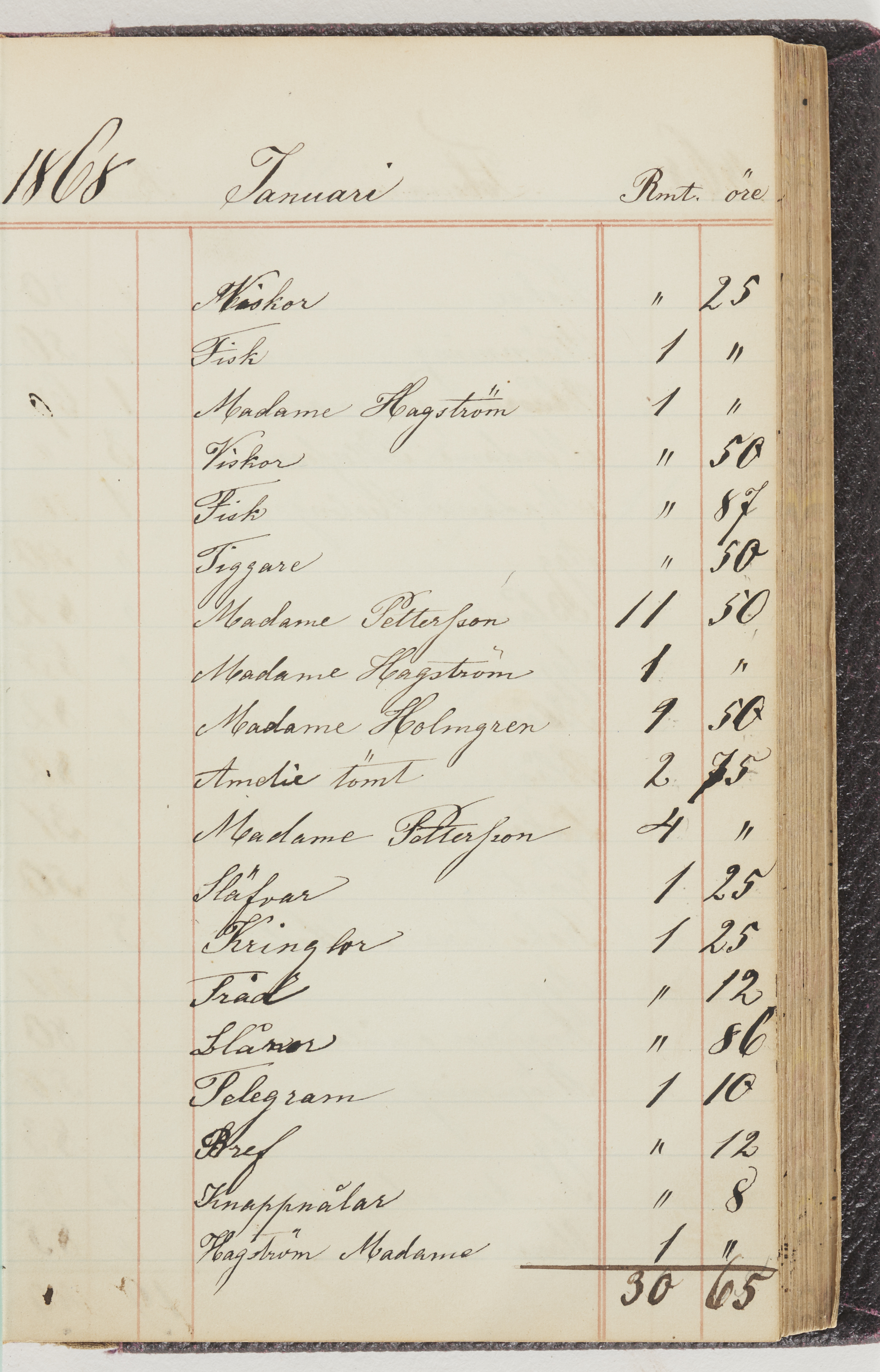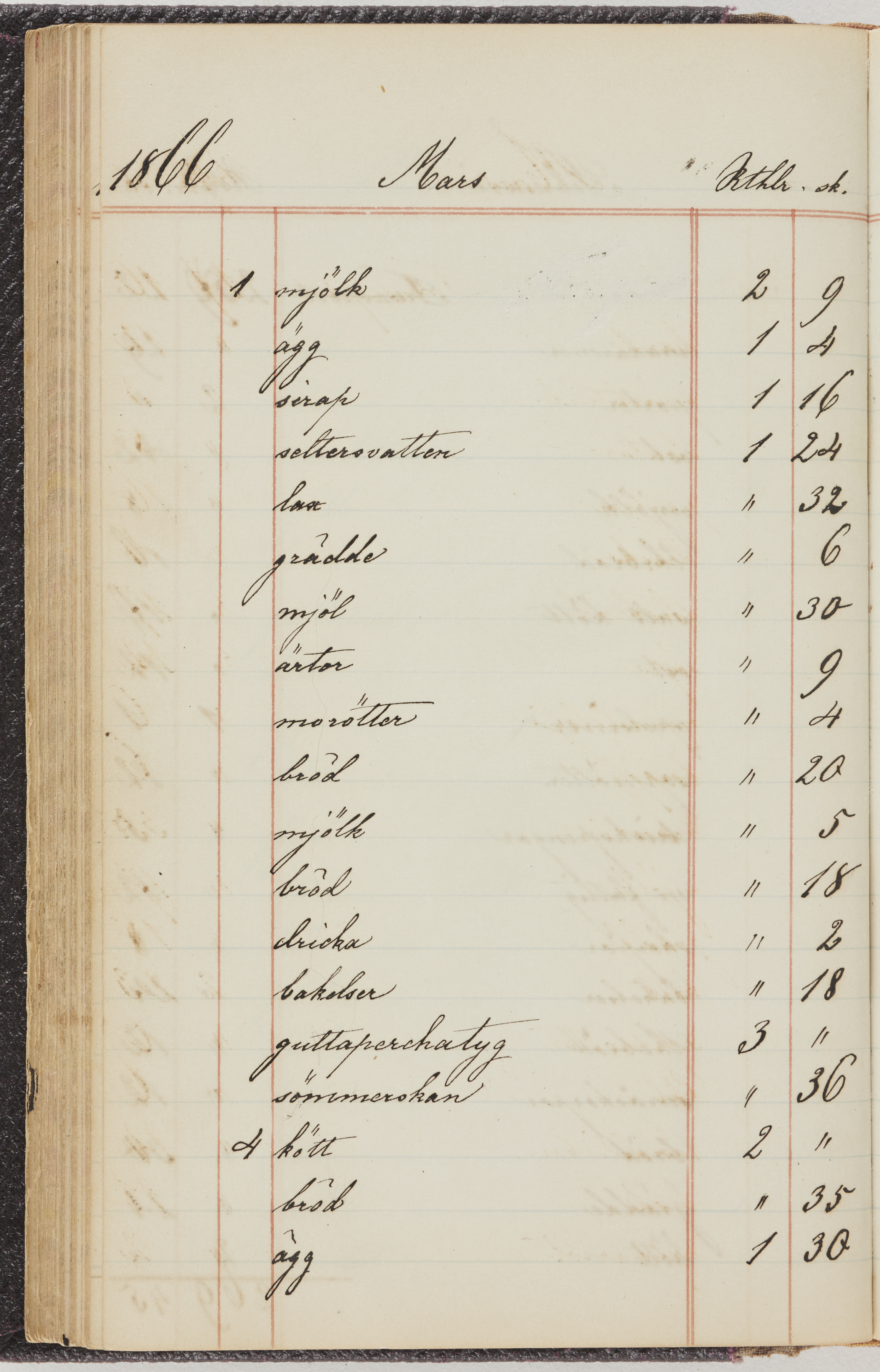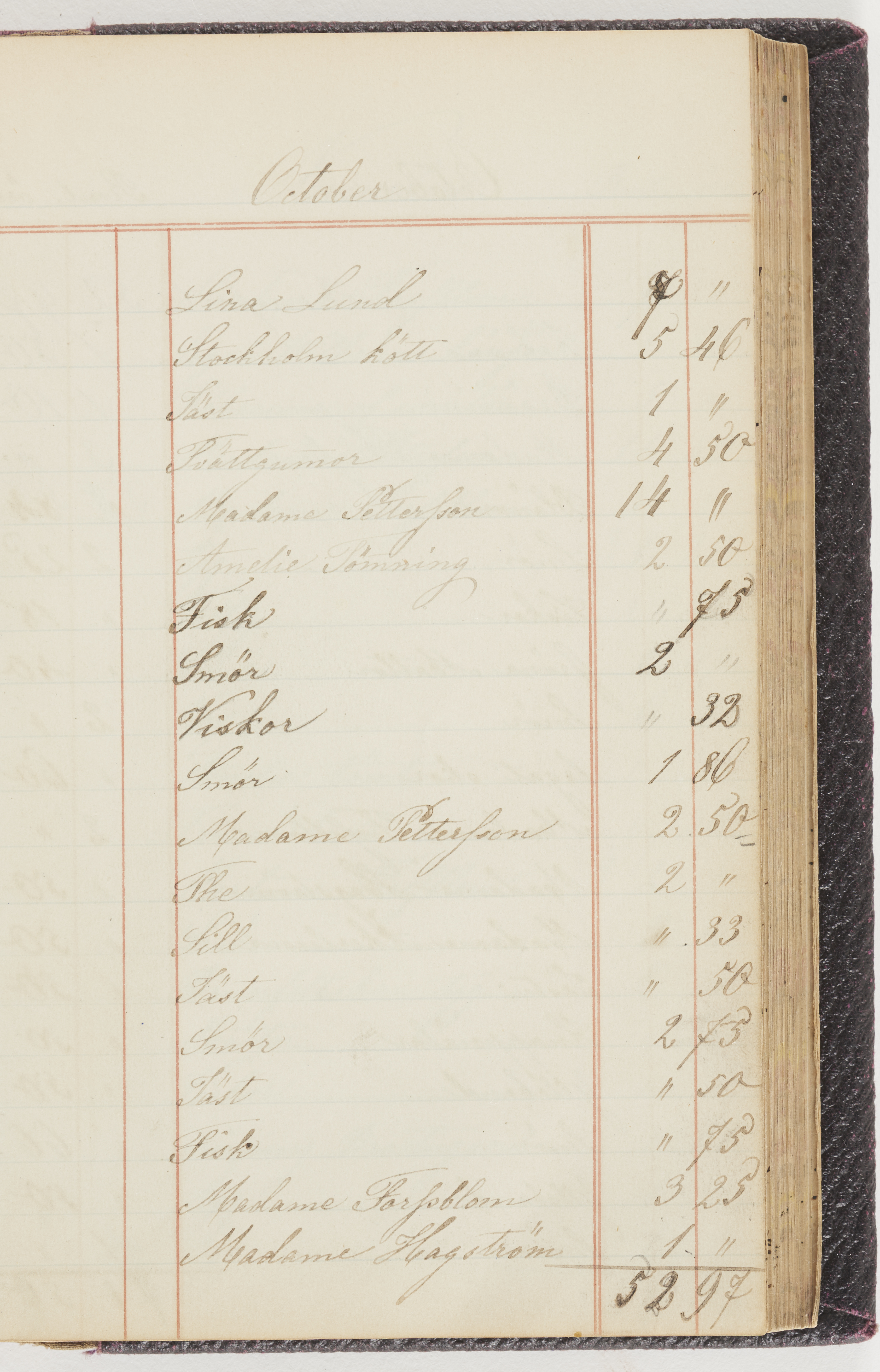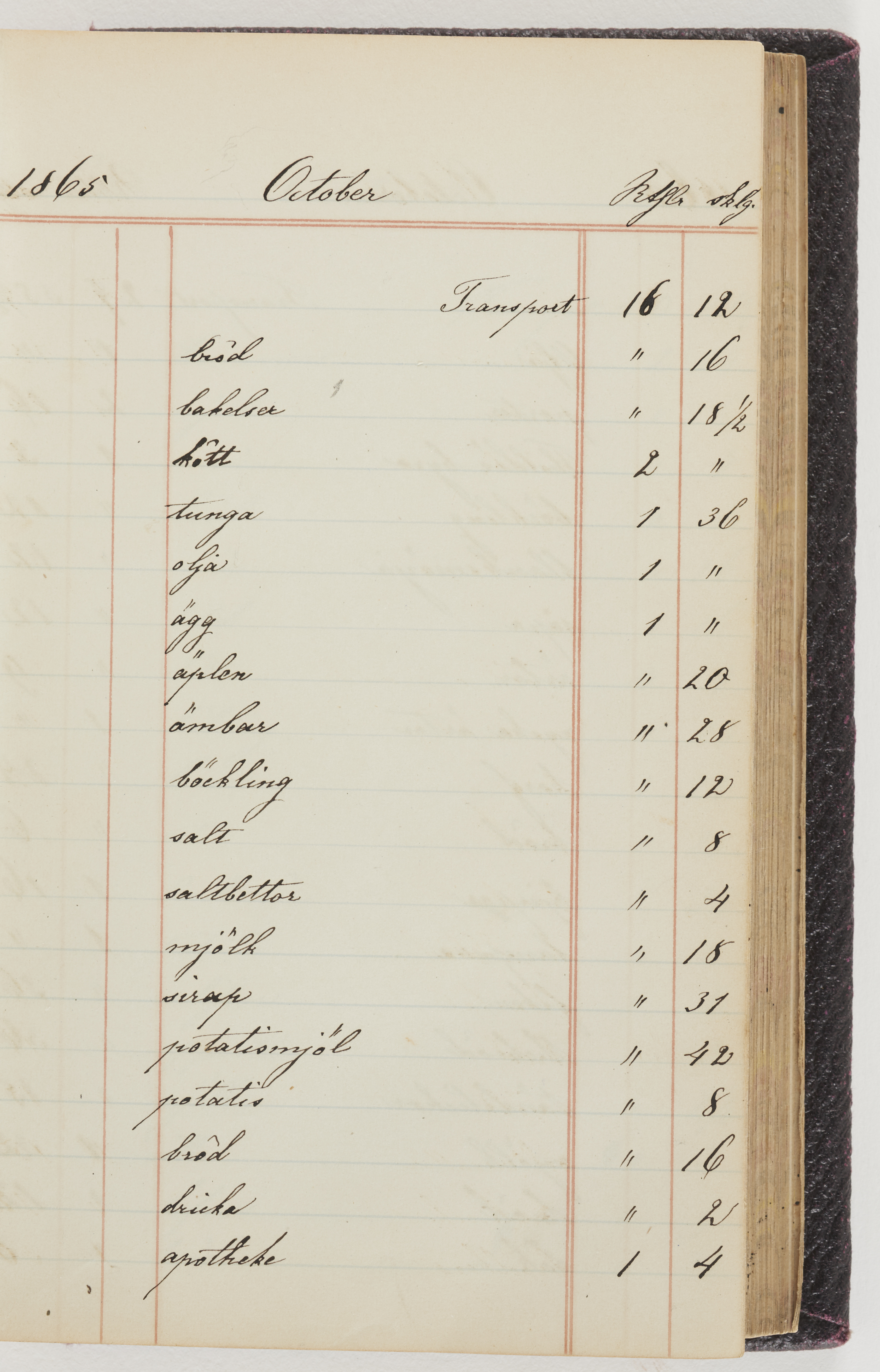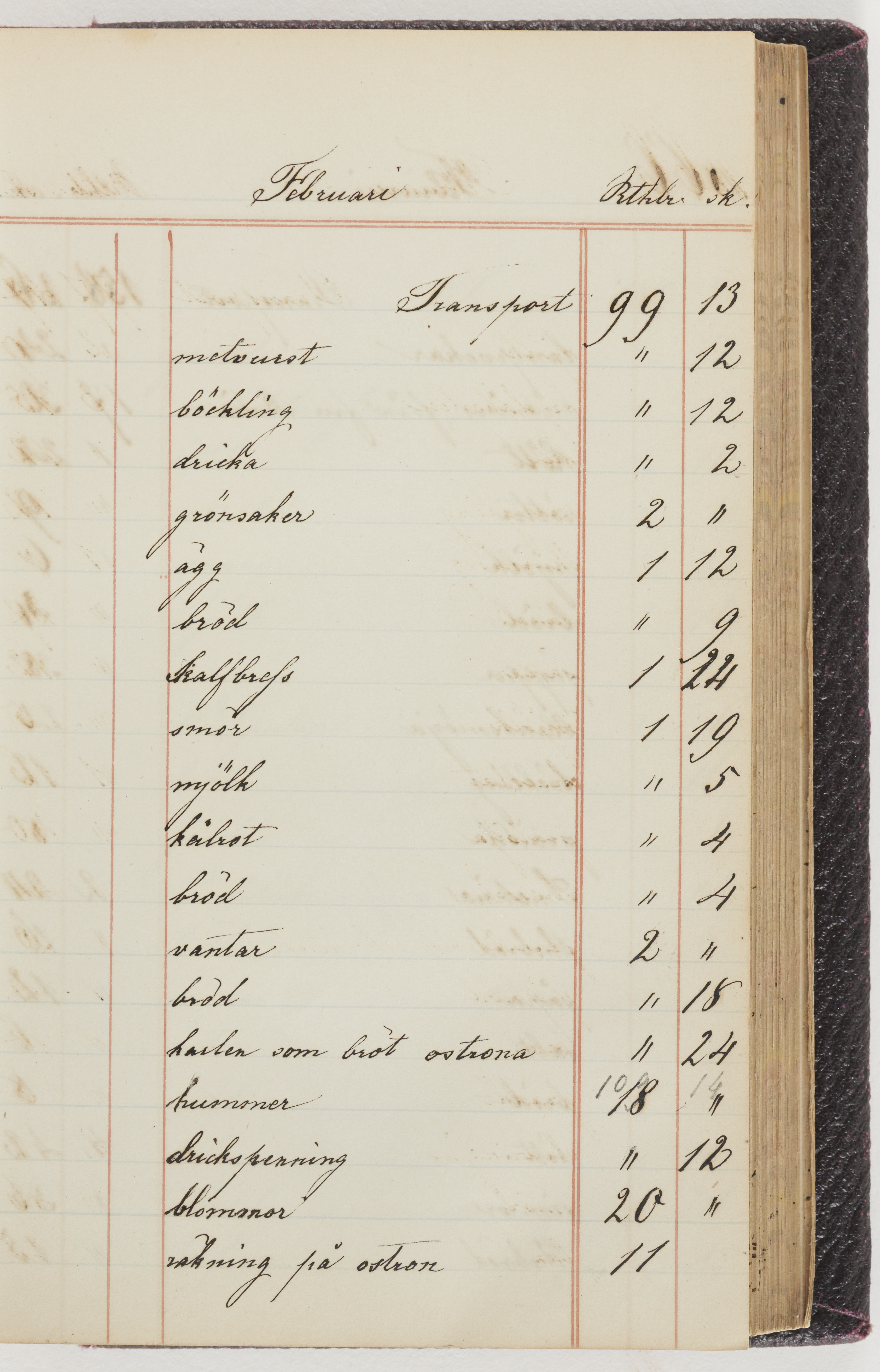 Hushållsbok. 10 vol. inb. 8:0. 1865-1872. 372 s. 1872. 134 s. 1886-1890. 582 s. 1891-1896. 572 s. 1897-1903. 610 s. 1904-1910. 606 s. 1911-1917. 612 s. 1918-1923. 586 s. 1924-1929. 608 s. 1930. 608 s. Skrivna av W. v. H. f. K. Vol. 4-8. Helt band av brunt (vol. 4 och 5) och svart (vol. 6-8) pressad klot. Linjeramar i blindtryck på pärmarna. Kapitel av gult skinn i vol. 4, av tyg i vol. 5-8. Marmorerad snitt. Försättsblad av blårutigt papper i vol. 4, av vitt papper i vol. 5, av brun olifant i vol. 6 och 7, av grå olifant i vol. 8. Vol. 9-13. Helt band av mörkblå klot, bundet med dubbel ansättning och knäpprygg. Kapitel av gult skinn. Marmorerad snitt. Försättsblad av belgisk marmor. i vol. 9, av ljusblått marmorellapapper i de övriga volymerna. Nedtill i vol. 10 och 13 Gust. Hedberges frimamärke i blått.