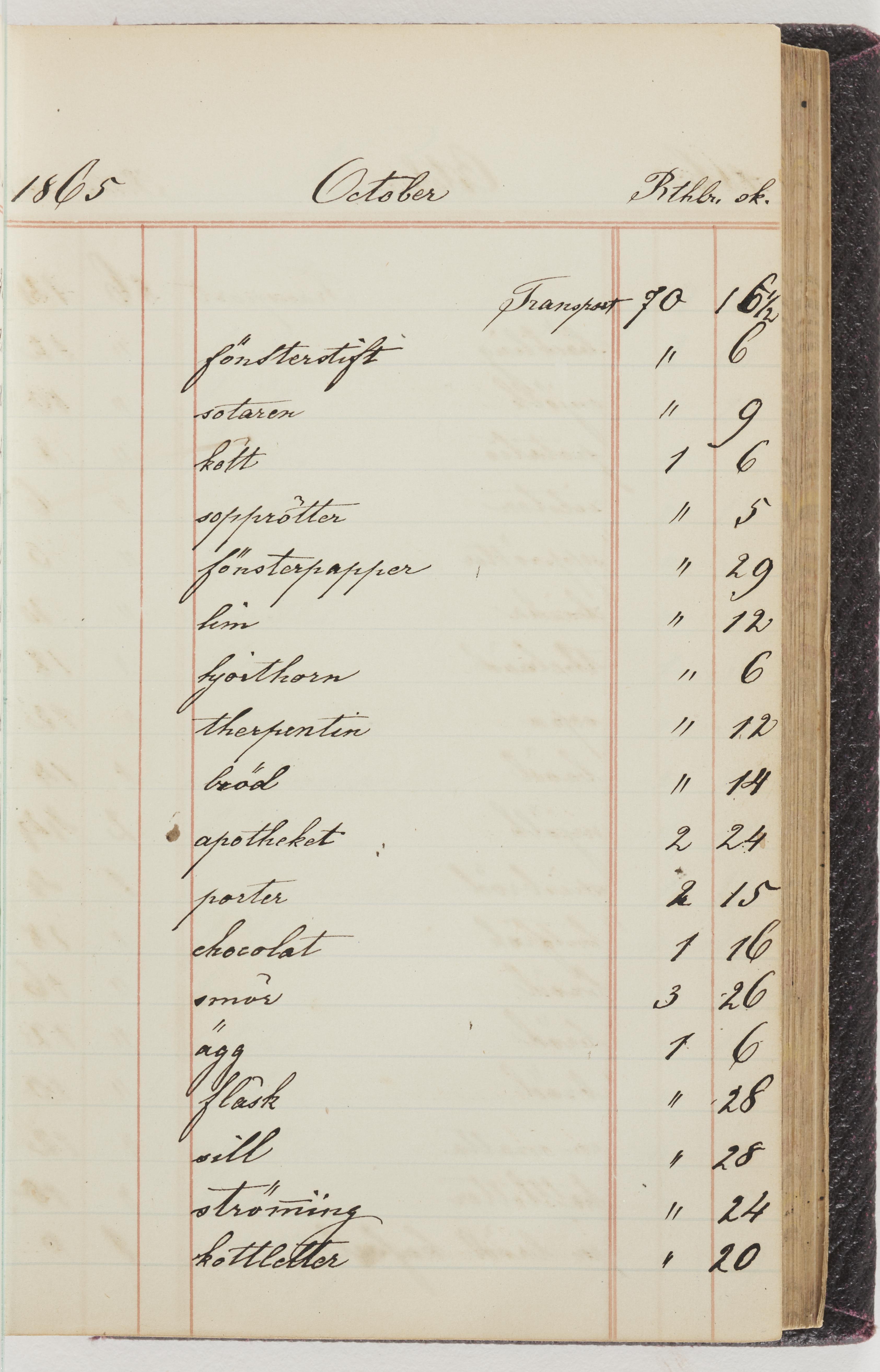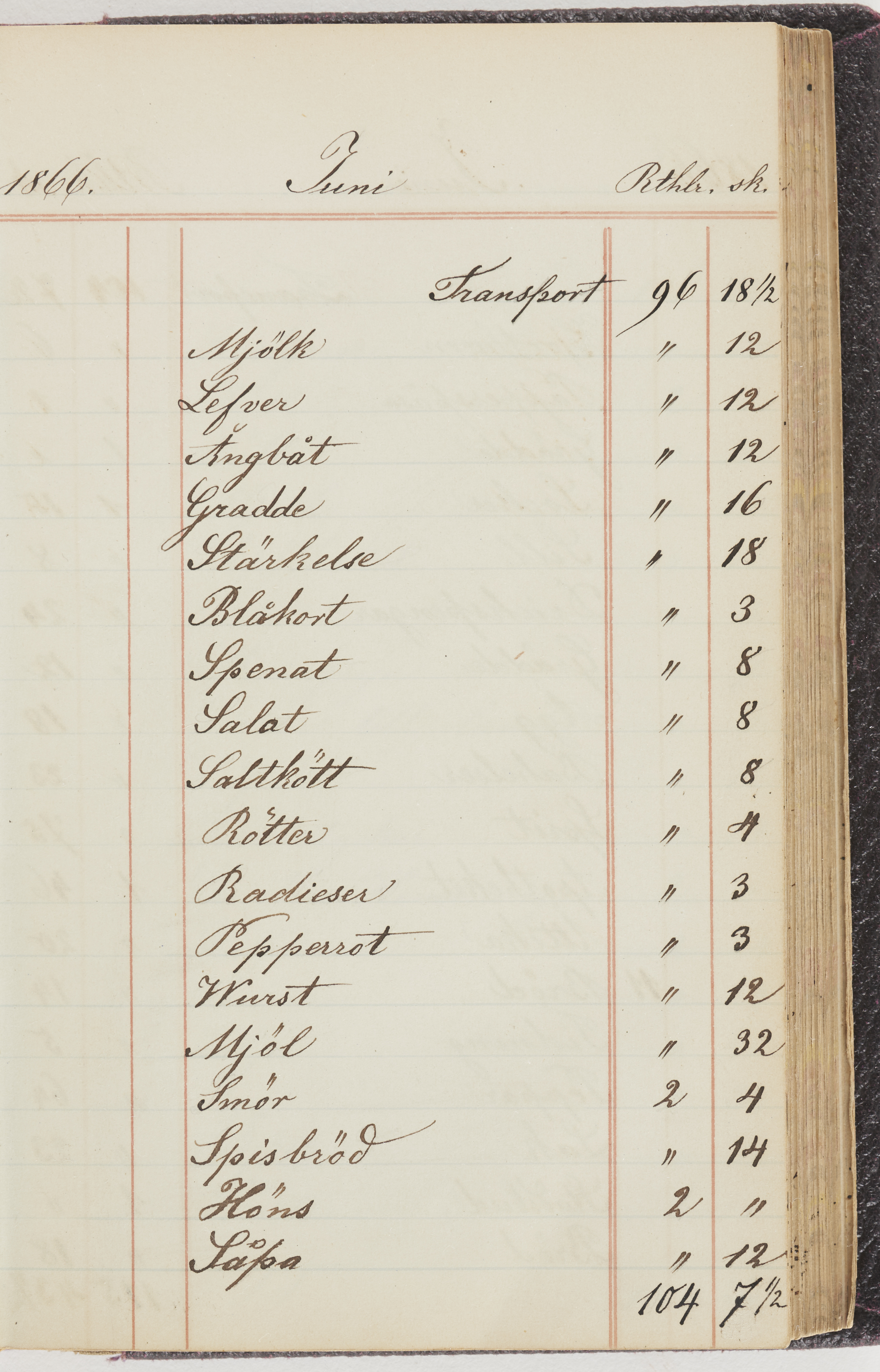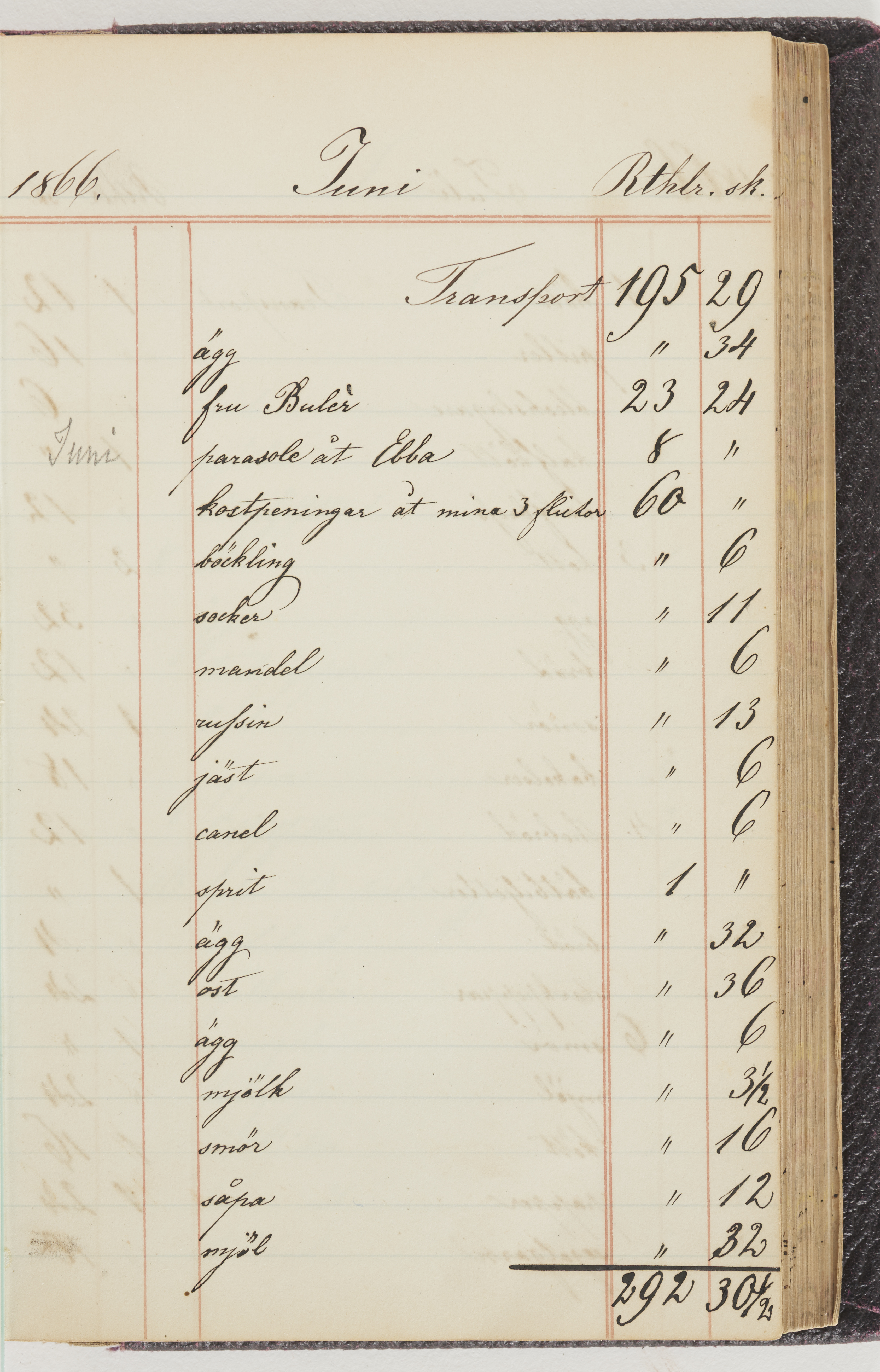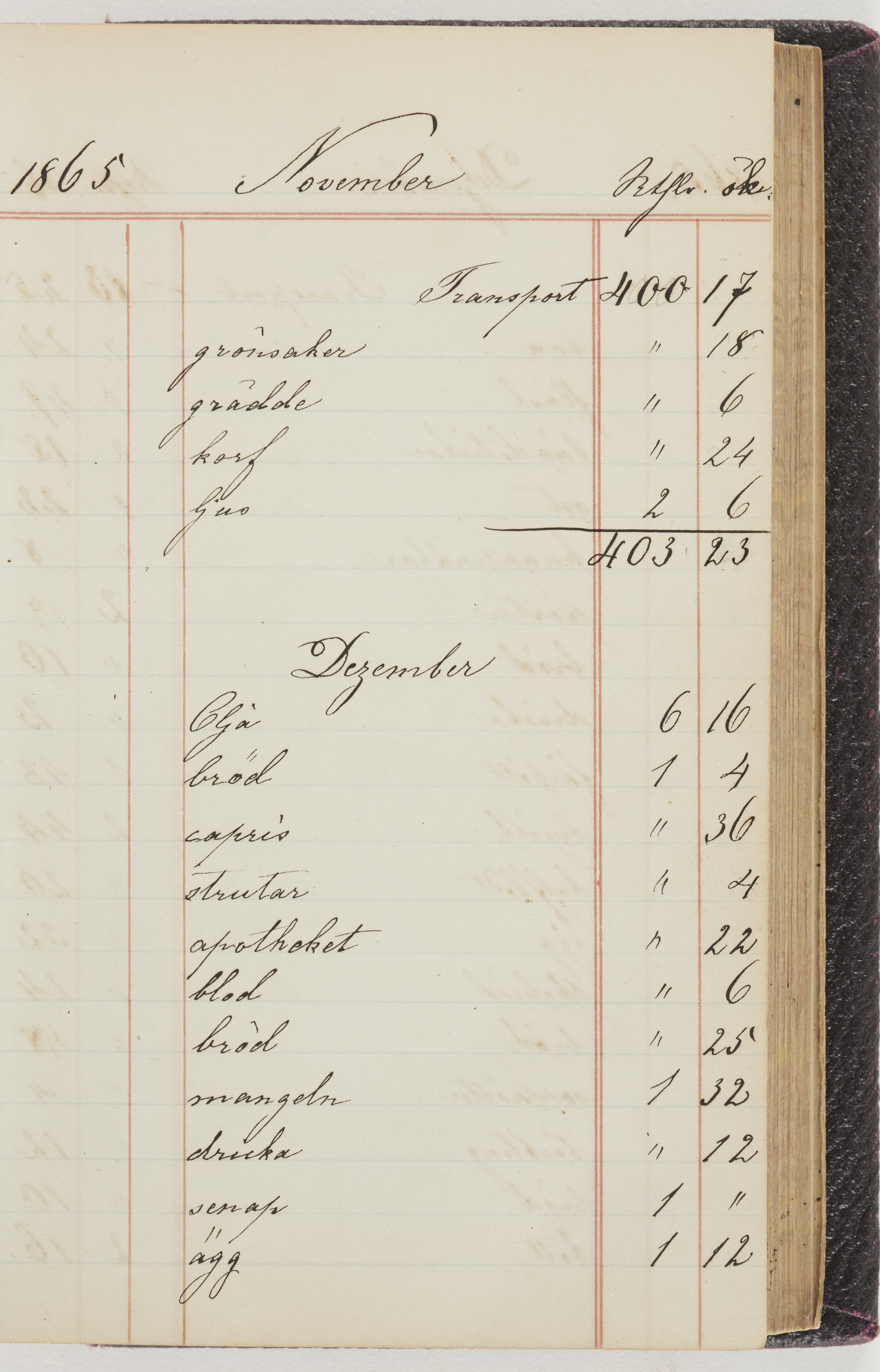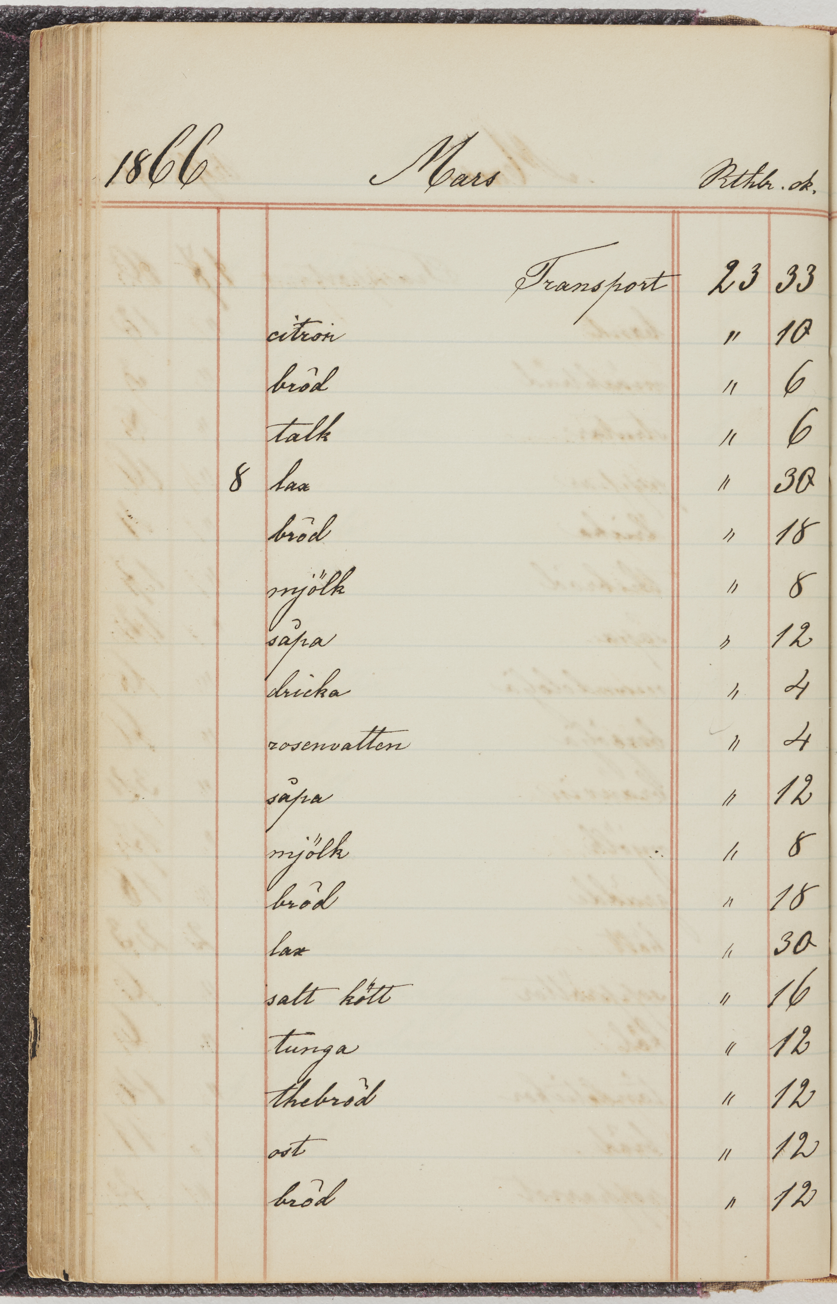 Hushållsbok. 10 vol. inb. 8:0. 1865-1872. 372 s. 1872. 134 s. 1886-1890. 582 s. 1891-1896. 572 s. 1897-1903. 610 s. 1904-1910. 606 s. 1911-1917. 612 s. 1918-1923. 586 s. 1924-1929. 608 s. 1930. 608 s. Skrivna av W. v. H. f. K. Vol. 4-8. Helt band av brunt (vol. 4 och 5) och svart (vol. 6-8) pressad klot. Linjeramar i blindtryck på pärmarna. Kapitel av gult skinn i vol. 4, av tyg i vol. 5-8. Marmorerad snitt. Försättsblad av blårutigt papper i vol. 4, av vitt papper i vol. 5, av brun olifant i vol. 6 och 7, av grå olifant i vol. 8. Vol. 9-13. Helt band av mörkblå klot, bundet med dubbel ansättning och knäpprygg. Kapitel av gult skinn. Marmorerad snitt. Försättsblad av belgisk marmor. i vol. 9, av ljusblått marmorellapapper i de övriga volymerna. Nedtill i vol. 10 och 13 Gust. Hedberges frimamärke i blått.