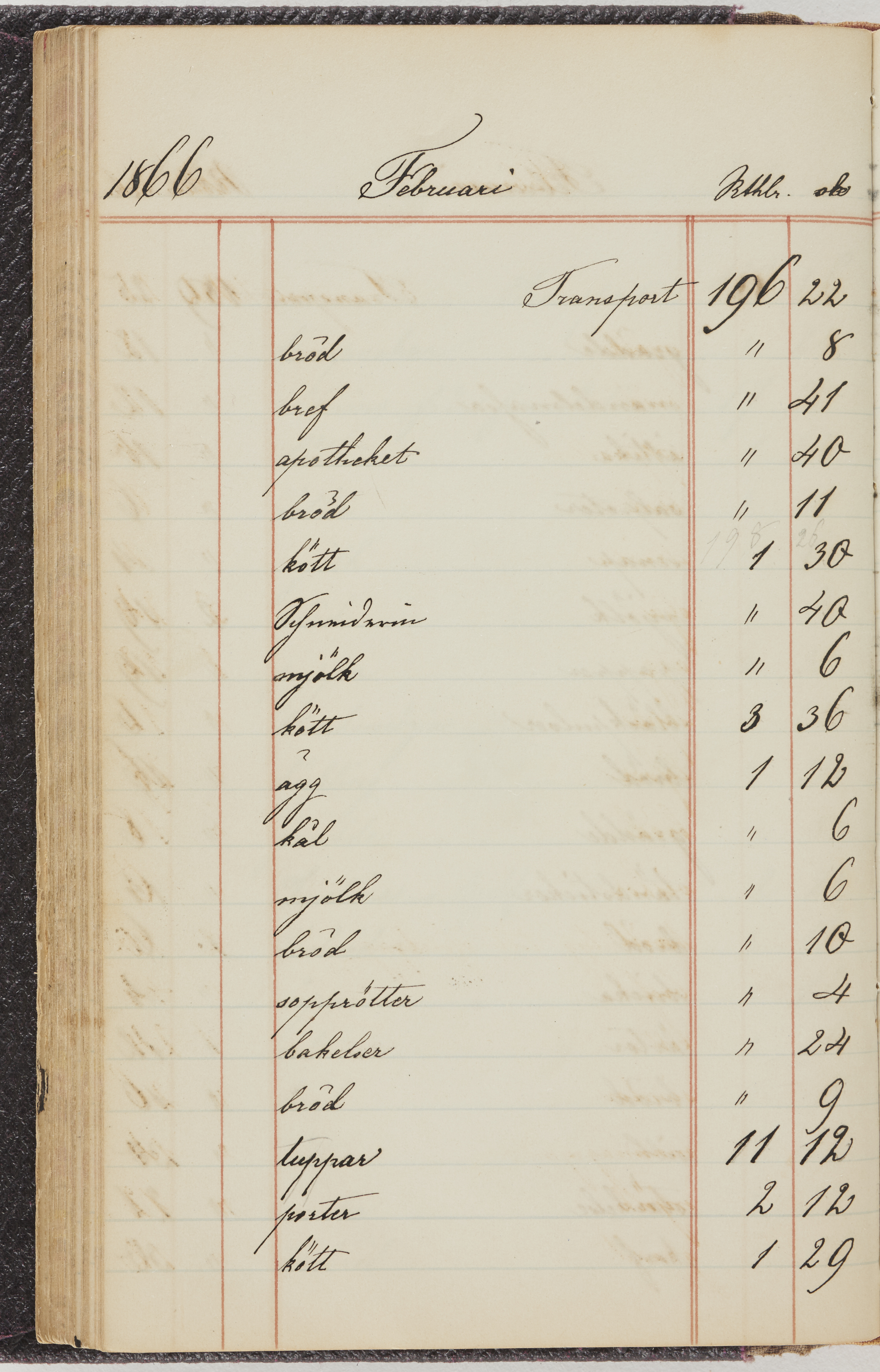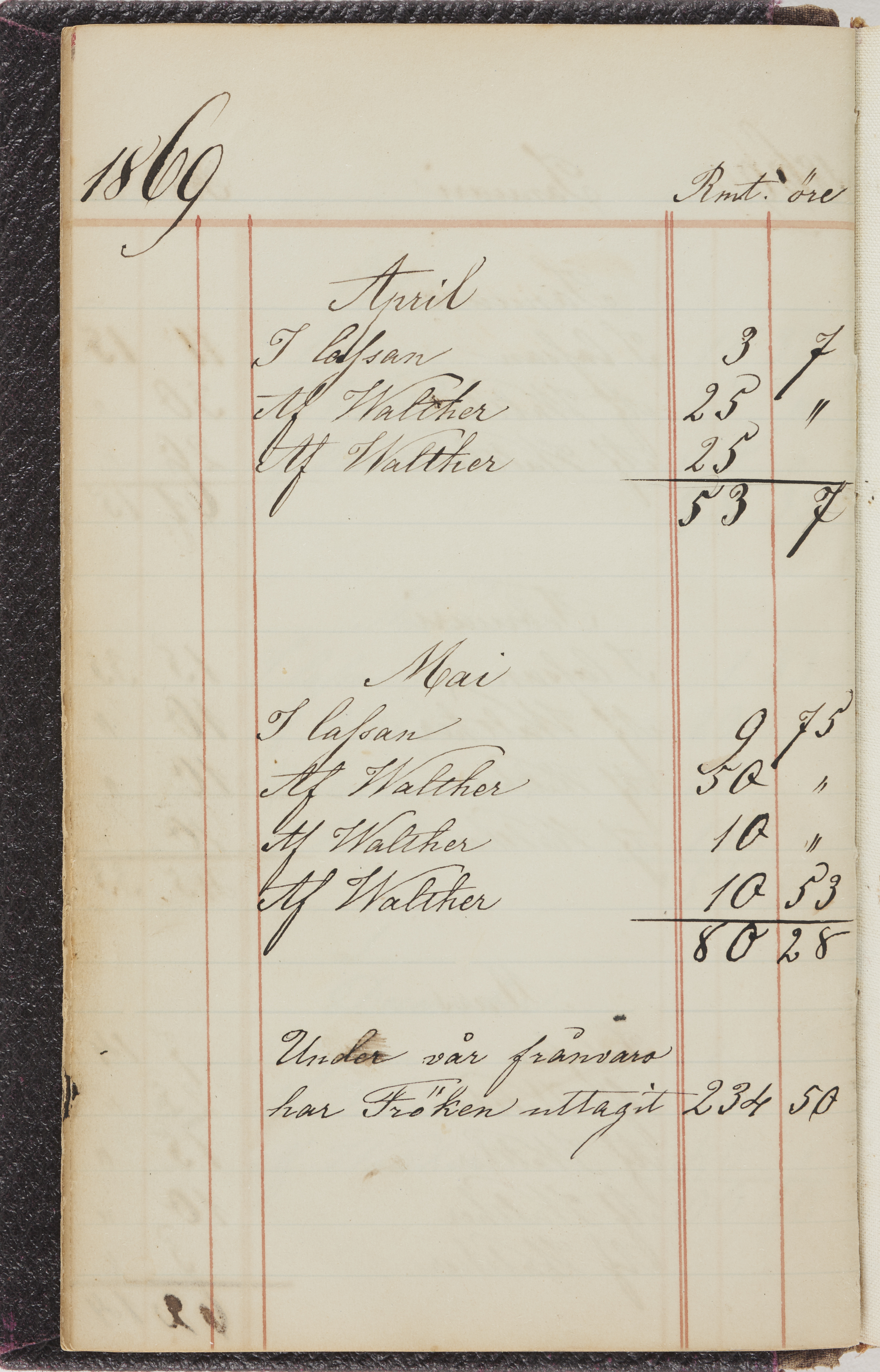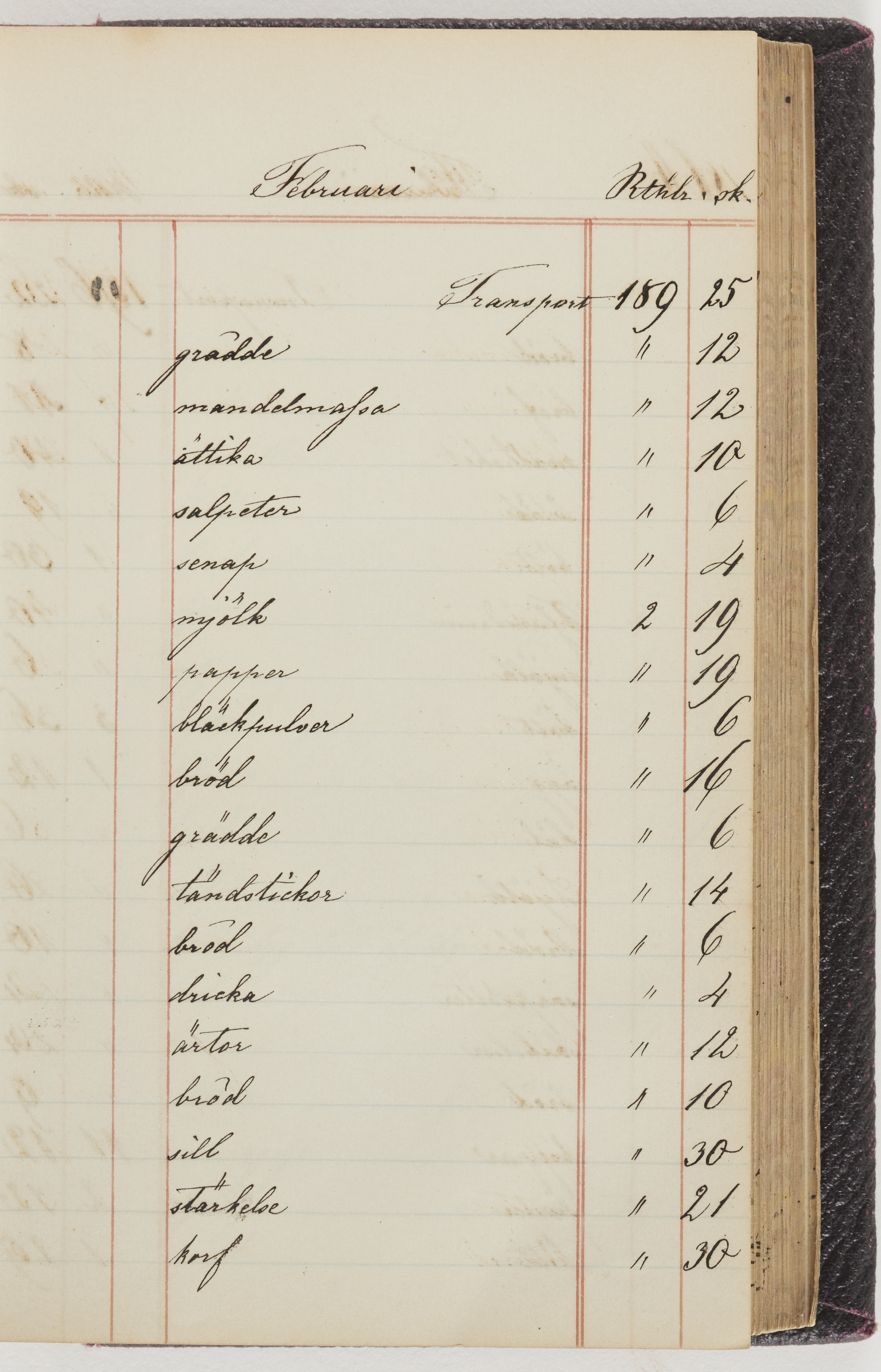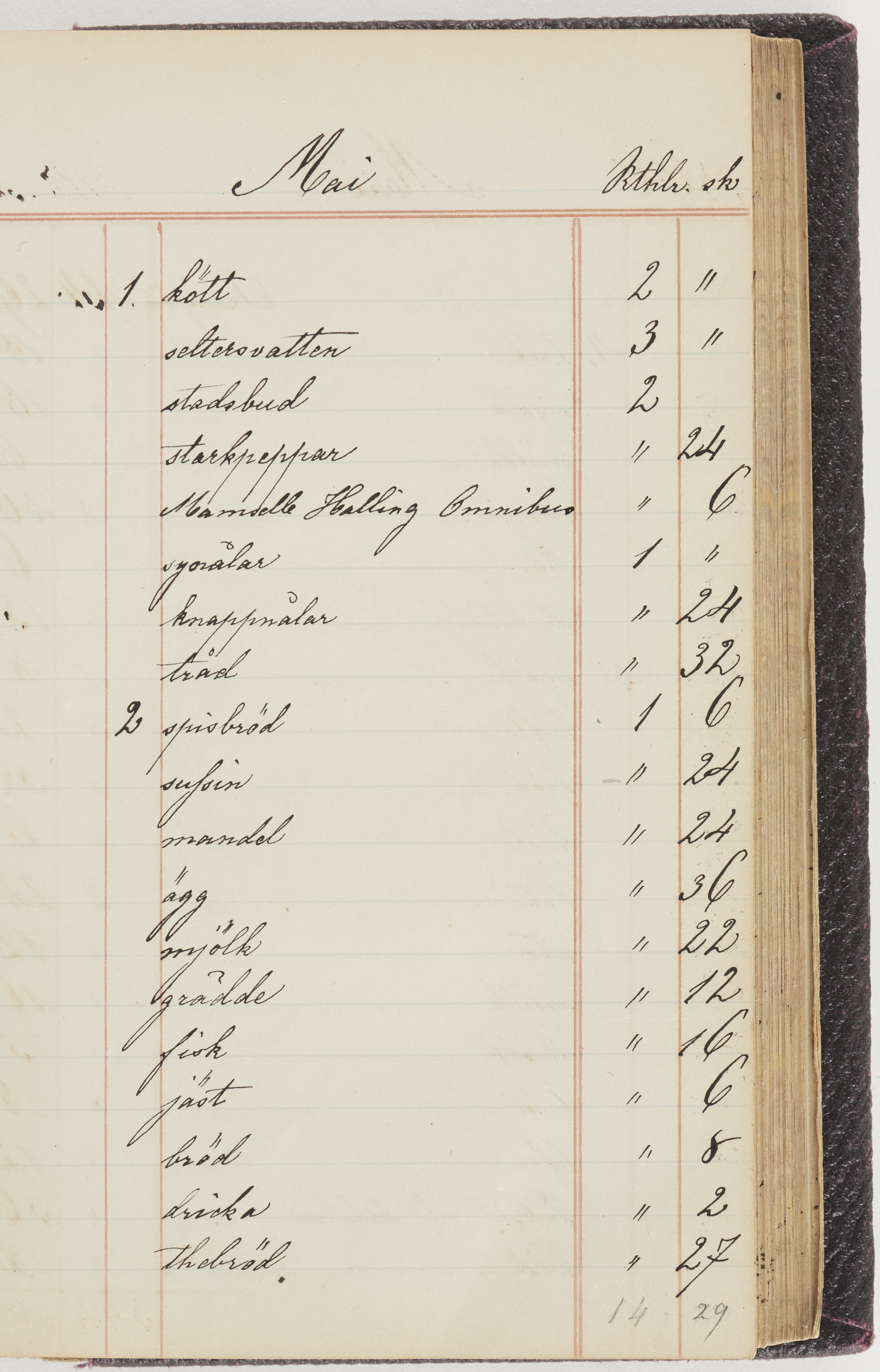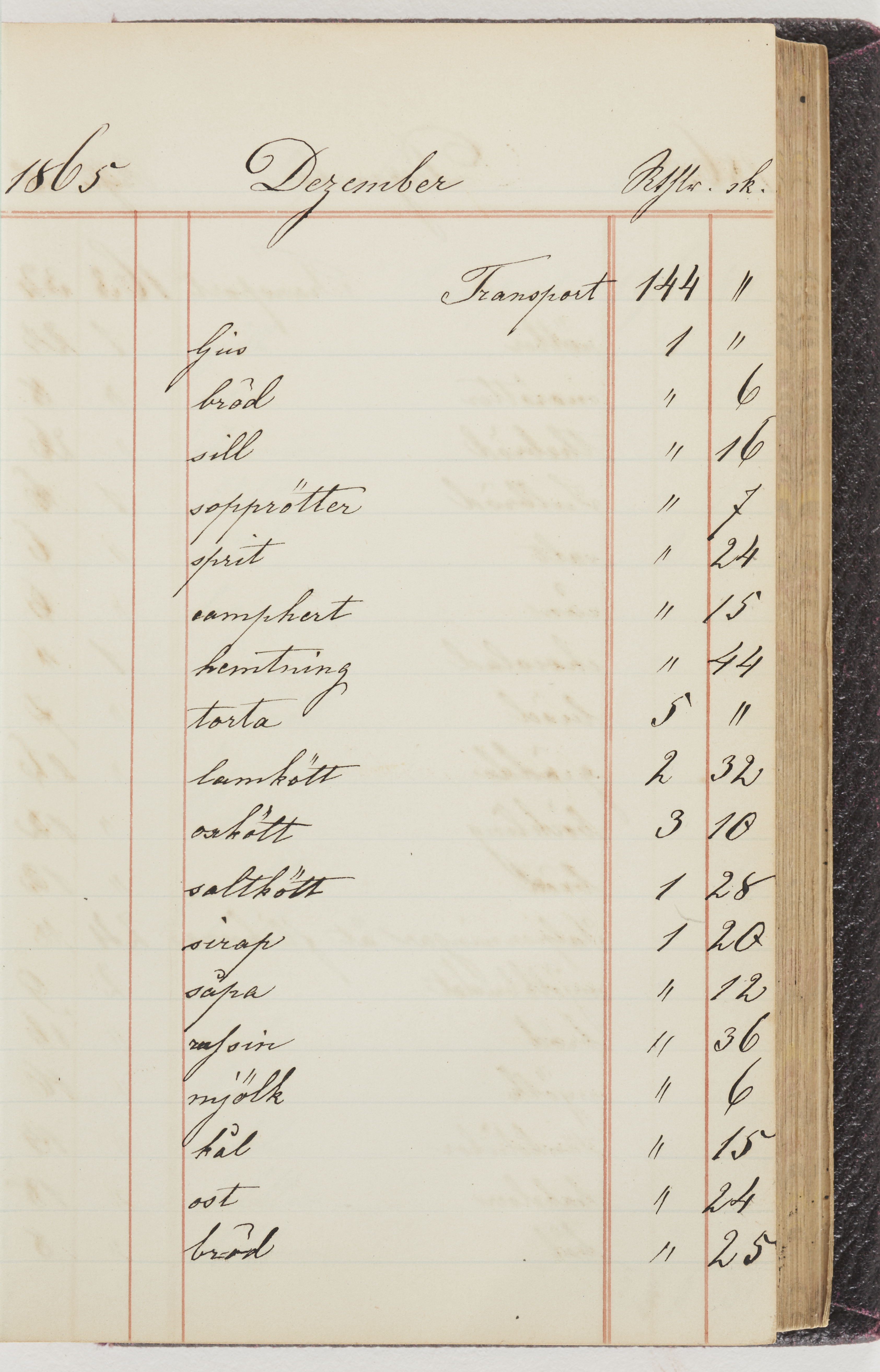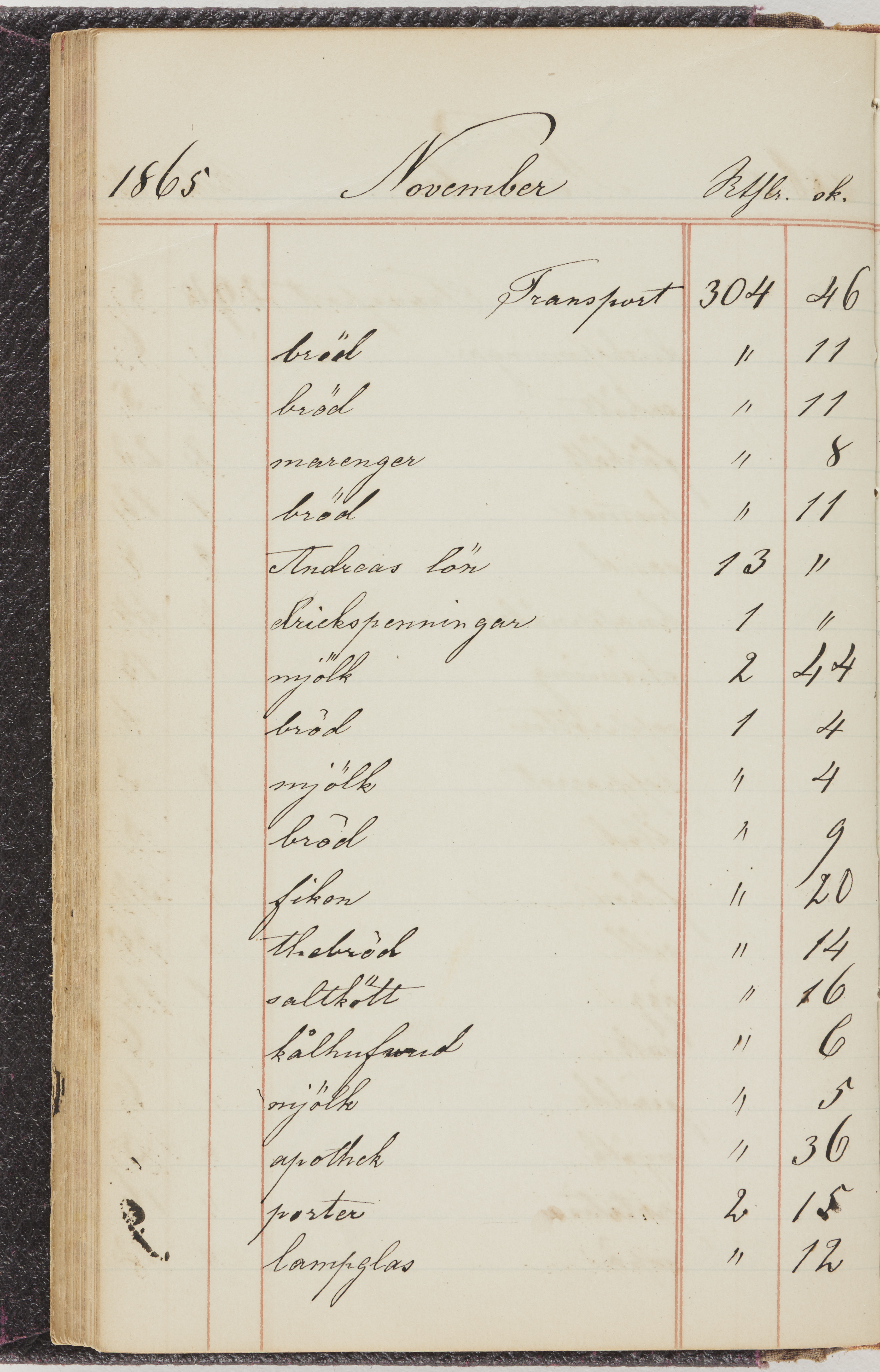 Hushållsbok. 10 vol. inb. 8:0. 1865-1872. 372 s. 1872. 134 s. 1886-1890. 582 s. 1891-1896. 572 s. 1897-1903. 610 s. 1904-1910. 606 s. 1911-1917. 612 s. 1918-1923. 586 s. 1924-1929. 608 s. 1930. 608 s. Skrivna av W. v. H. f. K. Vol. 4-8. Helt band av brunt (vol. 4 och 5) och svart (vol. 6-8) pressad klot. Linjeramar i blindtryck på pärmarna. Kapitel av gult skinn i vol. 4, av tyg i vol. 5-8. Marmorerad snitt. Försättsblad av blårutigt papper i vol. 4, av vitt papper i vol. 5, av brun olifant i vol. 6 och 7, av grå olifant i vol. 8. Vol. 9-13. Helt band av mörkblå klot, bundet med dubbel ansättning och knäpprygg. Kapitel av gult skinn. Marmorerad snitt. Försättsblad av belgisk marmor. i vol. 9, av ljusblått marmorellapapper i de övriga volymerna. Nedtill i vol. 10 och 13 Gust. Hedberges frimamärke i blått.