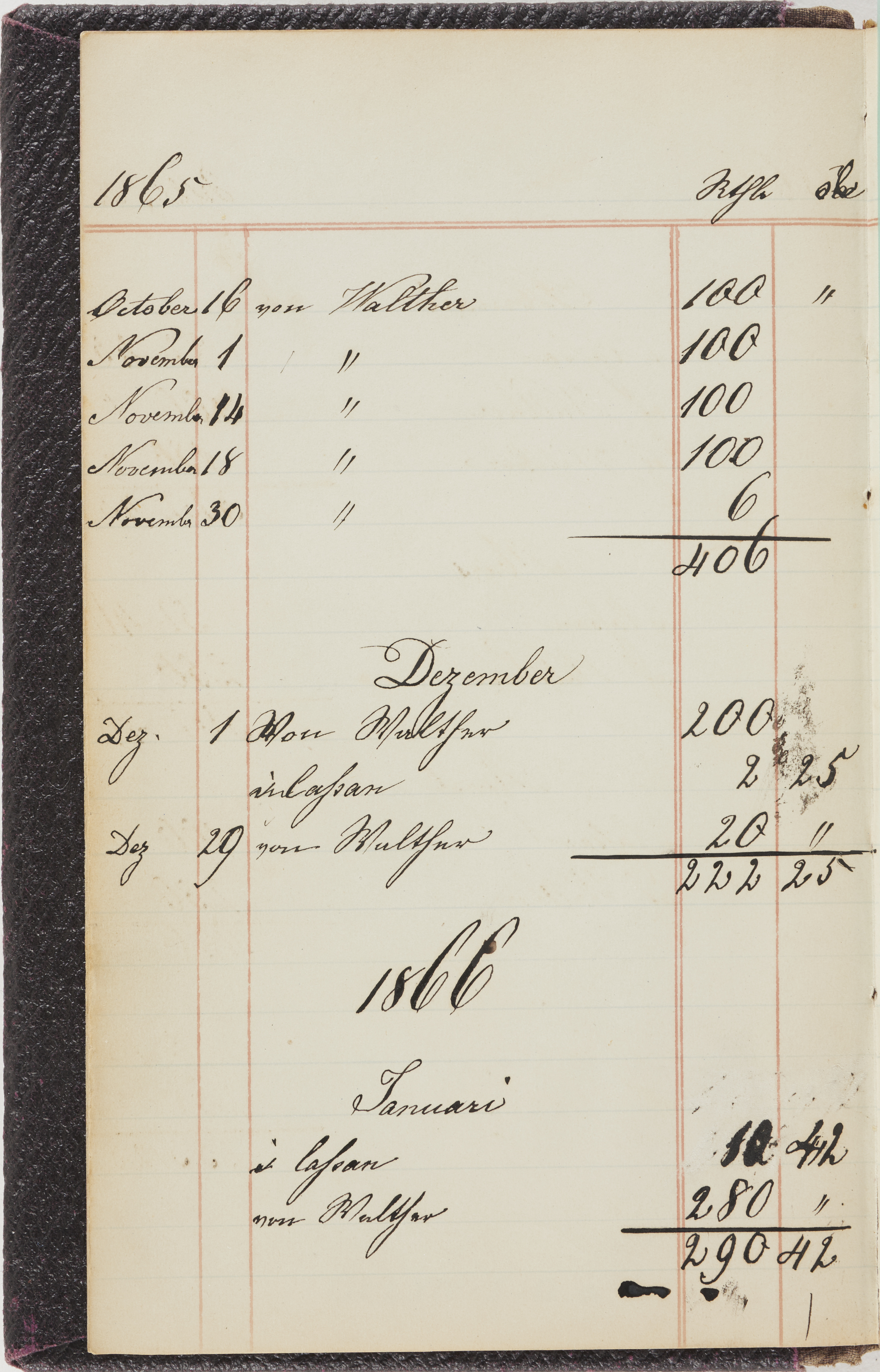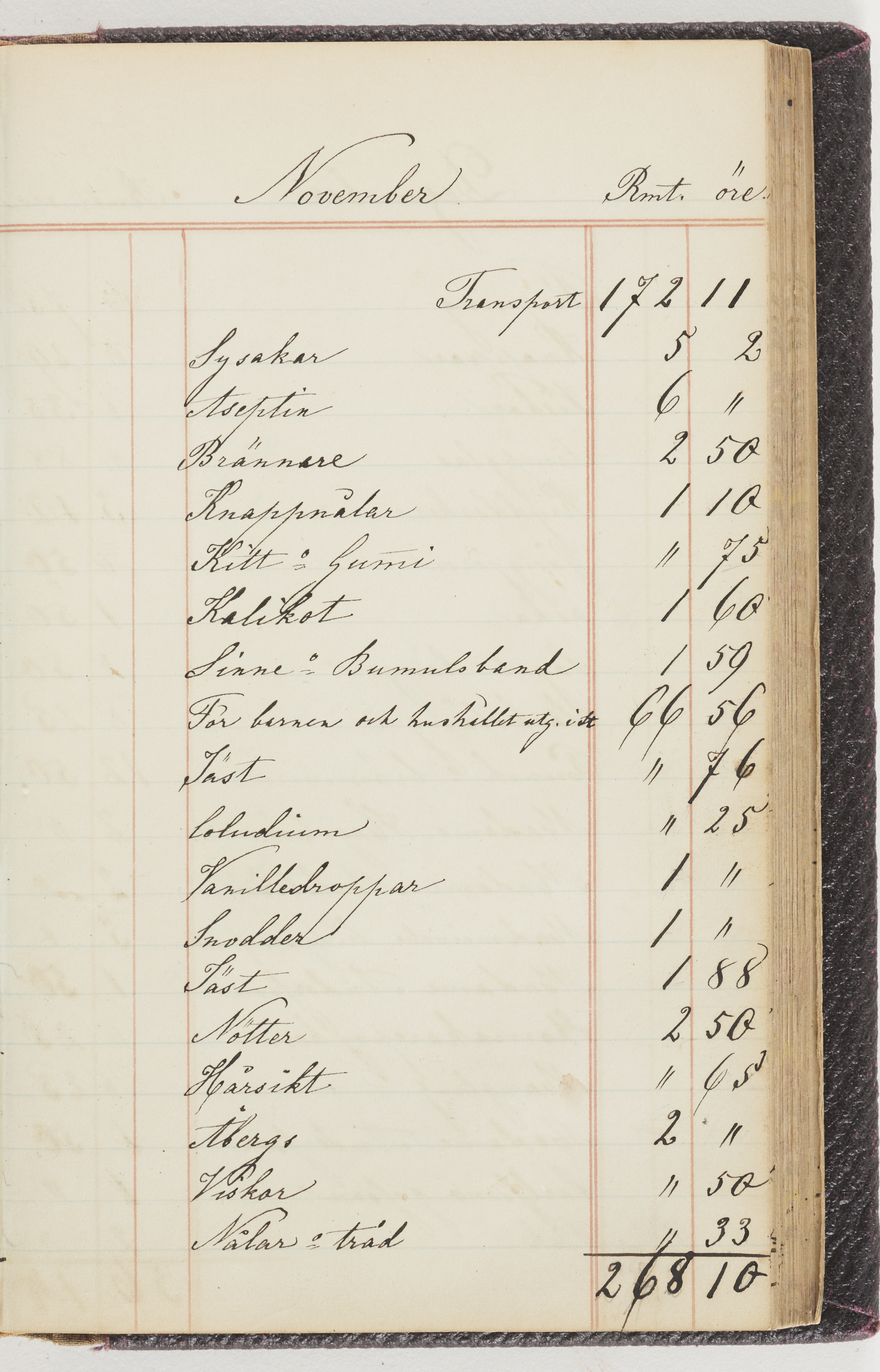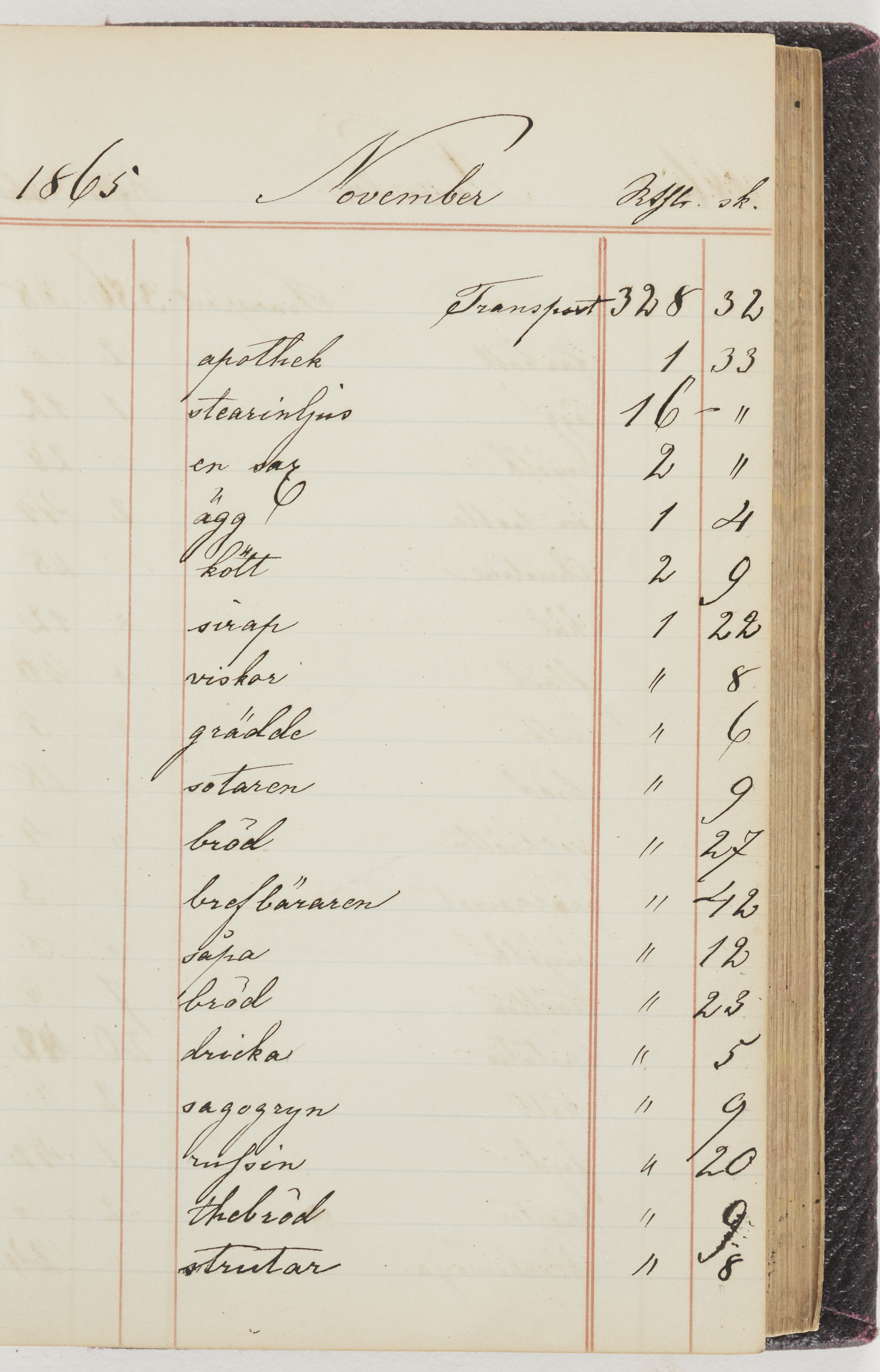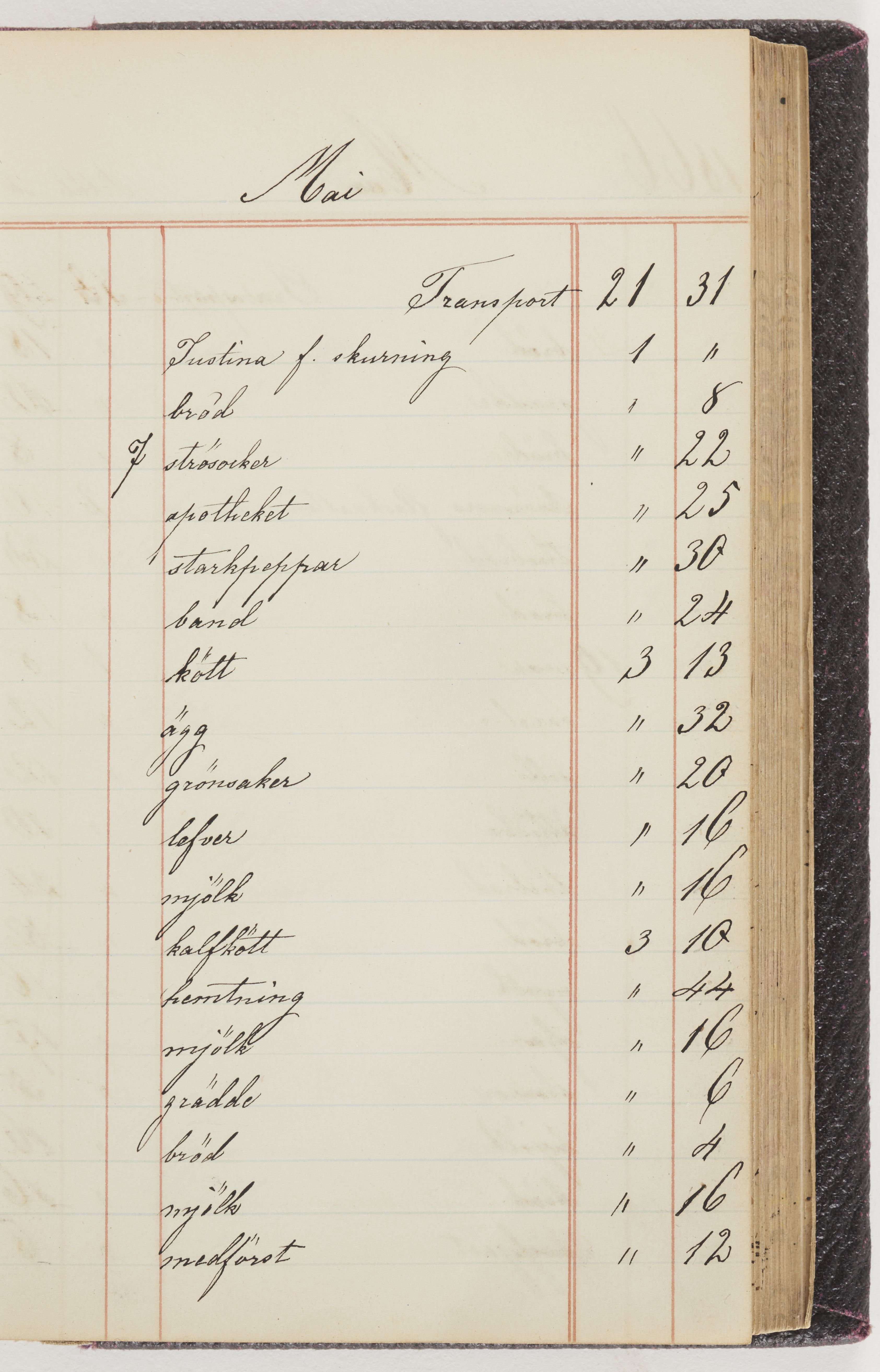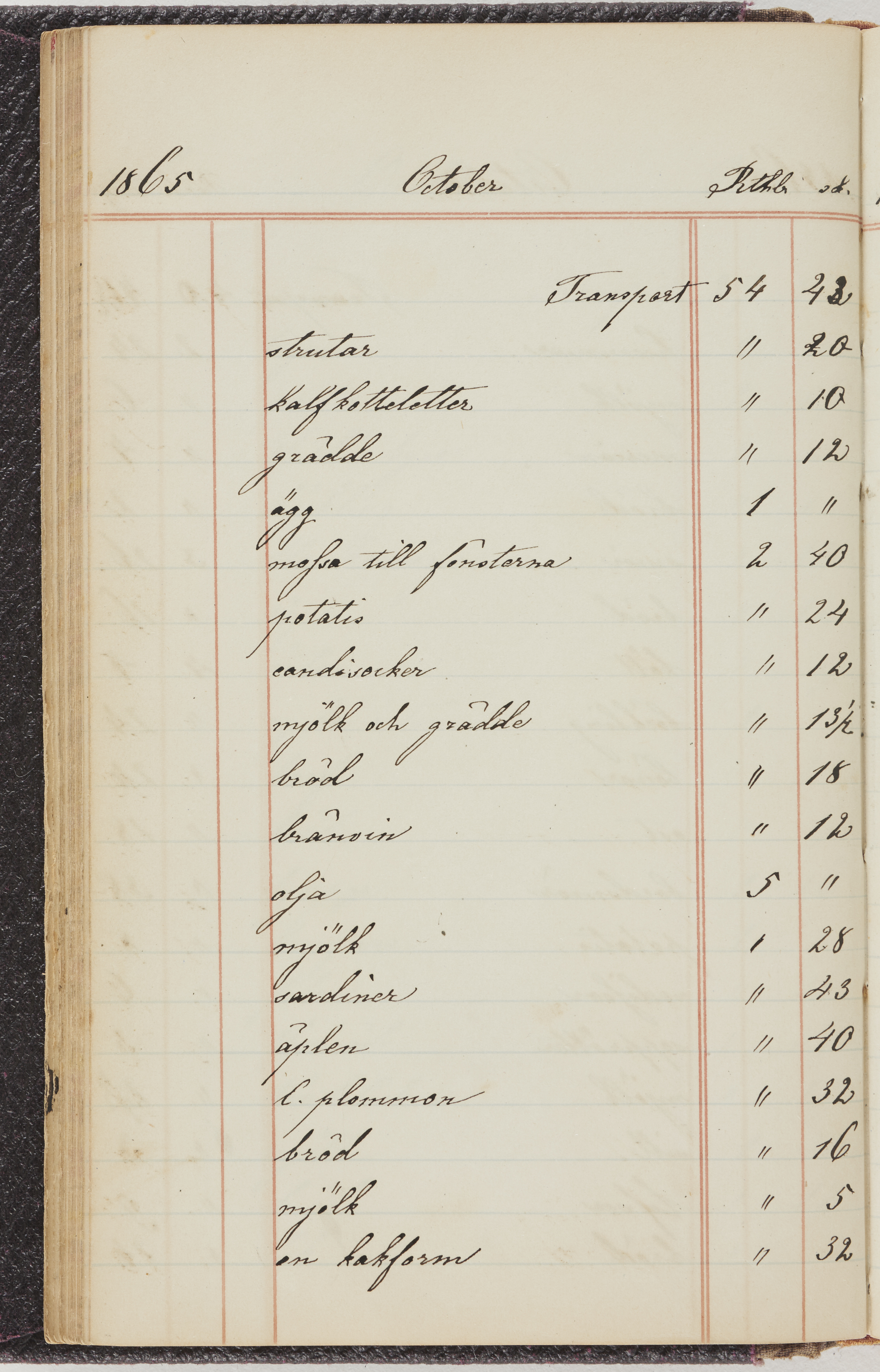 Hushållsbok. 10 vol. inb. 8:0. 1865-1872. 372 s. 1872. 134 s. 1886-1890. 582 s. 1891-1896. 572 s. 1897-1903. 610 s. 1904-1910. 606 s. 1911-1917. 612 s. 1918-1923. 586 s. 1924-1929. 608 s. 1930. 608 s. Skrivna av W. v. H. f. K. Vol. 4-8. Helt band av brunt (vol. 4 och 5) och svart (vol. 6-8) pressad klot. Linjeramar i blindtryck på pärmarna. Kapitel av gult skinn i vol. 4, av tyg i vol. 5-8. Marmorerad snitt. Försättsblad av blårutigt papper i vol. 4, av vitt papper i vol. 5, av brun olifant i vol. 6 och 7, av grå olifant i vol. 8. Vol. 9-13. Helt band av mörkblå klot, bundet med dubbel ansättning och knäpprygg. Kapitel av gult skinn. Marmorerad snitt. Försättsblad av belgisk marmor. i vol. 9, av ljusblått marmorellapapper i de övriga volymerna. Nedtill i vol. 10 och 13 Gust. Hedberges frimamärke i blått.
