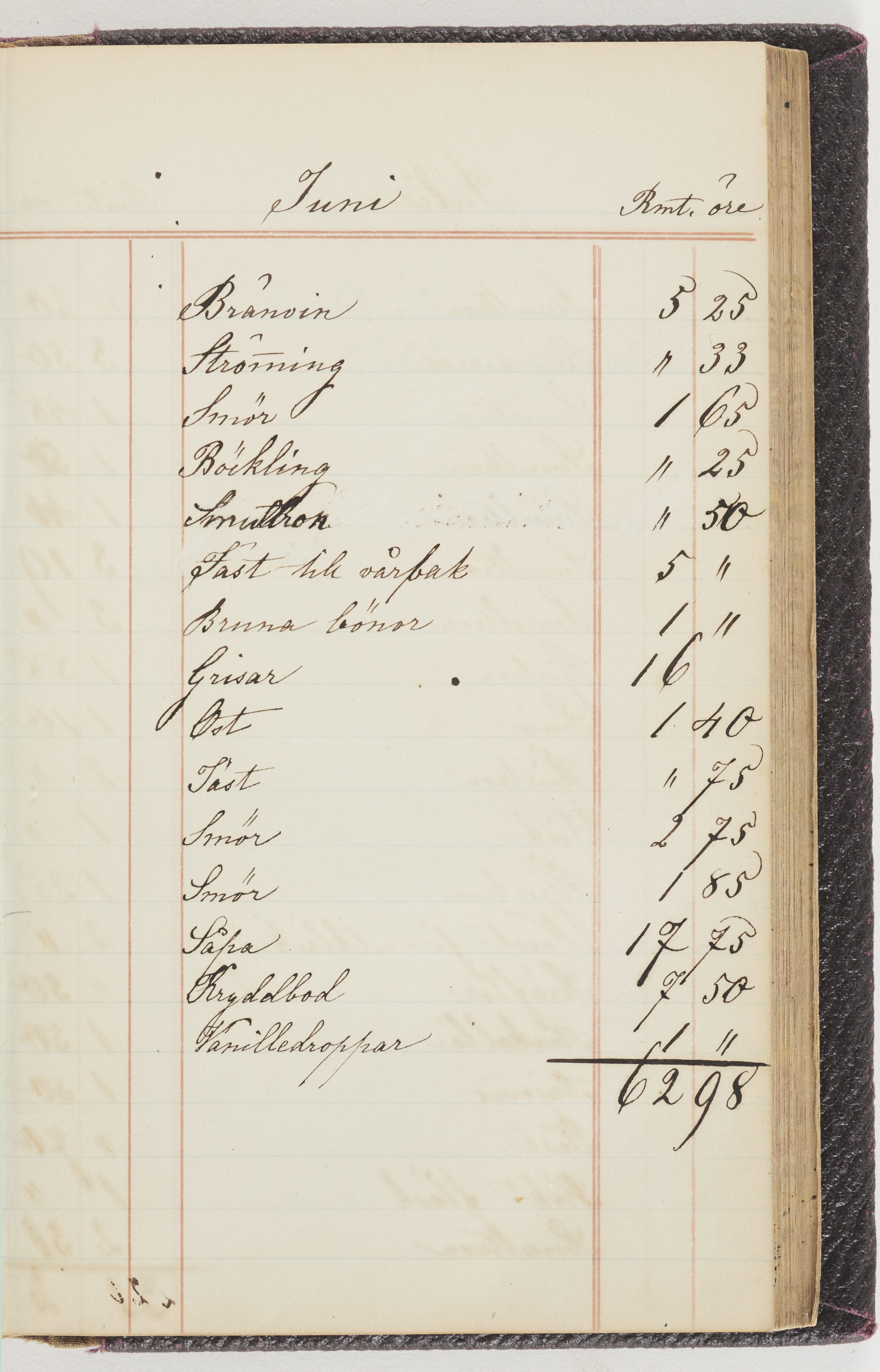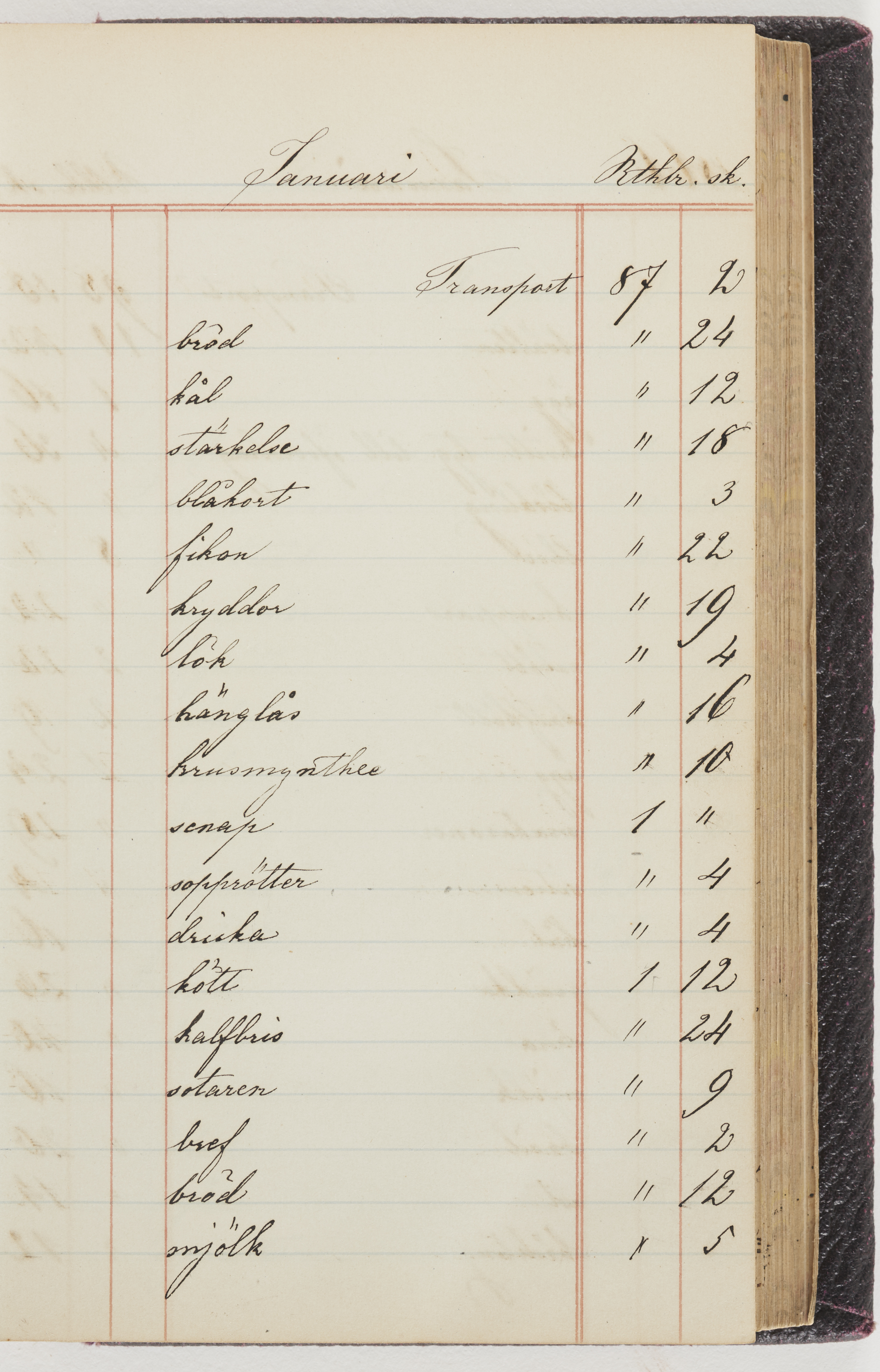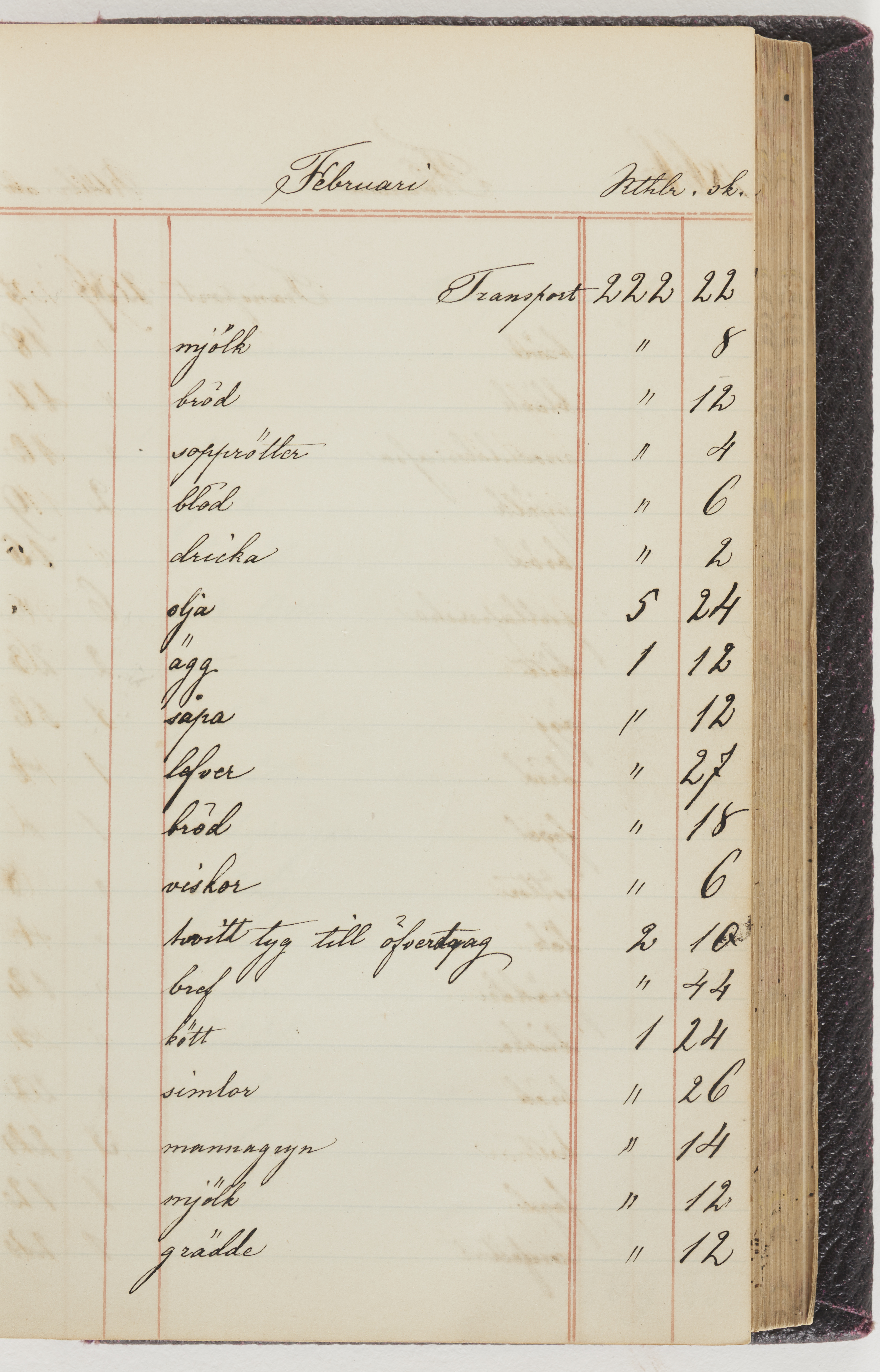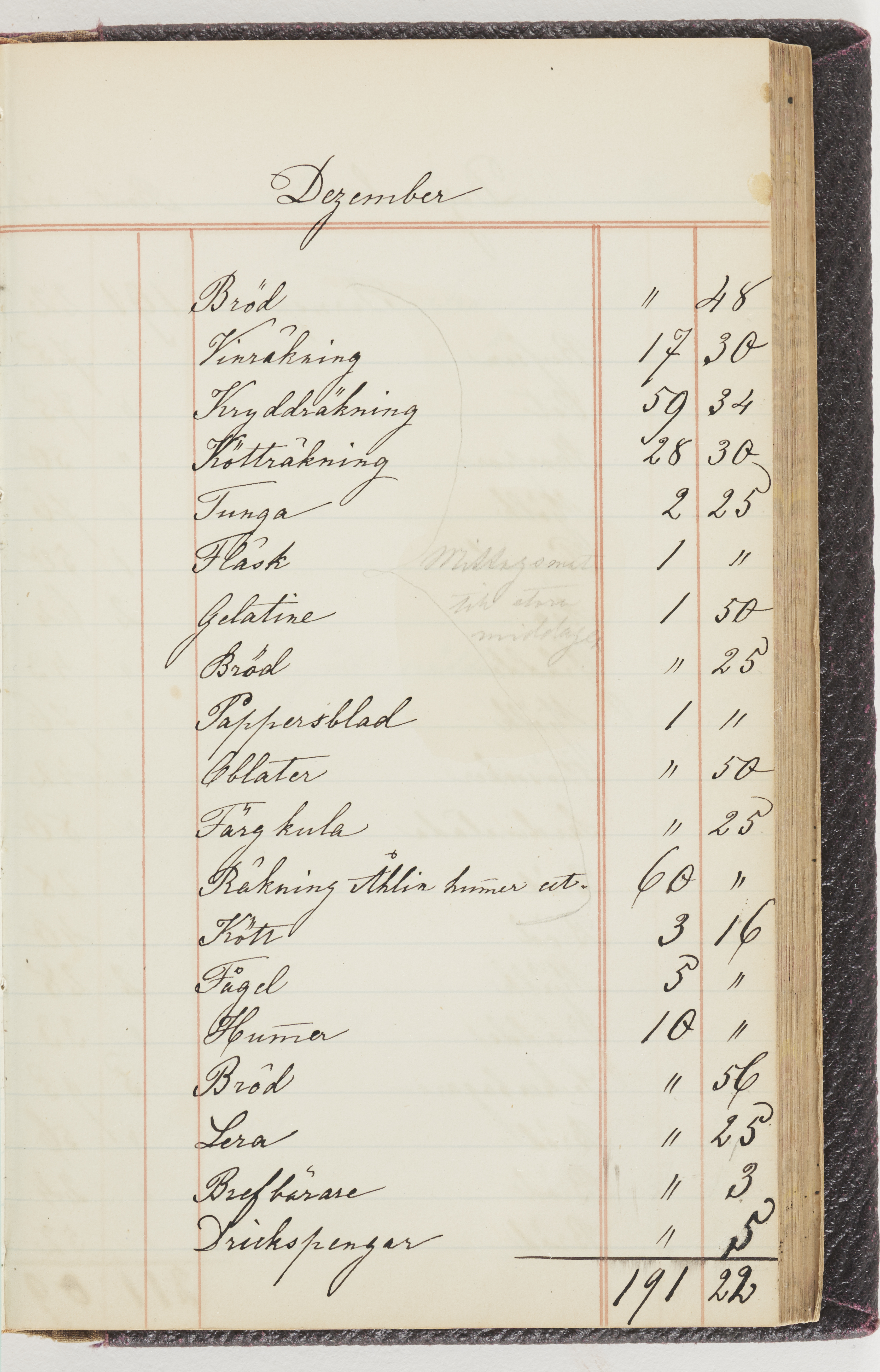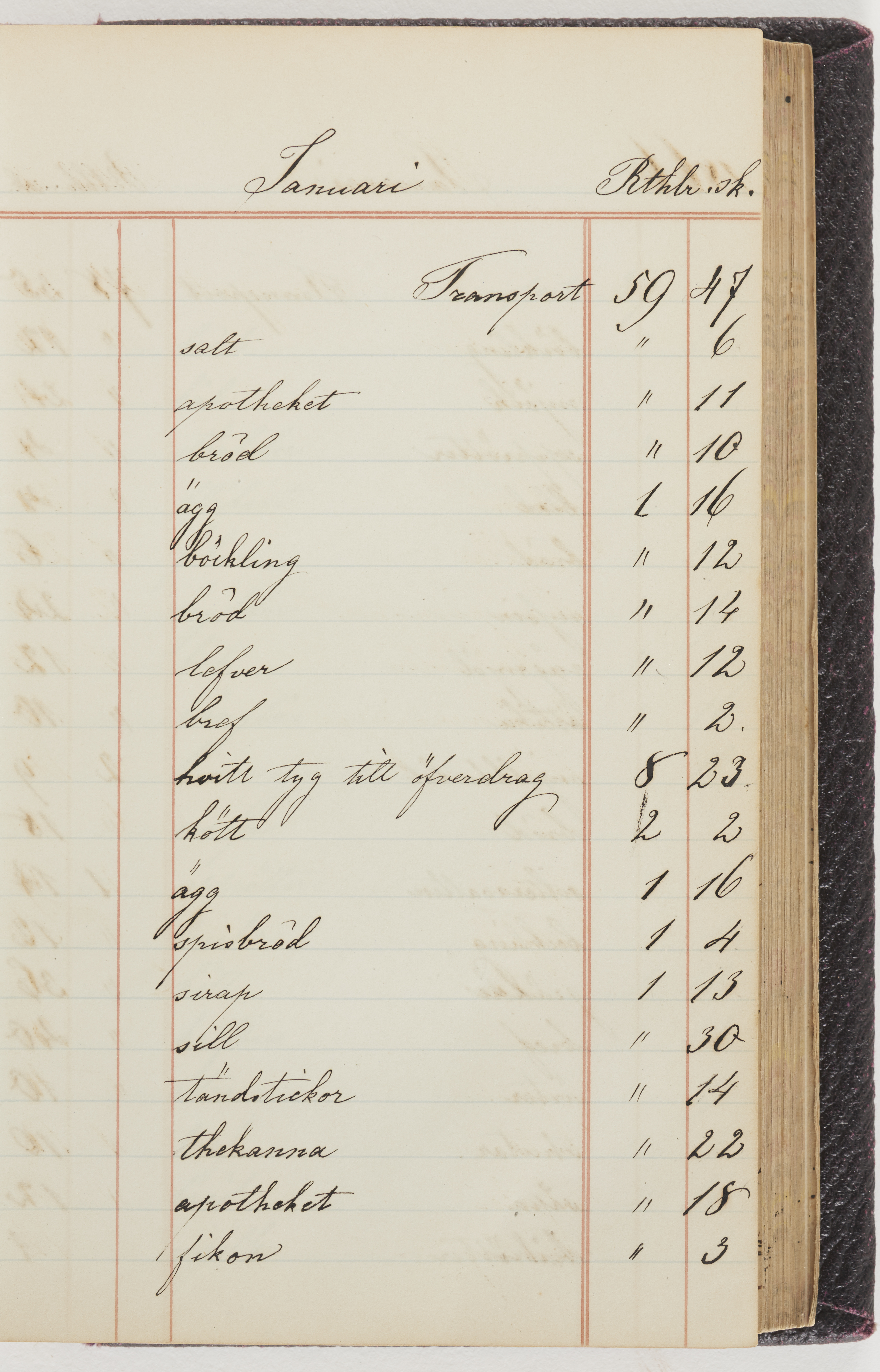 Hushållsbok. 10 vol. inb. 8:0. 1865-1872. 372 s. 1872. 134 s. 1886-1890. 582 s. 1891-1896. 572 s. 1897-1903. 610 s. 1904-1910. 606 s. 1911-1917. 612 s. 1918-1923. 586 s. 1924-1929. 608 s. 1930. 608 s. Skrivna av W. v. H. f. K. Vol. 4-8. Helt band av brunt (vol. 4 och 5) och svart (vol. 6-8) pressad klot. Linjeramar i blindtryck på pärmarna. Kapitel av gult skinn i vol. 4, av tyg i vol. 5-8. Marmorerad snitt. Försättsblad av blårutigt papper i vol. 4, av vitt papper i vol. 5, av brun olifant i vol. 6 och 7, av grå olifant i vol. 8. Vol. 9-13. Helt band av mörkblå klot, bundet med dubbel ansättning och knäpprygg. Kapitel av gult skinn. Marmorerad snitt. Försättsblad av belgisk marmor. i vol. 9, av ljusblått marmorellapapper i de övriga volymerna. Nedtill i vol. 10 och 13 Gust. Hedberges frimamärke i blått.