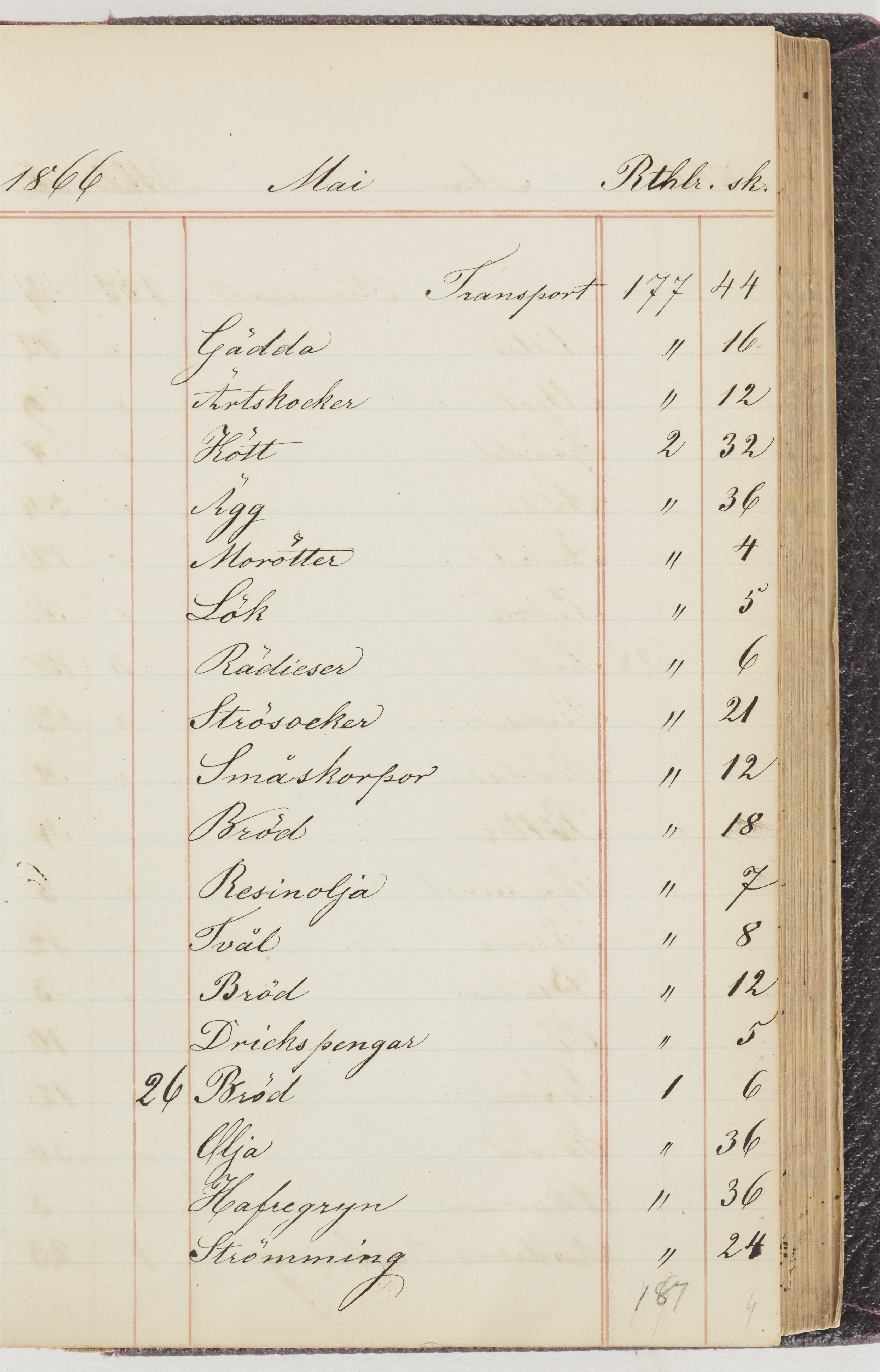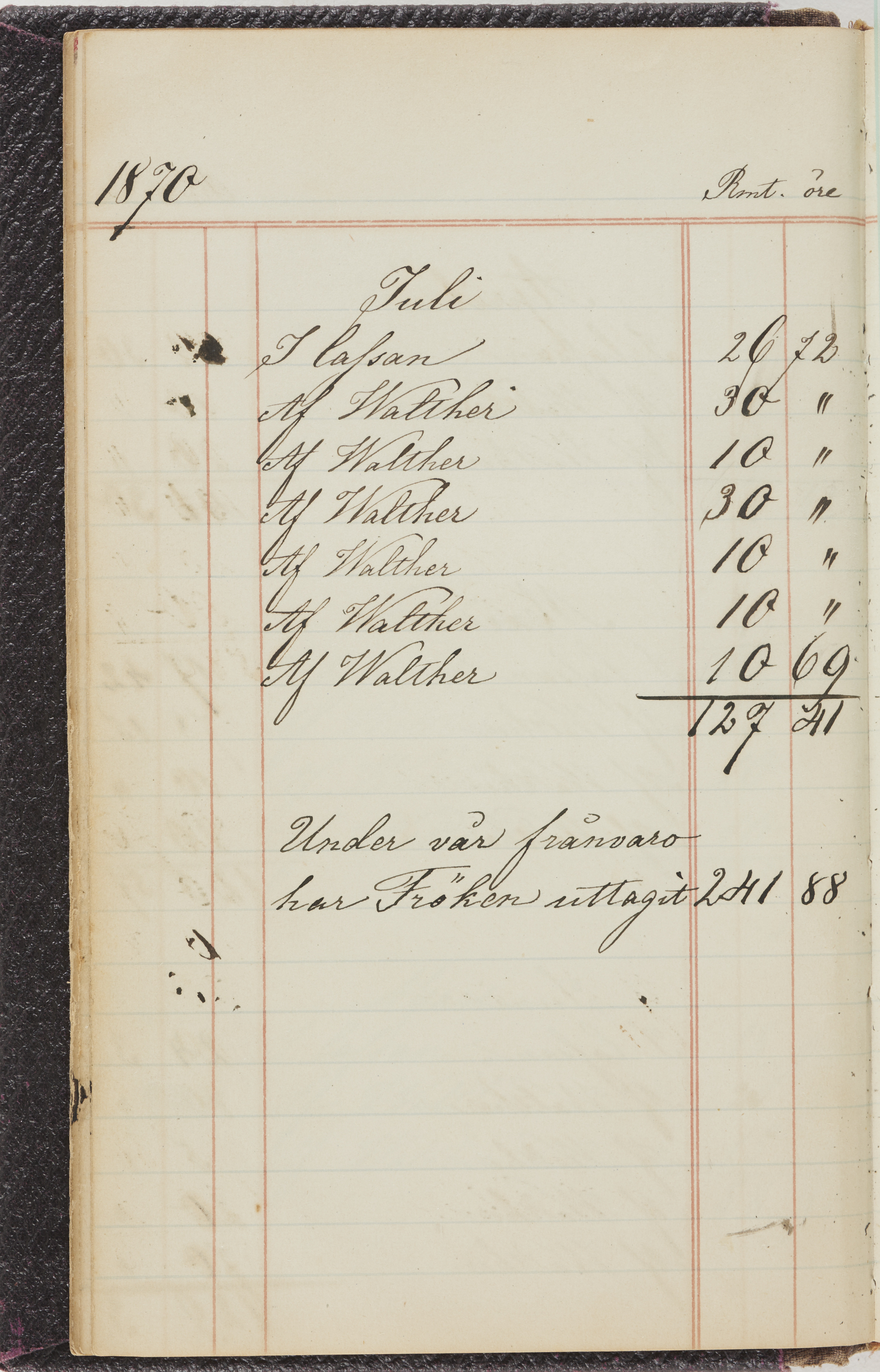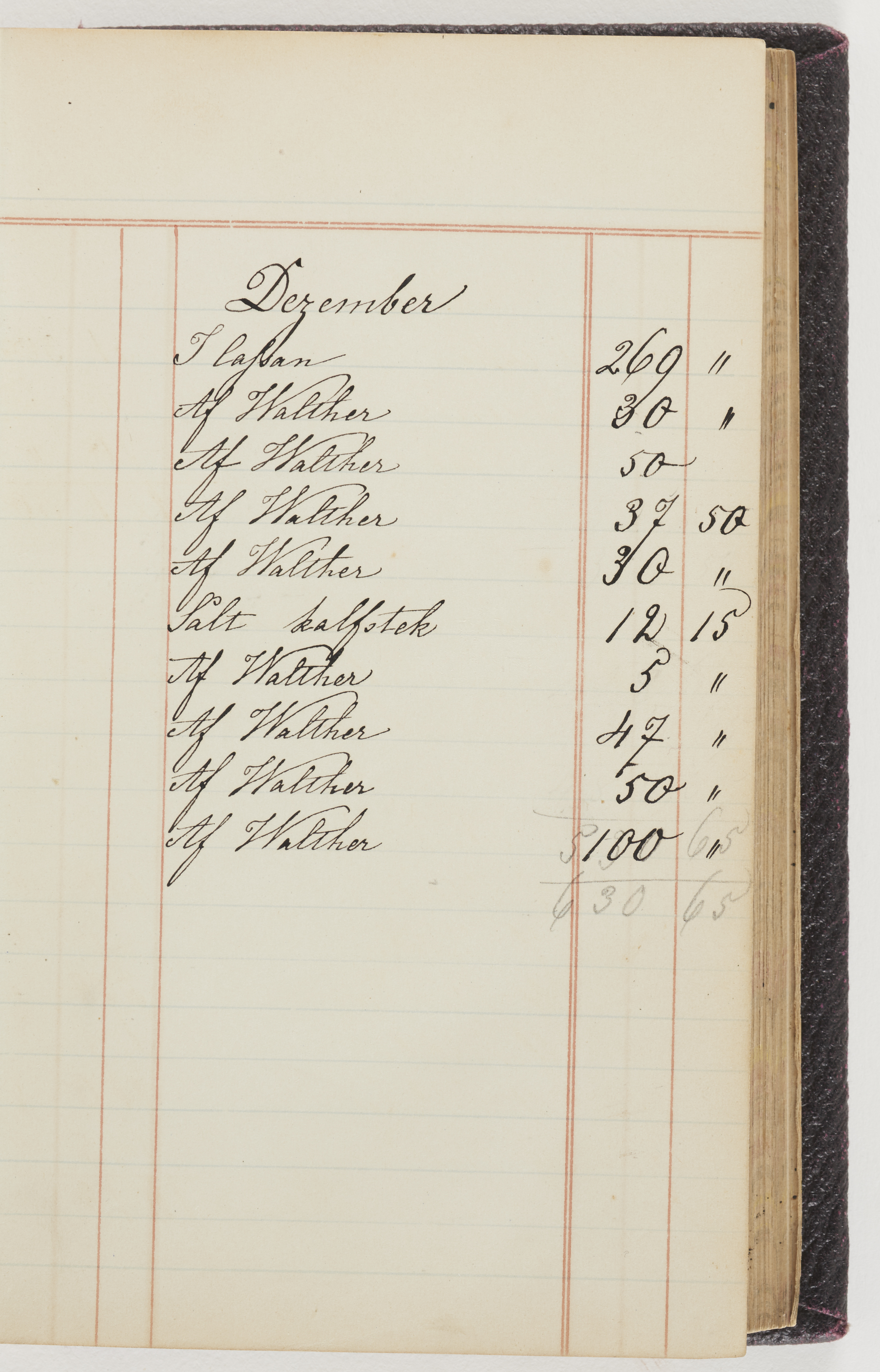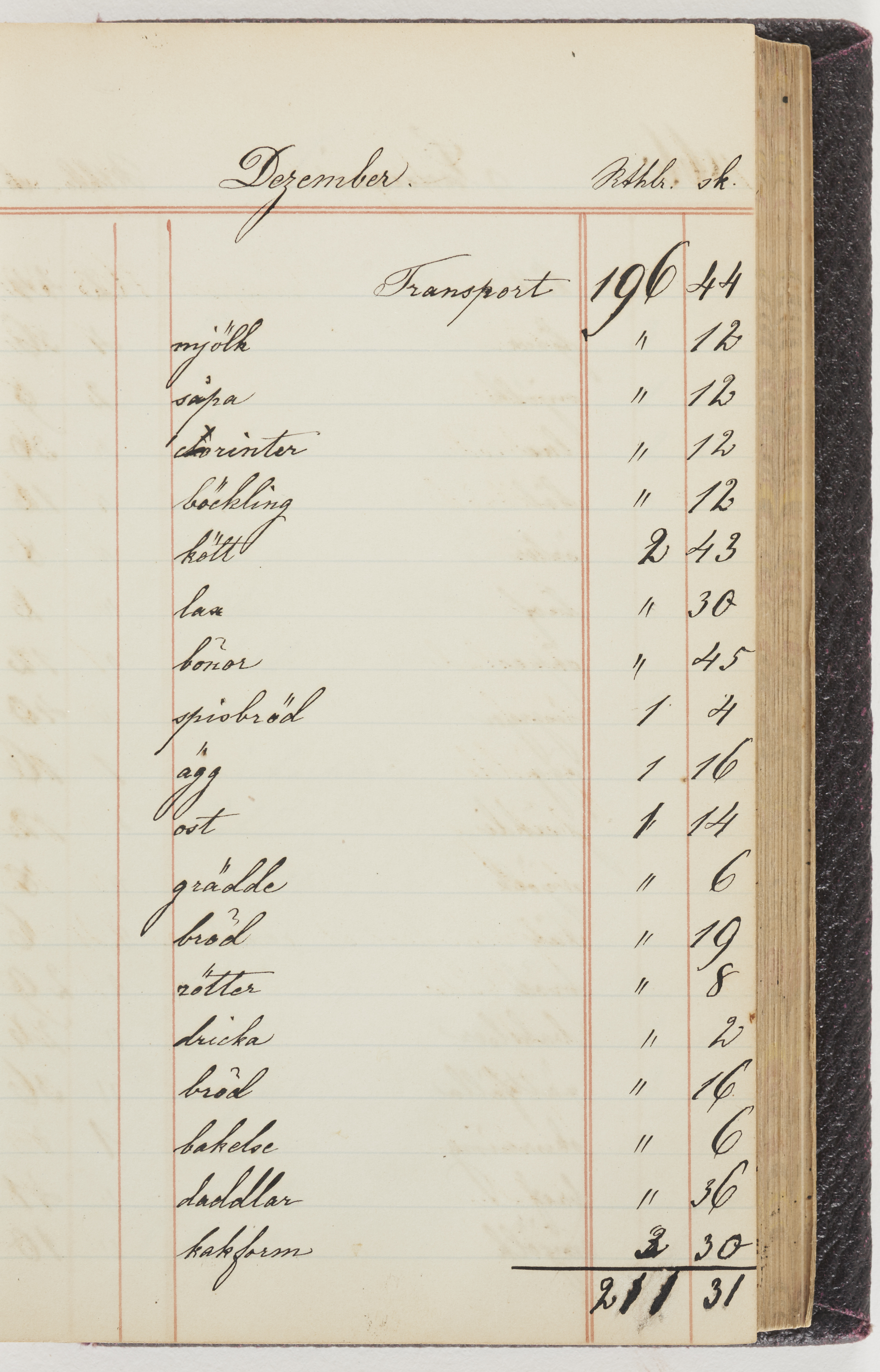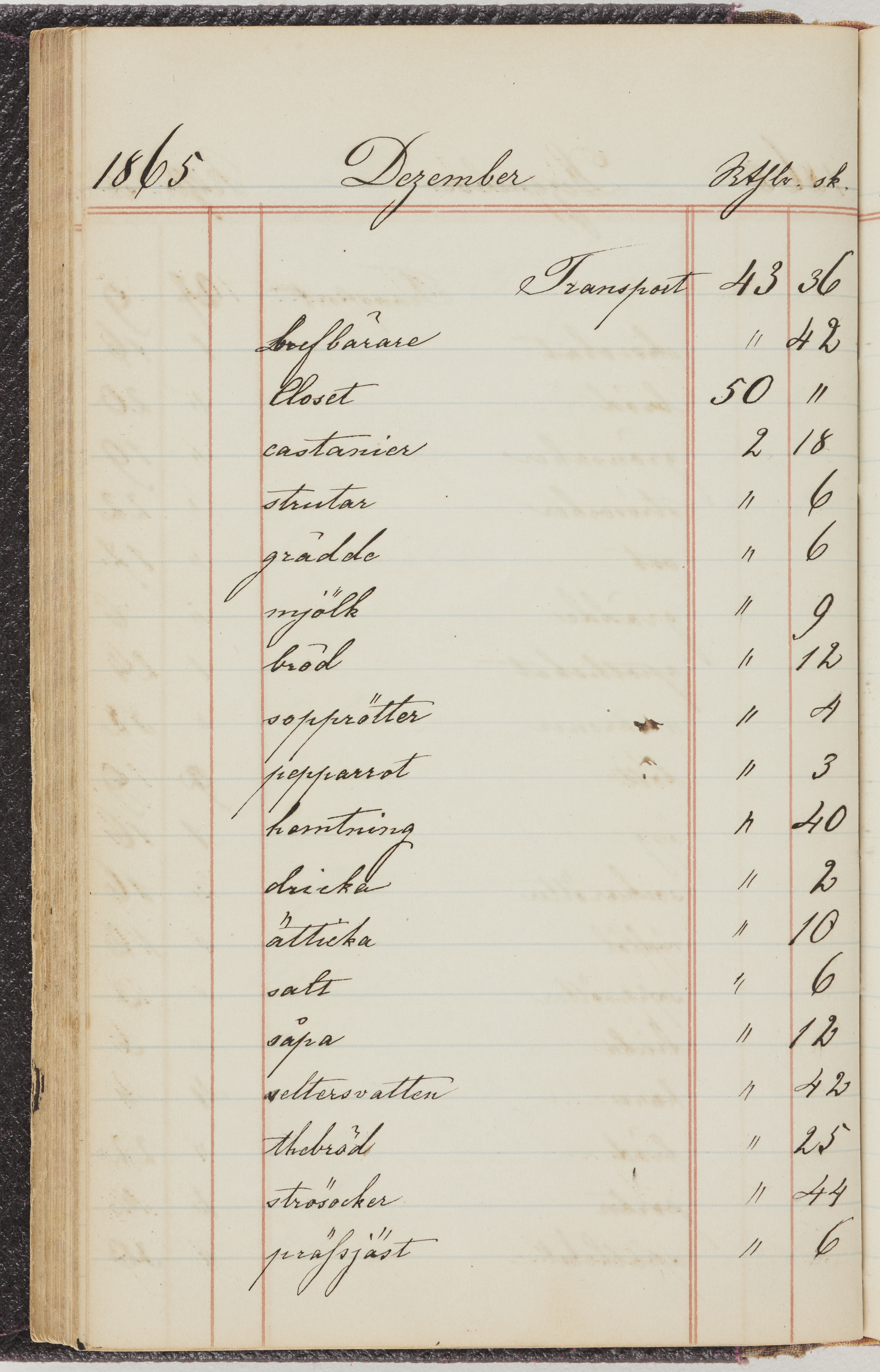 Hushållsbok. 10 vol. inb. 8:0. 1865-1872. 372 s. 1872. 134 s. 1886-1890. 582 s. 1891-1896. 572 s. 1897-1903. 610 s. 1904-1910. 606 s. 1911-1917. 612 s. 1918-1923. 586 s. 1924-1929. 608 s. 1930. 608 s. Skrivna av W. v. H. f. K. Vol. 4-8. Helt band av brunt (vol. 4 och 5) och svart (vol. 6-8) pressad klot. Linjeramar i blindtryck på pärmarna. Kapitel av gult skinn i vol. 4, av tyg i vol. 5-8. Marmorerad snitt. Försättsblad av blårutigt papper i vol. 4, av vitt papper i vol. 5, av brun olifant i vol. 6 och 7, av grå olifant i vol. 8. Vol. 9-13. Helt band av mörkblå klot, bundet med dubbel ansättning och knäpprygg. Kapitel av gult skinn. Marmorerad snitt. Försättsblad av belgisk marmor. i vol. 9, av ljusblått marmorellapapper i de övriga volymerna. Nedtill i vol. 10 och 13 Gust. Hedberges frimamärke i blått.