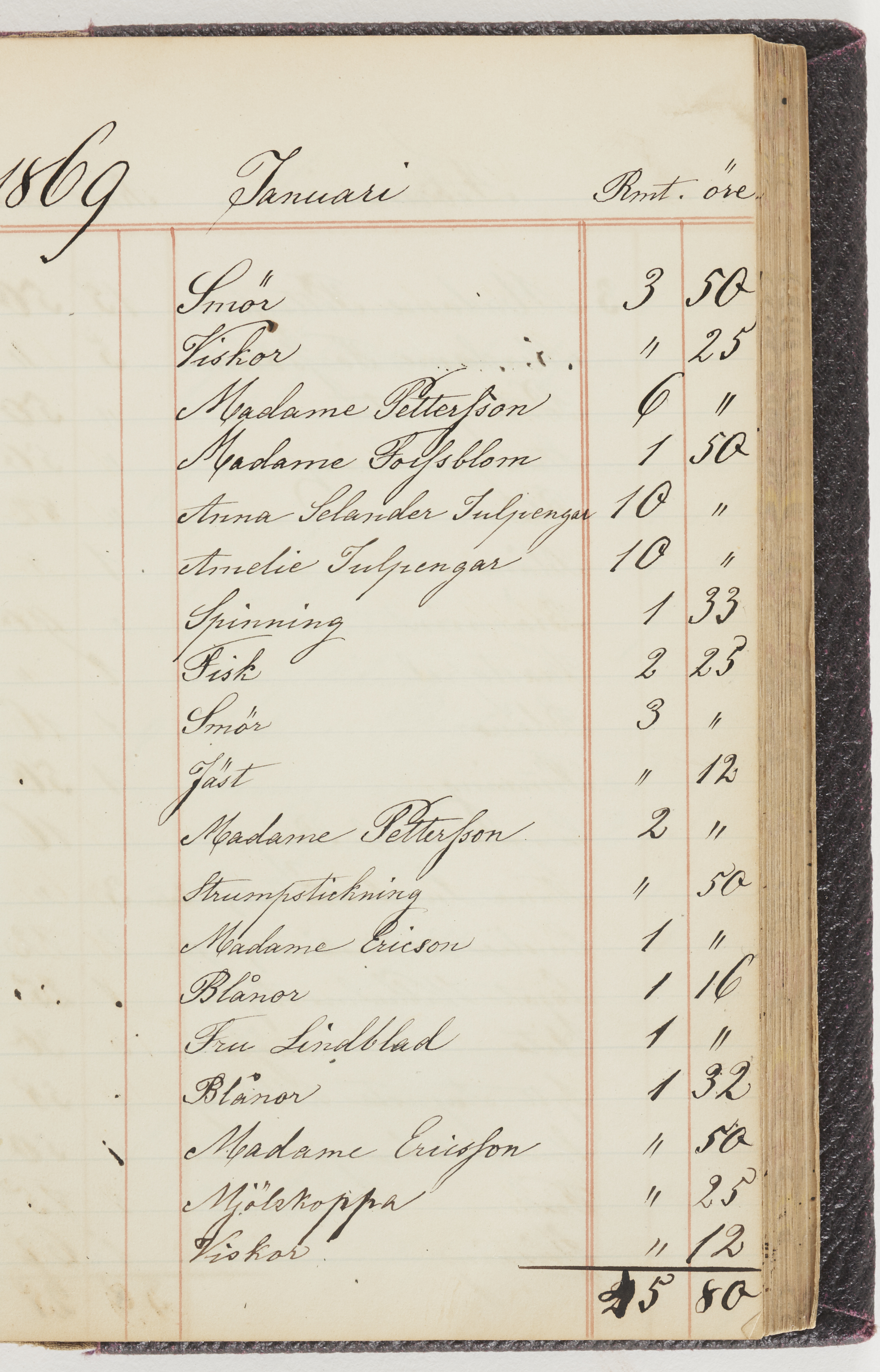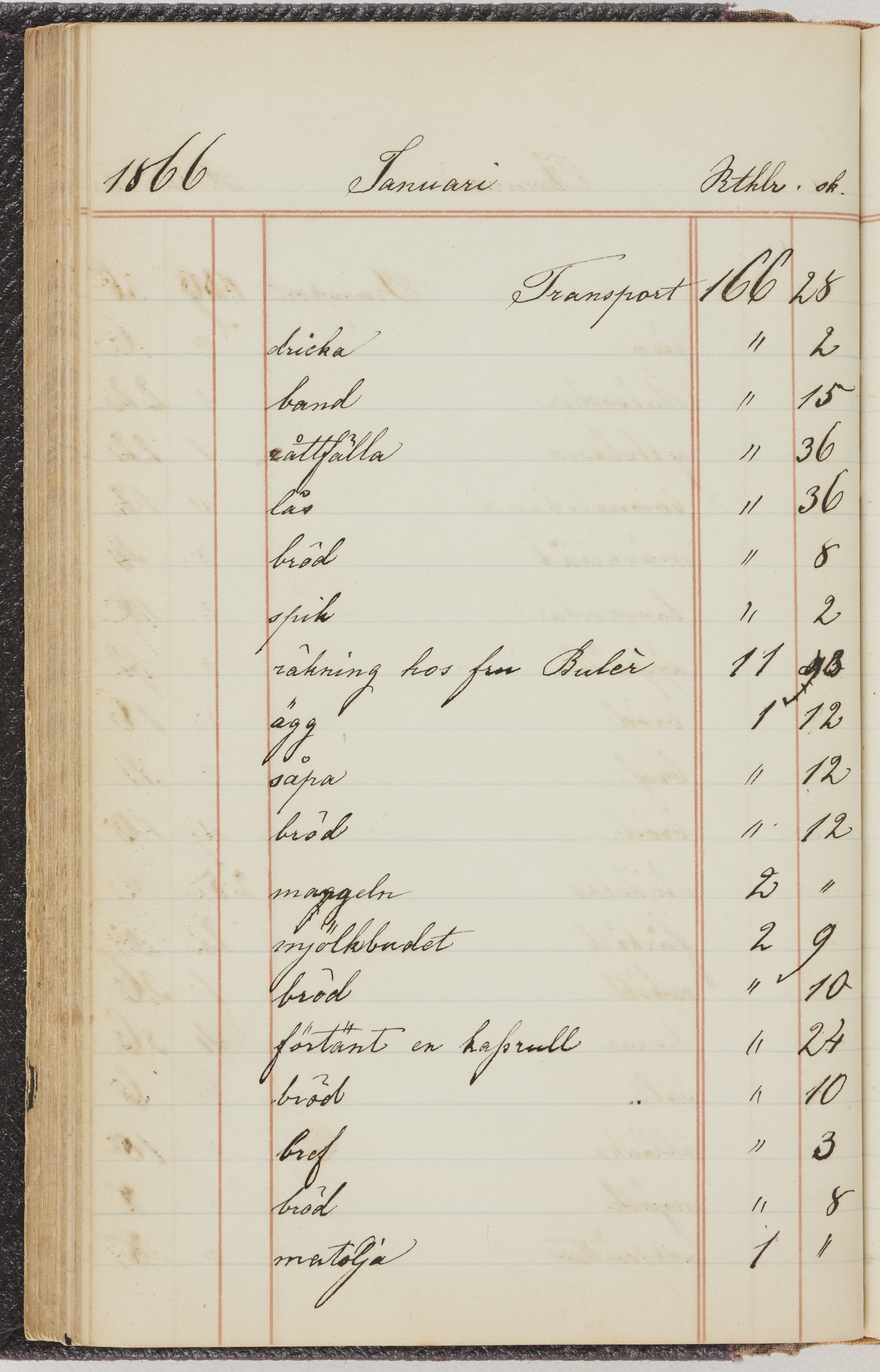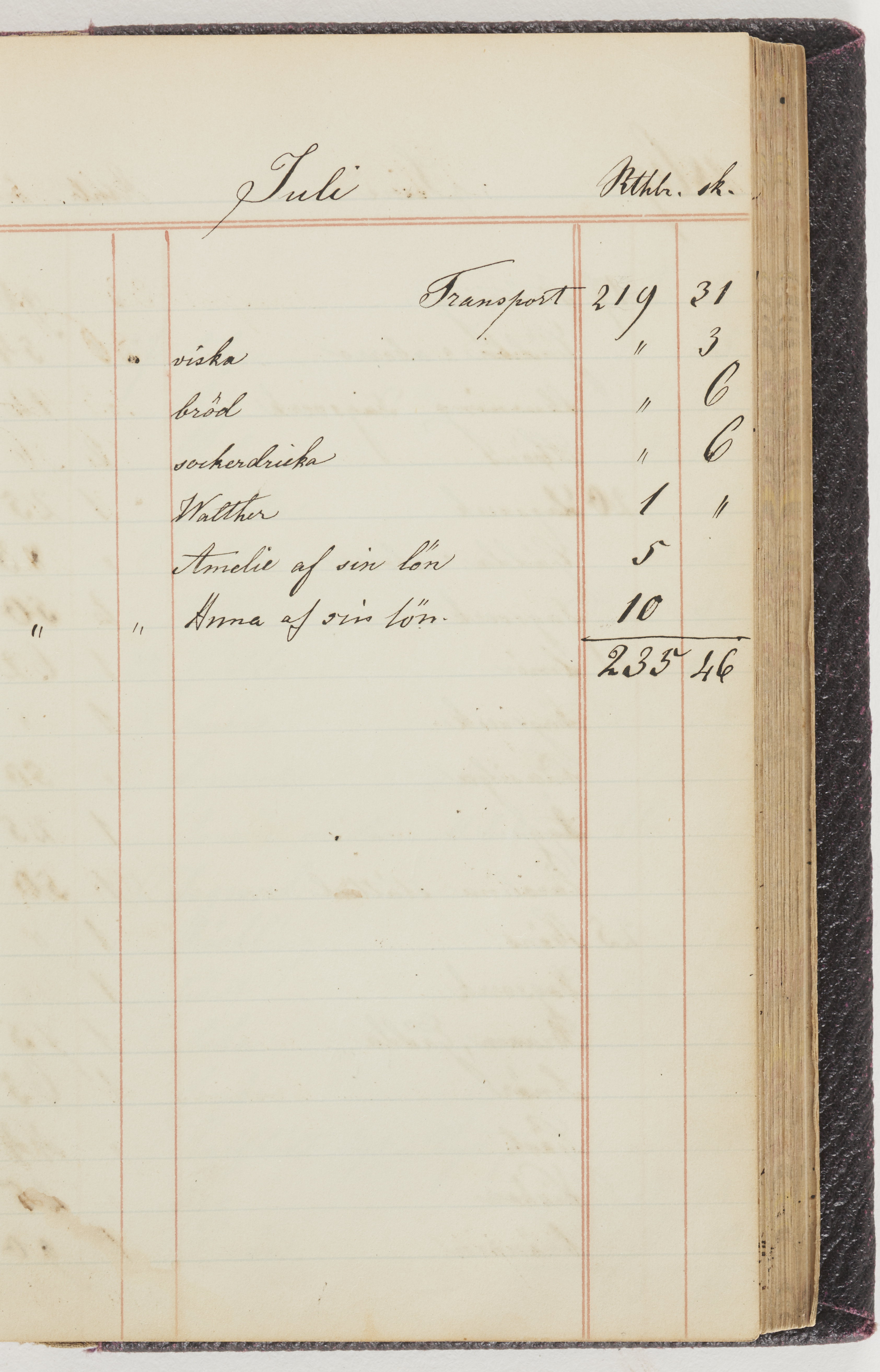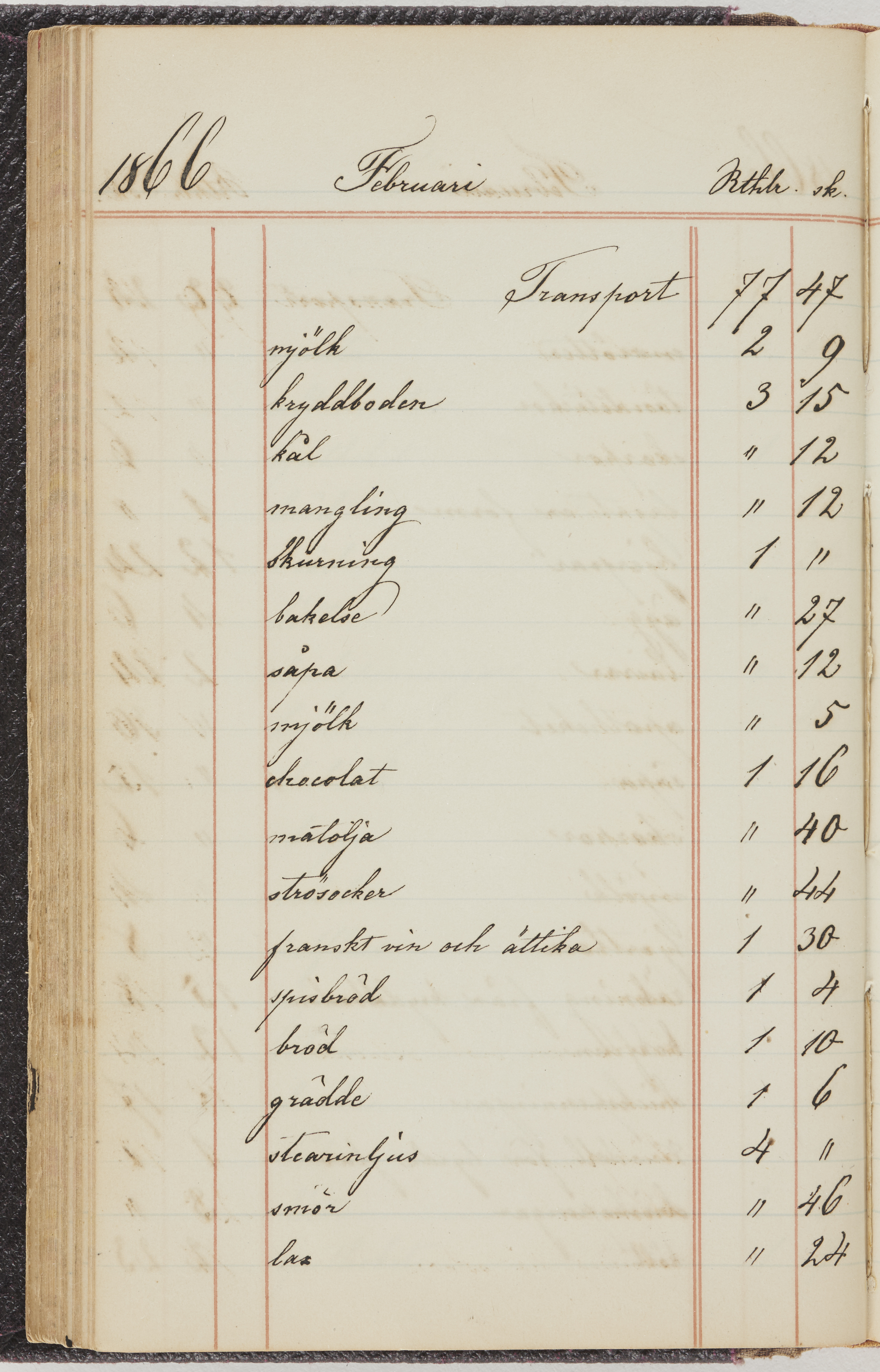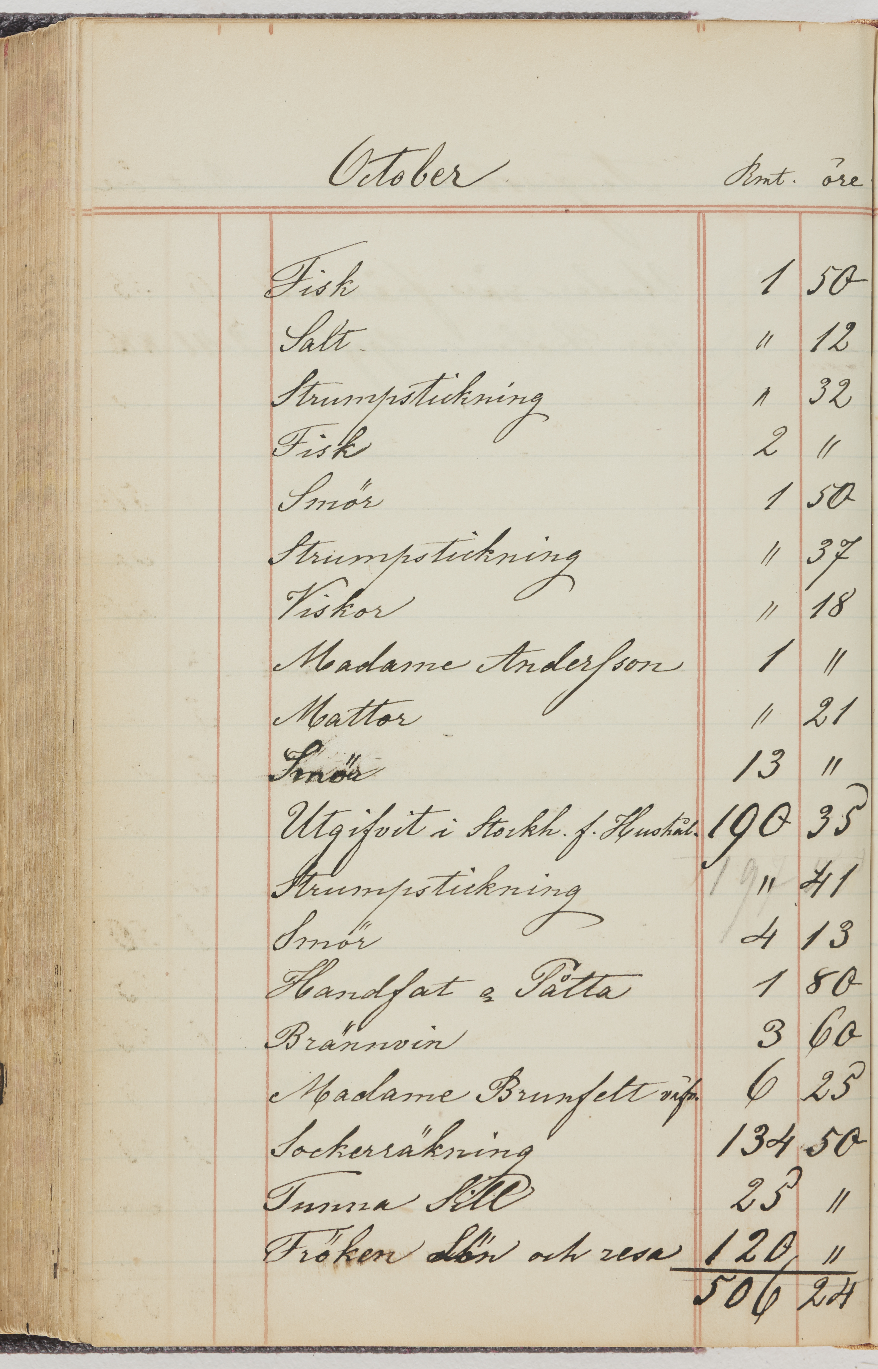 Hushållsbok. 10 vol. inb. 8:0. 1865-1872. 372 s. 1872. 134 s. 1886-1890. 582 s. 1891-1896. 572 s. 1897-1903. 610 s. 1904-1910. 606 s. 1911-1917. 612 s. 1918-1923. 586 s. 1924-1929. 608 s. 1930. 608 s. Skrivna av W. v. H. f. K. Vol. 4-8. Helt band av brunt (vol. 4 och 5) och svart (vol. 6-8) pressad klot. Linjeramar i blindtryck på pärmarna. Kapitel av gult skinn i vol. 4, av tyg i vol. 5-8. Marmorerad snitt. Försättsblad av blårutigt papper i vol. 4, av vitt papper i vol. 5, av brun olifant i vol. 6 och 7, av grå olifant i vol. 8. Vol. 9-13. Helt band av mörkblå klot, bundet med dubbel ansättning och knäpprygg. Kapitel av gult skinn. Marmorerad snitt. Försättsblad av belgisk marmor. i vol. 9, av ljusblått marmorellapapper i de övriga volymerna. Nedtill i vol. 10 och 13 Gust. Hedberges frimamärke i blått.