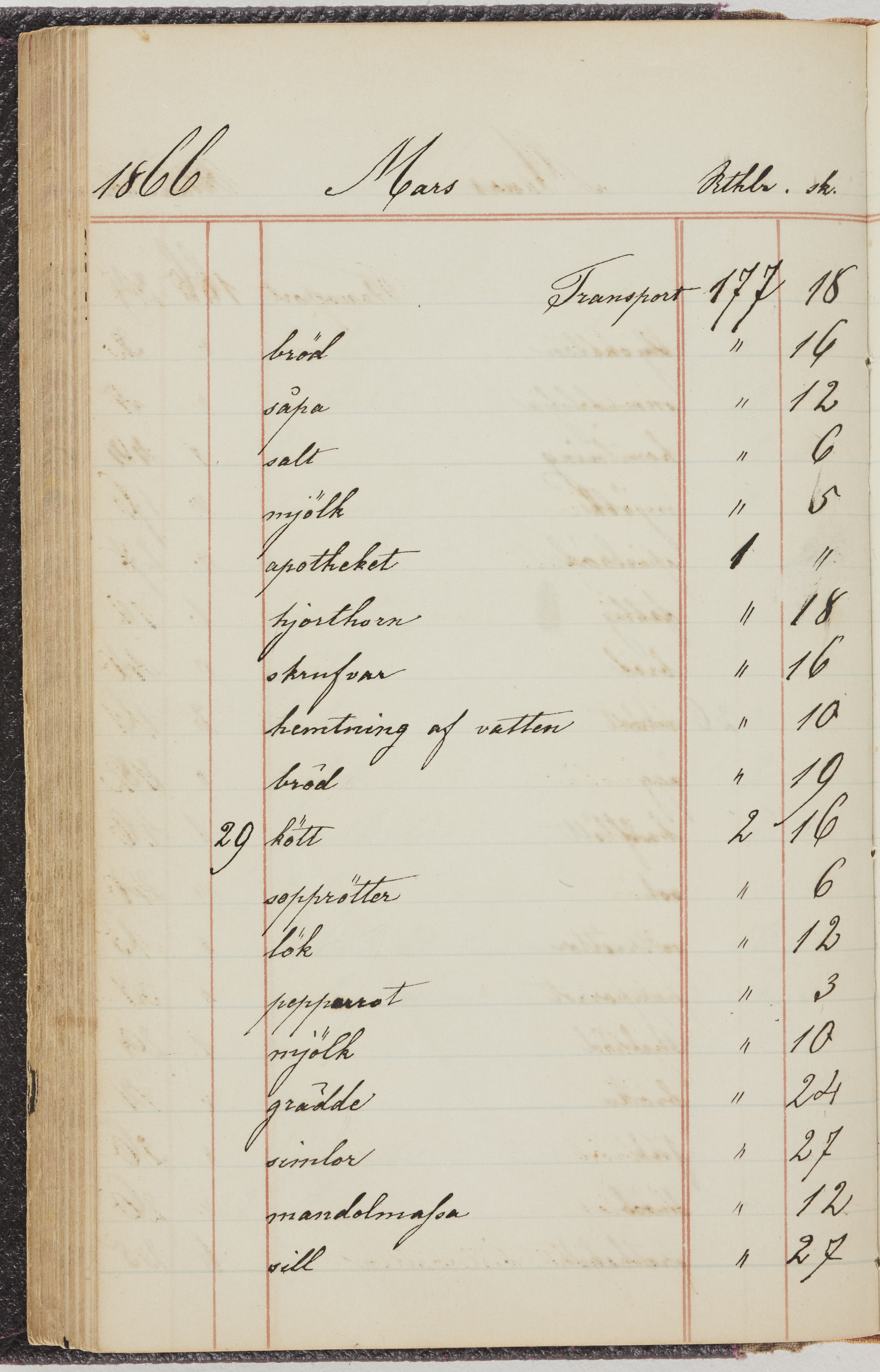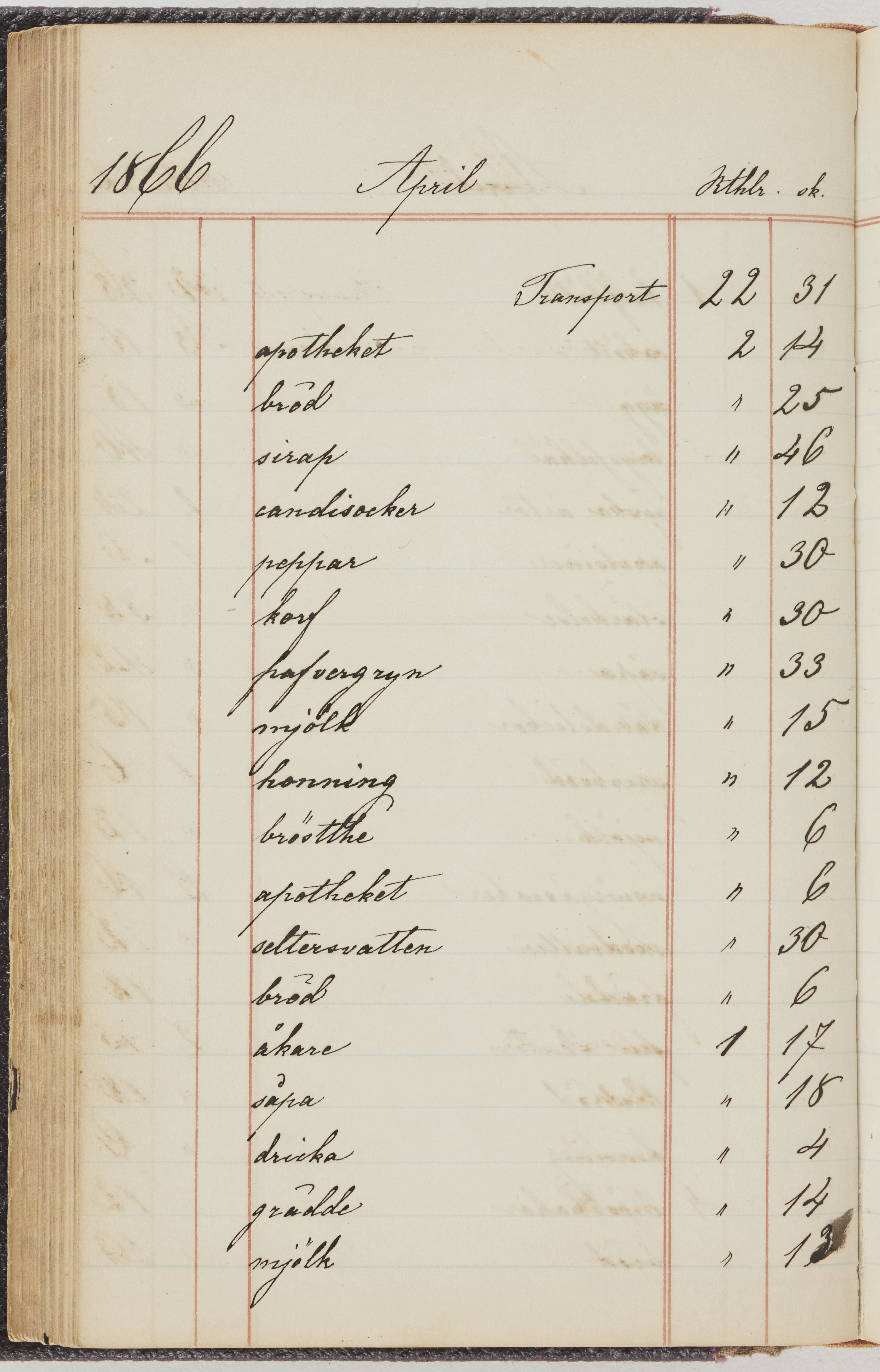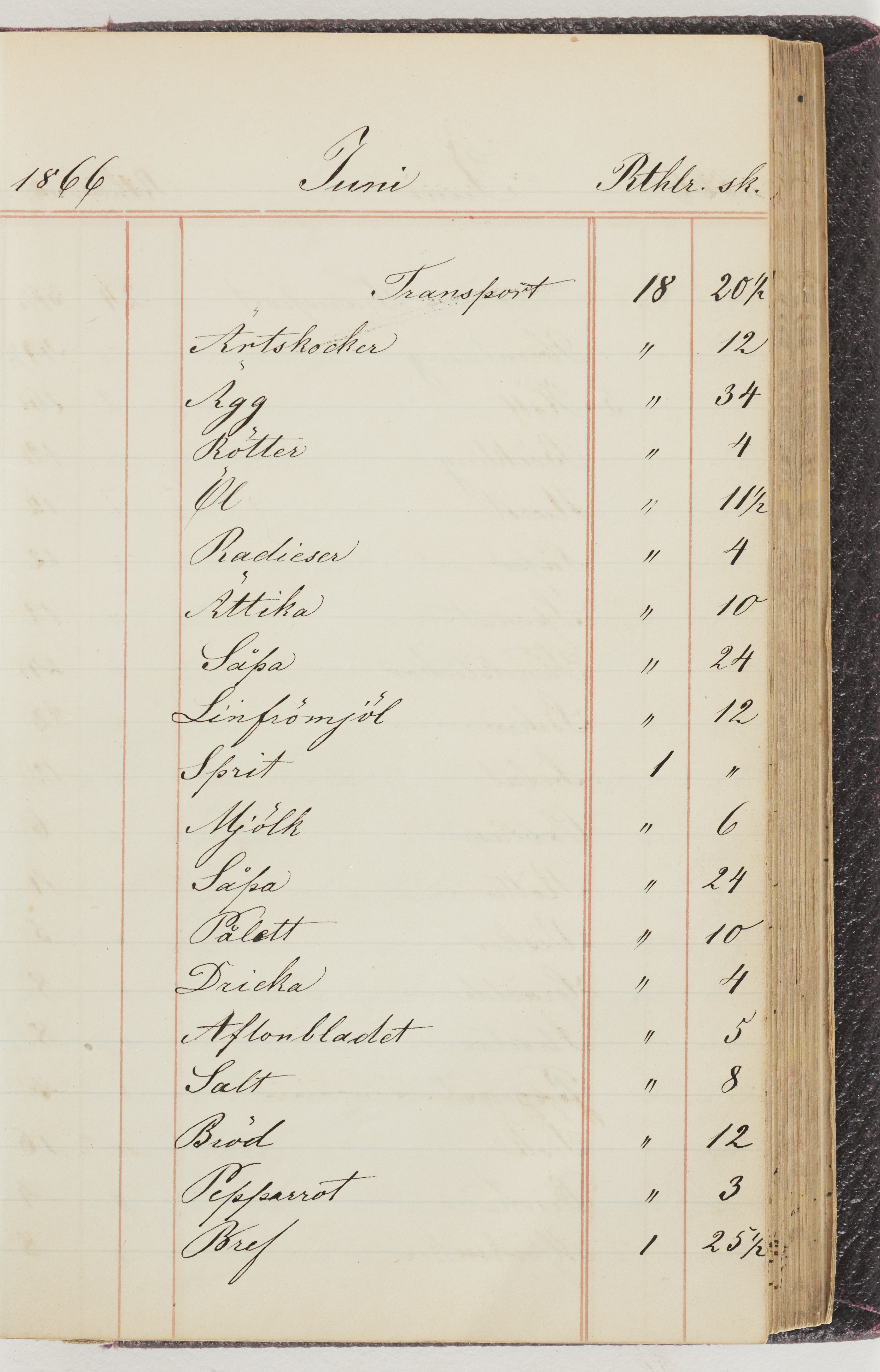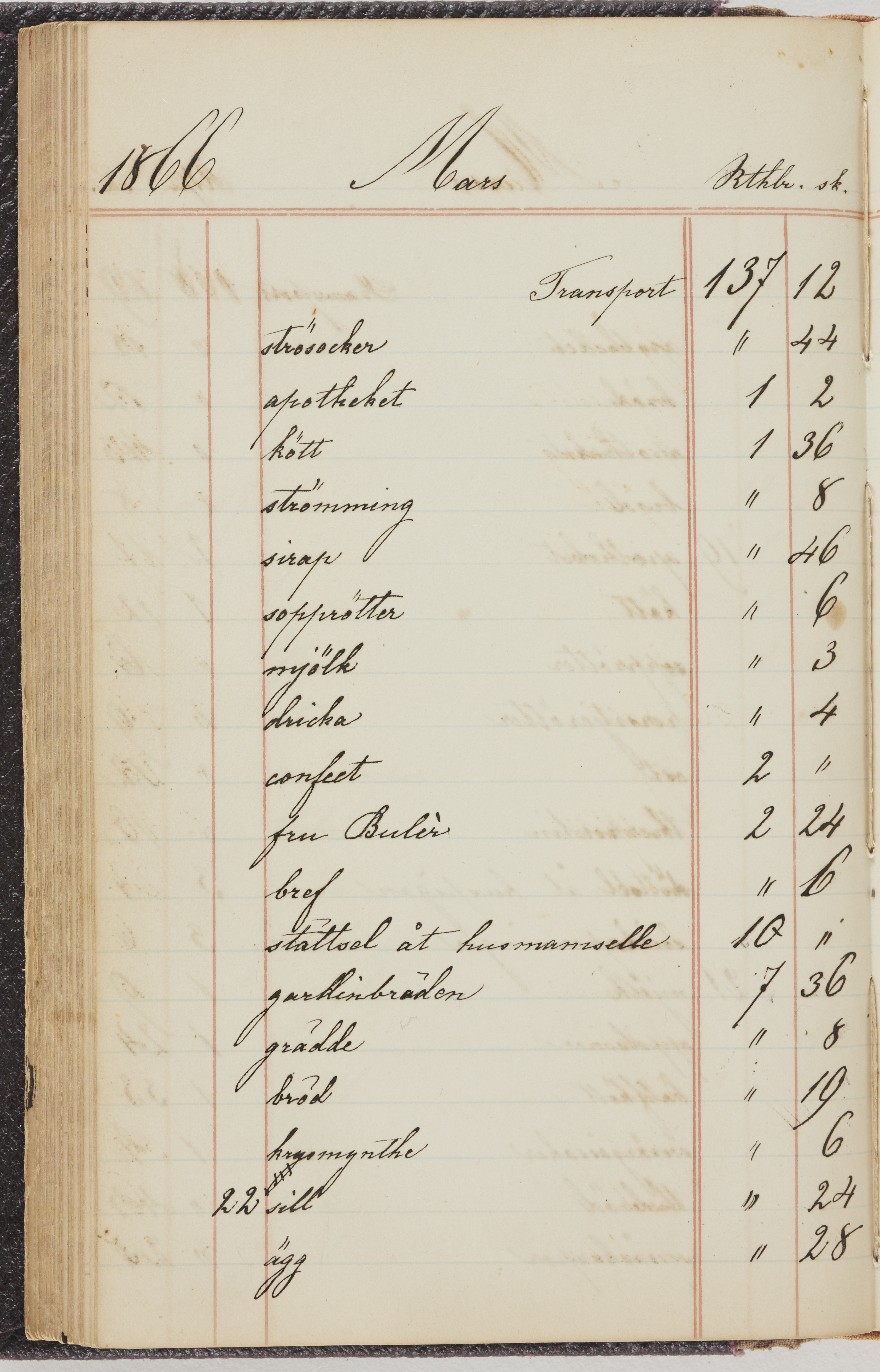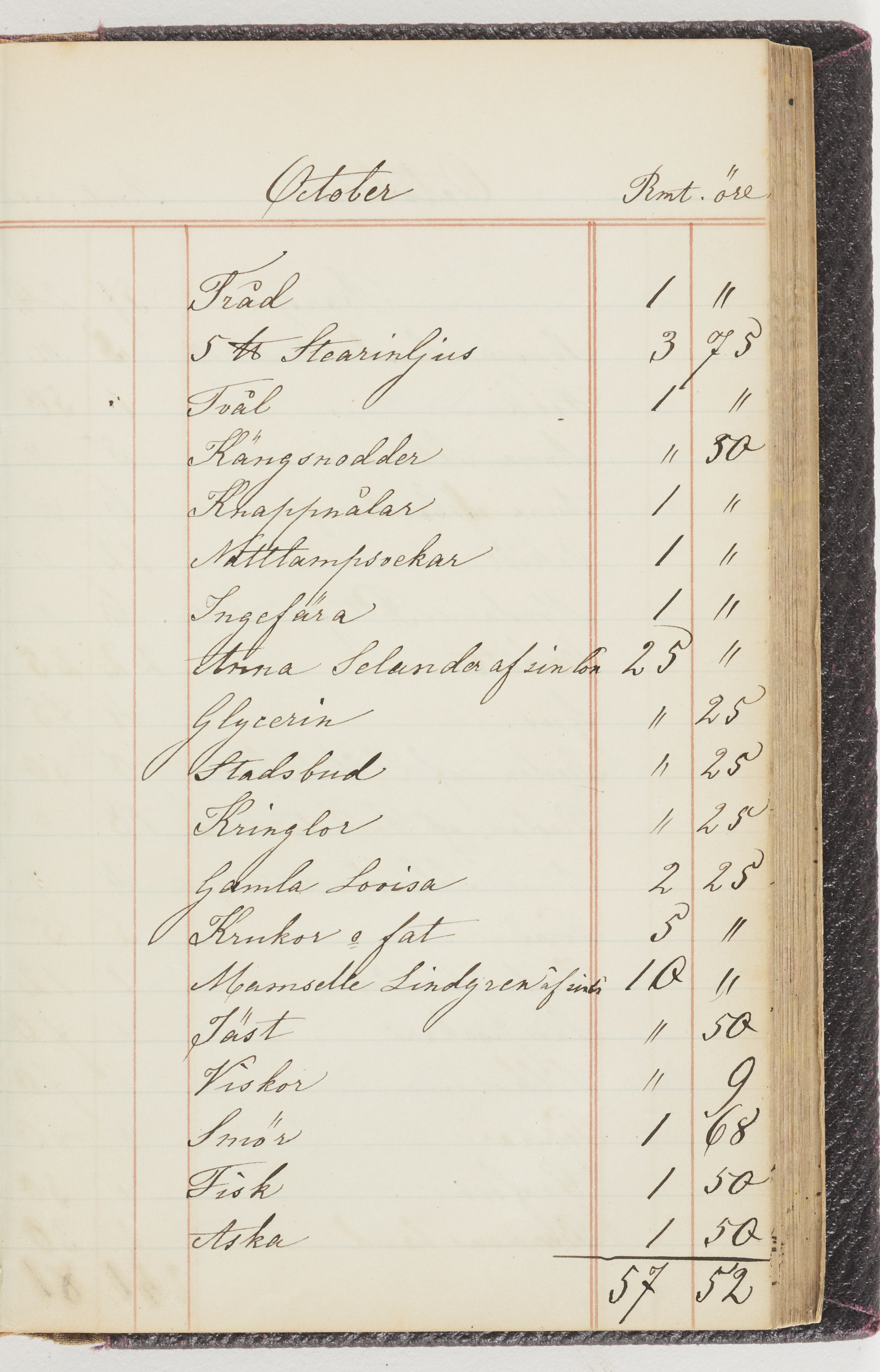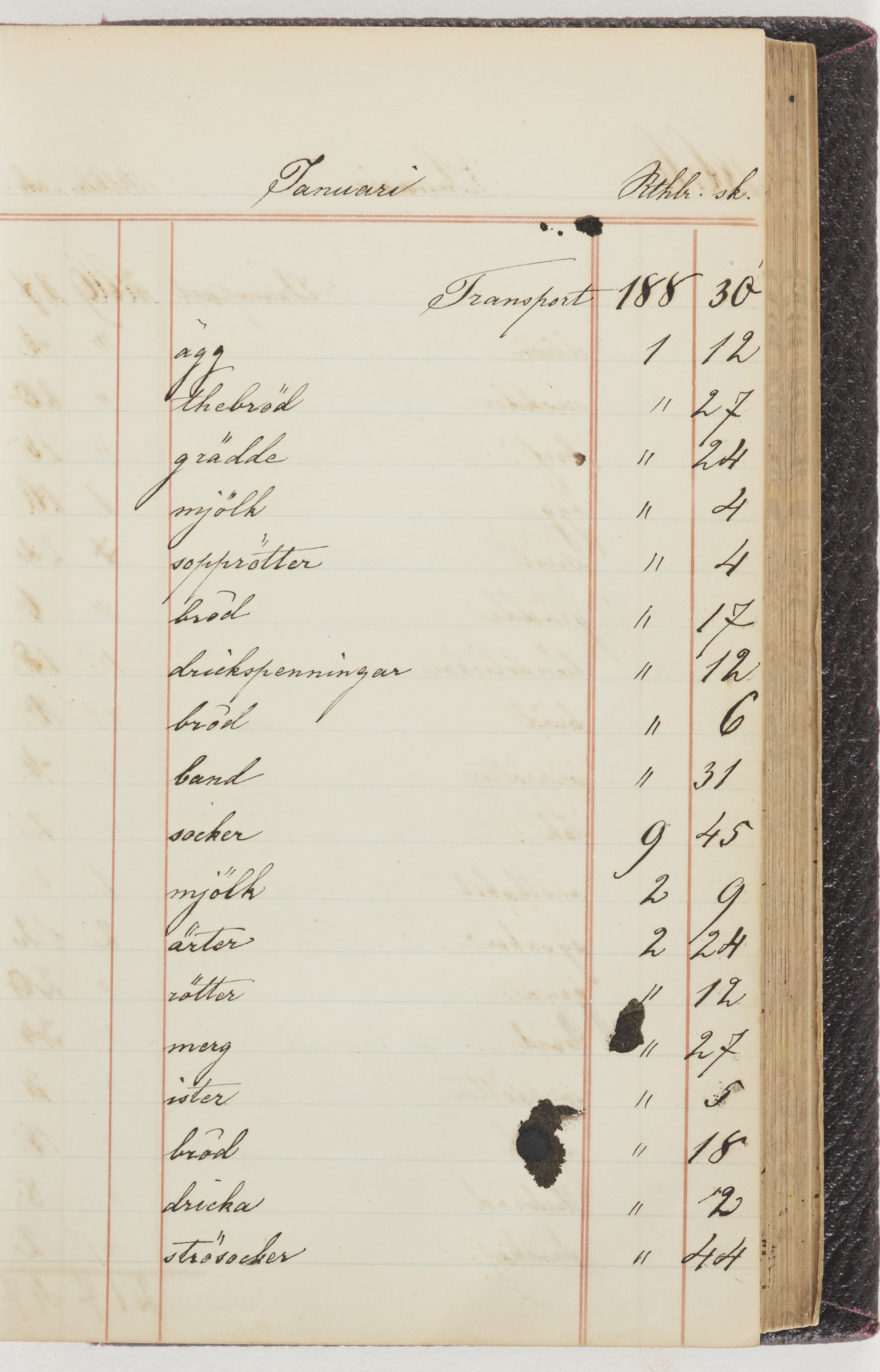 Hushållsbok. 10 vol. inb. 8:0. 1865-1872. 372 s. 1872. 134 s. 1886-1890. 582 s. 1891-1896. 572 s. 1897-1903. 610 s. 1904-1910. 606 s. 1911-1917. 612 s. 1918-1923. 586 s. 1924-1929. 608 s. 1930. 608 s. Skrivna av W. v. H. f. K. Vol. 4-8. Helt band av brunt (vol. 4 och 5) och svart (vol. 6-8) pressad klot. Linjeramar i blindtryck på pärmarna. Kapitel av gult skinn i vol. 4, av tyg i vol. 5-8. Marmorerad snitt. Försättsblad av blårutigt papper i vol. 4, av vitt papper i vol. 5, av brun olifant i vol. 6 och 7, av grå olifant i vol. 8. Vol. 9-13. Helt band av mörkblå klot, bundet med dubbel ansättning och knäpprygg. Kapitel av gult skinn. Marmorerad snitt. Försättsblad av belgisk marmor. i vol. 9, av ljusblått marmorellapapper i de övriga volymerna. Nedtill i vol. 10 och 13 Gust. Hedberges frimamärke i blått.