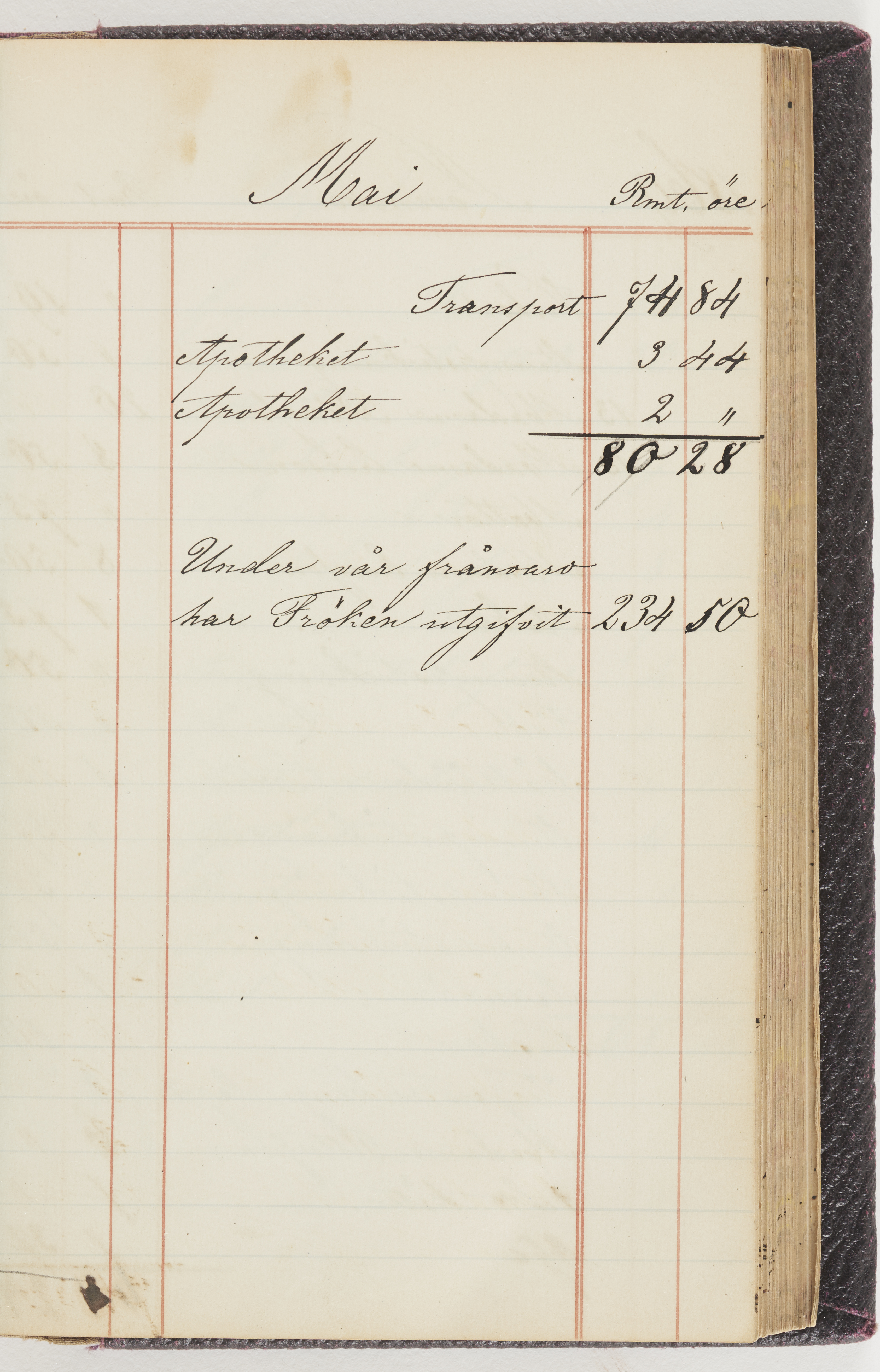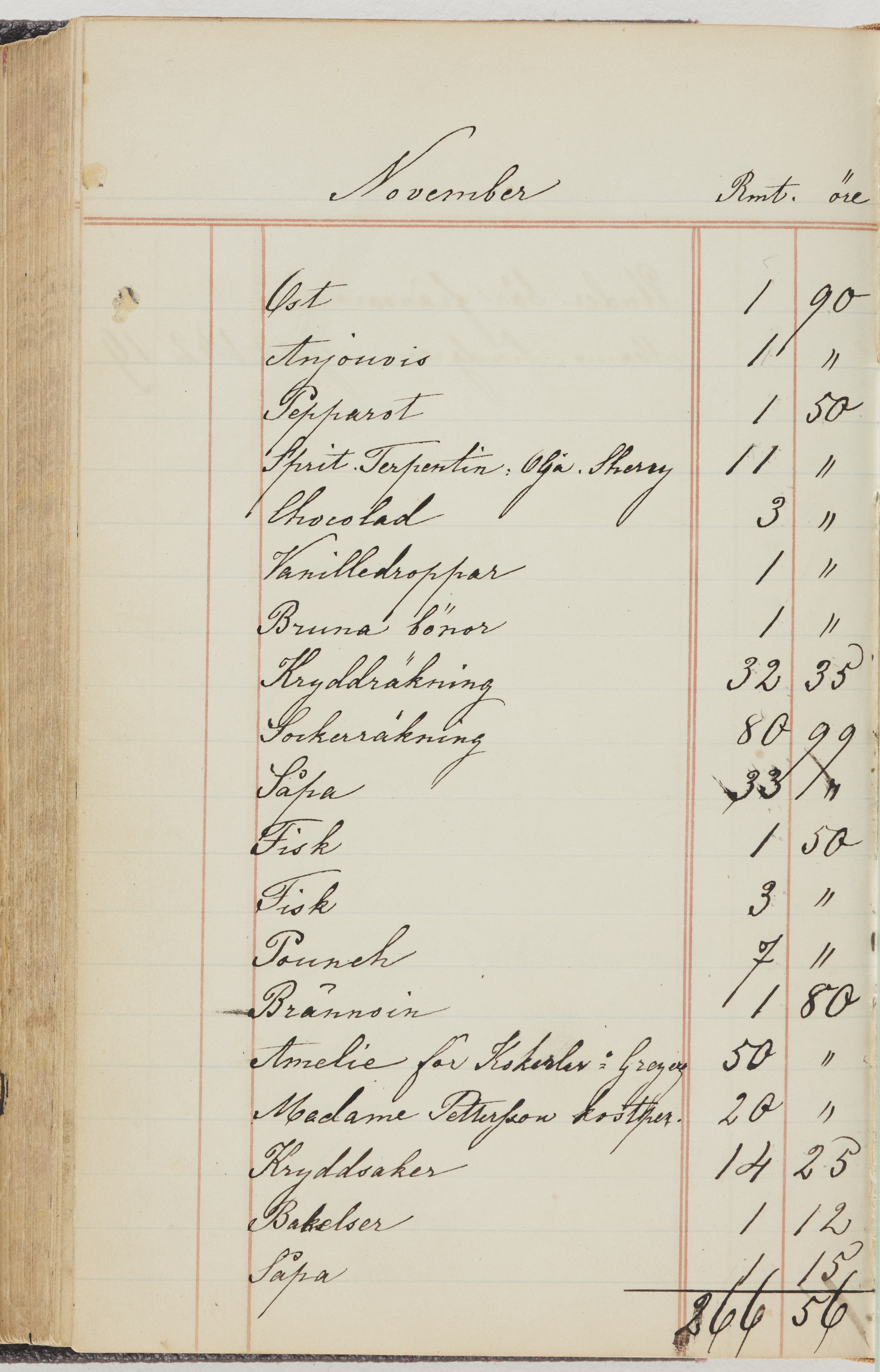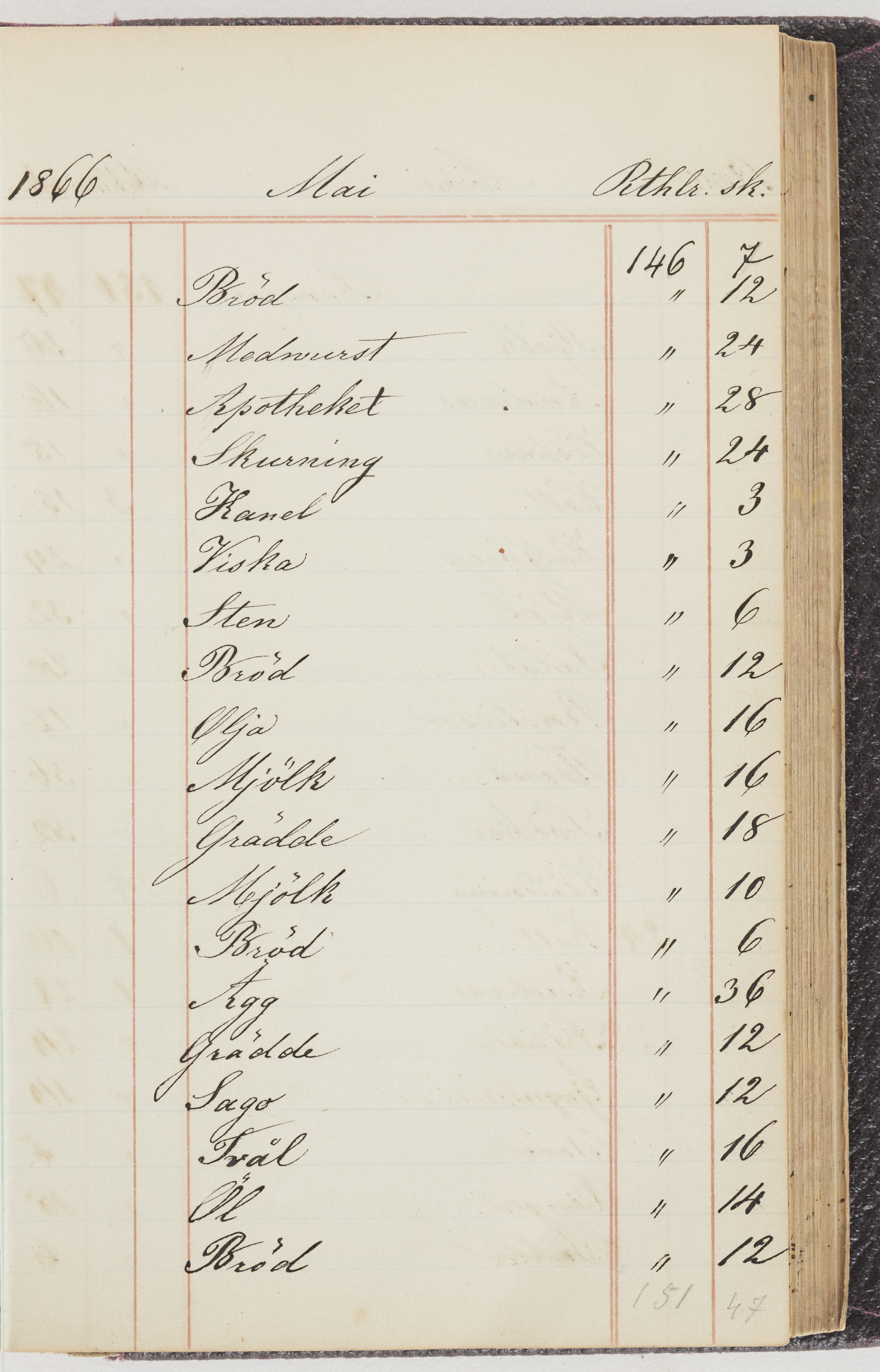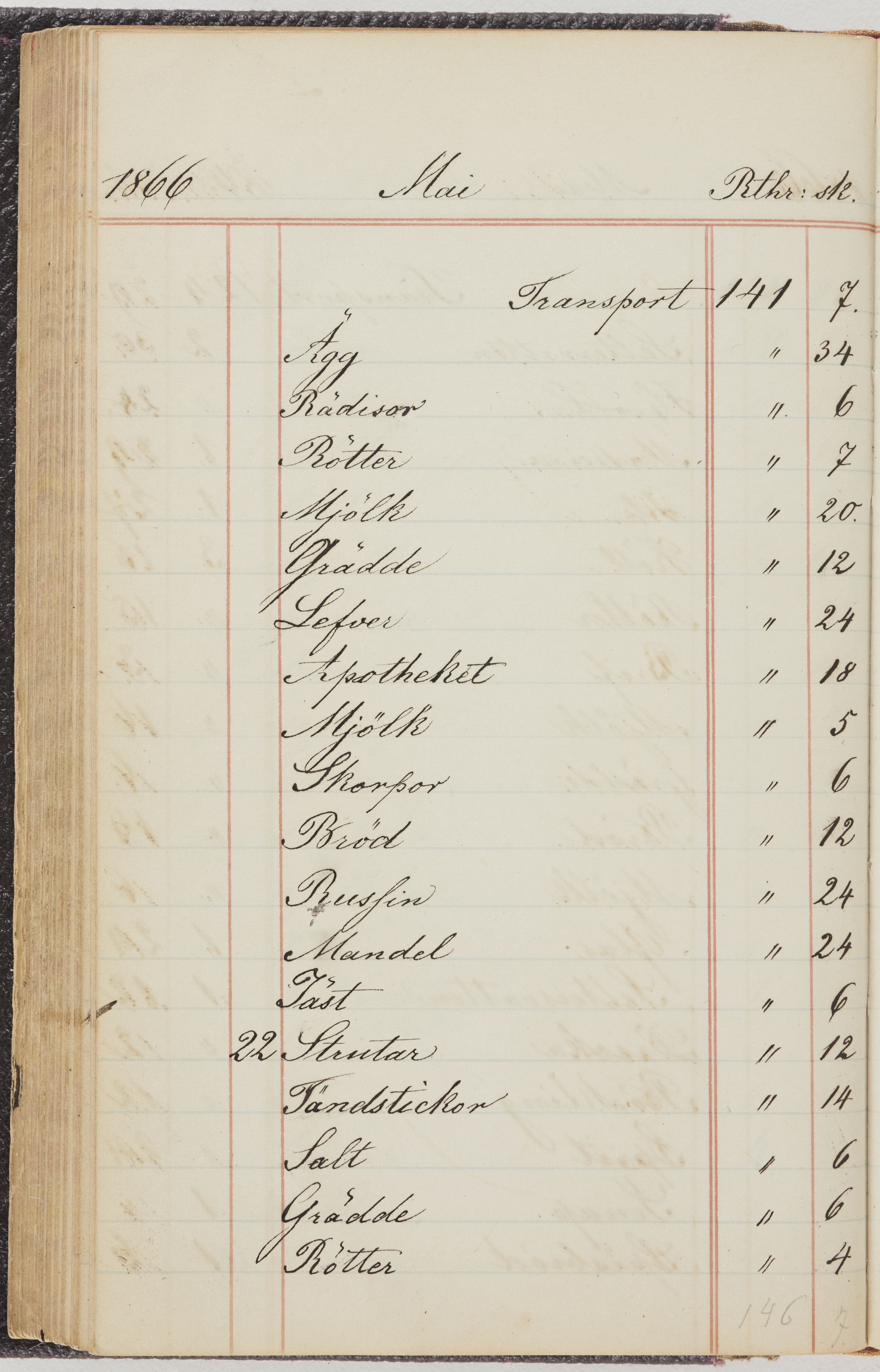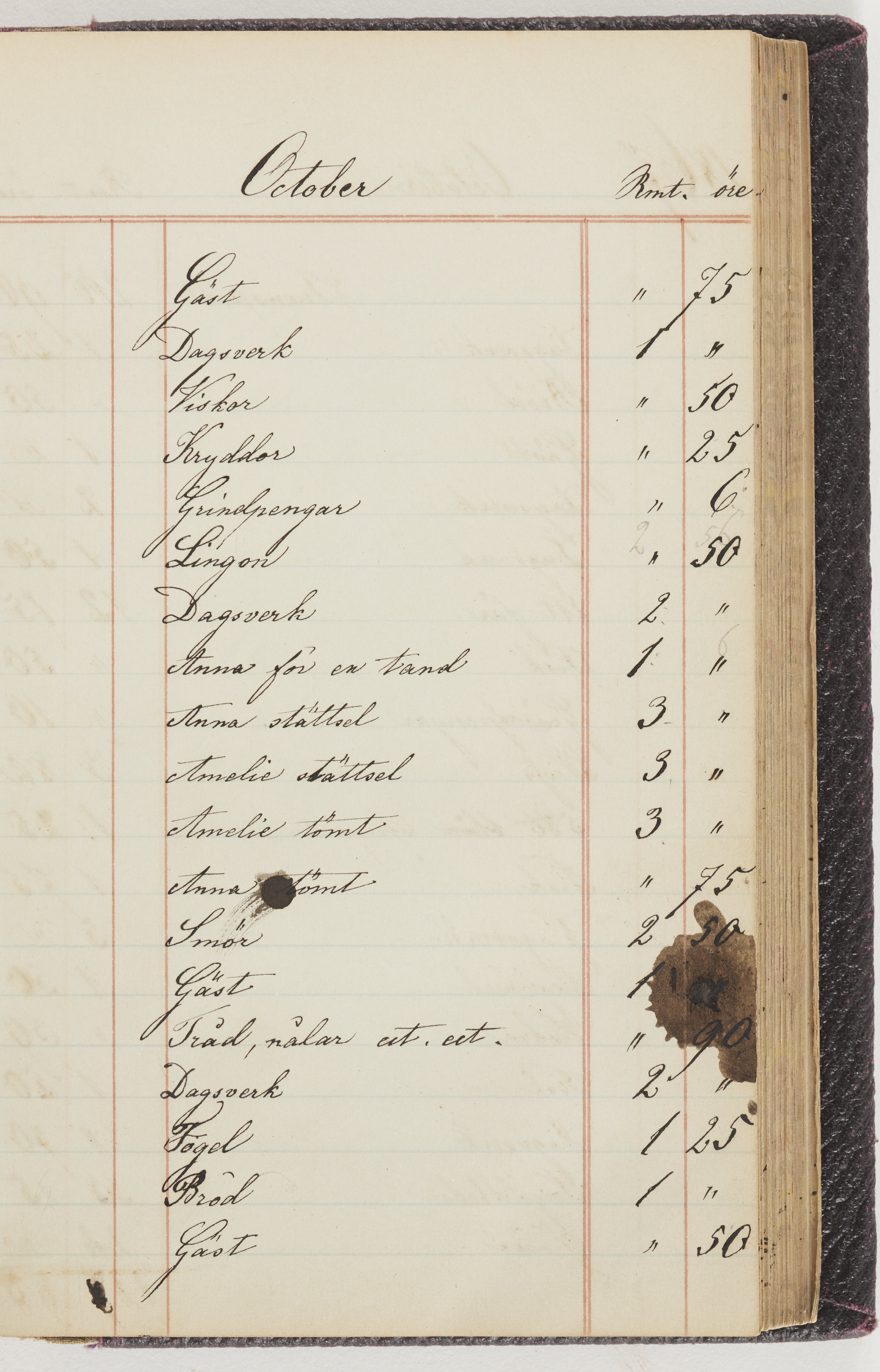 Hushållsbok. 10 vol. inb. 8:0. 1865-1872. 372 s. 1872. 134 s. 1886-1890. 582 s. 1891-1896. 572 s. 1897-1903. 610 s. 1904-1910. 606 s. 1911-1917. 612 s. 1918-1923. 586 s. 1924-1929. 608 s. 1930. 608 s. Skrivna av W. v. H. f. K. Vol. 4-8. Helt band av brunt (vol. 4 och 5) och svart (vol. 6-8) pressad klot. Linjeramar i blindtryck på pärmarna. Kapitel av gult skinn i vol. 4, av tyg i vol. 5-8. Marmorerad snitt. Försättsblad av blårutigt papper i vol. 4, av vitt papper i vol. 5, av brun olifant i vol. 6 och 7, av grå olifant i vol. 8. Vol. 9-13. Helt band av mörkblå klot, bundet med dubbel ansättning och knäpprygg. Kapitel av gult skinn. Marmorerad snitt. Försättsblad av belgisk marmor. i vol. 9, av ljusblått marmorellapapper i de övriga volymerna. Nedtill i vol. 10 och 13 Gust. Hedberges frimamärke i blått.