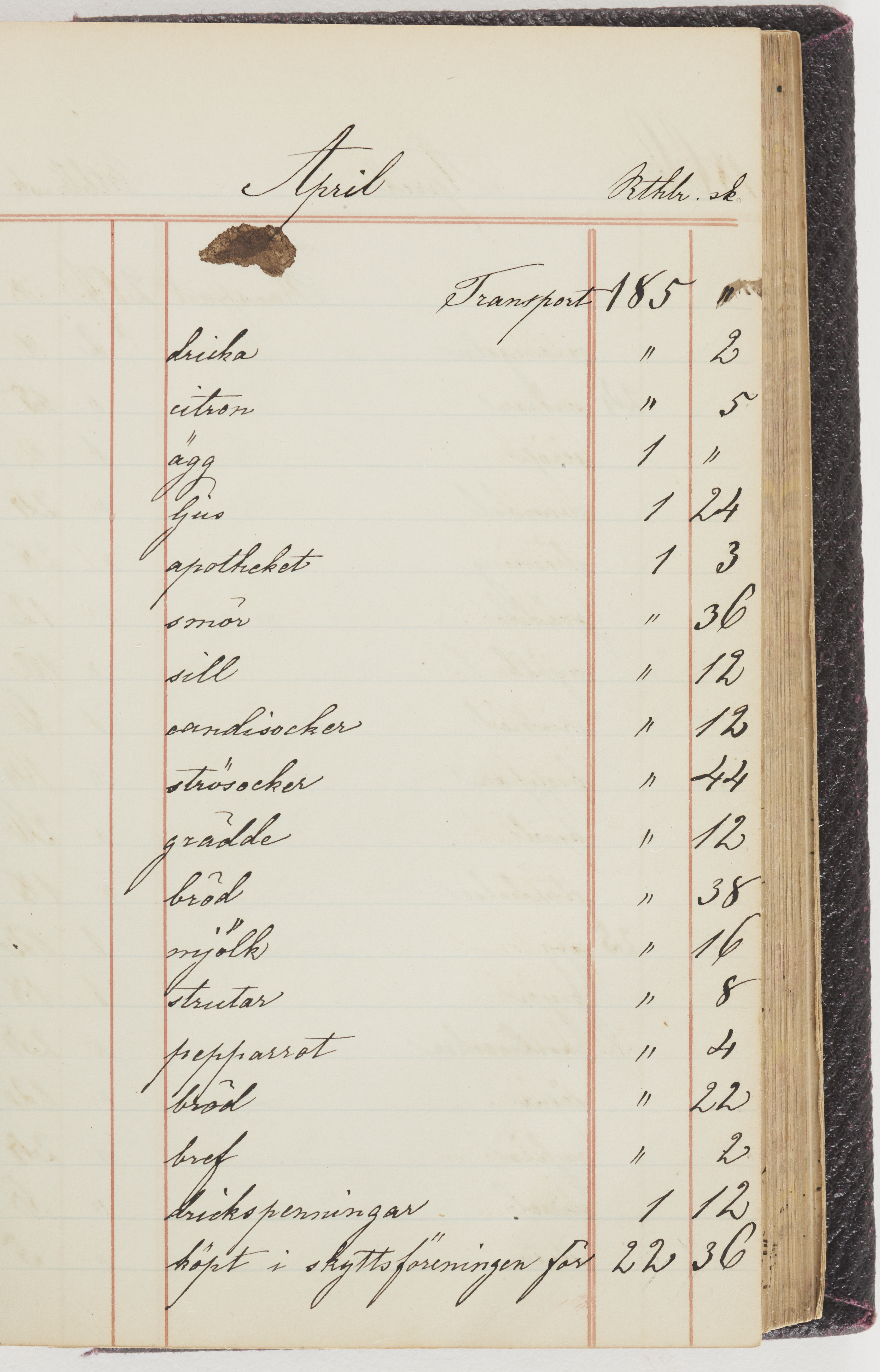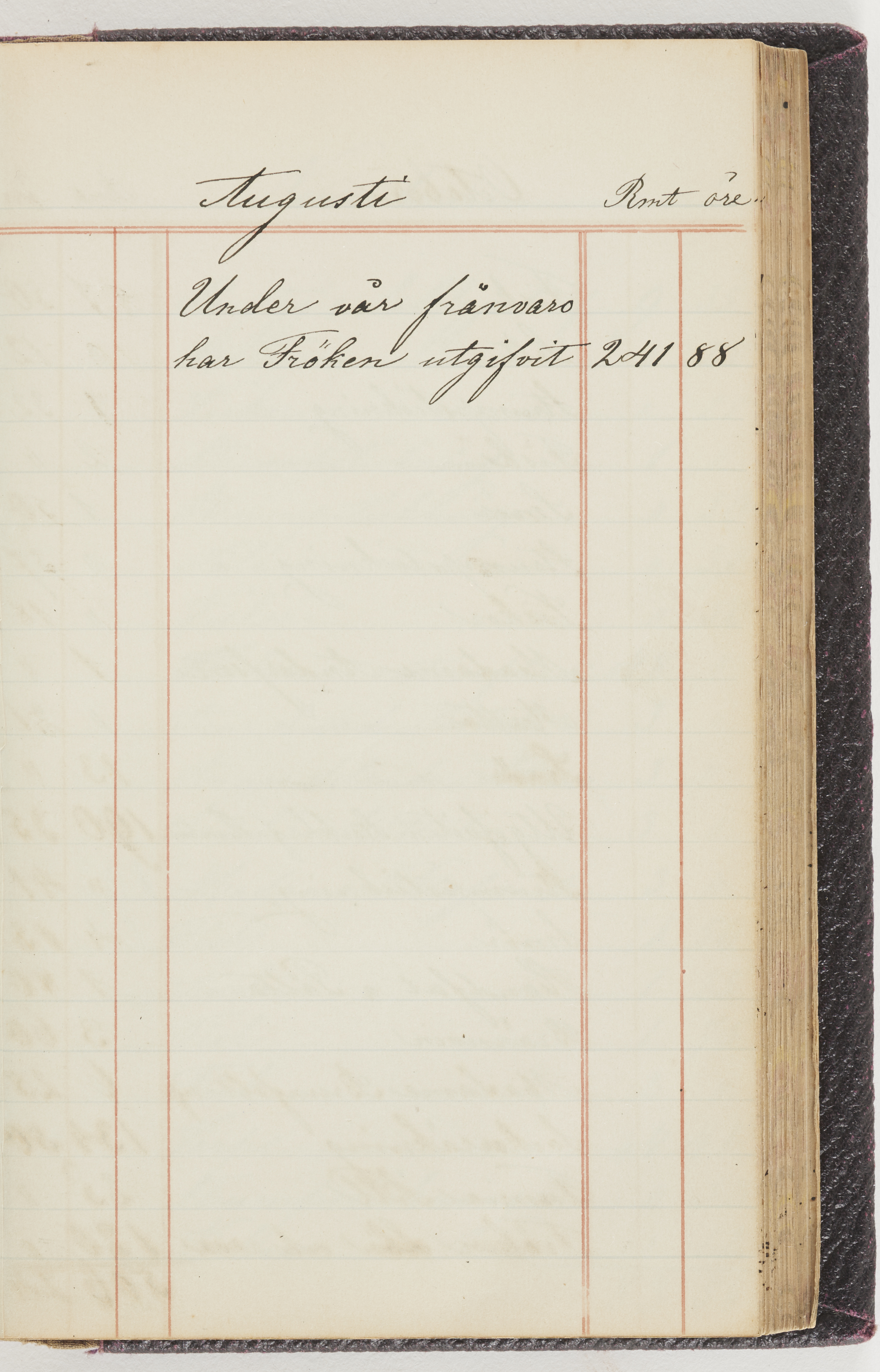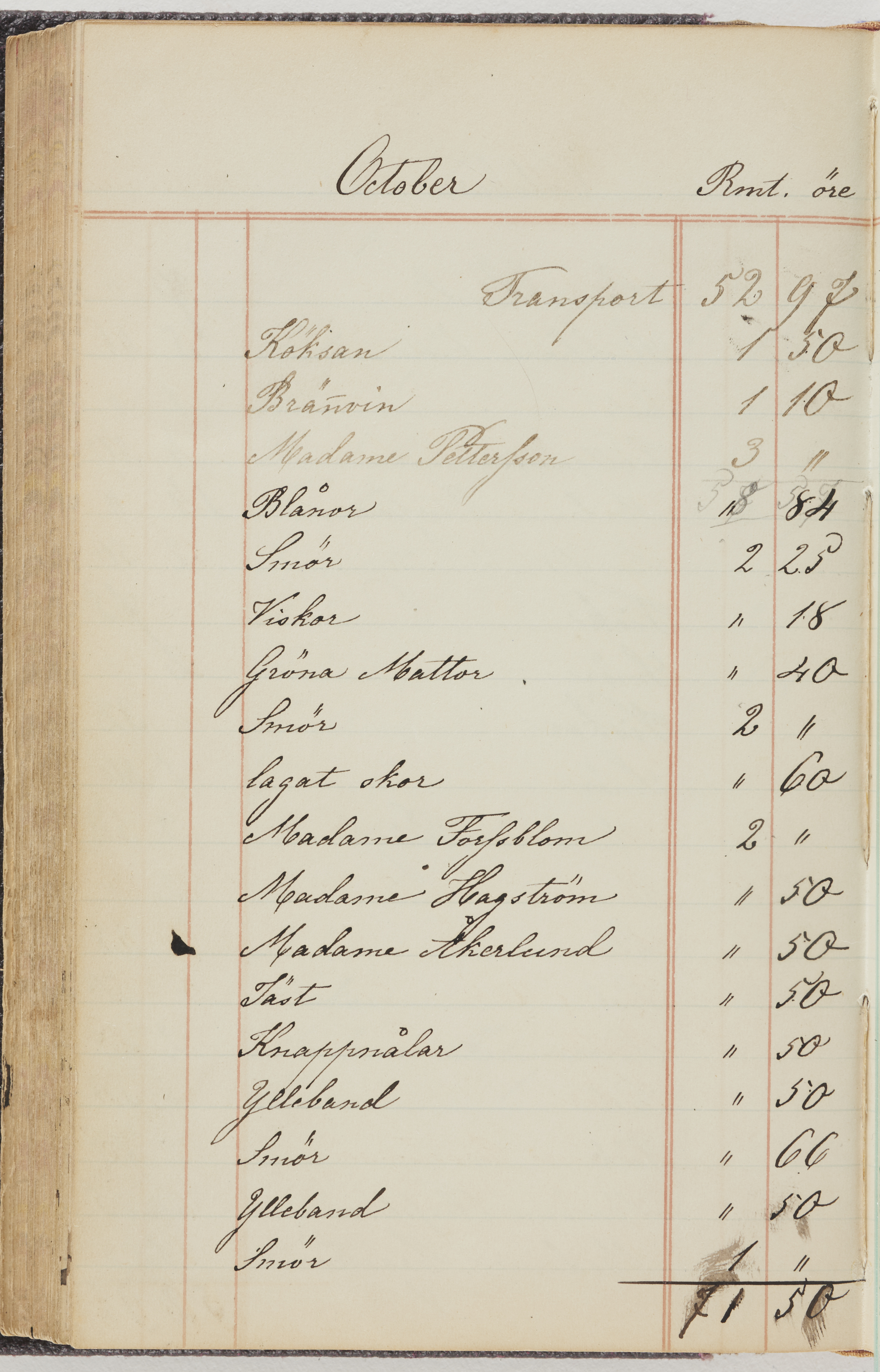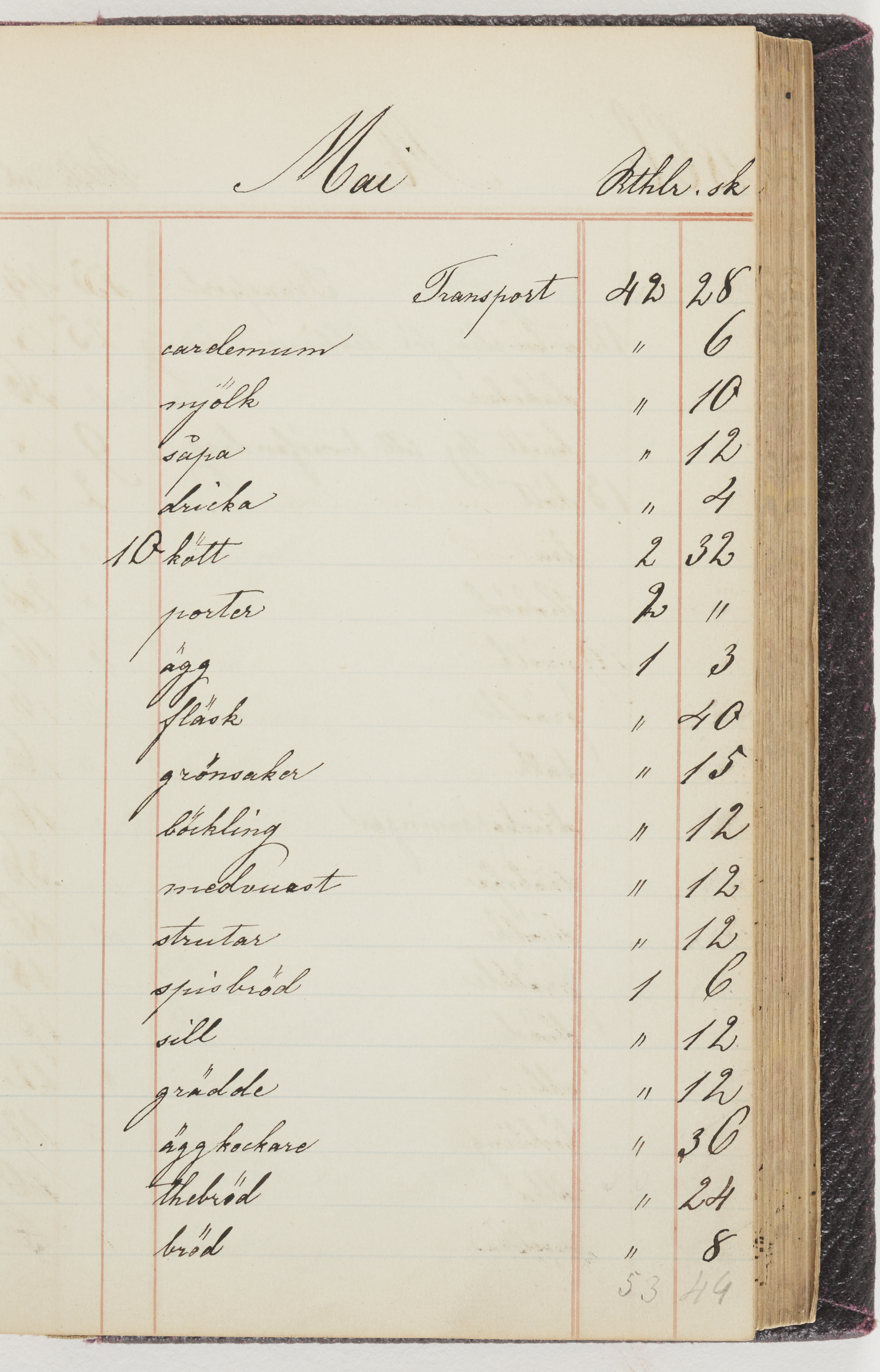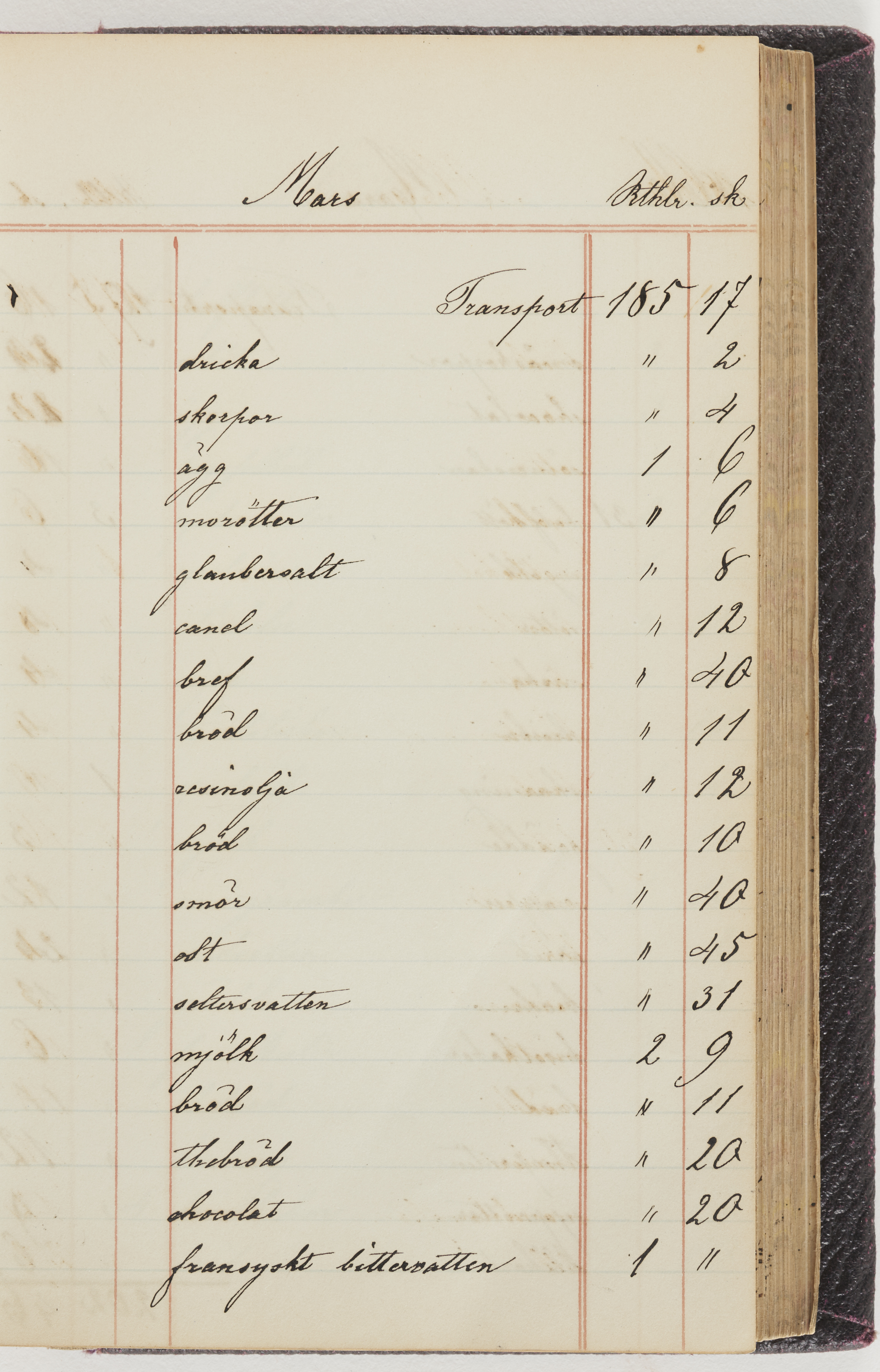 Hushållsbok. 10 vol. inb. 8:0. 1865-1872. 372 s. 1872. 134 s. 1886-1890. 582 s. 1891-1896. 572 s. 1897-1903. 610 s. 1904-1910. 606 s. 1911-1917. 612 s. 1918-1923. 586 s. 1924-1929. 608 s. 1930. 608 s. Skrivna av W. v. H. f. K. Vol. 4-8. Helt band av brunt (vol. 4 och 5) och svart (vol. 6-8) pressad klot. Linjeramar i blindtryck på pärmarna. Kapitel av gult skinn i vol. 4, av tyg i vol. 5-8. Marmorerad snitt. Försättsblad av blårutigt papper i vol. 4, av vitt papper i vol. 5, av brun olifant i vol. 6 och 7, av grå olifant i vol. 8. Vol. 9-13. Helt band av mörkblå klot, bundet med dubbel ansättning och knäpprygg. Kapitel av gult skinn. Marmorerad snitt. Försättsblad av belgisk marmor. i vol. 9, av ljusblått marmorellapapper i de övriga volymerna. Nedtill i vol. 10 och 13 Gust. Hedberges frimamärke i blått.