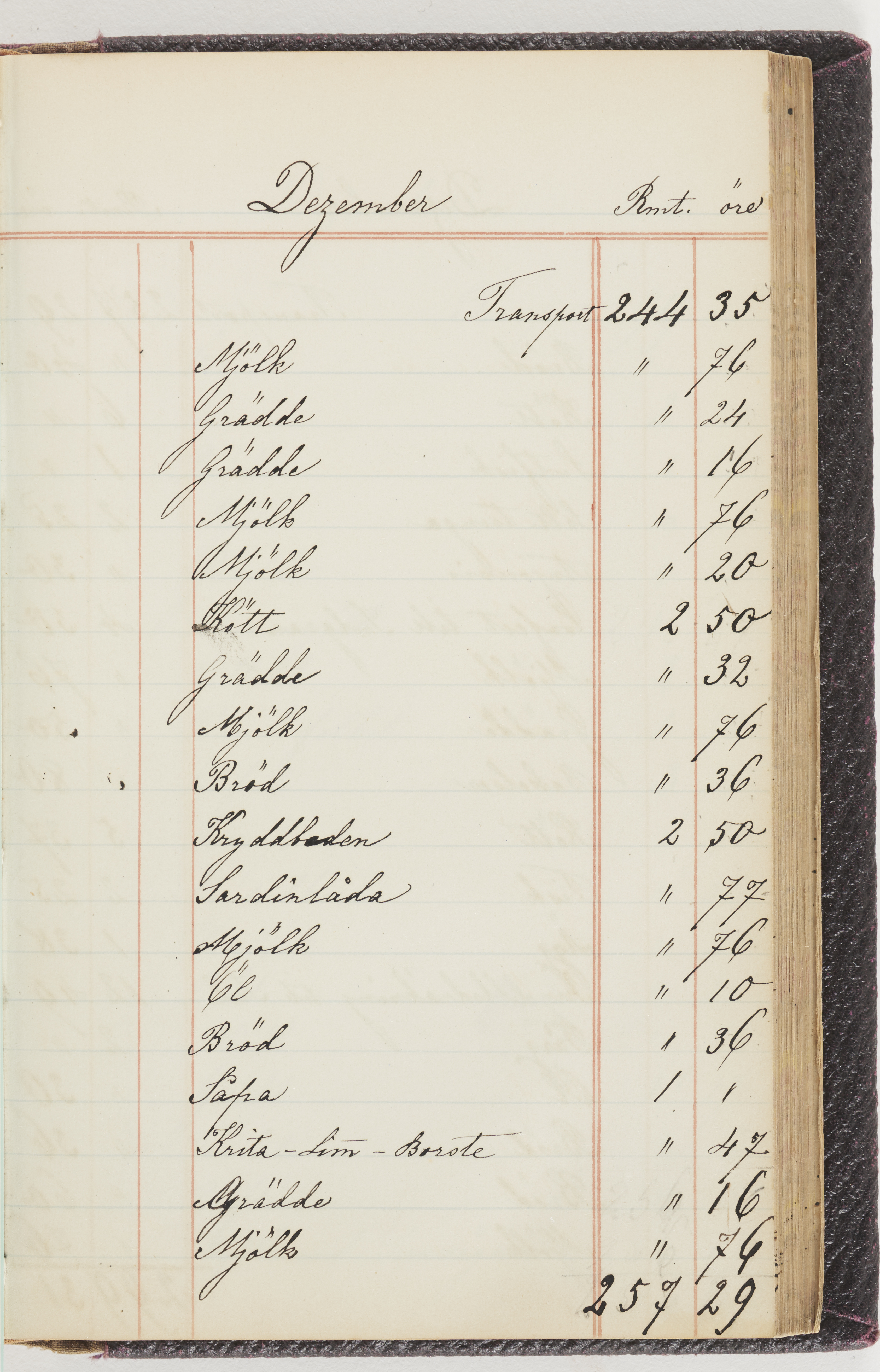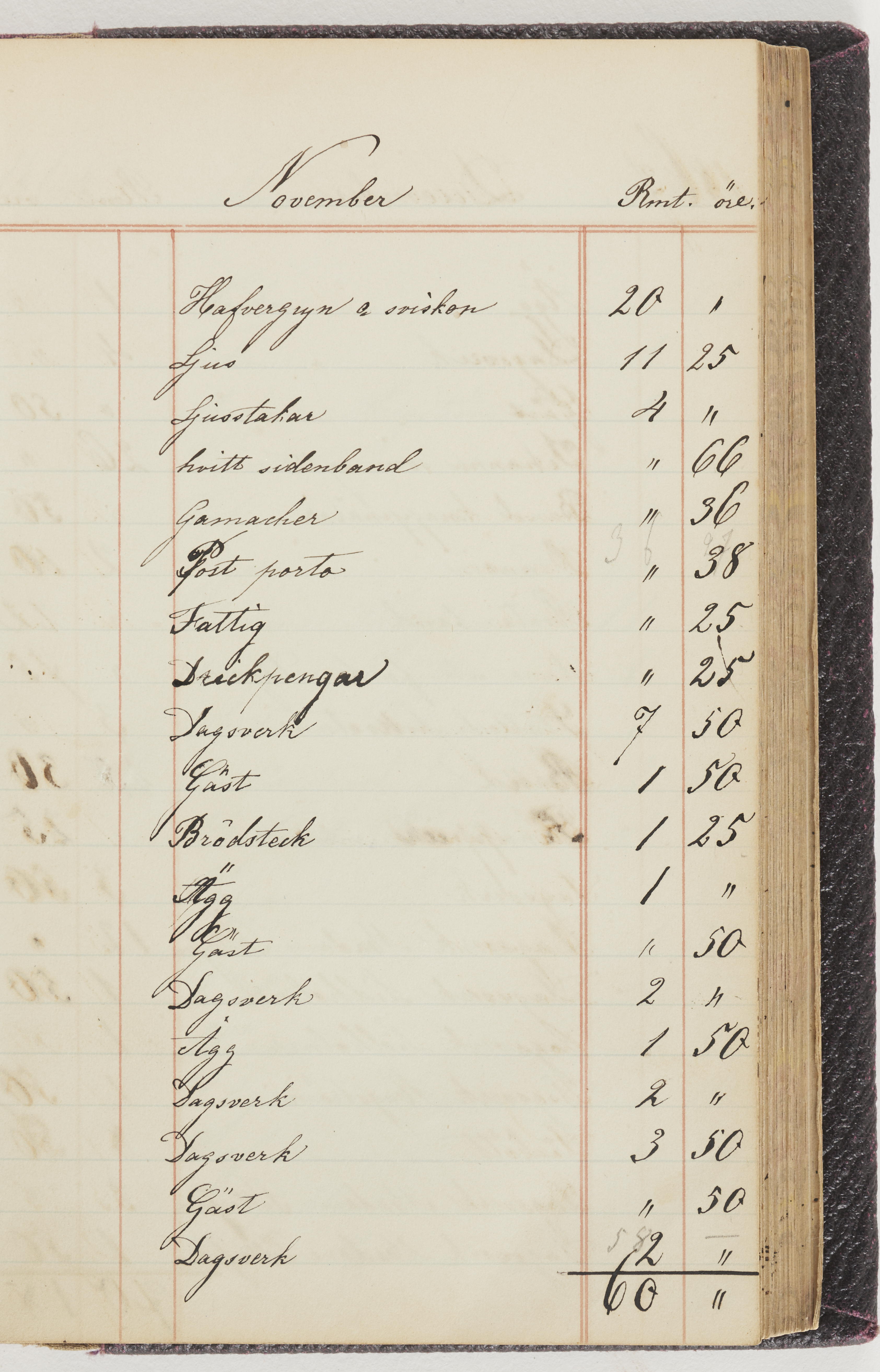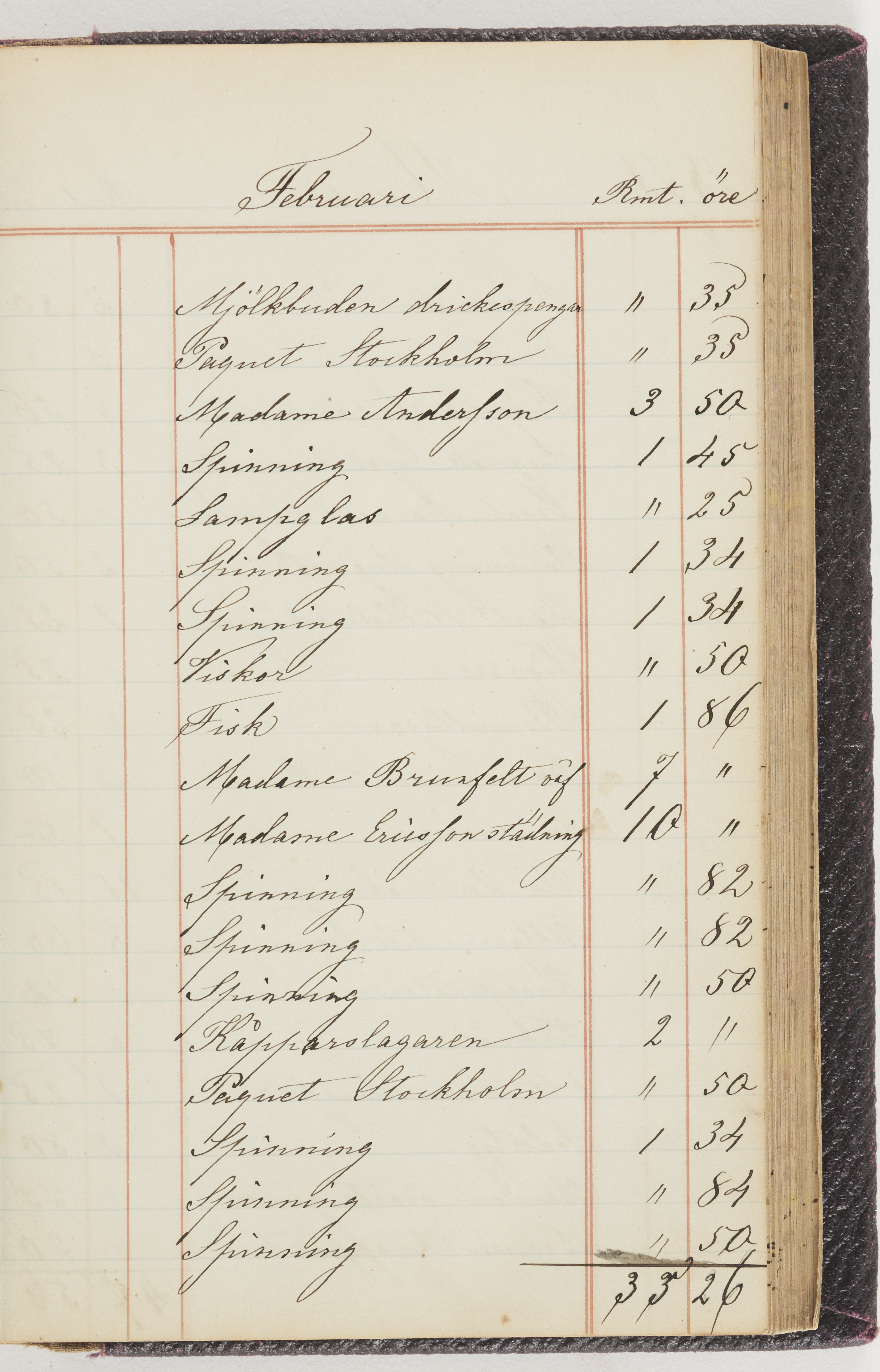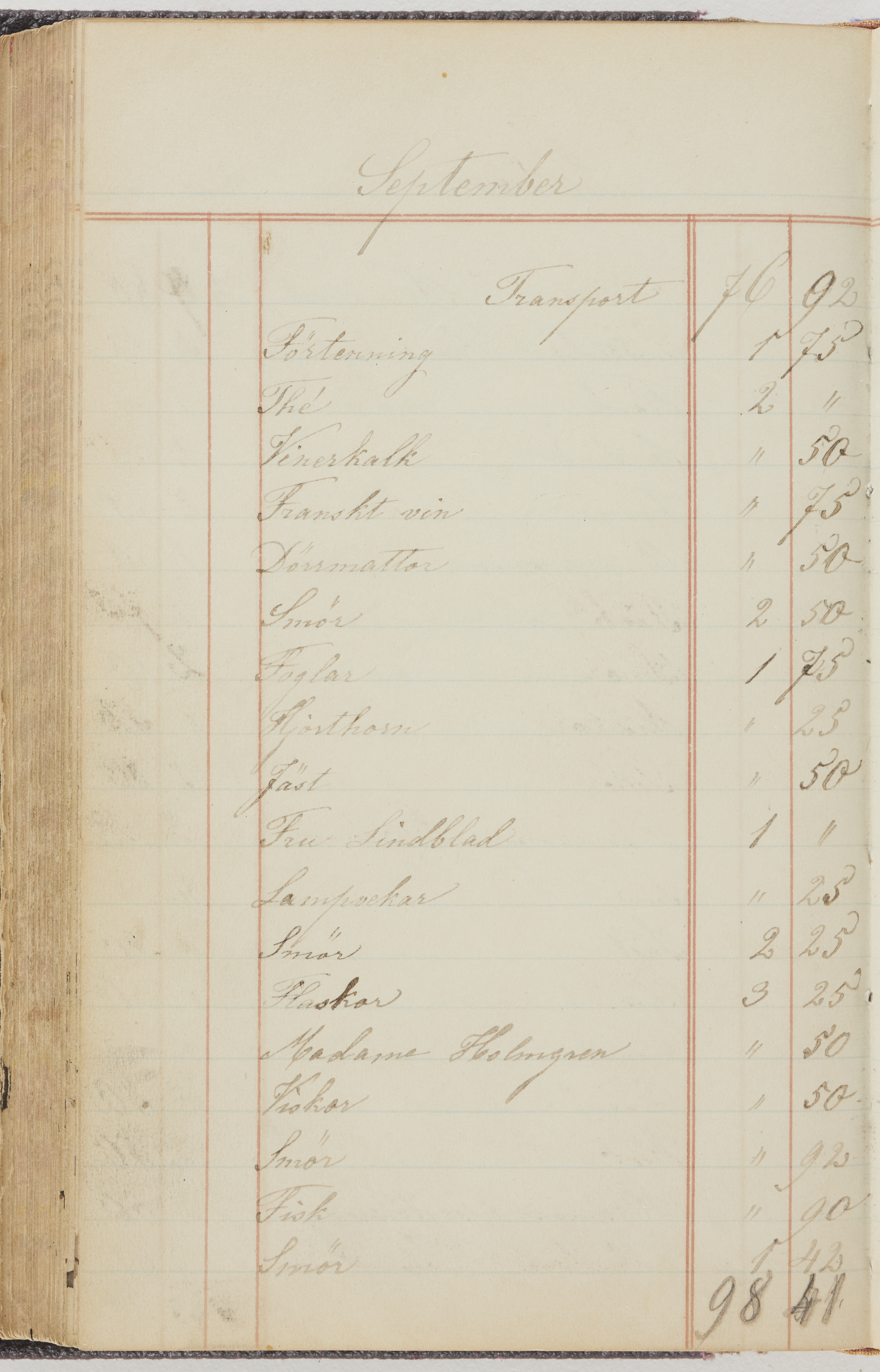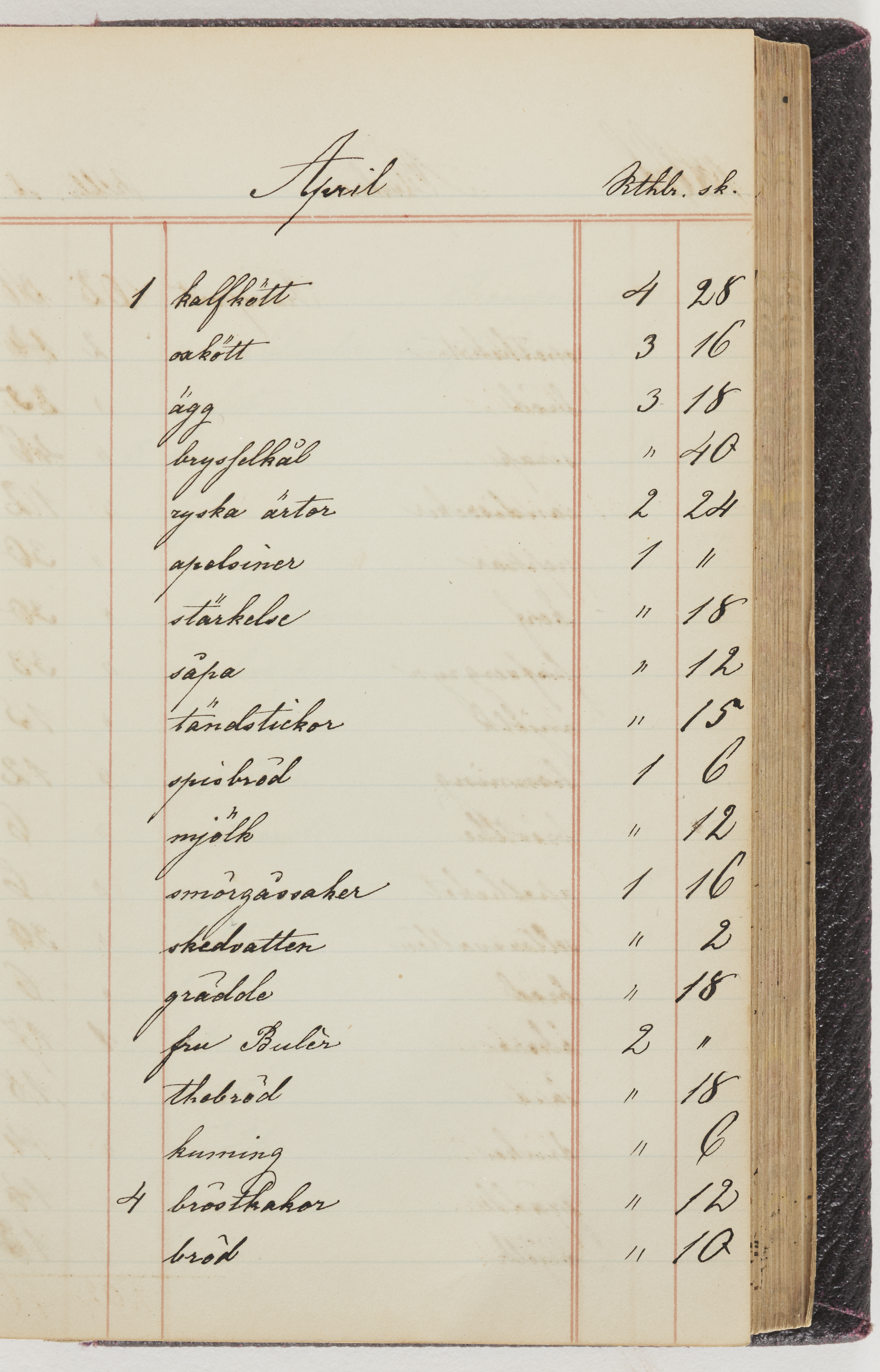 Hushållsbok. 10 vol. inb. 8:0. 1865-1872. 372 s. 1872. 134 s. 1886-1890. 582 s. 1891-1896. 572 s. 1897-1903. 610 s. 1904-1910. 606 s. 1911-1917. 612 s. 1918-1923. 586 s. 1924-1929. 608 s. 1930. 608 s. Skrivna av W. v. H. f. K. Vol. 4-8. Helt band av brunt (vol. 4 och 5) och svart (vol. 6-8) pressad klot. Linjeramar i blindtryck på pärmarna. Kapitel av gult skinn i vol. 4, av tyg i vol. 5-8. Marmorerad snitt. Försättsblad av blårutigt papper i vol. 4, av vitt papper i vol. 5, av brun olifant i vol. 6 och 7, av grå olifant i vol. 8. Vol. 9-13. Helt band av mörkblå klot, bundet med dubbel ansättning och knäpprygg. Kapitel av gult skinn. Marmorerad snitt. Försättsblad av belgisk marmor. i vol. 9, av ljusblått marmorellapapper i de övriga volymerna. Nedtill i vol. 10 och 13 Gust. Hedberges frimamärke i blått.