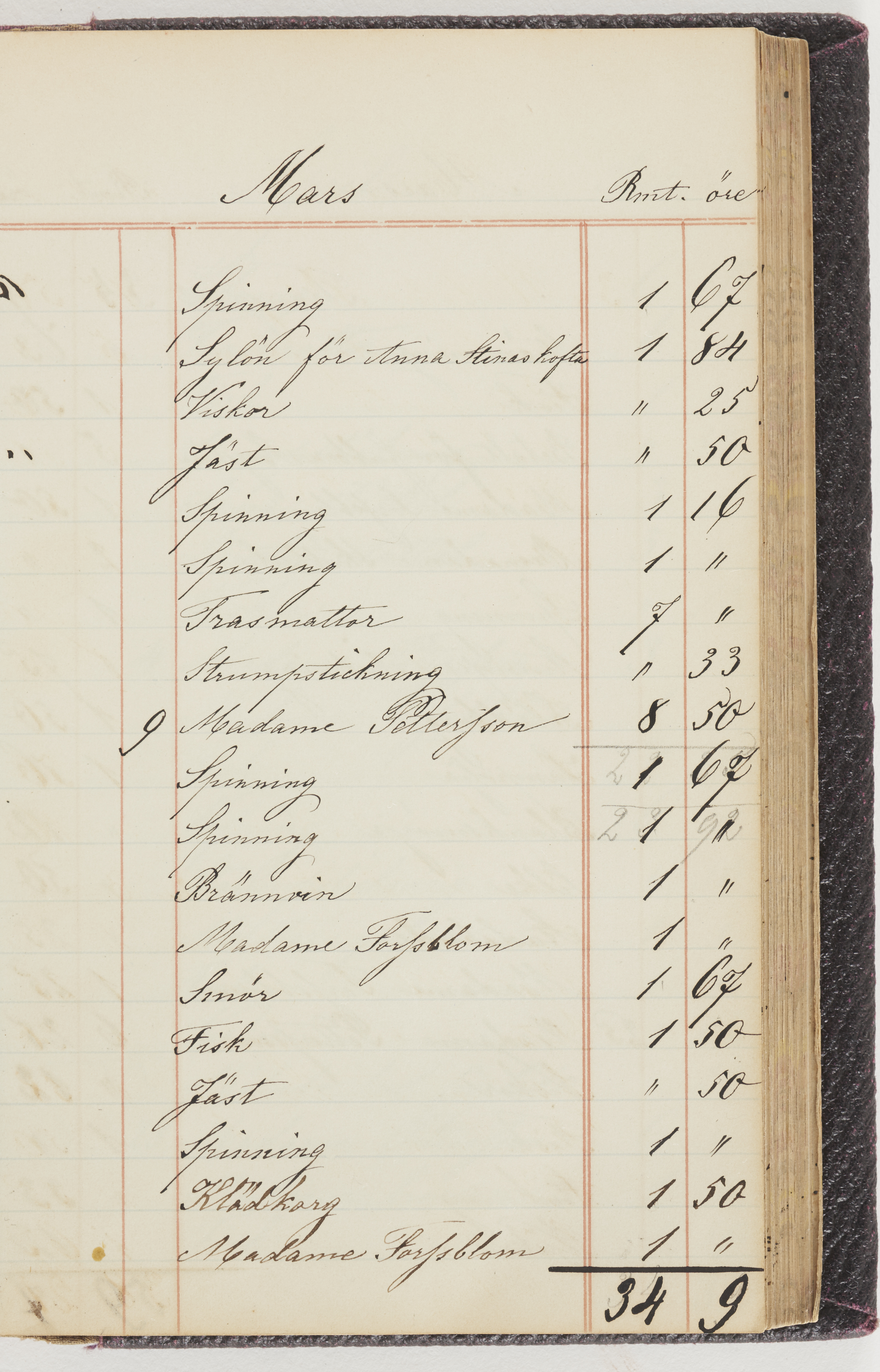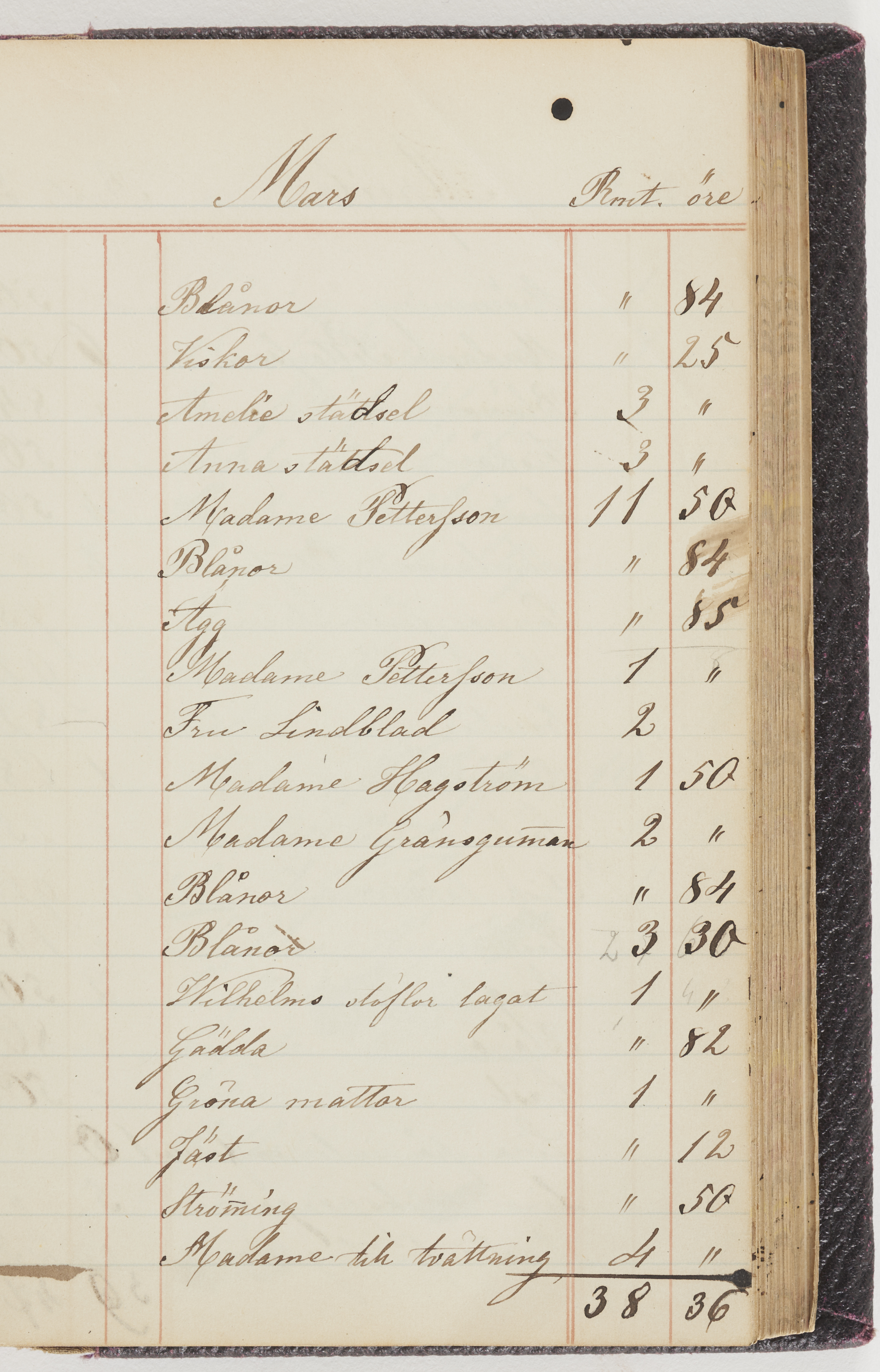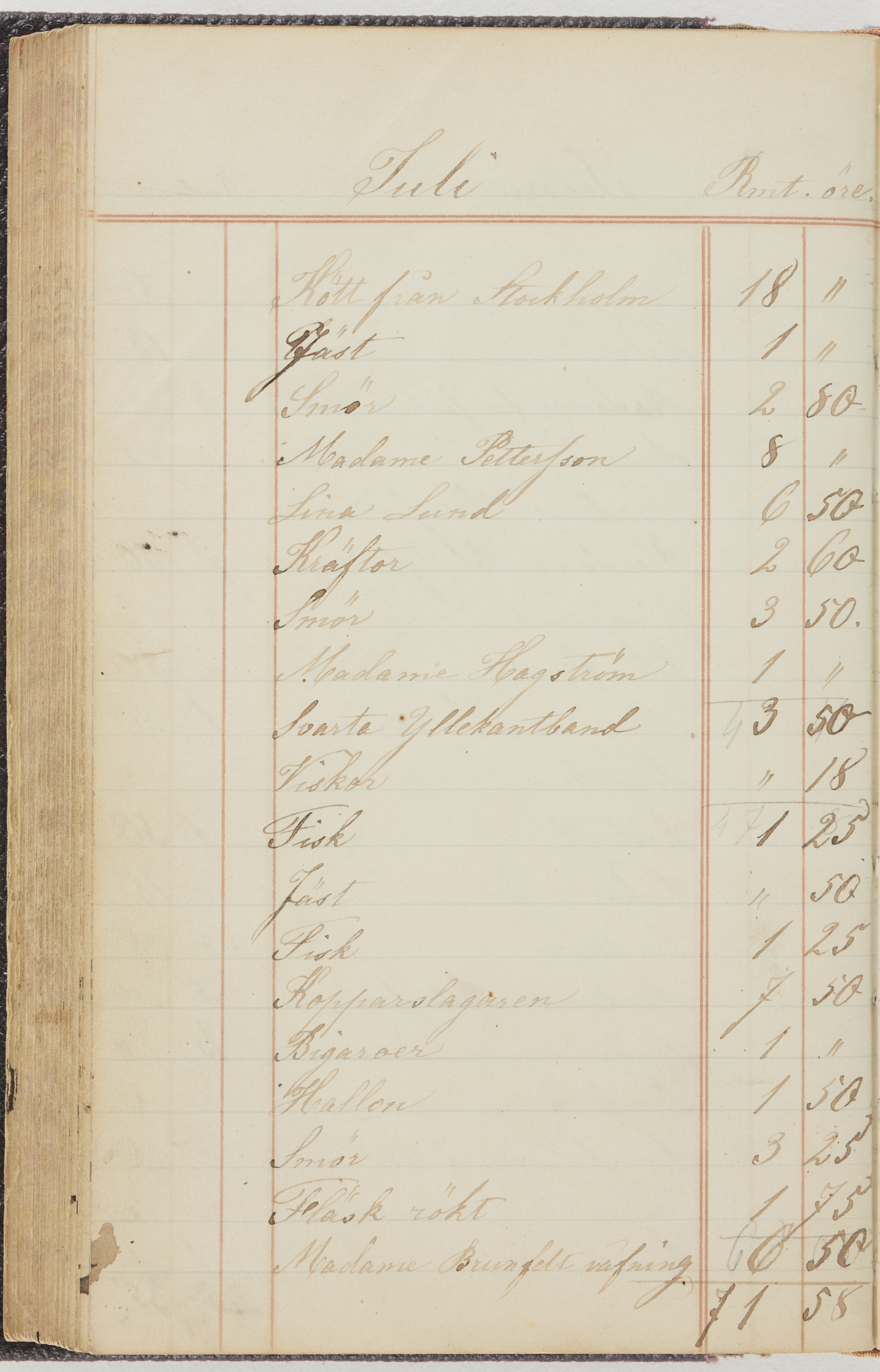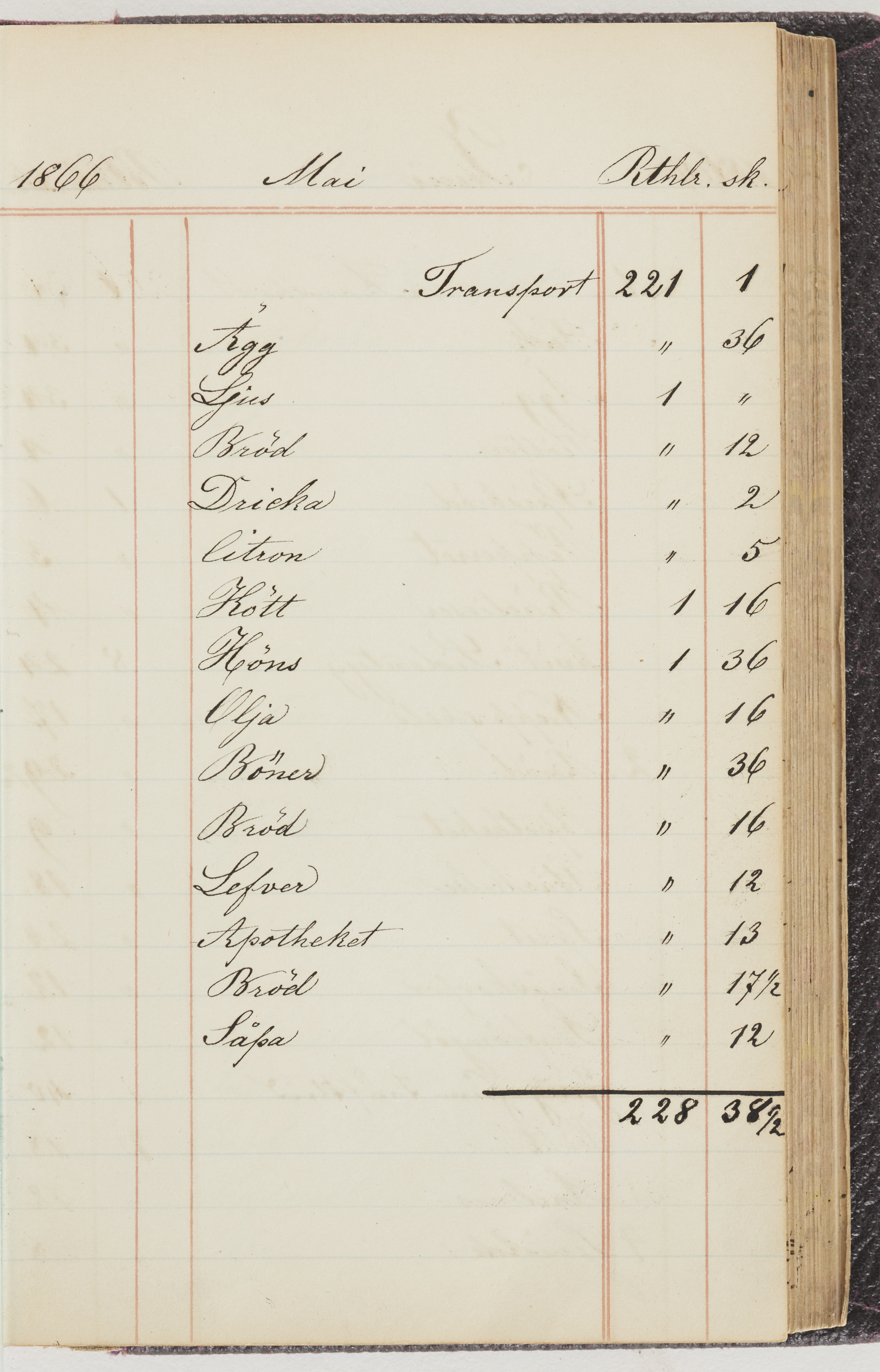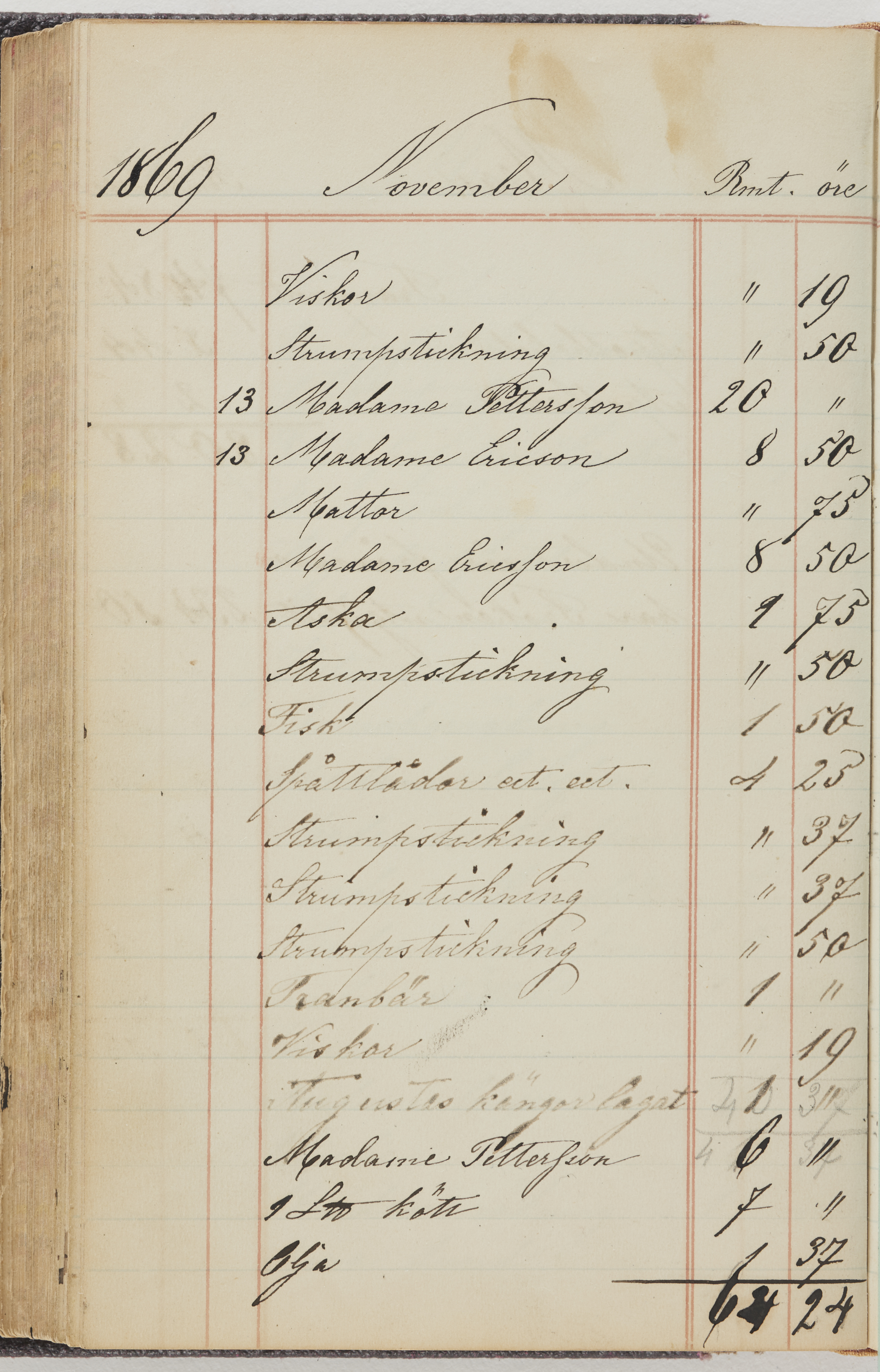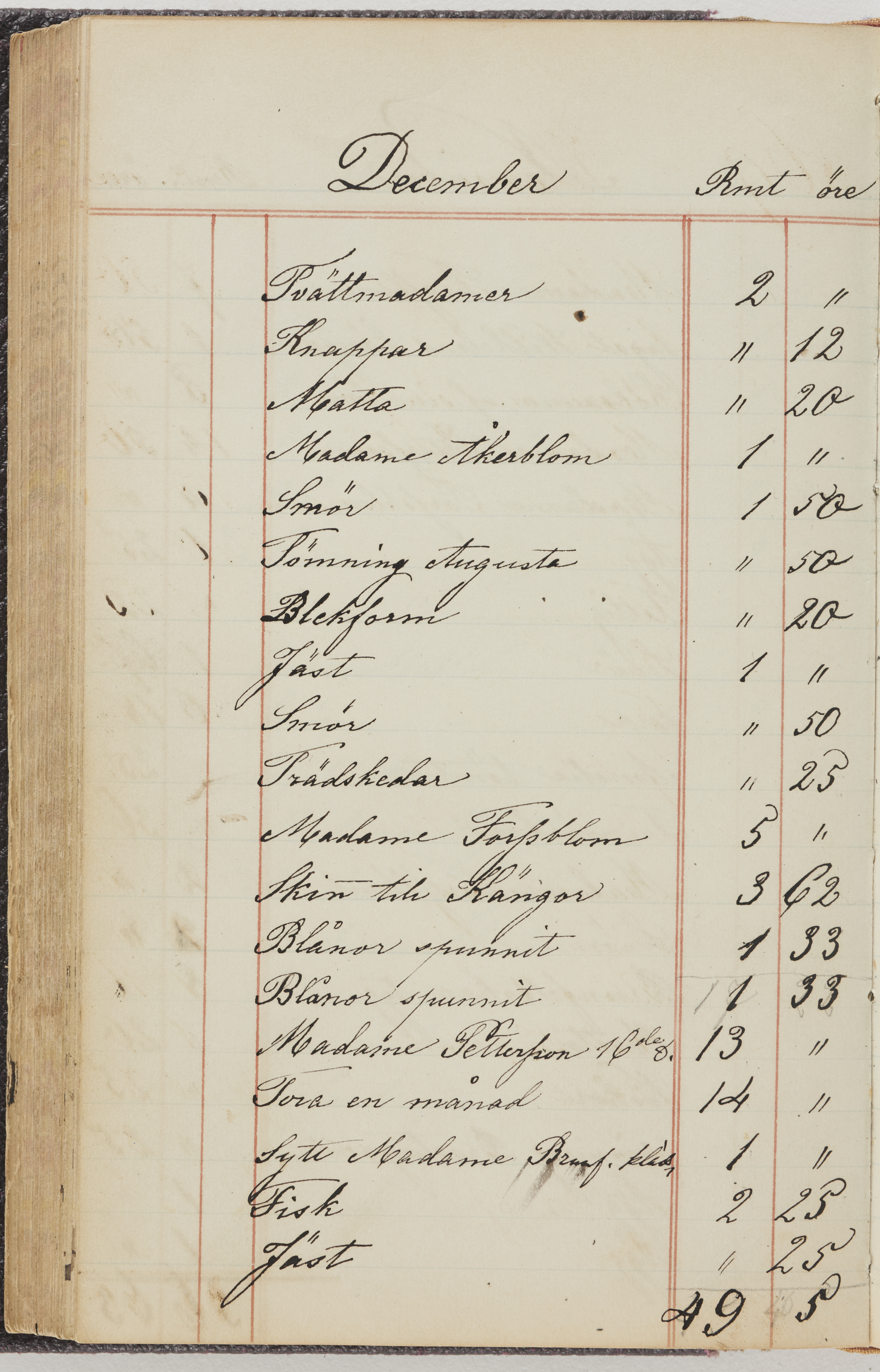 Hushållsbok. 10 vol. inb. 8:0. 1865-1872. 372 s. 1872. 134 s. 1886-1890. 582 s. 1891-1896. 572 s. 1897-1903. 610 s. 1904-1910. 606 s. 1911-1917. 612 s. 1918-1923. 586 s. 1924-1929. 608 s. 1930. 608 s. Skrivna av W. v. H. f. K. Vol. 4-8. Helt band av brunt (vol. 4 och 5) och svart (vol. 6-8) pressad klot. Linjeramar i blindtryck på pärmarna. Kapitel av gult skinn i vol. 4, av tyg i vol. 5-8. Marmorerad snitt. Försättsblad av blårutigt papper i vol. 4, av vitt papper i vol. 5, av brun olifant i vol. 6 och 7, av grå olifant i vol. 8. Vol. 9-13. Helt band av mörkblå klot, bundet med dubbel ansättning och knäpprygg. Kapitel av gult skinn. Marmorerad snitt. Försättsblad av belgisk marmor. i vol. 9, av ljusblått marmorellapapper i de övriga volymerna. Nedtill i vol. 10 och 13 Gust. Hedberges frimamärke i blått.