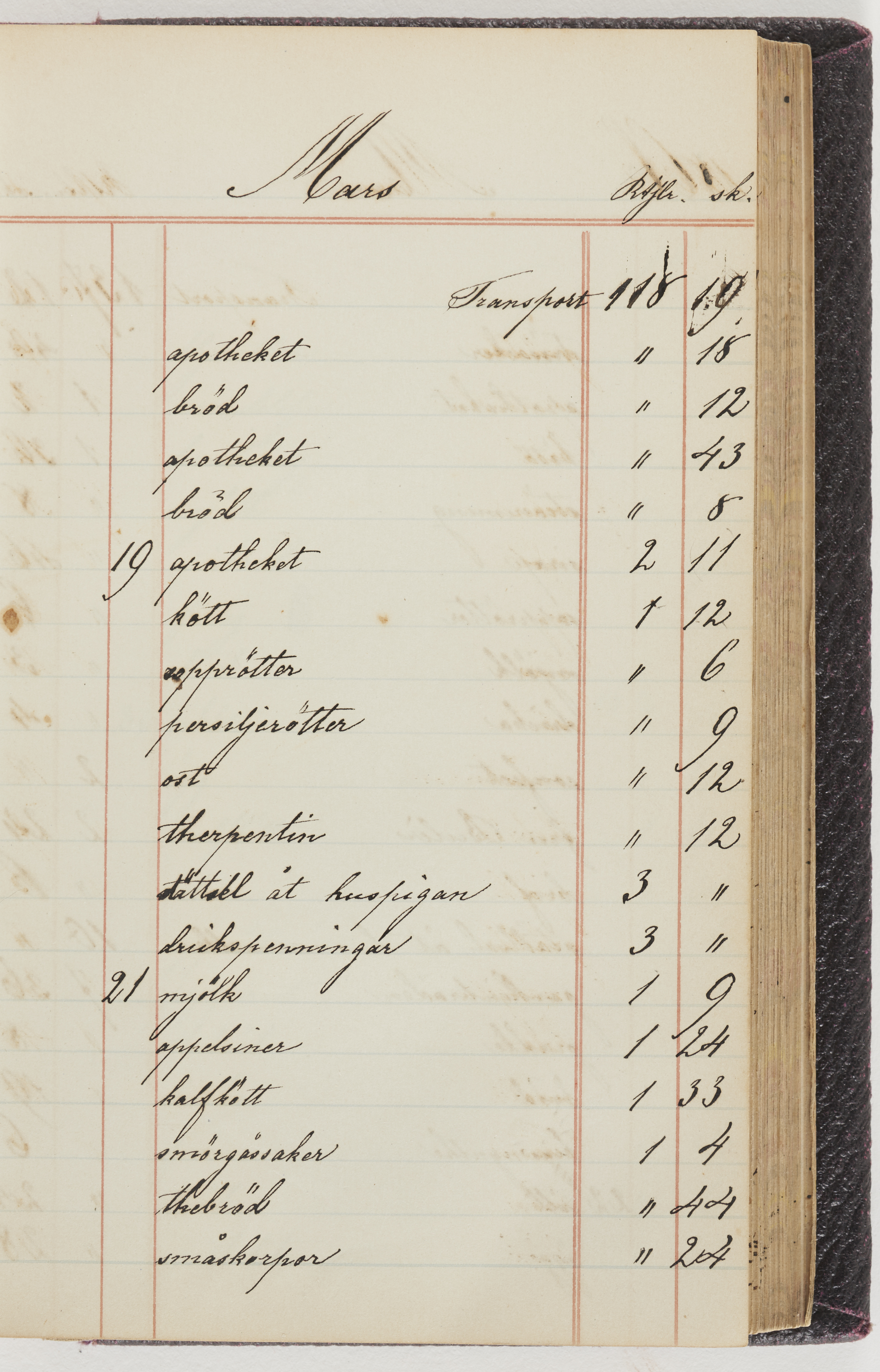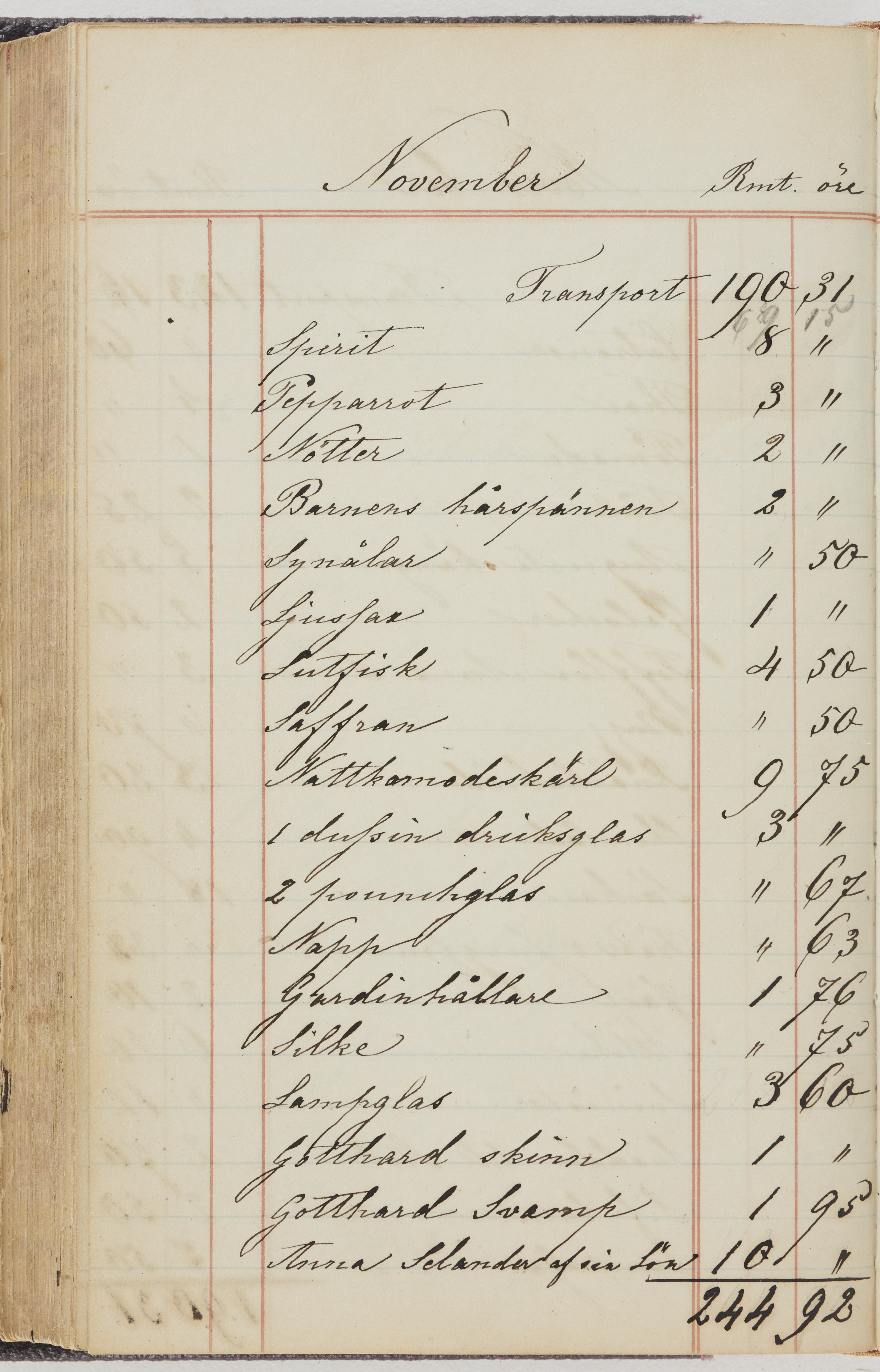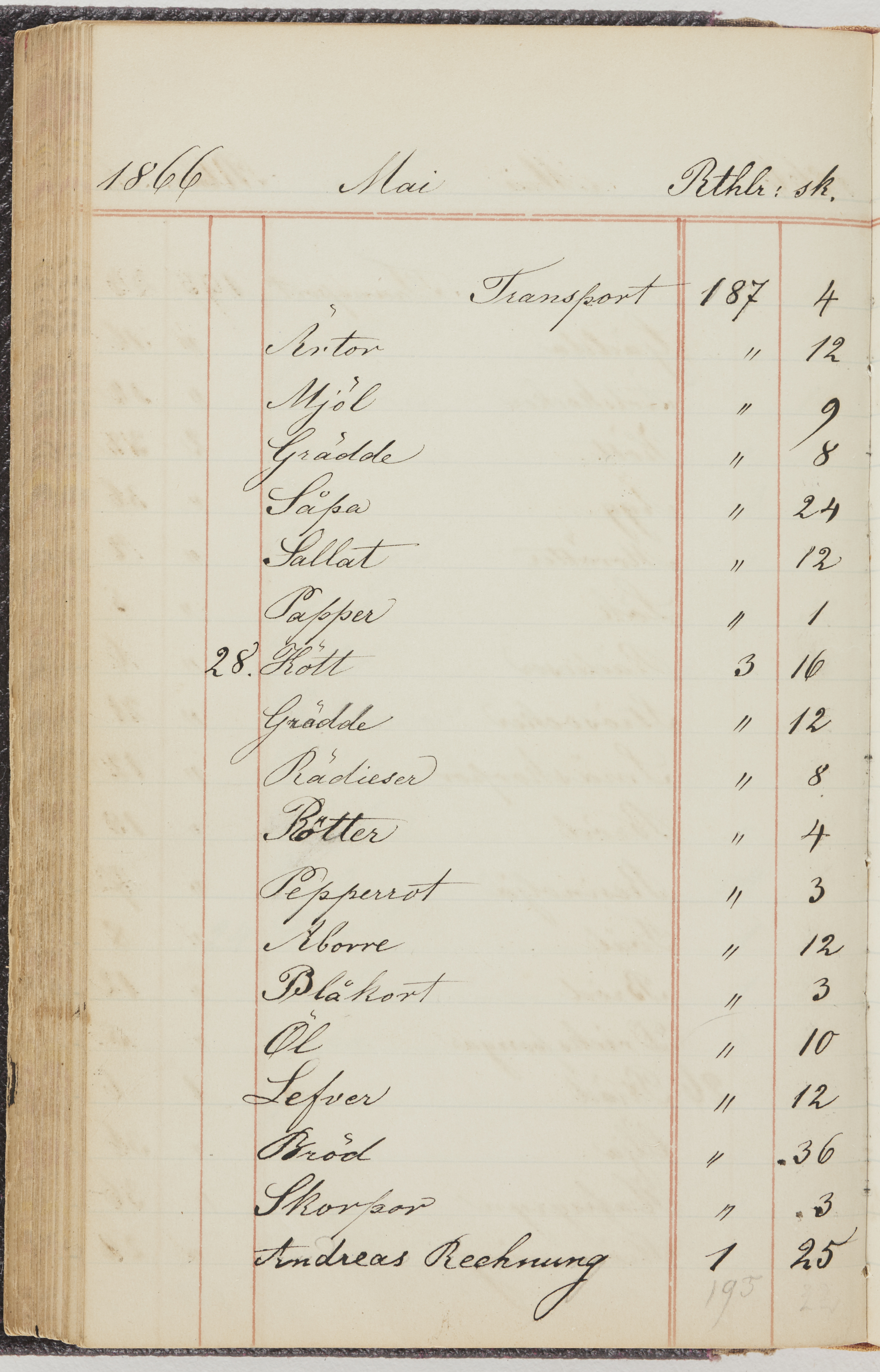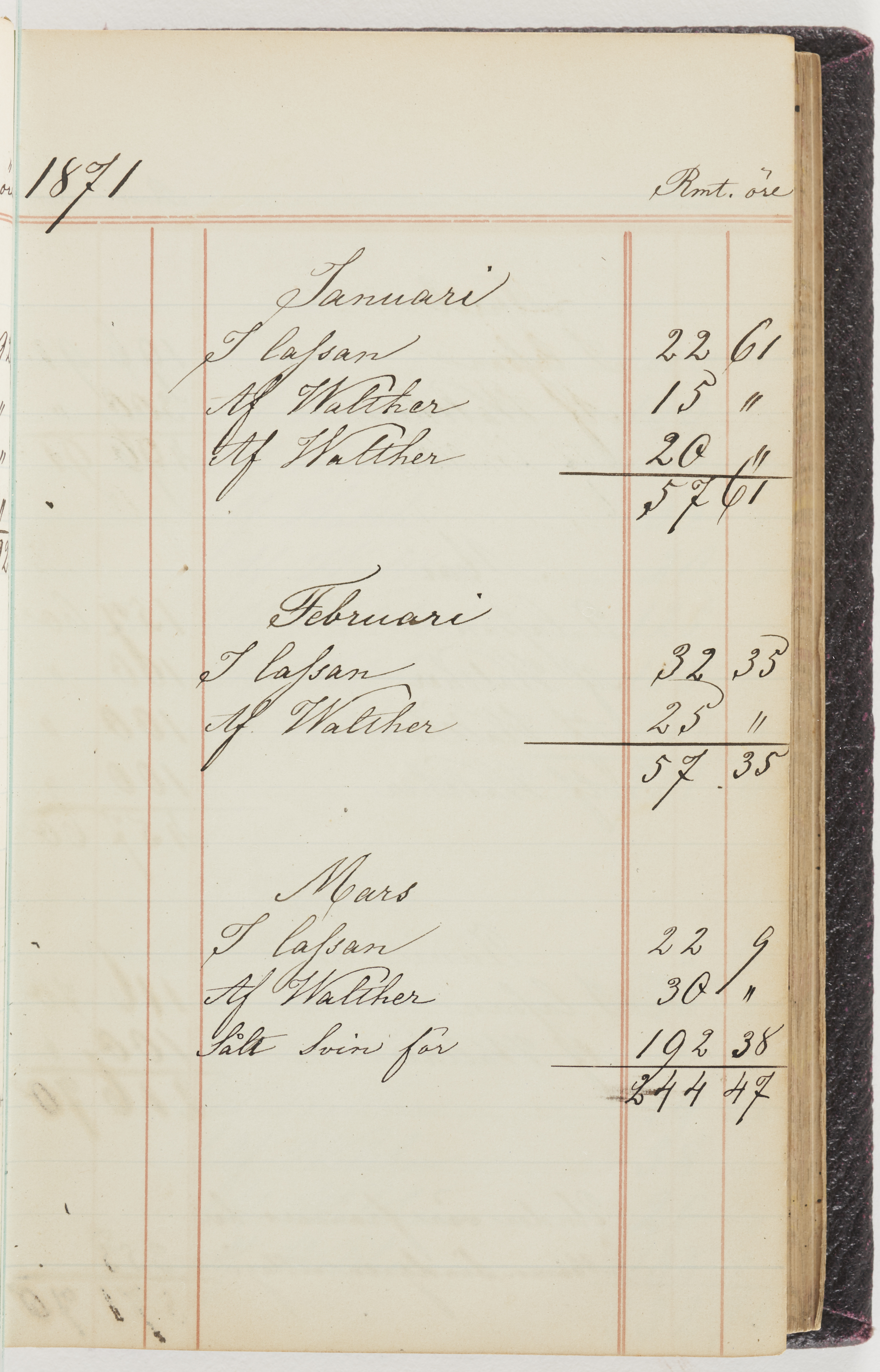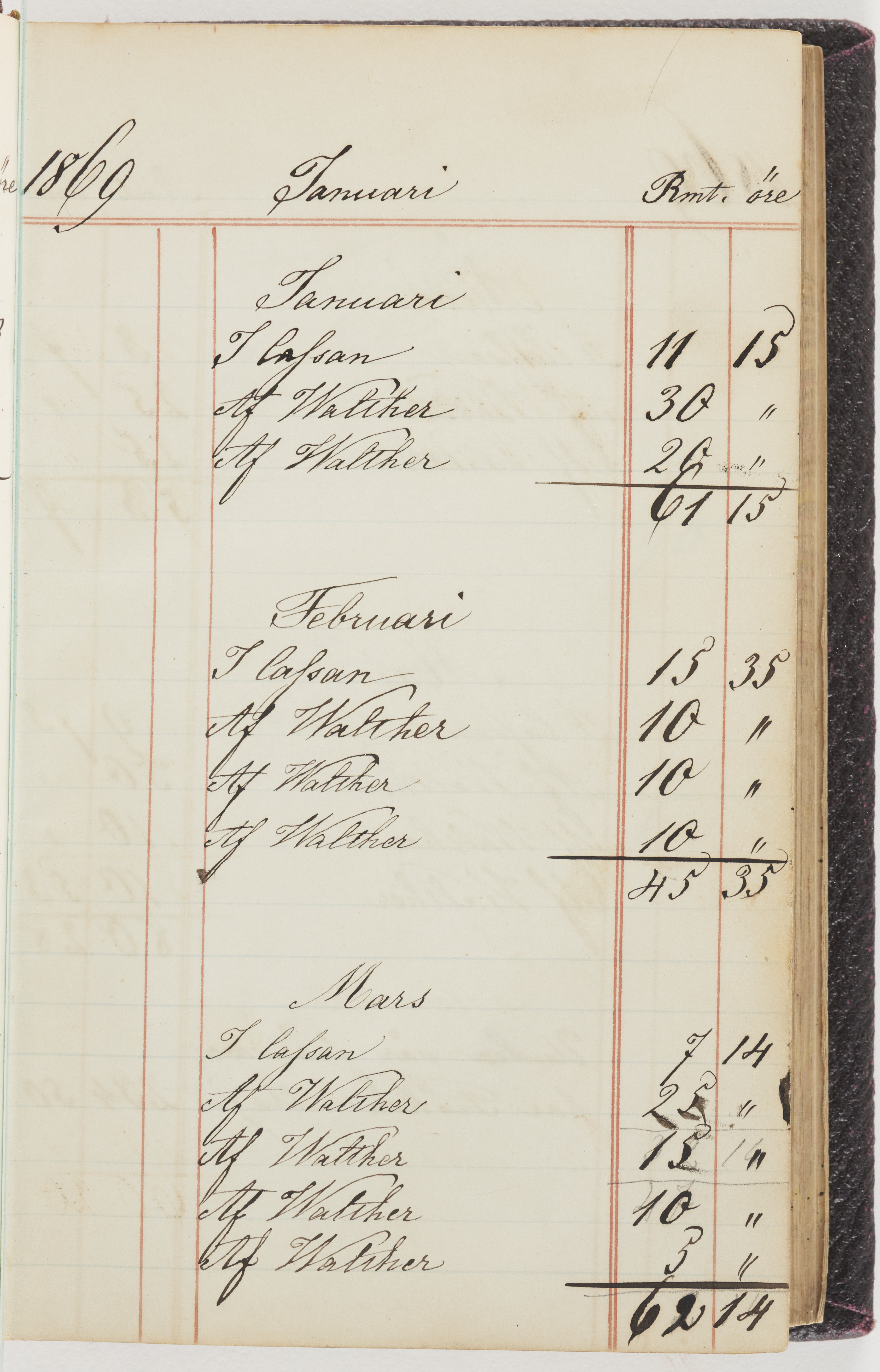 Hushållsbok. 10 vol. inb. 8:0. 1865-1872. 372 s. 1872. 134 s. 1886-1890. 582 s. 1891-1896. 572 s. 1897-1903. 610 s. 1904-1910. 606 s. 1911-1917. 612 s. 1918-1923. 586 s. 1924-1929. 608 s. 1930. 608 s. Skrivna av W. v. H. f. K. Vol. 4-8. Helt band av brunt (vol. 4 och 5) och svart (vol. 6-8) pressad klot. Linjeramar i blindtryck på pärmarna. Kapitel av gult skinn i vol. 4, av tyg i vol. 5-8. Marmorerad snitt. Försättsblad av blårutigt papper i vol. 4, av vitt papper i vol. 5, av brun olifant i vol. 6 och 7, av grå olifant i vol. 8. Vol. 9-13. Helt band av mörkblå klot, bundet med dubbel ansättning och knäpprygg. Kapitel av gult skinn. Marmorerad snitt. Försättsblad av belgisk marmor. i vol. 9, av ljusblått marmorellapapper i de övriga volymerna. Nedtill i vol. 10 och 13 Gust. Hedberges frimamärke i blått.