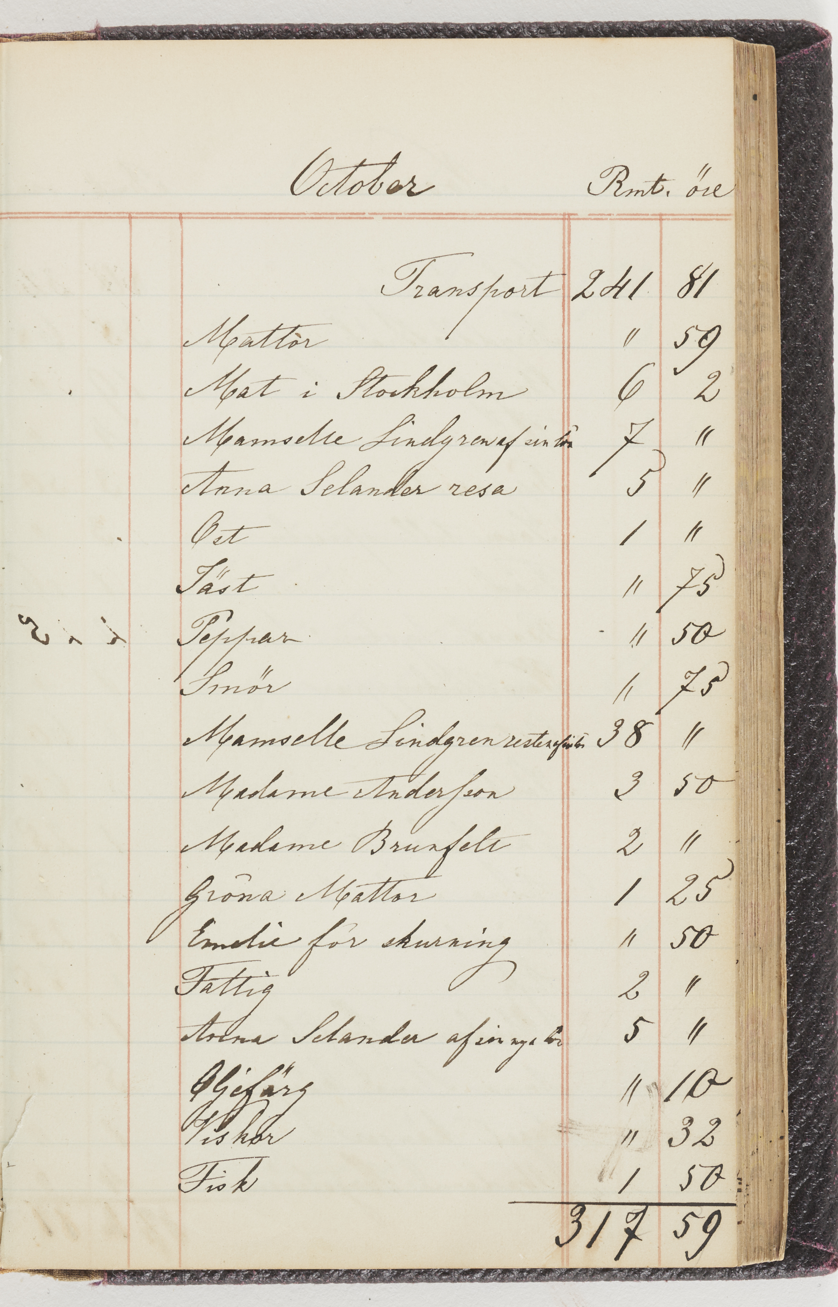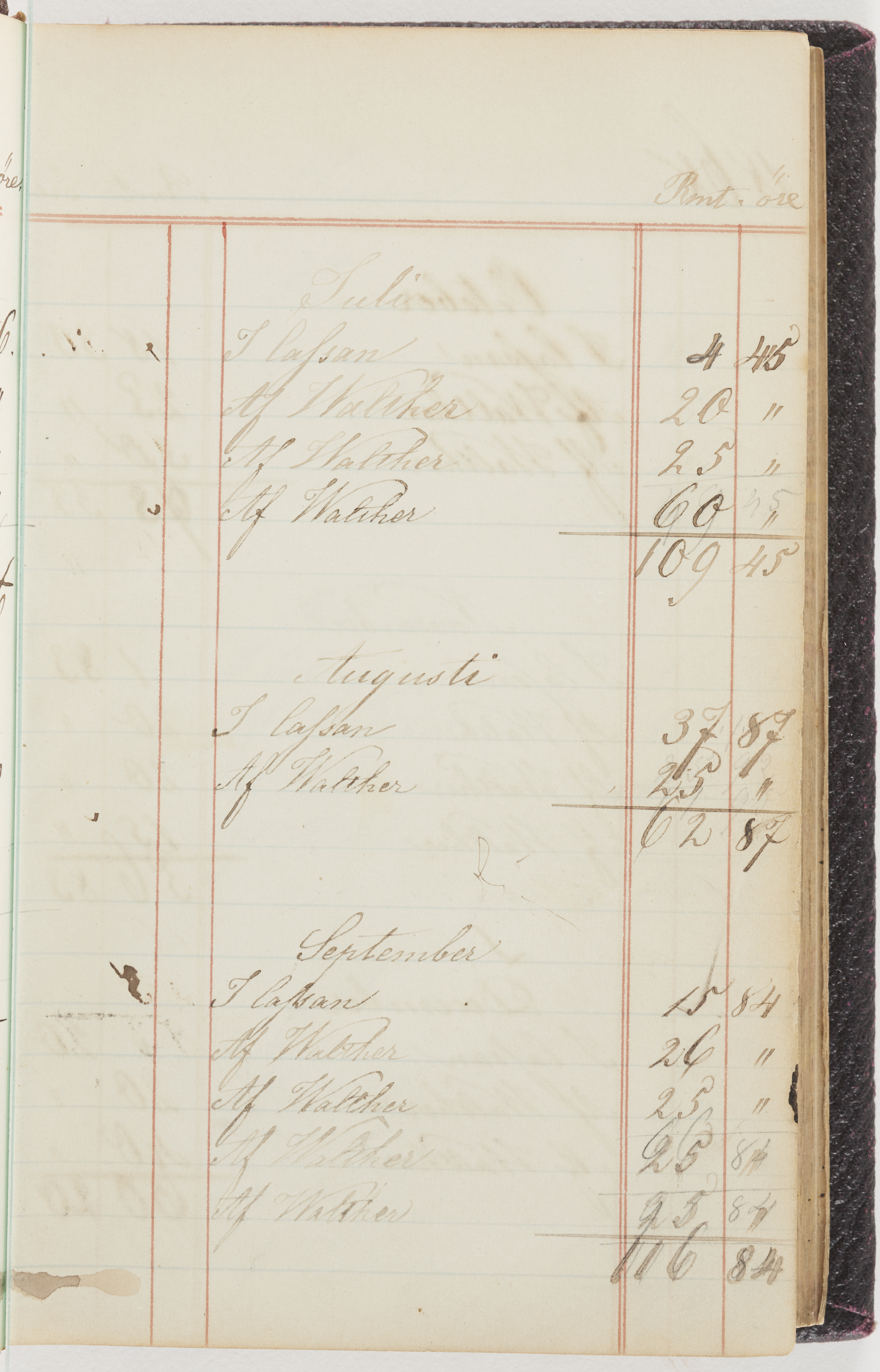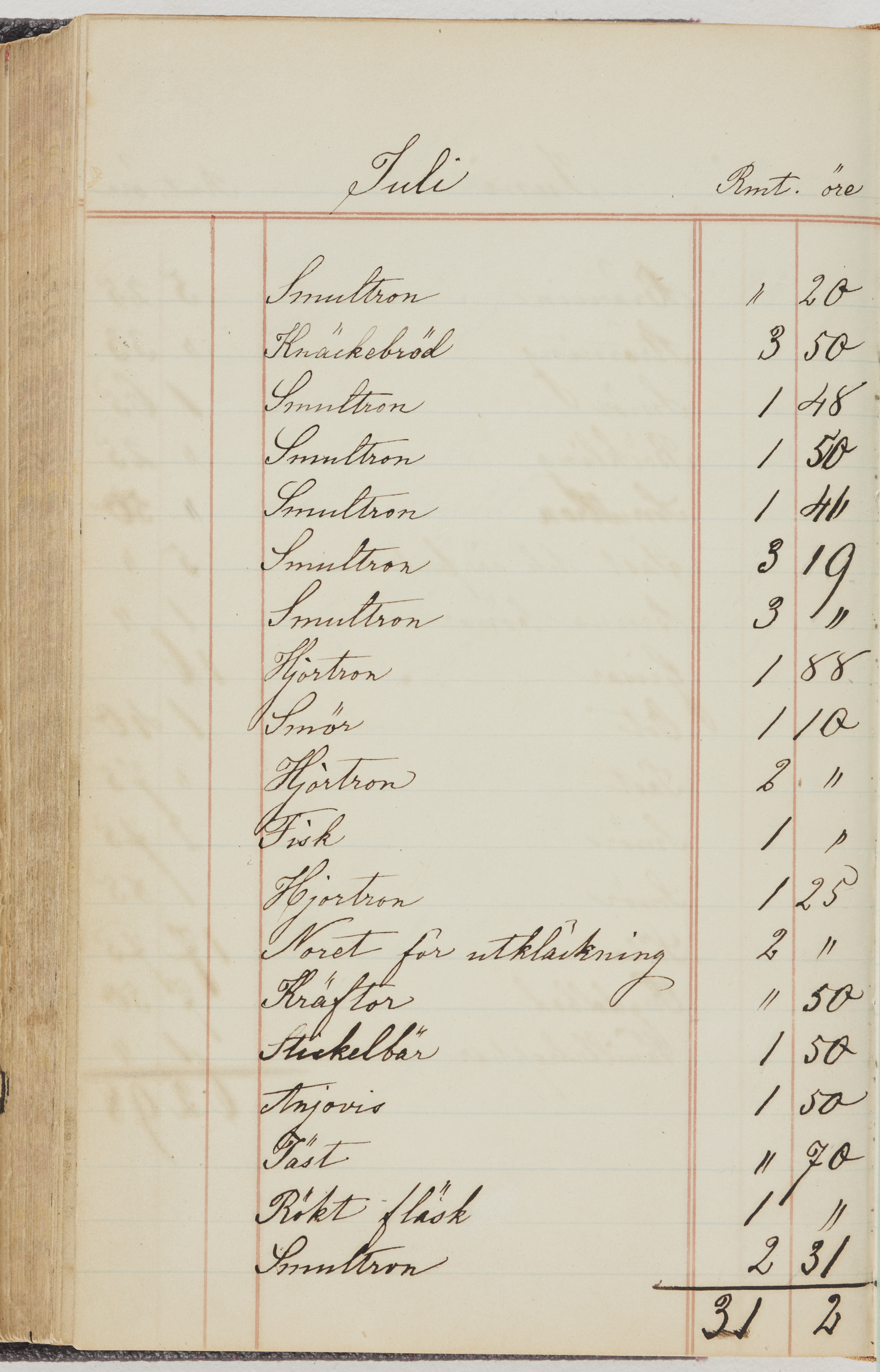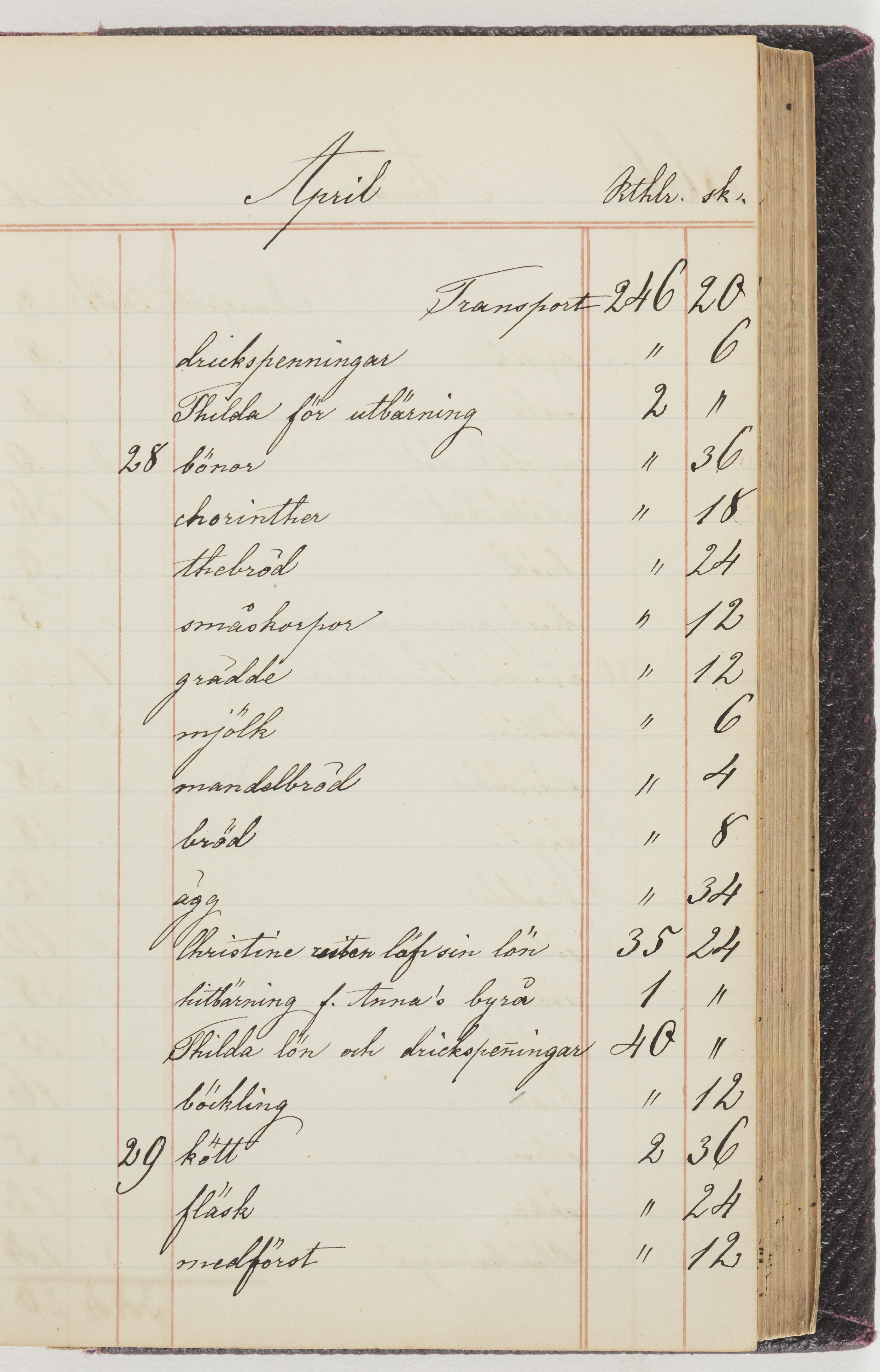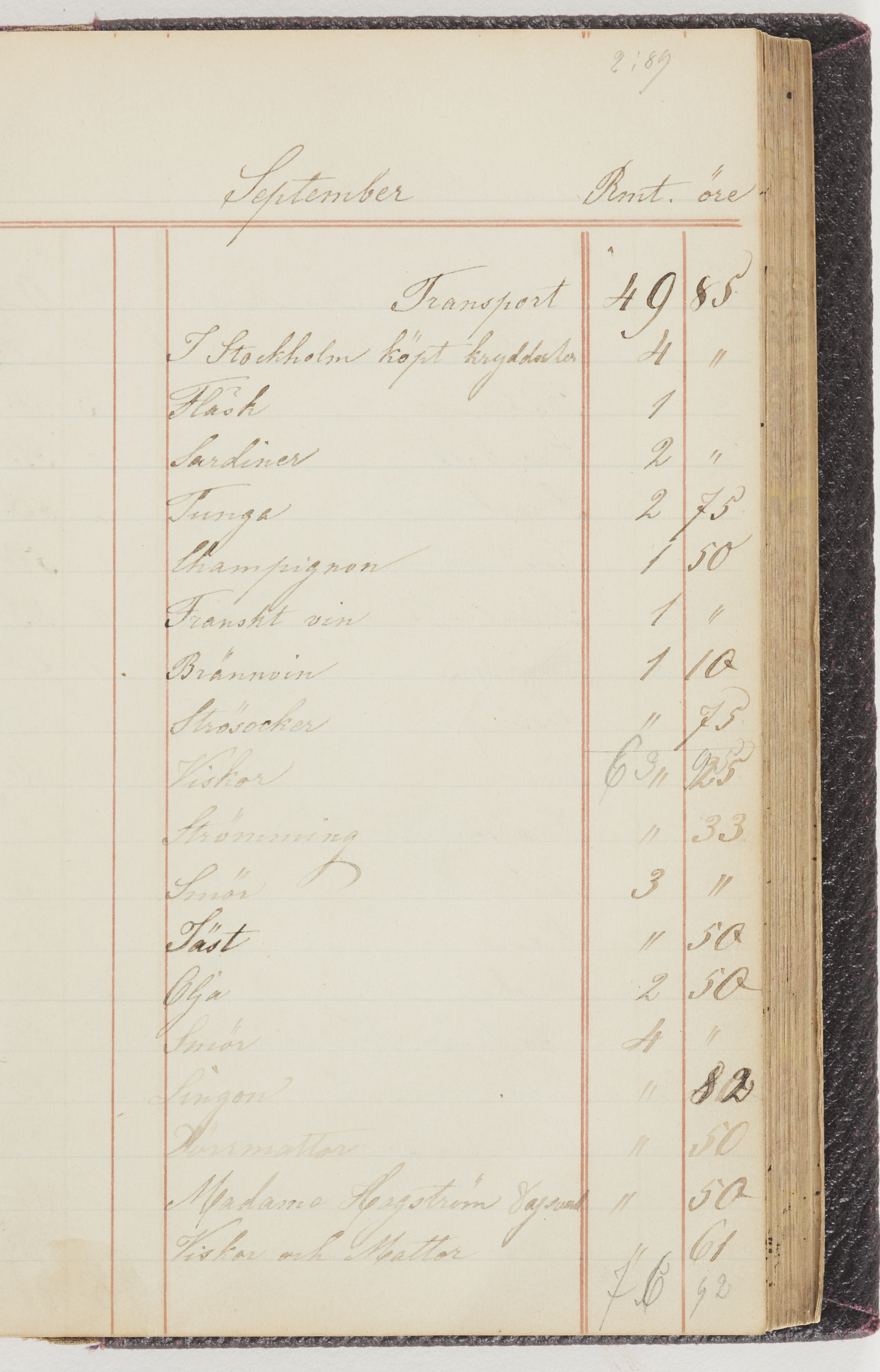 Hushållsbok. 10 vol. inb. 8:0. 1865-1872. 372 s. 1872. 134 s. 1886-1890. 582 s. 1891-1896. 572 s. 1897-1903. 610 s. 1904-1910. 606 s. 1911-1917. 612 s. 1918-1923. 586 s. 1924-1929. 608 s. 1930. 608 s. Skrivna av W. v. H. f. K. Vol. 4-8. Helt band av brunt (vol. 4 och 5) och svart (vol. 6-8) pressad klot. Linjeramar i blindtryck på pärmarna. Kapitel av gult skinn i vol. 4, av tyg i vol. 5-8. Marmorerad snitt. Försättsblad av blårutigt papper i vol. 4, av vitt papper i vol. 5, av brun olifant i vol. 6 och 7, av grå olifant i vol. 8. Vol. 9-13. Helt band av mörkblå klot, bundet med dubbel ansättning och knäpprygg. Kapitel av gult skinn. Marmorerad snitt. Försättsblad av belgisk marmor. i vol. 9, av ljusblått marmorellapapper i de övriga volymerna. Nedtill i vol. 10 och 13 Gust. Hedberges frimamärke i blått.