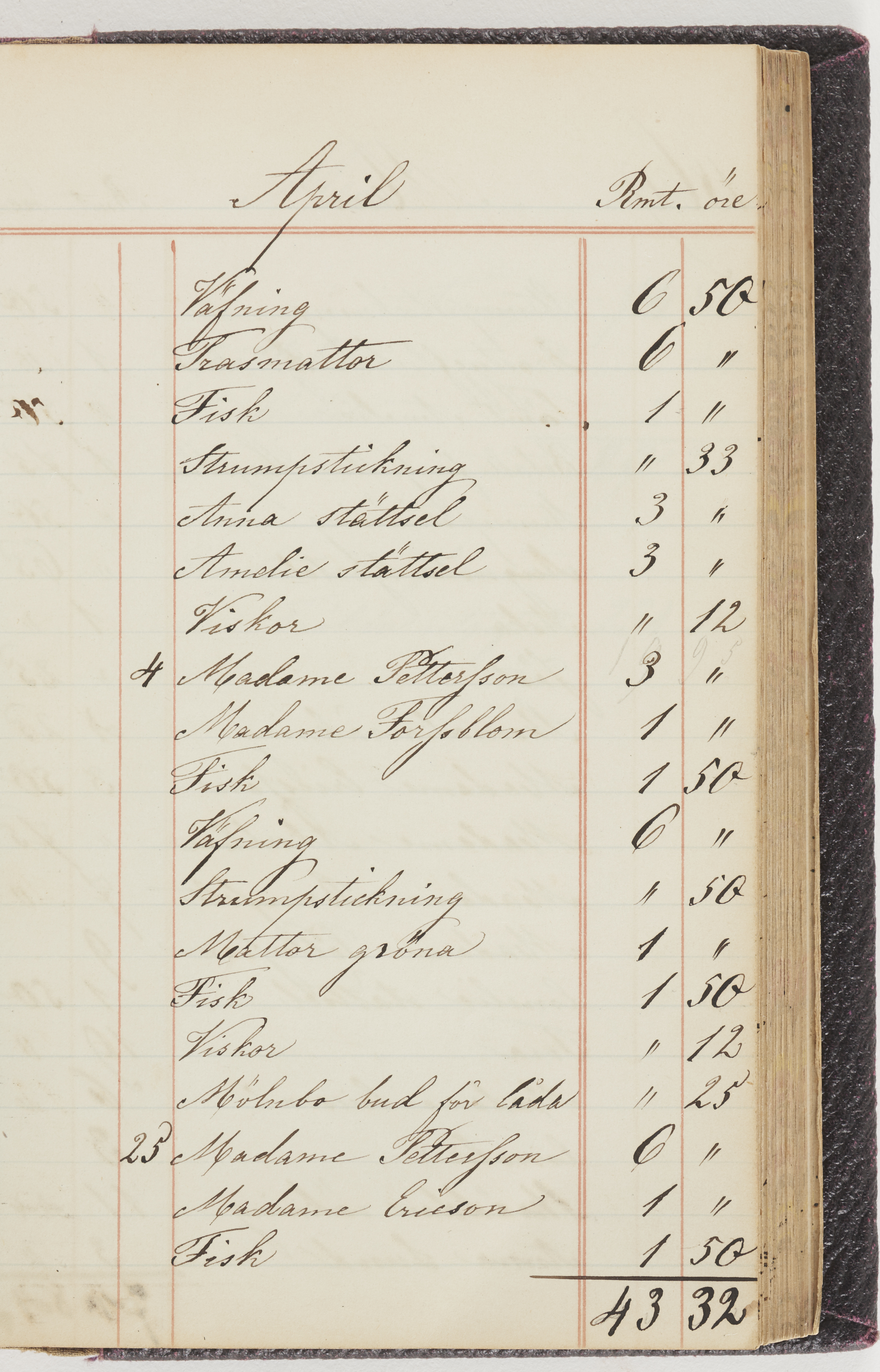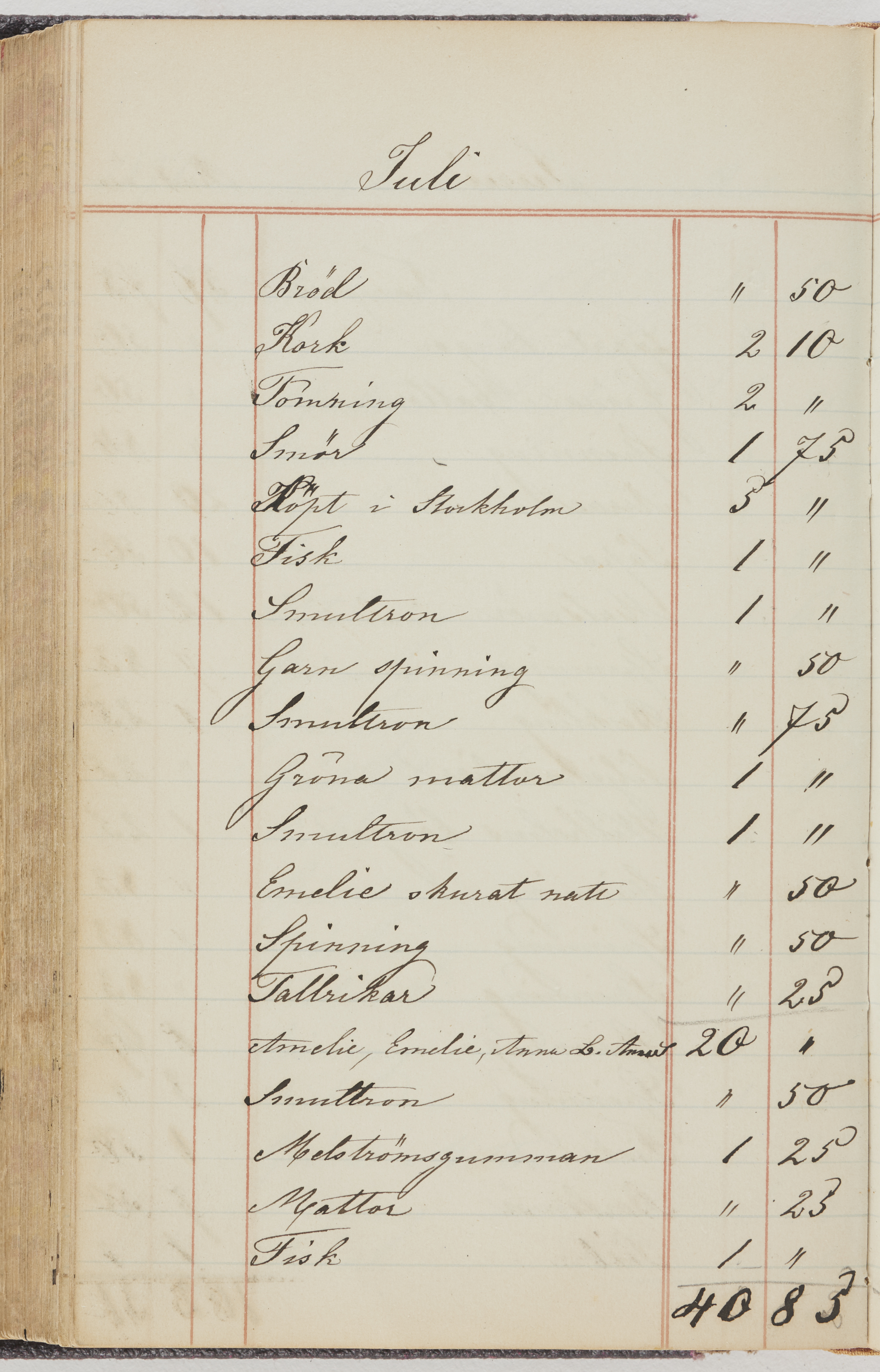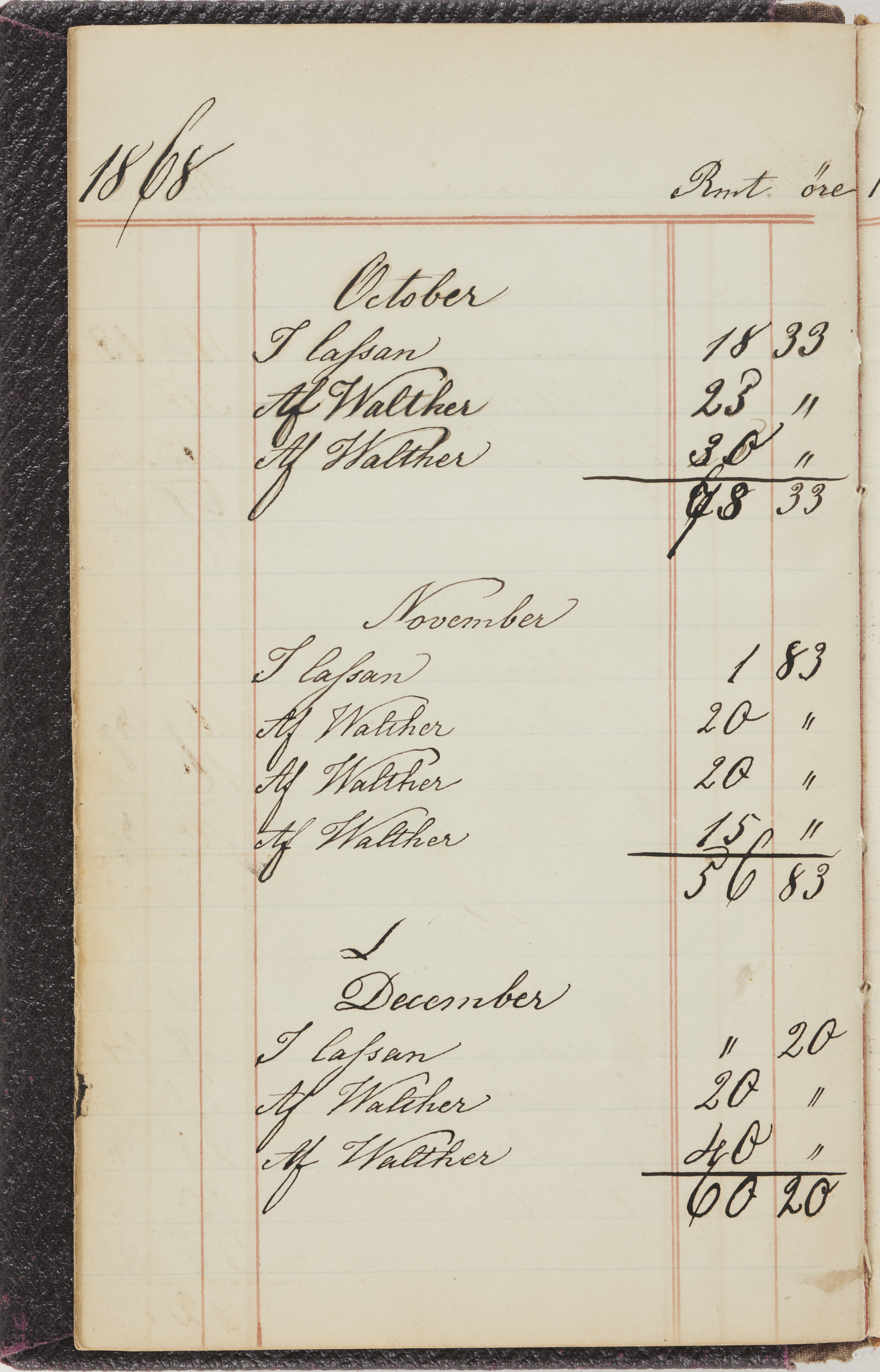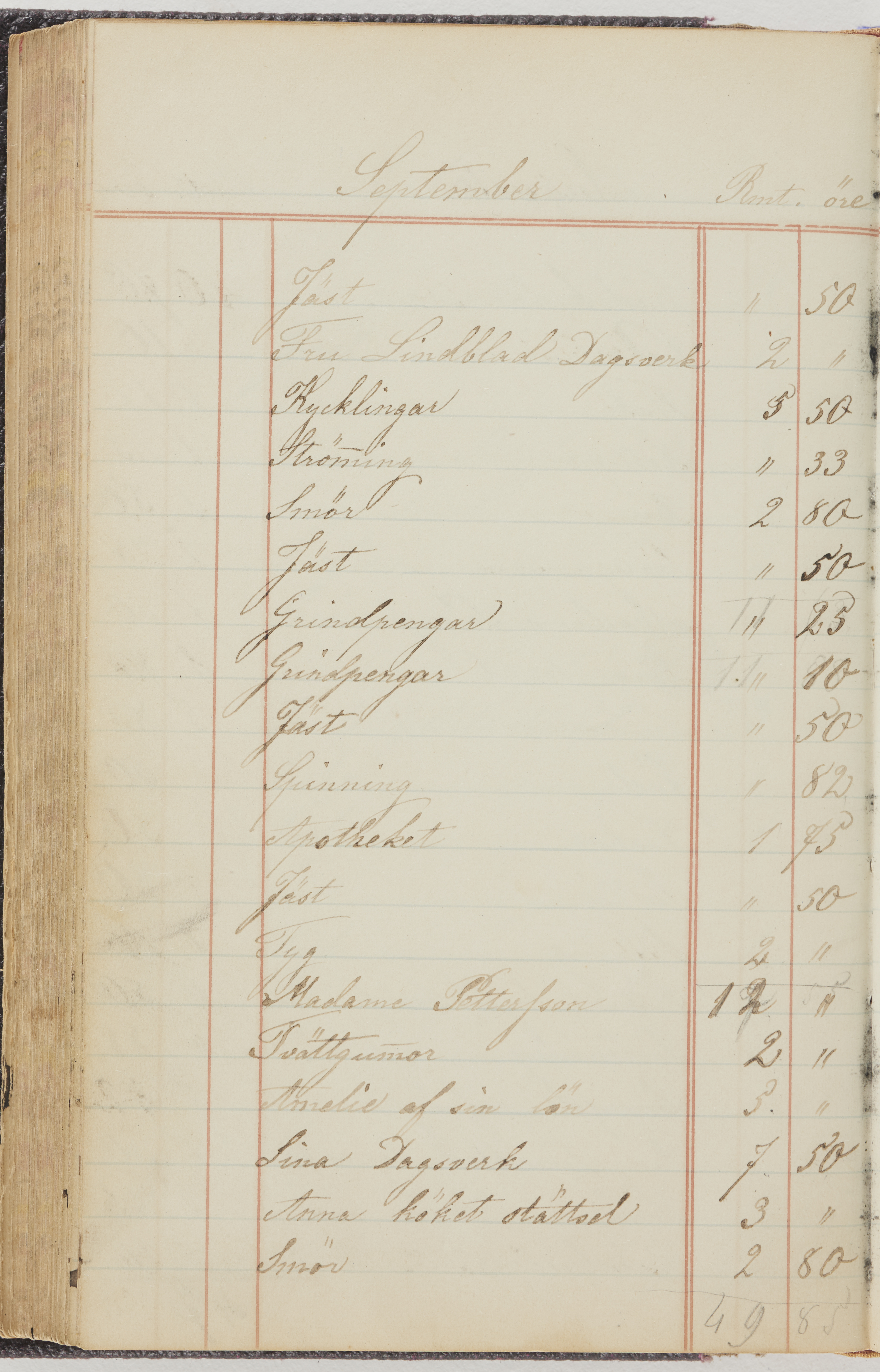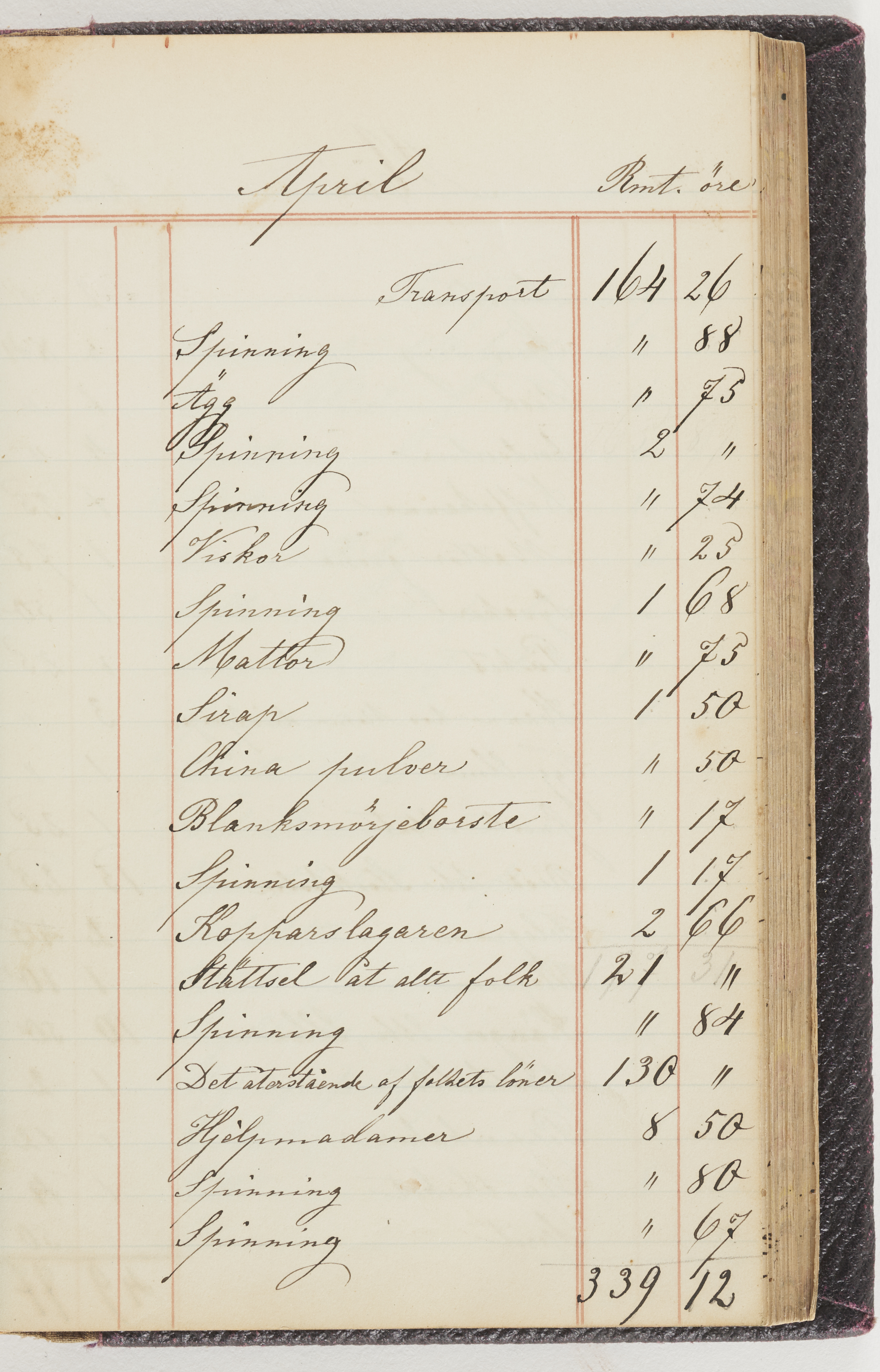 Hushållsbok. 10 vol. inb. 8:0. 1865-1872. 372 s. 1872. 134 s. 1886-1890. 582 s. 1891-1896. 572 s. 1897-1903. 610 s. 1904-1910. 606 s. 1911-1917. 612 s. 1918-1923. 586 s. 1924-1929. 608 s. 1930. 608 s. Skrivna av W. v. H. f. K. Vol. 4-8. Helt band av brunt (vol. 4 och 5) och svart (vol. 6-8) pressad klot. Linjeramar i blindtryck på pärmarna. Kapitel av gult skinn i vol. 4, av tyg i vol. 5-8. Marmorerad snitt. Försättsblad av blårutigt papper i vol. 4, av vitt papper i vol. 5, av brun olifant i vol. 6 och 7, av grå olifant i vol. 8. Vol. 9-13. Helt band av mörkblå klot, bundet med dubbel ansättning och knäpprygg. Kapitel av gult skinn. Marmorerad snitt. Försättsblad av belgisk marmor. i vol. 9, av ljusblått marmorellapapper i de övriga volymerna. Nedtill i vol. 10 och 13 Gust. Hedberges frimamärke i blått.