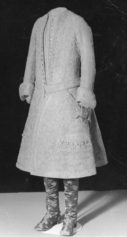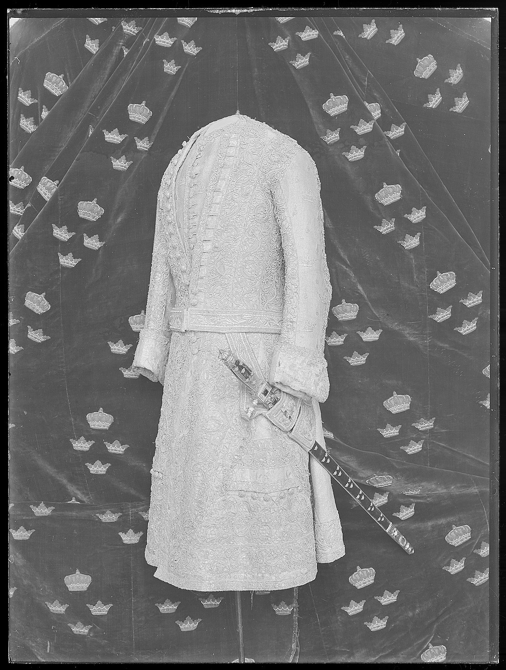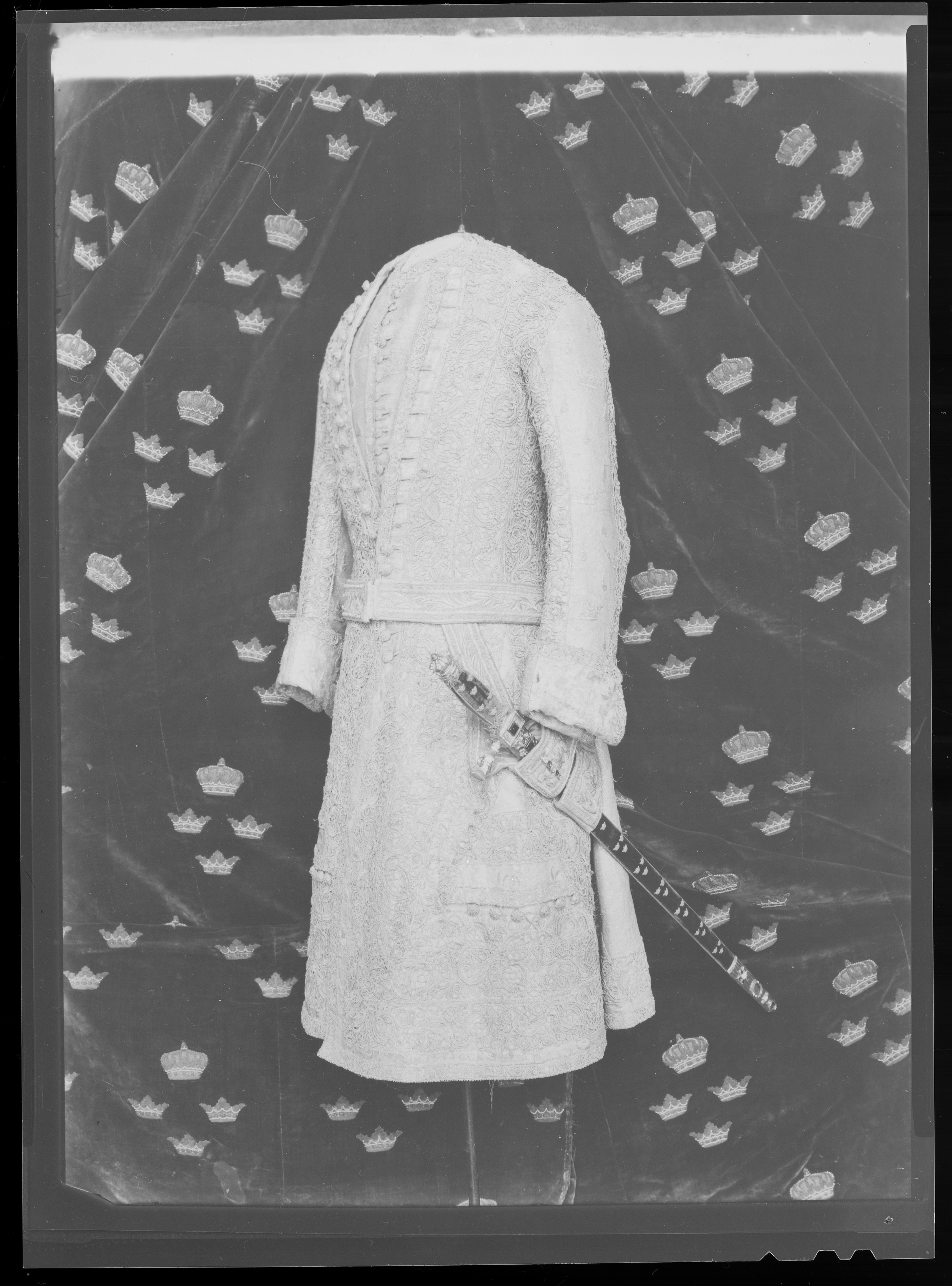 Använd vid kröningen den 29 maj 1772. Rocken är en justaucorps med ovanligt stora skörtstycken med sidsprund och sprund mitt bak. Framlinjen ändrar riktning markant nedanför midjan i en båge, likaså sidsömmarna är kraftigt utåtvinklade och även mitt bak gör sömmen en puta utåt. Ärmarna är i två stycken och relativt smala och svängda med breda manchetter. Point d'Espagne spets täcker i stort sett hela plagget, utom på ryggen där tyget på vissa ställen lämnats bara. Tyget är en silverbrokad vävd med silke och silvertrådar och ett broscherad mönster av kronor och flammor. Bottentyget är svårt att urskilja eftersom nästan hela plagget är spetsöverklätt. En våd som är 50 cm bred rymmer tre kronor i bredd och det verkar som om tyget delvis är vävt med en mönstervävd bård. Drygt 2 cm från kanten nedtill och från kanten mitt fram har lämnats en drygt 2 cm bred remsa där tyget inte är spetsklätt. Där tyget lämnats oklätt på detta vis syns bårdens mönster, utom i de kraftigt utställda sidorna där man fällt in kilar som saknar denna bård. Längs framkanten har ett parti med bård fällts in i bottentyget, skarvarna dols nästan helt av spetsarna. Längs med sprundet mitt bak syns också denna bård på motsvarande oklädda yta. Här är den inte infälld vilket visar att tyget är vävt med bård i båda sidorna. Ärmarna har låg ärmisättning och ärmhålen är små och runda. Upptill på ärmarna är tyget skarvat på några ställen med smala kilar, vilket dols helt av spetsdekoren. Manchetterna som är spetskantade är sydda av bården och detta är det enda stället där bårdens barockmösteret framträder tydligt. Rocken har 34 små runda snörmakeriknappar i silvertråd längs h. framkant. 19 st knapphål finns på v. framstycke. Det övertsta 3 cm från halsen och därefter återkommer de med 2-3 cm mellanrum ned till framkantens utåtvinkling. Knappraden fortsätter däremot längre ned. Knapphålen är 6,6 cm långa därav är ca 5 cm uppsprättade. Långt ned på framstyckena finns liggande ficklock som knappast framträder i och med spetsarna.Vid vardera ficklock sitter fem knappar i en rad som gör fickan synlig. De går inte att knäppa i locken, utan är enbart dekoration. I sidsprundet finns fickor. Spetsen är av två storlekar, och det har använts 818 cm av den smala och 2250 cm av den bredare. Tråden verkar grov för tyget och bildar klumpiga hörn där den ändrar riktning. Manchettens översida framtill och mellanrummet i spetgarneringen. Fodret är i silverlamé med invävda ränder i silvertråd. Tillverkare: Tyget och modellen? ritades av Jean Eric Rehn och vävdes av Johan Anders Meurman, Stockholm. Fodret levererades av Ekstedt & Collander. Dräkten syddes av kungens skräddare Peter Rungren. Knapparna tillverkades av E. Sylvin, Stockholm. Point d'Espagne spetsarna beställdes i Berlin, var tillverkades de?? I klädkammarinventariet från 1790 har dräkten nr 114 och beskrivs på följande sätt. Hans. Kongl. Maijs:ts Krönings Drägt bestående af Rock Väst och böxor af Silfvertyg med inväfda Cronor och flammor fordrad med Silvertyg, Rocken rikt utzirad med Silfver spatsar samt med Silfvertråds knappar med tillhörigt LifGehäng Brodderadt silfr. med stora Ägta pärlor. Ett par hvita handskar med silfver spetsar, ett par skor af Silfvertyg samt ett par stövlor af purpur Atlasch med Brodderade guld kronor och Hermelins kragar.
