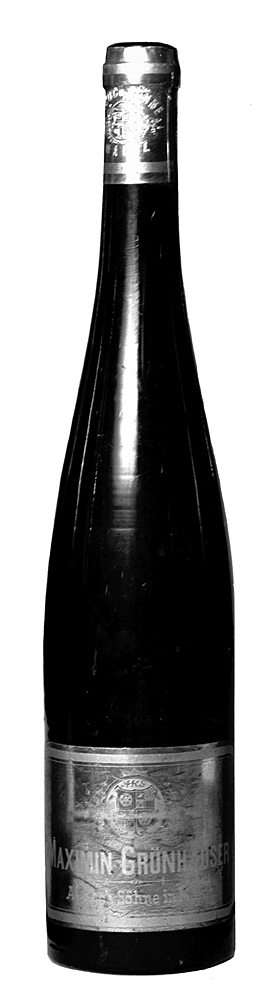 MAXIMIN GRÜNHÄUSER, sex helbuteljer Av blågrönt glas. Kägelformiga, med stärkring kring mynning; bottnen skålig. Etikett i guld, på denna i silver text med exportfirmans namn (A. Koch Söhne i Mainz) och varumärke, kring kanten en bård. Kapsylfragment av förtent bly, blekt guldfärgat, på detsamma exportfirmans namn och stadens vapensköld i relief, upptill och nedtill en bård, allt i silver. Höjd: 36,2 cm.; diameter: 7,6 cm.