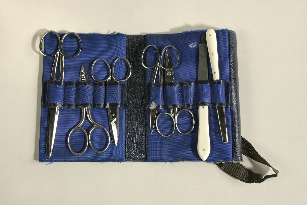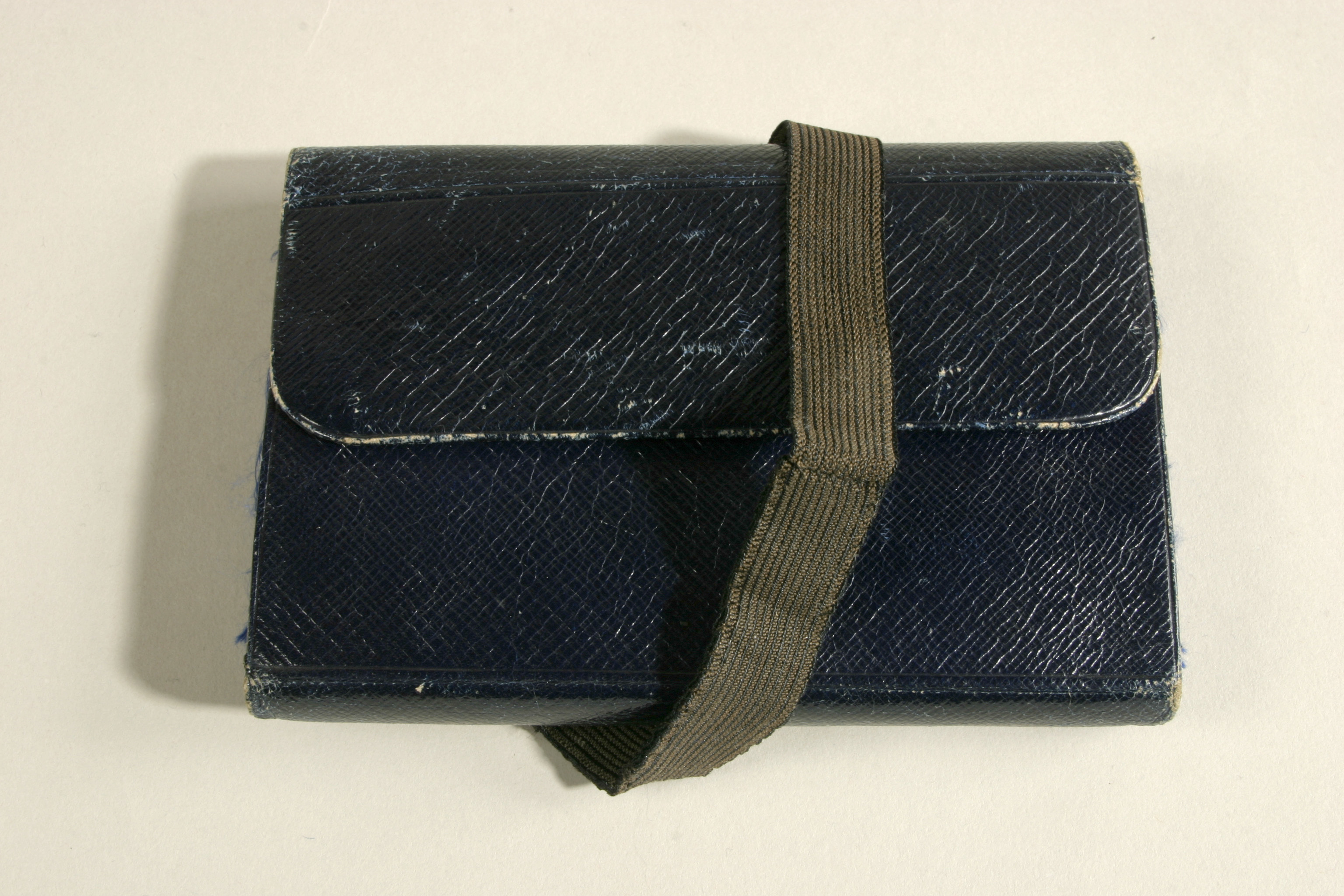 Fodral av blått läder, fodrad med sidenrips. Stänges med resårband, ljusgrönt och uttänjt. I fodralet två band fastsydda, de bildar 10 fack. Totalvikt med nr: 12432- 12438 225g.