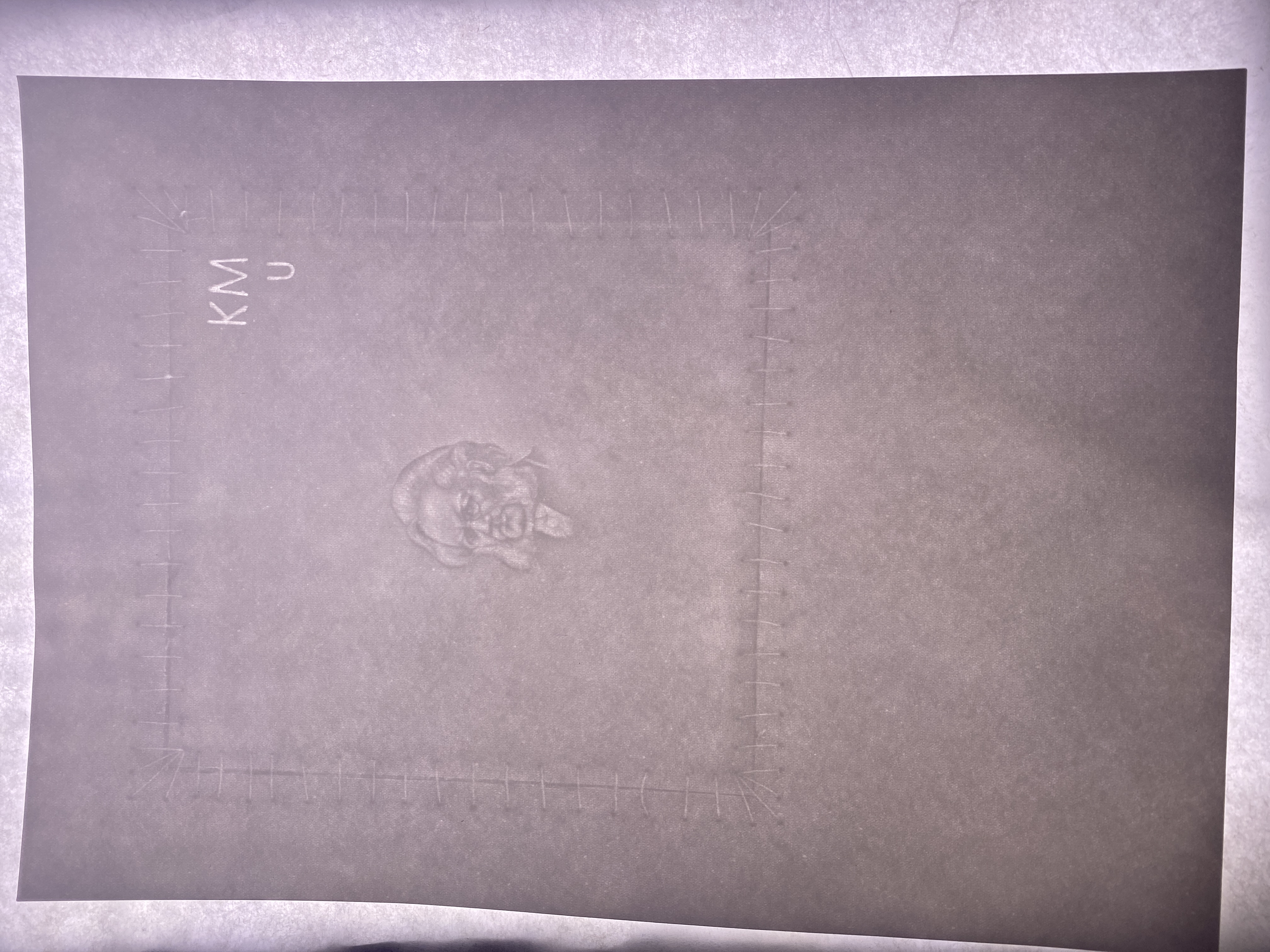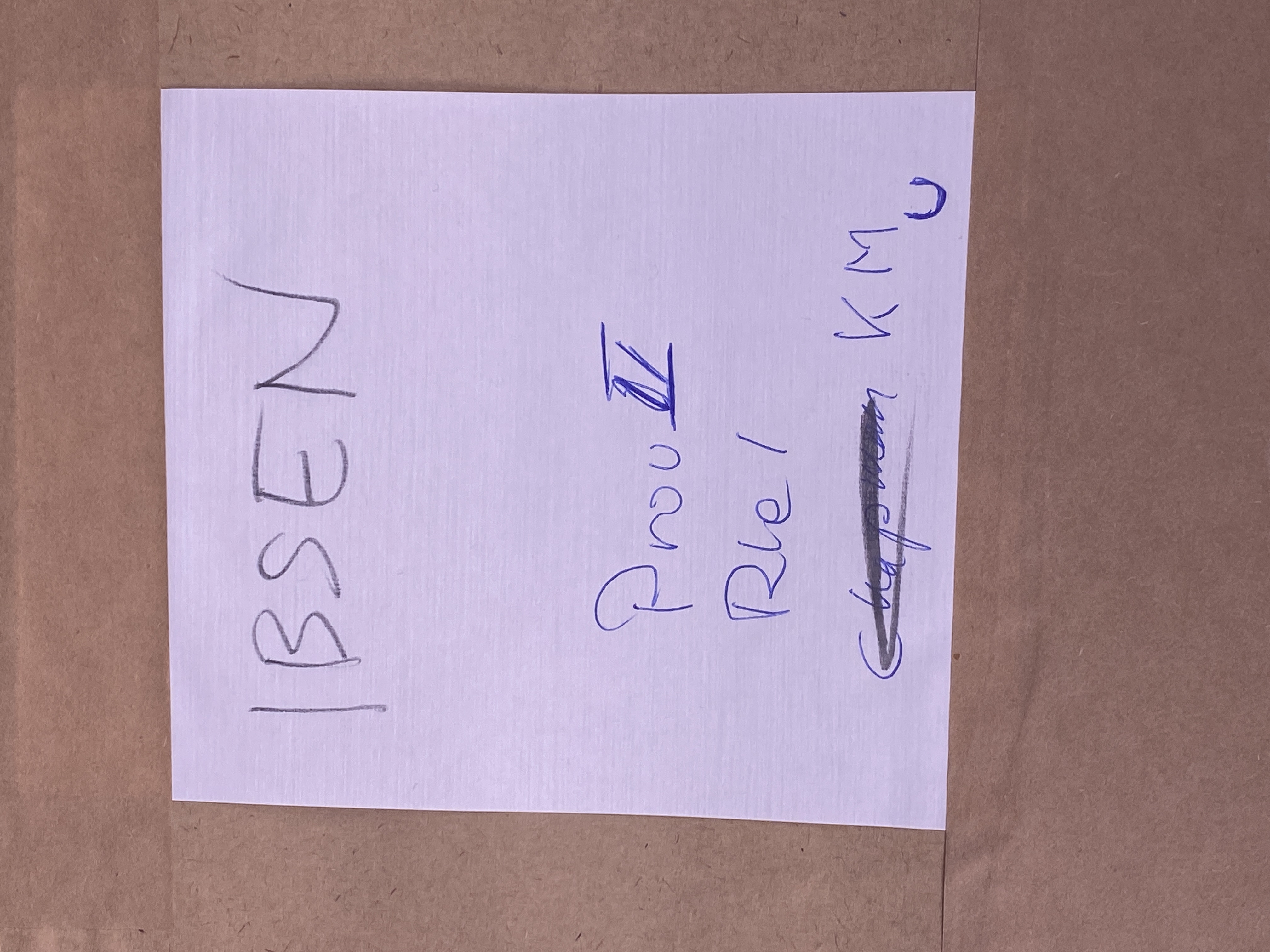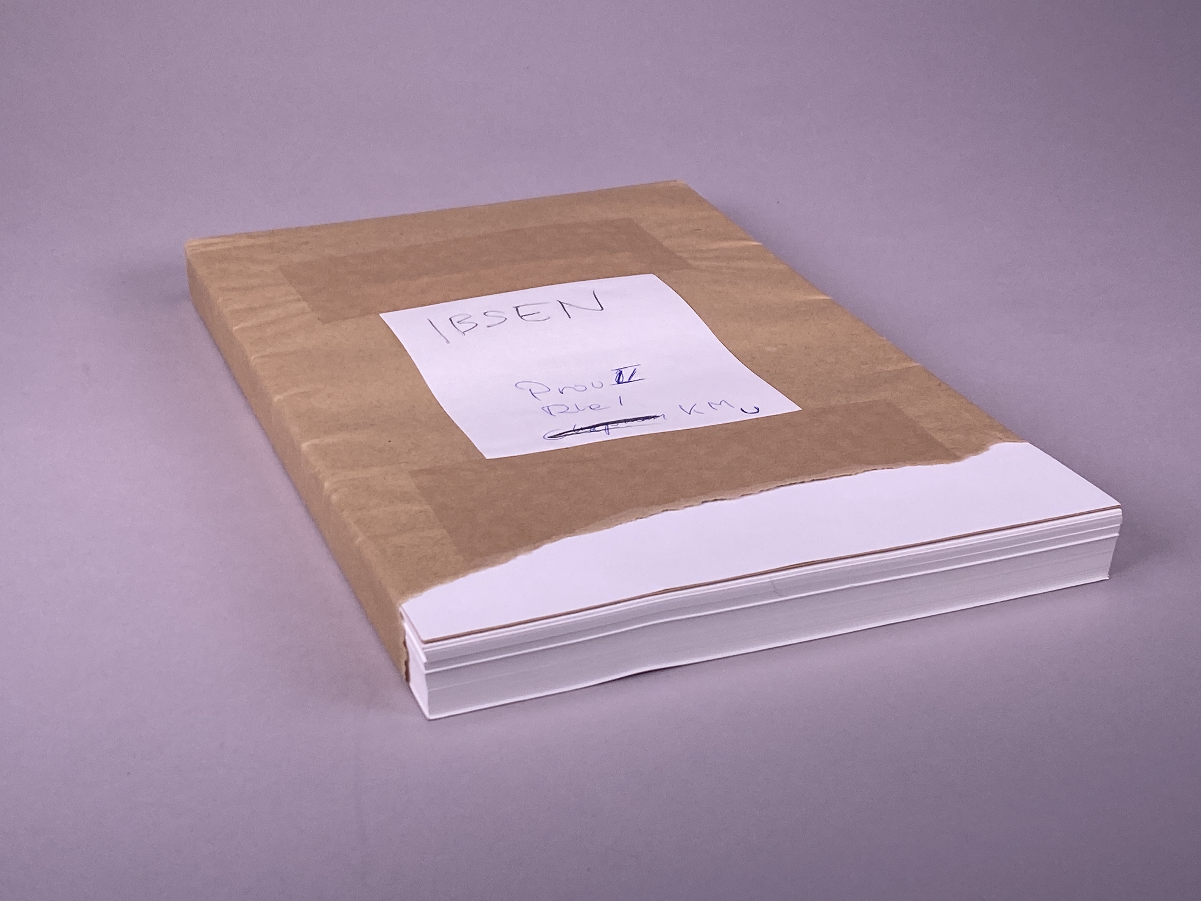 Paket av brun papp innehållandes ett flertal pappersark tillverkade på Tumba bruk. Vita pappersark med vattenmärke föreställande Henrik Ibsen (1828-1906) innanför en ram av stygn, samt bokstäverna "KM U". Omslaget med vit etikett märkt: "IBSEN Prov II Rle I KM U".