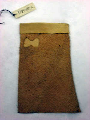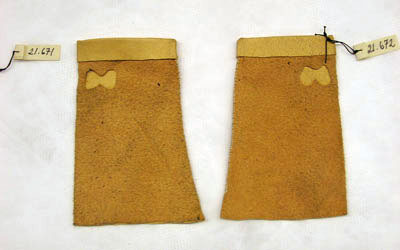 Handske av ljusbrunt getskinn, s k klippingshandske, utan fingrar och med hål för tummen i form av en åtta. Handsydd.