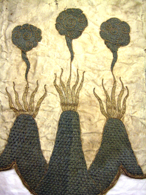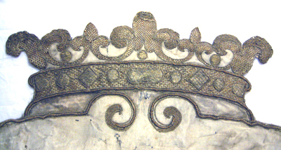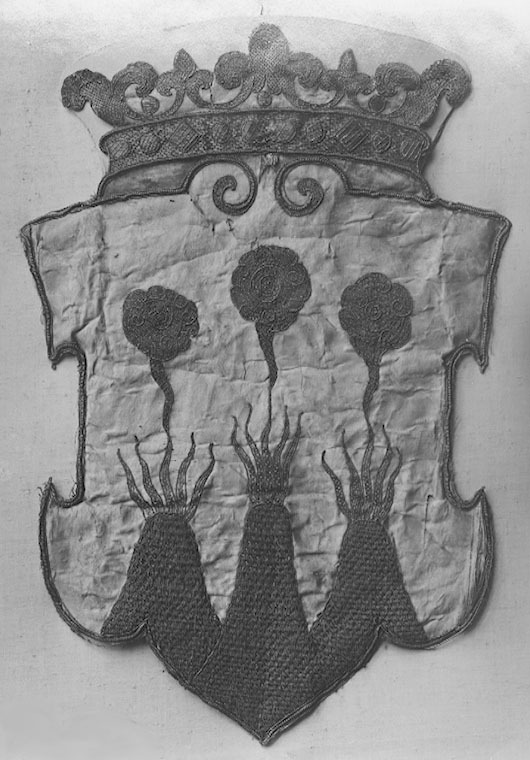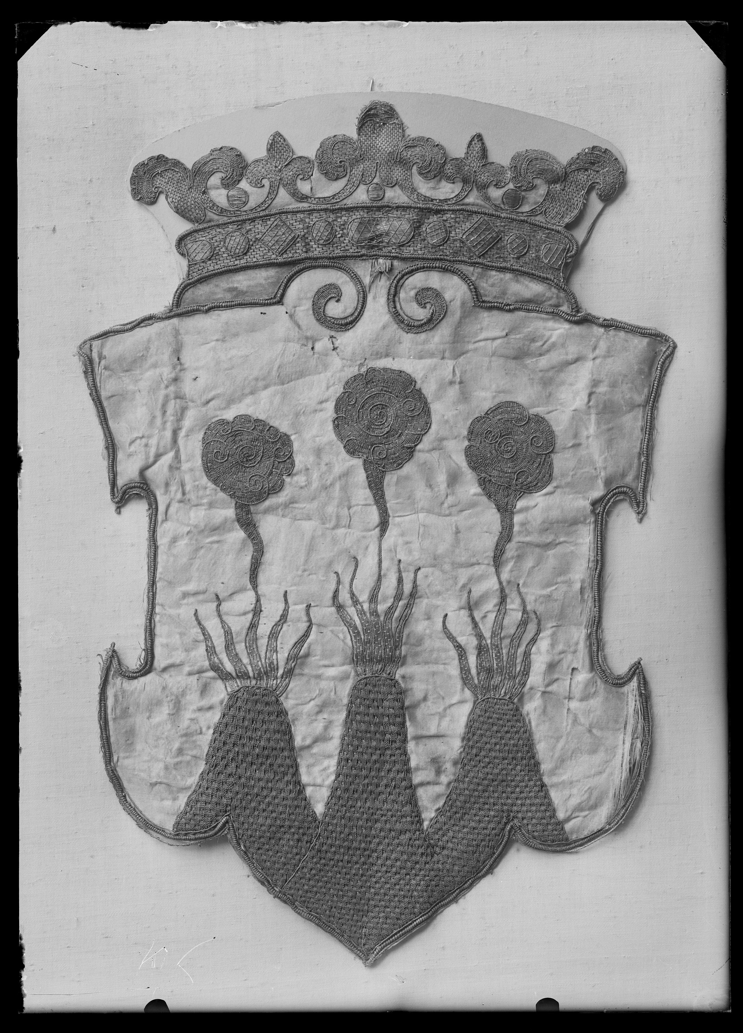 Västmanlands vapen av vit sidenatlas med brinnande treberg broderade med blå silkestråd och guldtråd i ett våffelmönster kallat gaufrure. Från trebergen stiger tre eldslågor broderade med guldtråd samt rökmoln av blå silkestråd och guldtråd. Skölden kröns av en med guldtråd broderad grevekrona stenimitationer av guldtråd broderade på kronringen. Sköld och krona kantas av en grov- och två smala snoddar av guldtråd och av guldbrun silkestråd, i sköldens överkant mötandes i två voluter. Vapnet är fodrat med pergament.