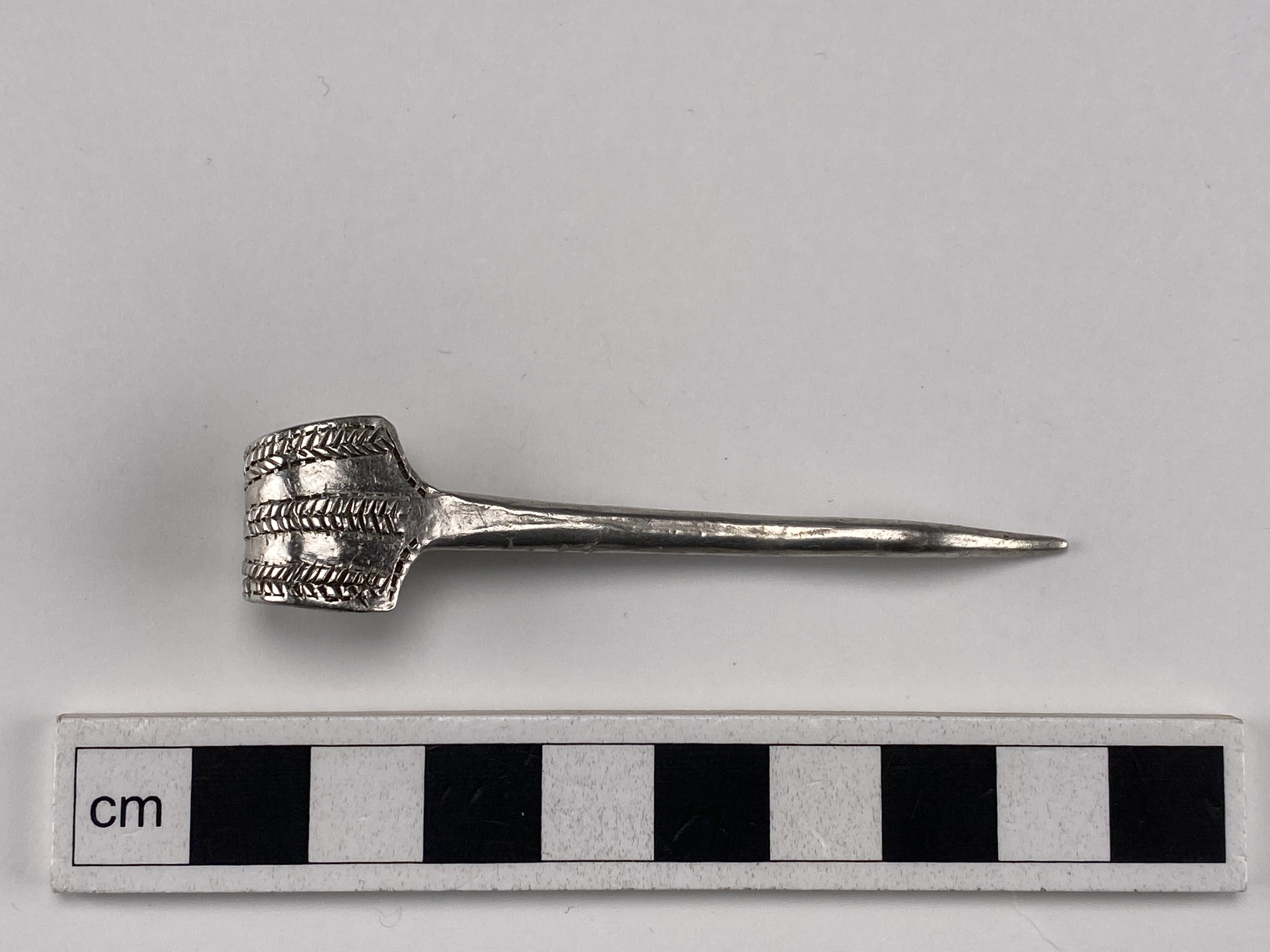 Nål med omböjd dekorerad avslutning för fästande i ringspänne. Dekor med kantföljande linjer och 3 st repliknande band. Nålens främre parti är böjt för anliggning mot spänne. Avstånd från omböjd anordning till böjd del för anliggning är ca 41 mm.
