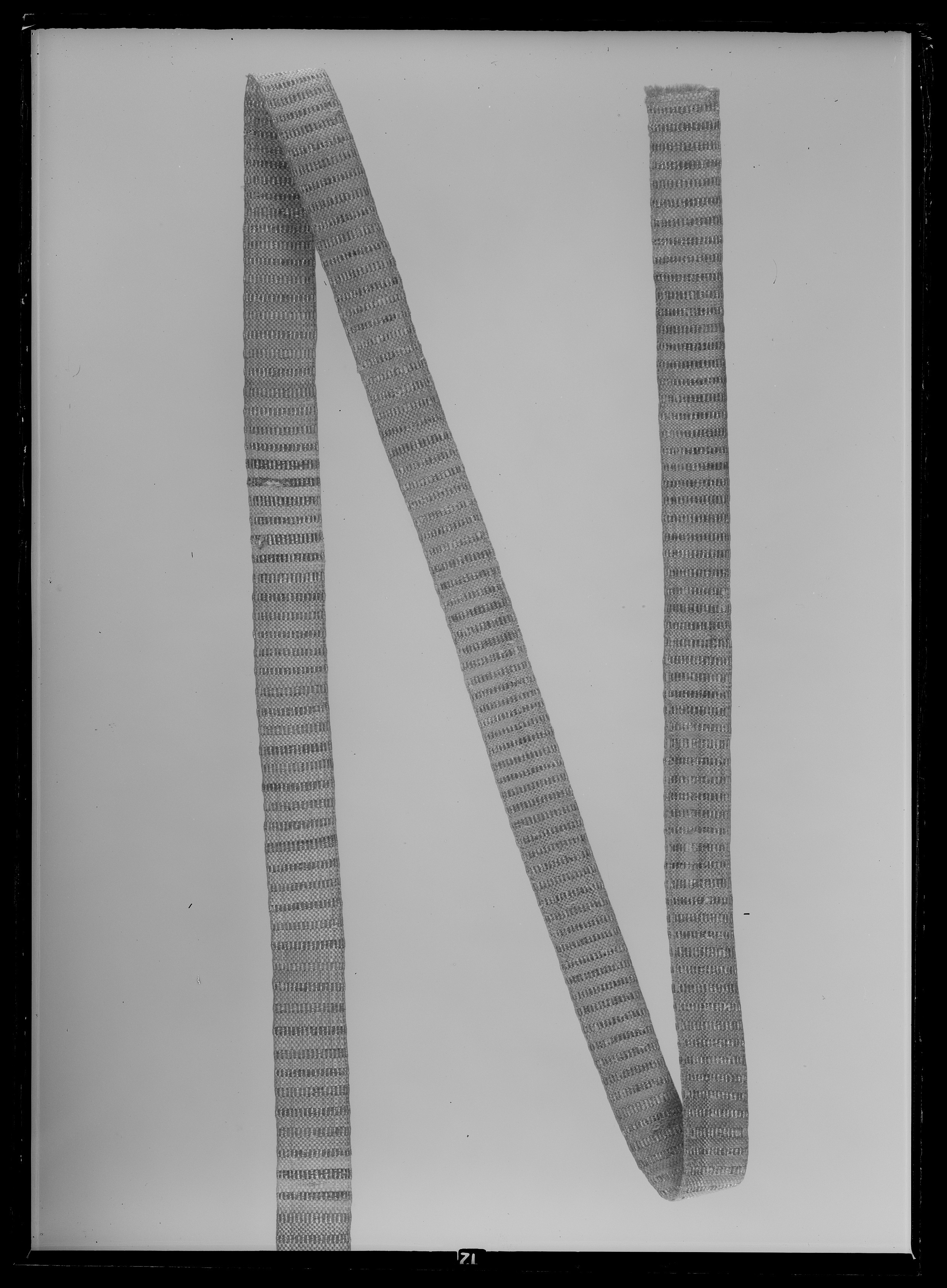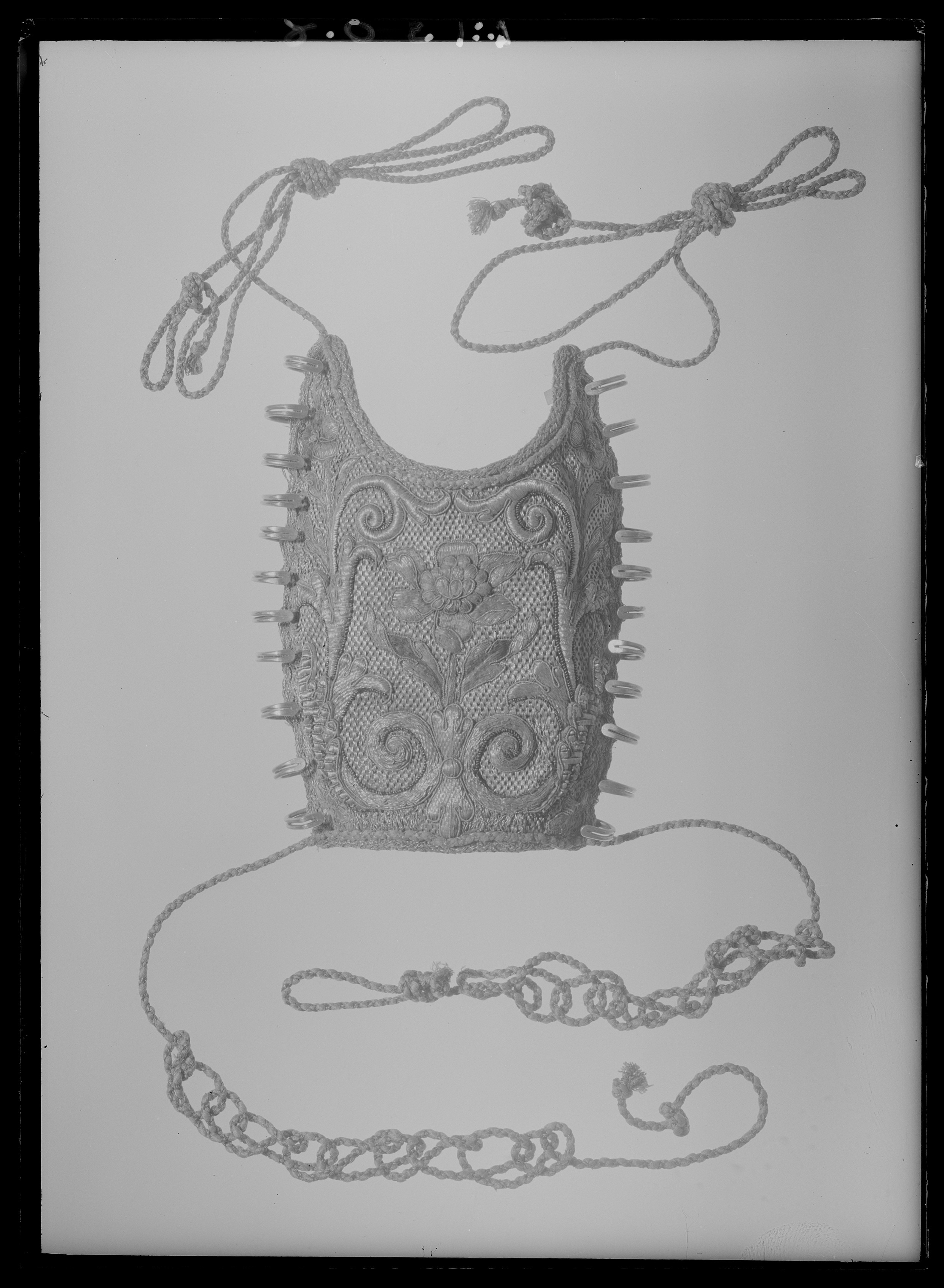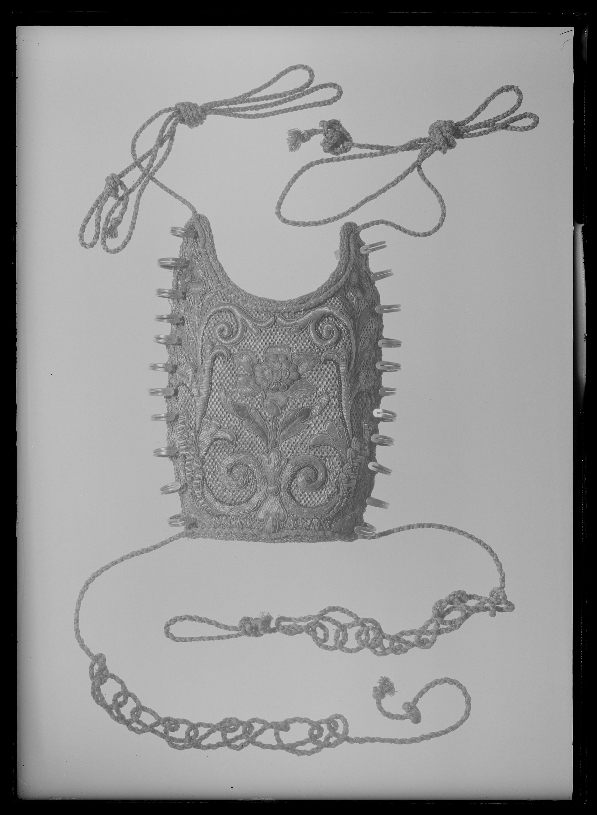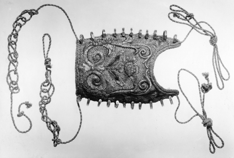 Förbögeln virkad af Guld och Silfver samt blått och Columbin färgaat Silke, beslagen med 17 st Pucklor och Söljor förgylte af 6lödigt Silfver nätt drifvit Arbete.
