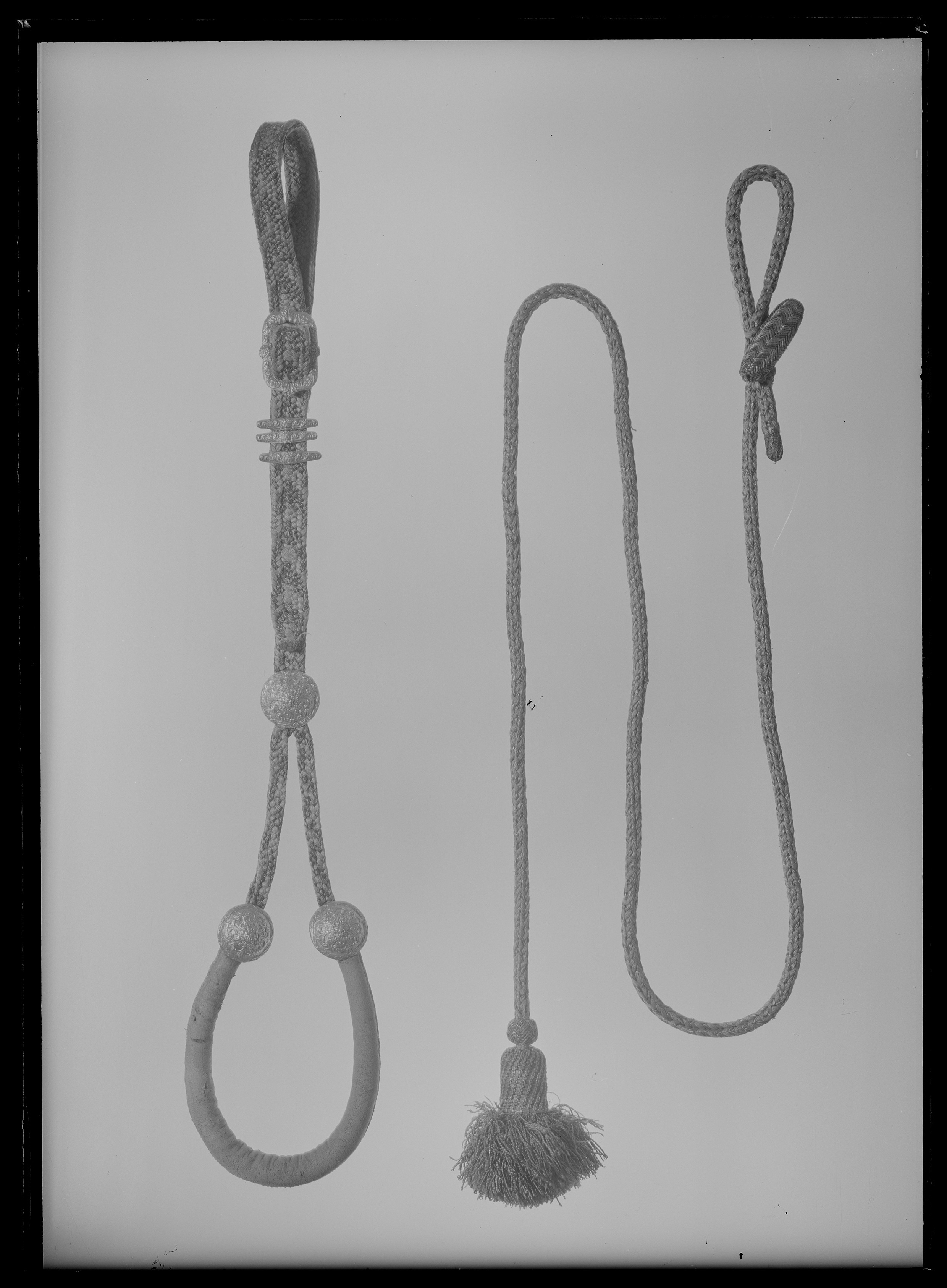 HandTygeln af GUld, Silfver, blått och Columbin färgat Silke tillhopaflätadt, med en Toffs af samma slag vid ena ändan, och en Knapp vid andra ändan.
