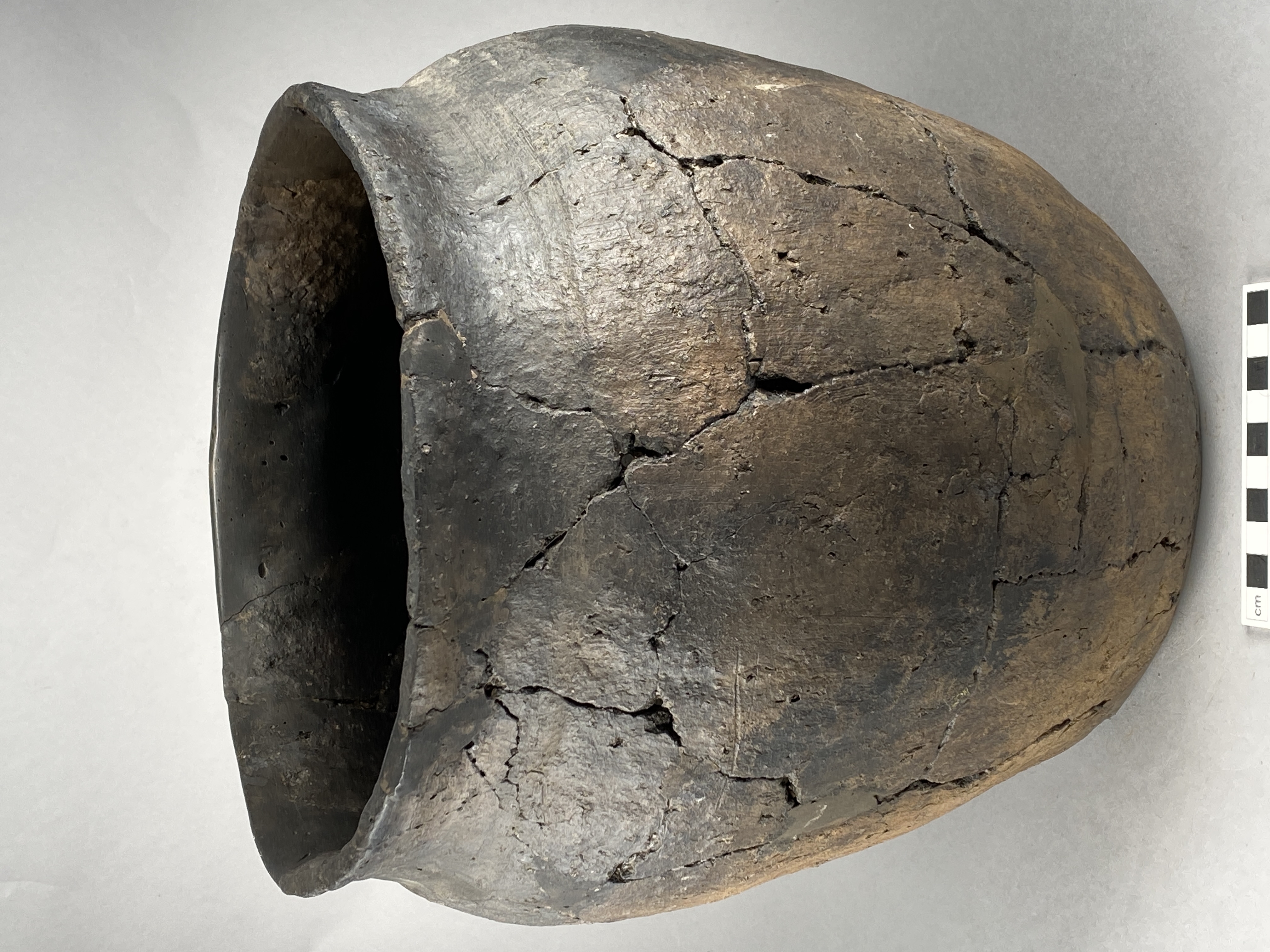 stort situlaformat kärl. flammigt bränt. grovt avstruken yta, bergartsmagring. hopklistrat. indragen mynning och ställvis en hålkäl vid övergången mellan hals och skuldra. fyrkantig mynning