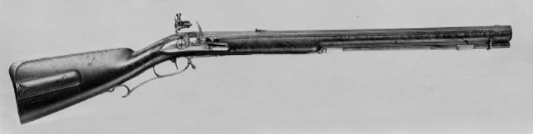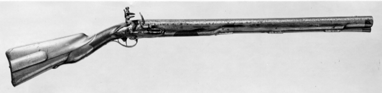 Flintlåsbössa, sammansatt av ursprungligen ej samhörande delar, svinryggspipa, låset signerat Wålberg, Stockholm 1760-tal, omstockad under 1800-talet, silverdekoren på pipa och ståldelar möjligen från omstockningen. Slätborrad svinryggspipa med falsk damaskering(?), möjligen avkortad. Vid pipbasen en solformig dekor i stålsnitt, därframför inlagt bladrankor av silver samt på båda sidor om ryggen: "FREDRICH ADOLPH // SWINHUFWUD" . Kort, tvärt avskuret svansskruvblad. Igensatt fänghål (ej uppborrat igen!). Riktmedel: Spolformigt korn av silver på oval platta med bladformig avslutning framtill. Fästning: Tre häften, de bakre placerade 70 mm från varandra. Pipan fäst med krysskruv, bakre låsskruven genom svansskruvplattan samt tre pipstift av stål. Flintlås med välvt låsbleck, kantlinjer samt bladrankor inlagda med silver, framför hanen signatur inlagd med silver, två rader: "WÅLBERG // STOCKHOLM". S-formig, rundad hane med ovala käkar och kulformigt käkskruvhuvud (möjligen ej ursprungligt). Rundad fängpanna med fasetterad framkant (ej ursprunglig). Batteri med välvt fängpannelock och åsat eldstål, svagt uppsvängd häl. Batterifjäder med cylindriskt skruvfäste och långt, välvt, droppformigt fjäderlöv (fjädern troligen ej ursprunglig). Slagfjädern möjligen utbytt. Fästning: Två låsskruvar. Svagt böjd avtryckare med skiva. Konturerat avtryckarbleck. Helstock av bok(?), 1800-talstyp, kolv med kraftig, rundad pistolkolv, nätskuren kolvhals och framstock, kindstöd och kolvlåda. Slätt, välvt kolvlådelock. Svartmålat näsband, imiterande horn. Framstocken tvärt avskuren och ihoplimmad vid spetsrörkan. På kolvens undersida stämplat: K. Beslag av stål. Bakplåt med framåt i avsatser avsmalnande flik på kolvryggen, blomrankor i silver på fliken. Välvt sidbleck med kantlinje och blomranka av silver. En + två rörkor, de två främre med tvärgående ringar, spetsrörkan slät med slät, triangulär spets. Varbygel med kluven bakre stolpe och lång, slät bakre arm med rundad bakände. Välvd främre arm, åtsnörd på mitten, avslutning i form av ett treflikigt blad, på bygel och framarm kantlinjer och blomrankor av silver. Tillbehör: Laddstock av trä, l: 696 mm, i ena änden hornskoning, l: 25 mm. I andra änden krats av stål, l: 18mm, med tång fäst med två nitar genom stocken.