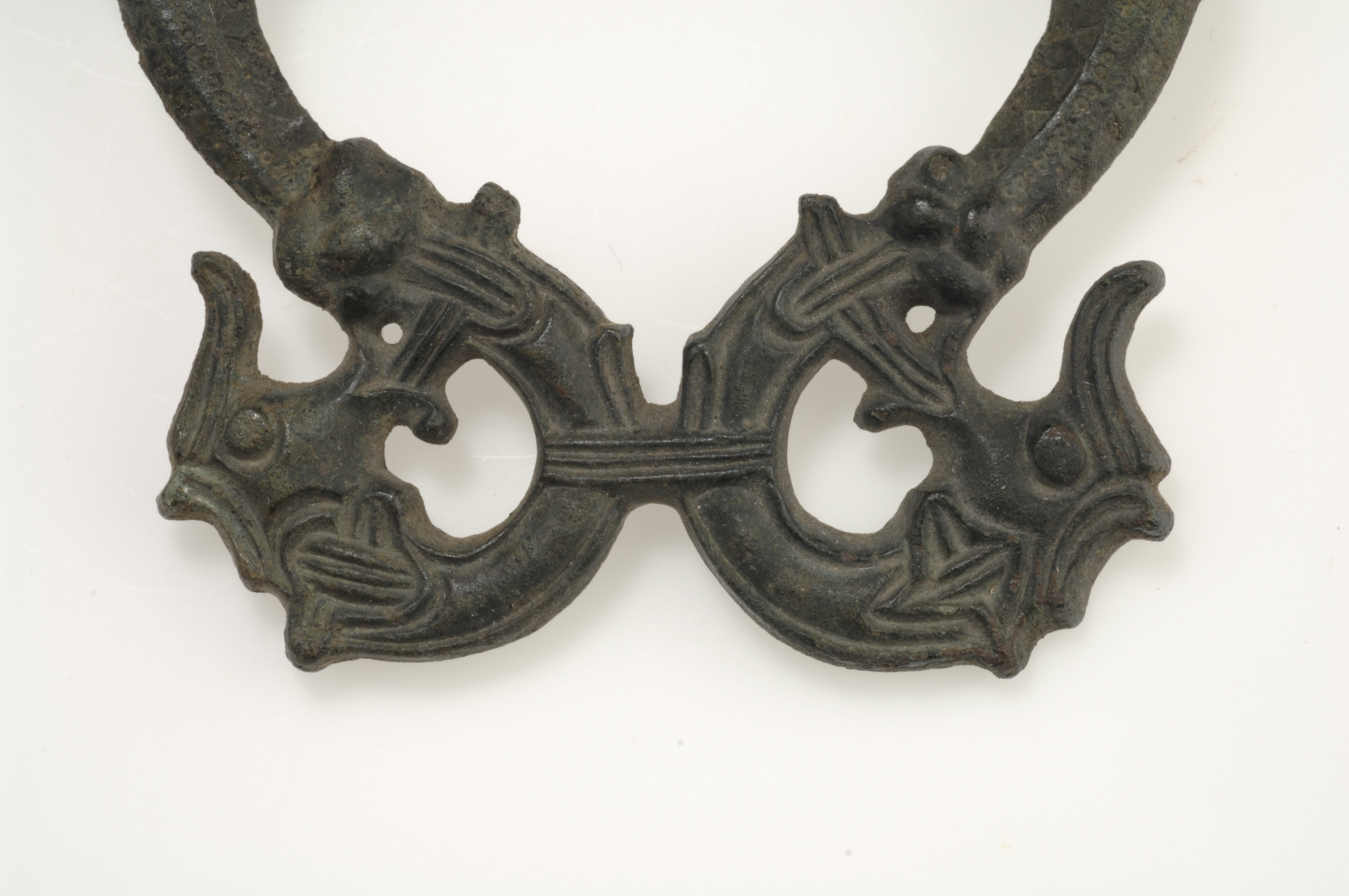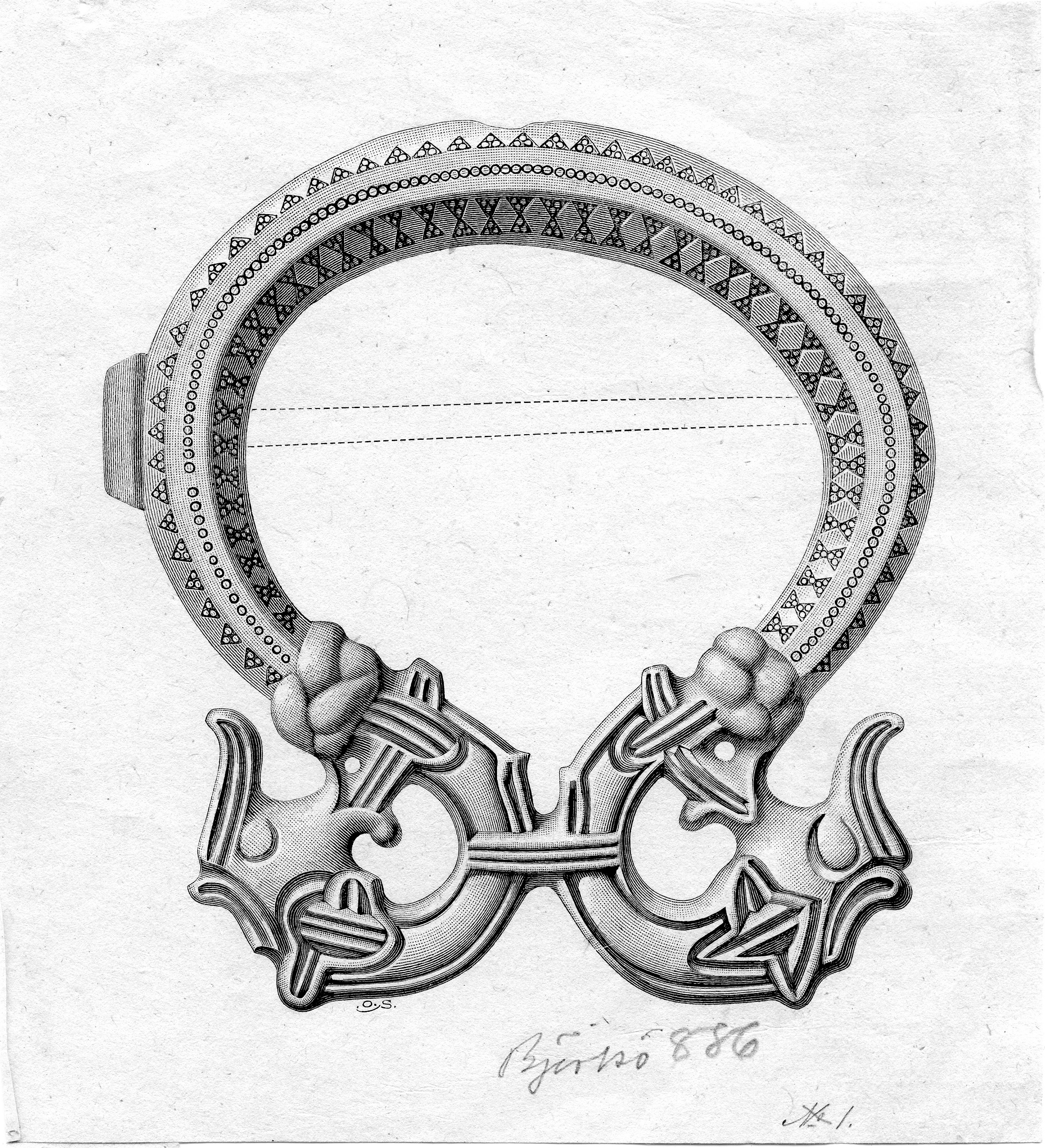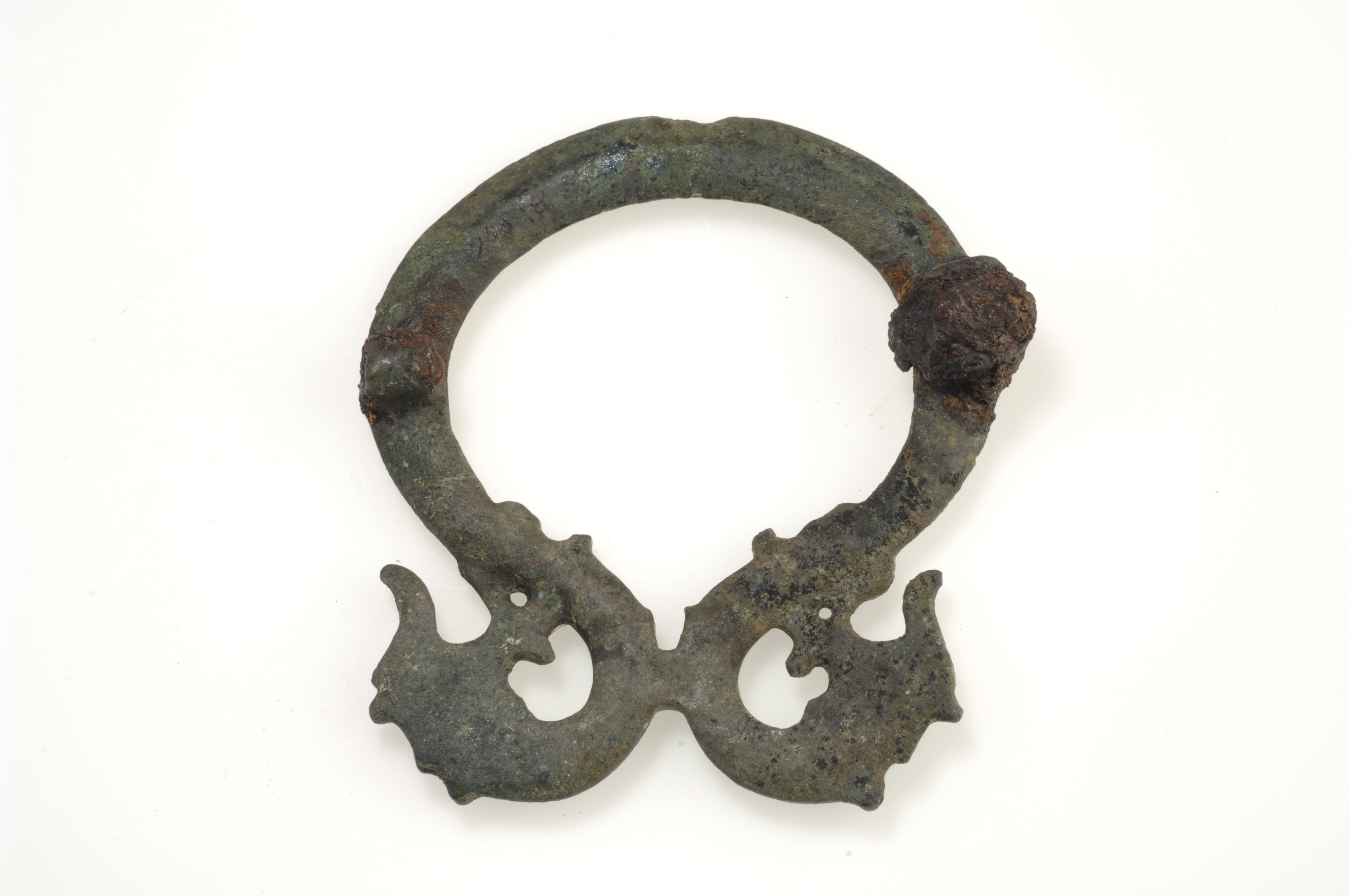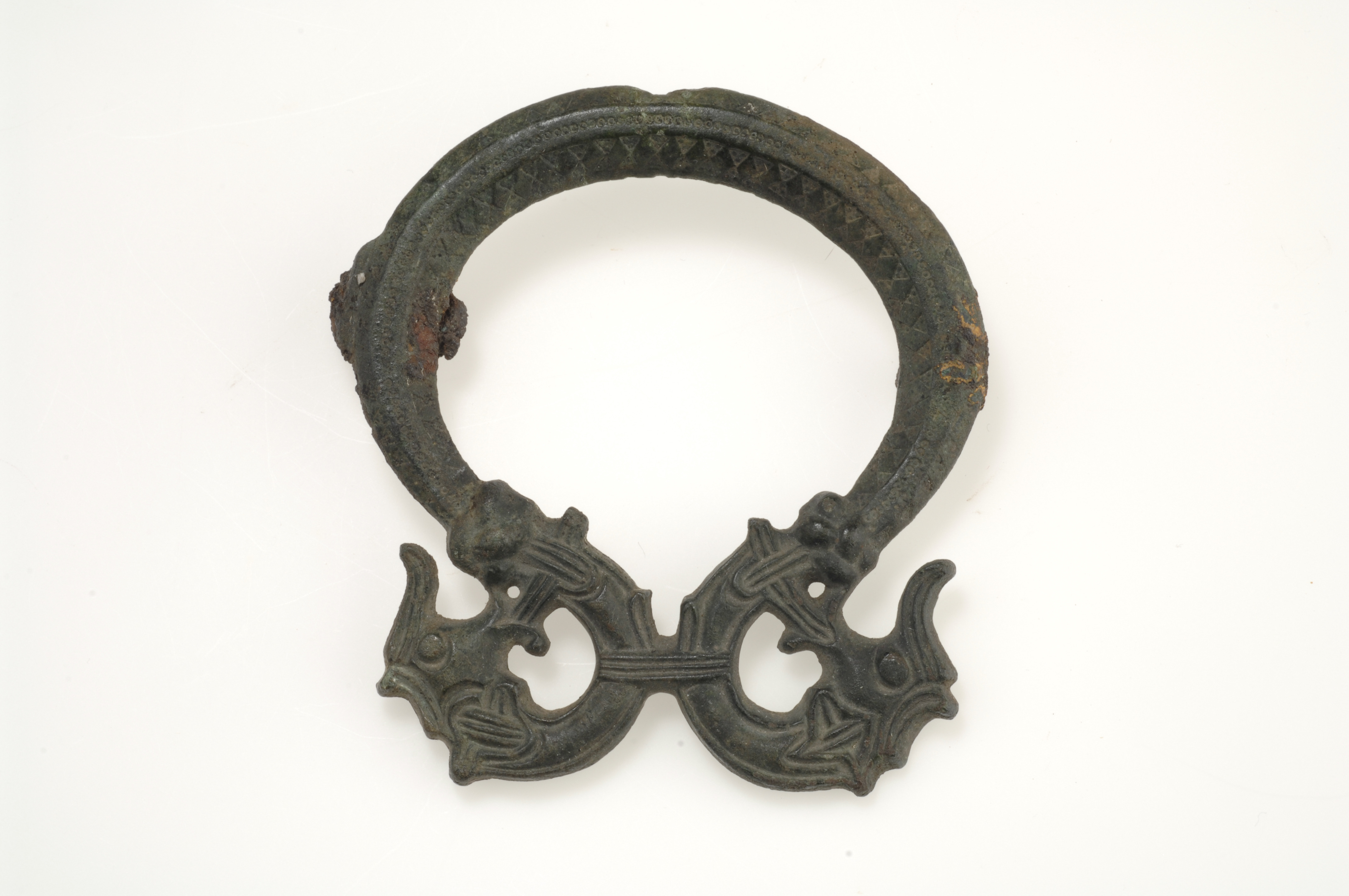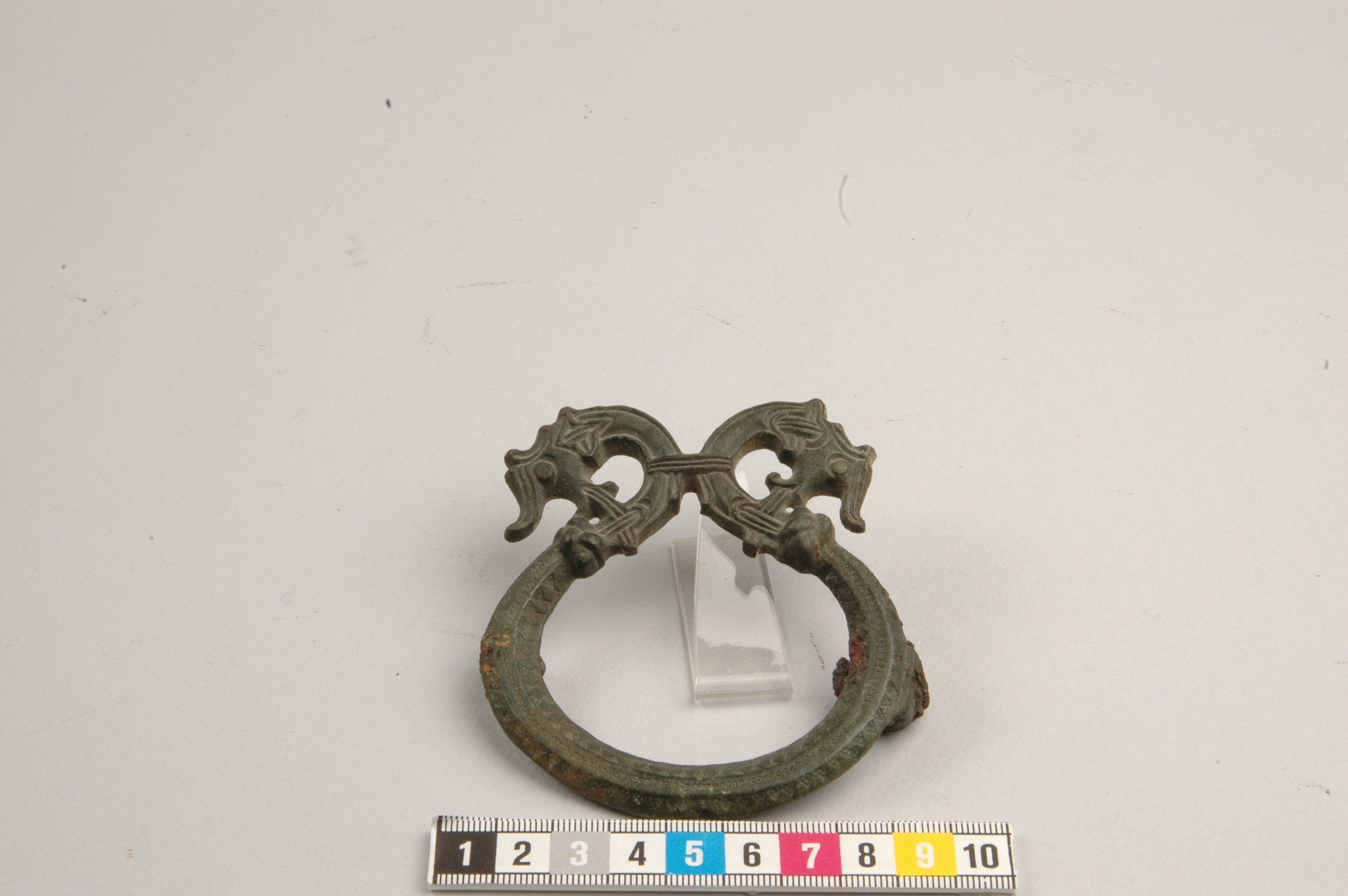 Stort, ornerat bronsringspänne med rester av järnnål. Jmf. Birka I, Taf. 49:2.