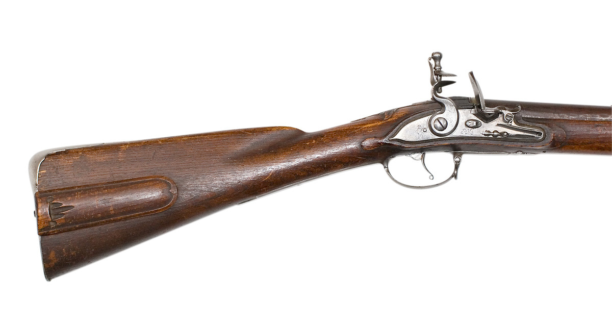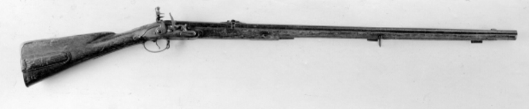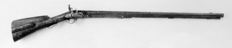 Rund, brunerad, grovfilad pipa av stål, på vulst vid pipbasen mässingsband. Svagt böjt, spetsigt svansskruvblad. Riktmedel: Gördelsikte av stål, spolformigt korn av mässing. Fästning: Två, ursprungligen tre häften av stål. Pipan fäst med krysskruv, bakre låsskruven i hål genom svansskruvplattan samt två pipstift av stål och ursprungligen främre rembygelns skruv i det saknade häftet. Flintlås med plant låsbleck, fasade kanter, graverade kantlinjer, blad runt skruvspets bakom hanen. Framför hanen graverad signatur: "P:B". S-formig, platt hane med fasade kanter, hangren med platt ås. Runda käkar, överkäken lös, päronformigt käkskruvhuvud. Framför hanen skjutsäkring med ovalt huvud med lodrät ås. Kantig fängpanna med skålad fals. Batteri med skålat fängpannelock, eldstål med ryggås, profilerad upptill och nedtill, komma-formig häl. Batterifjäder med delvis fasade kanter, fjäderlöv liknande beta med blad. Fästning: Två låsskruvar. Böjd avtryckare med upprullad ände. Ovalt avtryckar bleck. Helstock av trä (ask?), fransk kolv med kindstöd och kolvlåda, plan kolvrygg med rundade kanter. Snidad spiral bakom kindstödet, blad framför kindstödet och vid svanskruvbladet. Kolvlådelock av stockens trä med kantlister och djupt inskuret fingergrepp. Beslag av stål, bakplåt med slät, bred, konturerad flik på kolvryggen, bardisanliknande ände. S-formigt, plant sidbleck med fasade kanter. En + två kantiga, brunerade rörkor, slät spets. Varbygel med 8-formig, plan främre ände med fasade kanter, avslutning i form av fransk lilja, lång, plan bakre ände med fasade kanter, rundat ändblad.Två rembyglar, den bakre i varbygelns framstolpe, den främre vid mellanrörkan.