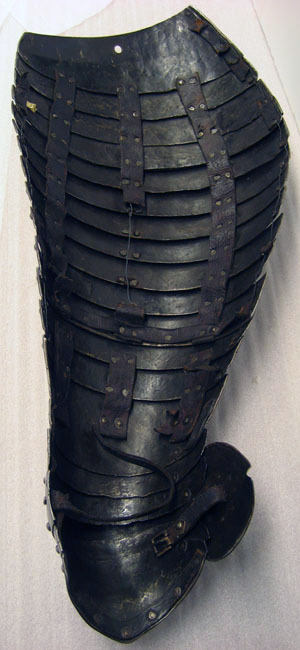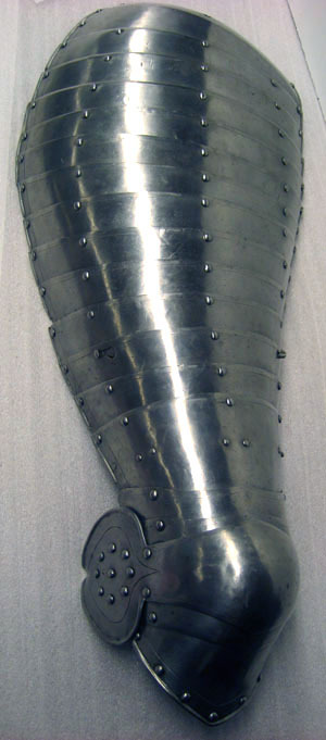Av driven stålplåt med utsidan blankpolerad och insidan svart. Bucklan med tillhörande skenor är löstagbar. Lårbetäckning av 11 välvda skenor med raka släta kanter och upptill ristad kantlinje. Fästade i varandra omlott med nitade läderband på insidan. I varje skena fem nitar. Övertsa skenan horisontellt vikt på mitten med övre delen svagt riktad inåt. I mitten cirkulärt hål, för harneskets tapp. Nedersta skenan med omvikt och rundsmidd kant. I inre kant vridbar tapp och i yttre utstående nit. Knäbuckla av åtta delar. Bucklan välvd med övre och nedre kant utdragen till låg spets. Åt utsidan mussla, oval med yttre kant utdragen, V-formig och tvärt avslutad. Dekor av åtta nitar i cirkel med en i mitten, runtom löpande ristad linje. Över bucklan fem skenor, den mittre större än övriga. Övertsa skenan med utåt rektangulärt och inåt nyckelhålsformat hål. Under bucklan två skenor, den nedre större med nedre kanten utdragen till spets. Alla skenors övre kant utdragen till tre låga spetsar. Kortsidorna omvikta och rundsmidda. På bucklans insida läderrem, l 295 mm, och på musslans insida läderband, l 95 mm, med sölja.