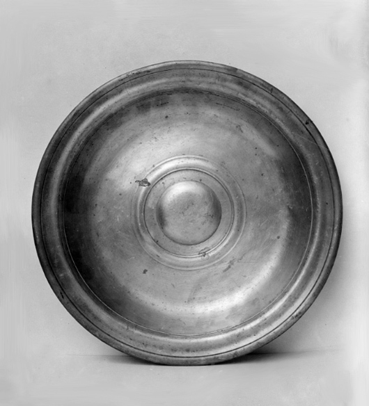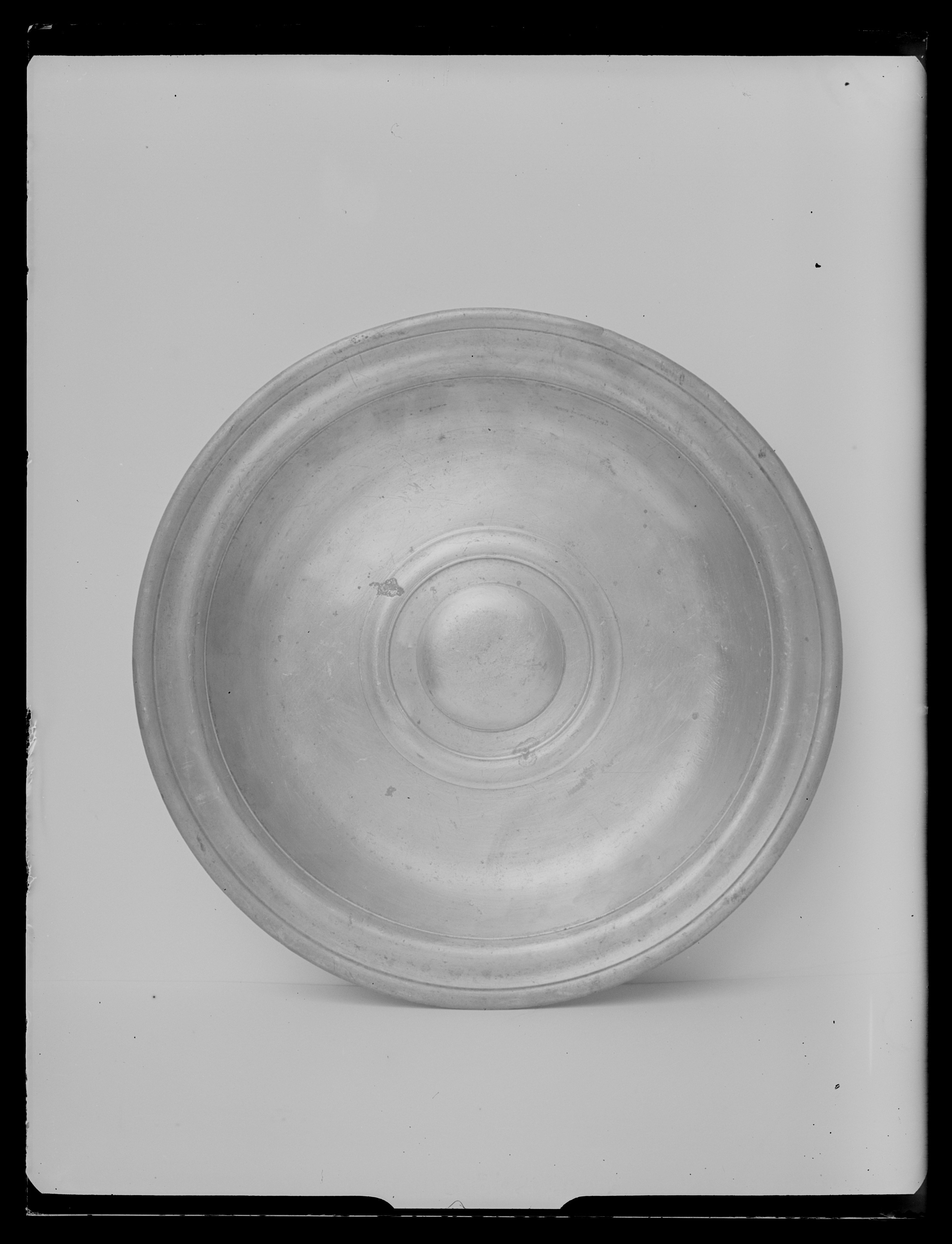 Runt tennhandfat med i botten koncentriska cirklar kring en konvexrundel. Cirka 27 mm brett brätte med 2 linjer. På undersidan i mitten 5 stämplar: 1) p i gemen fraktur betecknande året 1773 2)3) mästarstämpel med antikvarversalerna CG över MB i kontursköld med snirklade bårdstycken 4) Proberstämpel, sköld med 3 kronor 5) Stockholms stadsstämpel, sköld med öppen krona. Fatet tillverkat av tenngjutarmästaren Carl Gustaf Malmborg i Stockholm (1767-1806).