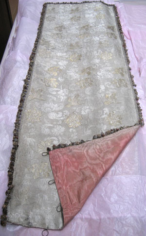 Sängomhänge av sidenbrokad i benvit silke, silver- och guldtråd, i växt- och blomsterslingor. Kantad på långsidorna och nedre kortänden med flätat band av silver- och guldtråd med runda tofsar. Varannan tofs har ett flätat hölje av silvertråd och varannan av guldtråd, med fyllning av beige och rosa, respektive beige och röd silke. Övre kortsidan har fyra öglor i två storlekar av gul metall som mäter 18 och 20 mm i diameter. Ena hörnet har endast en snörstump. Foder av rosa sidenmoaré.