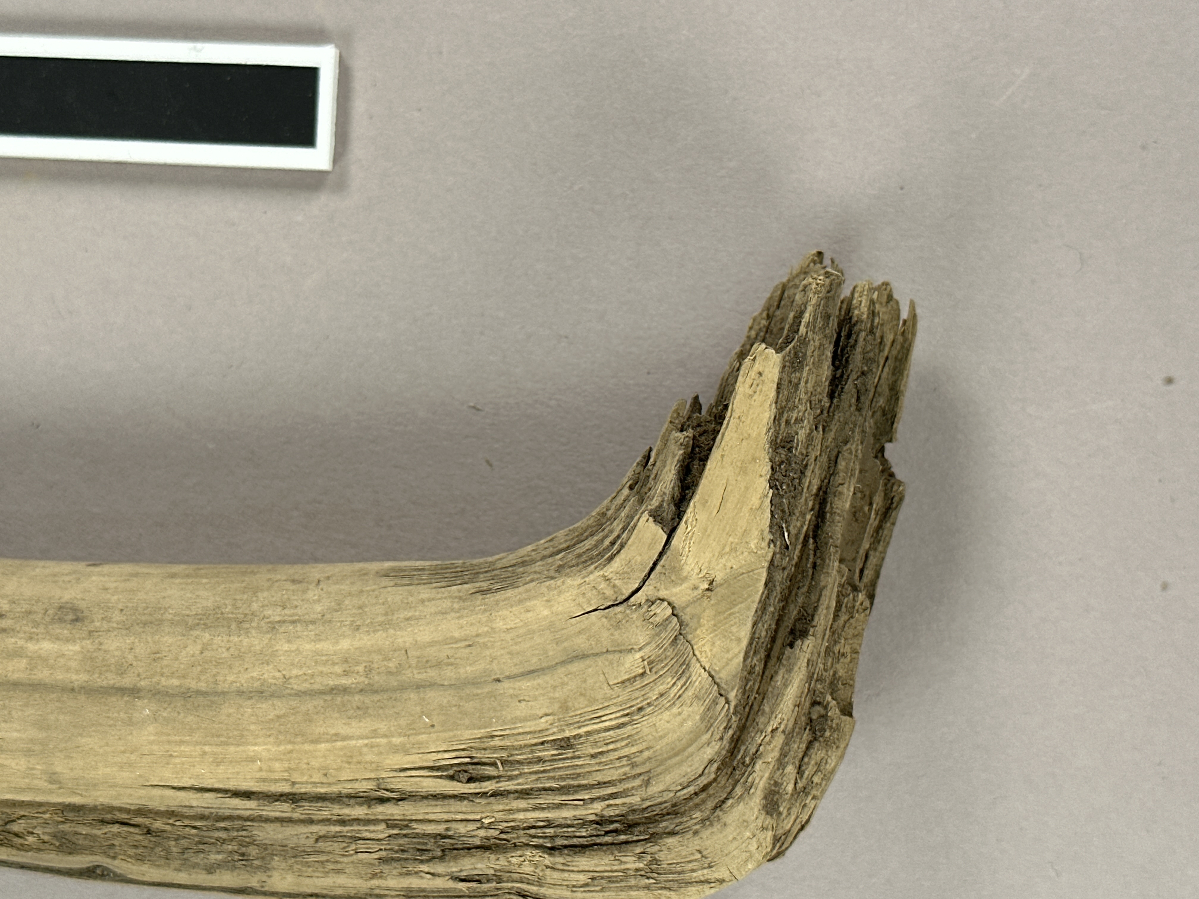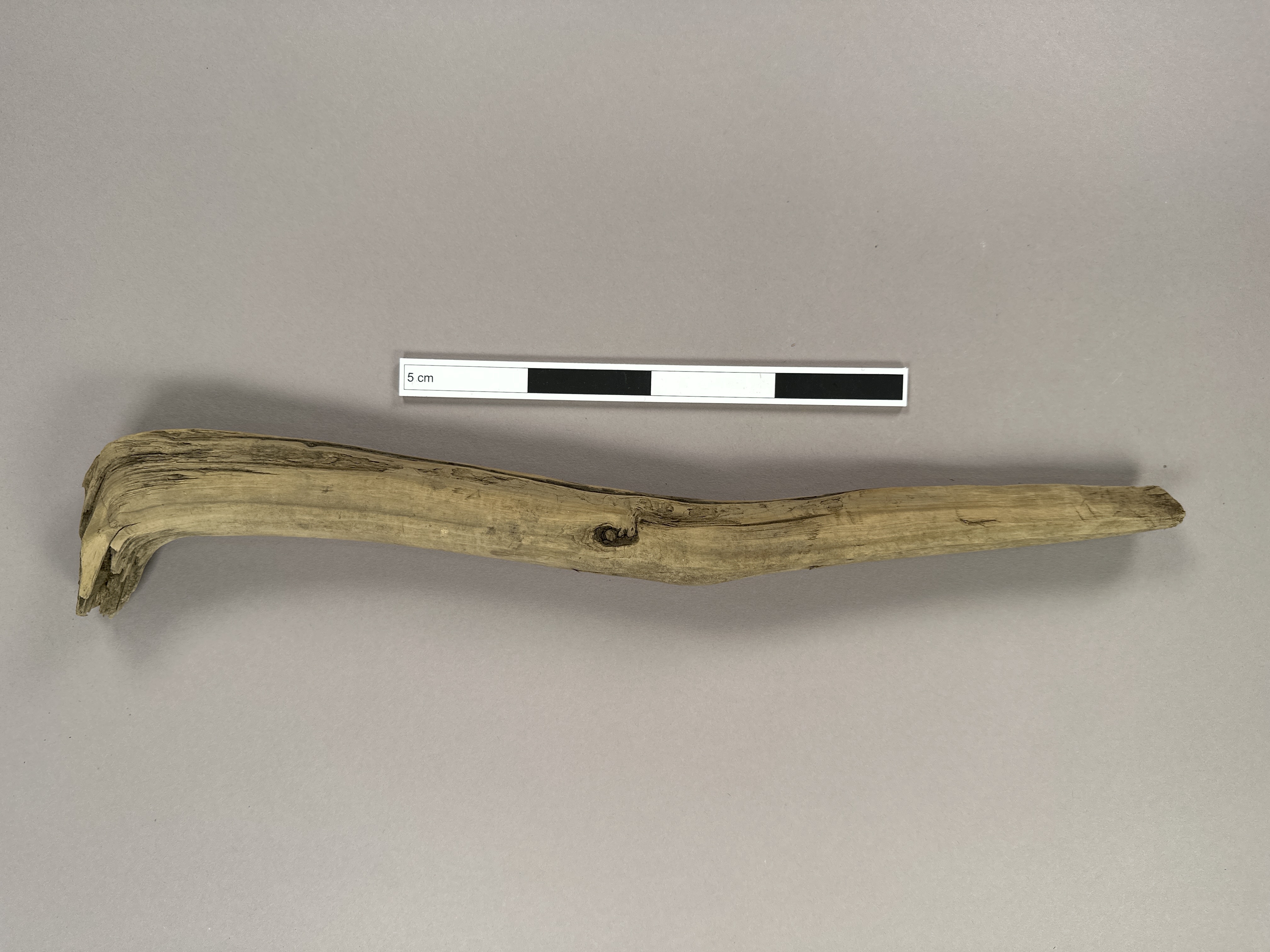Träpinne med böj. Möjligt handtag. Täljd.