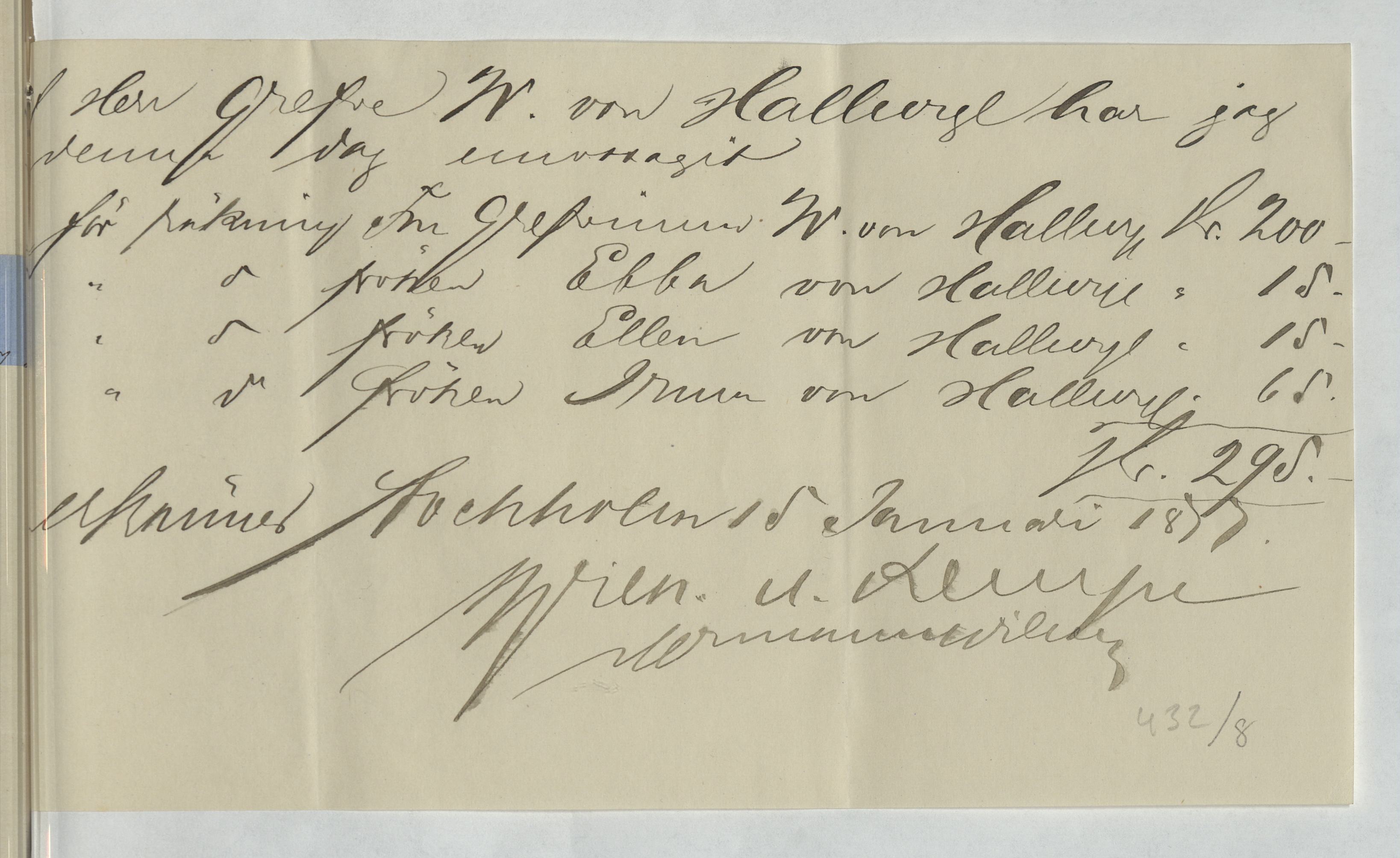 Kvitto från Firma Wilh. H. Kempe rörande emottagna kontanter till familjen von Hallwyl.
